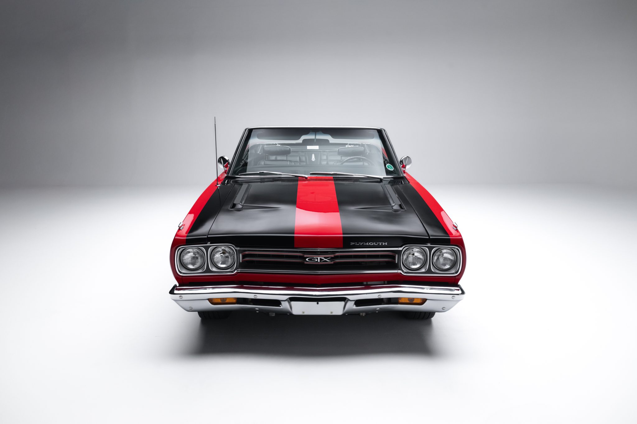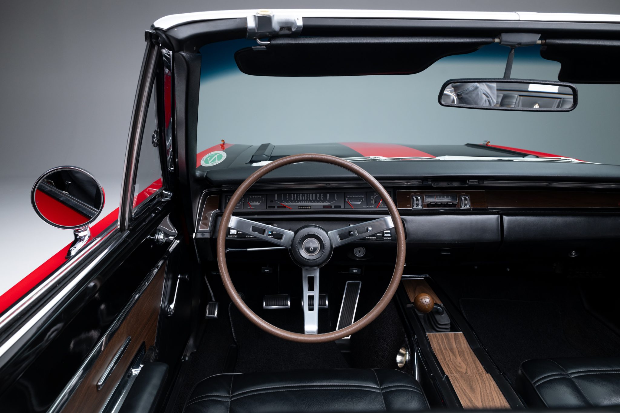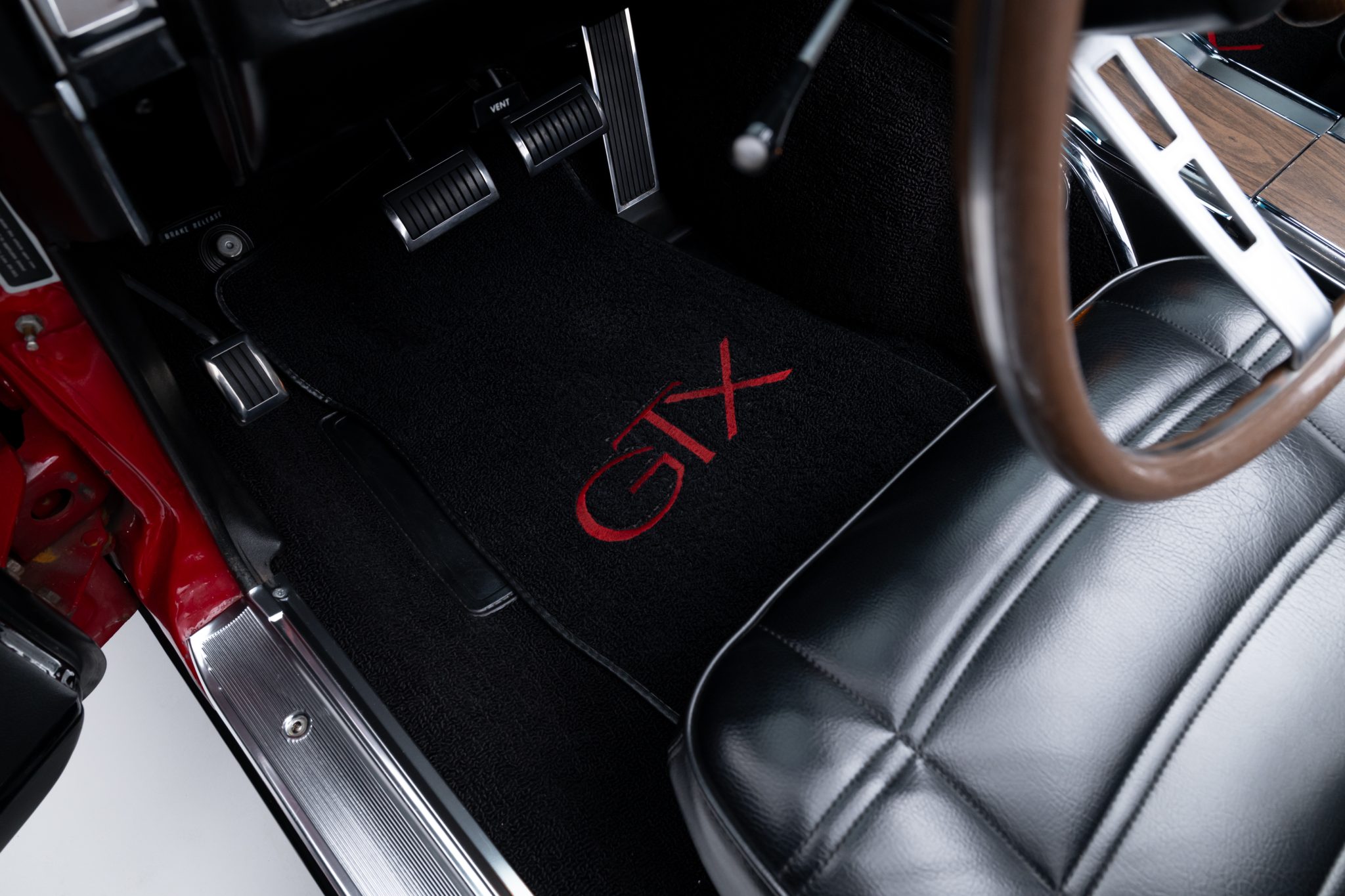 Power is provided by a 440ci V8 linked to a four-speed manual transmission and a Dana 60 rear axle, and the car is finished in Scorch Red with a black convertible top and black stripes over black vinyl upholstery. It is equipped with a black top boot, a center console, an AM radio, front-seat headrests, a four-barrel carburetor, power steering, and 14″ chrome road wheels with redline tires.