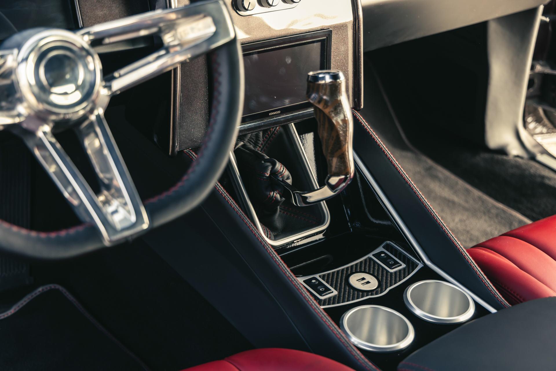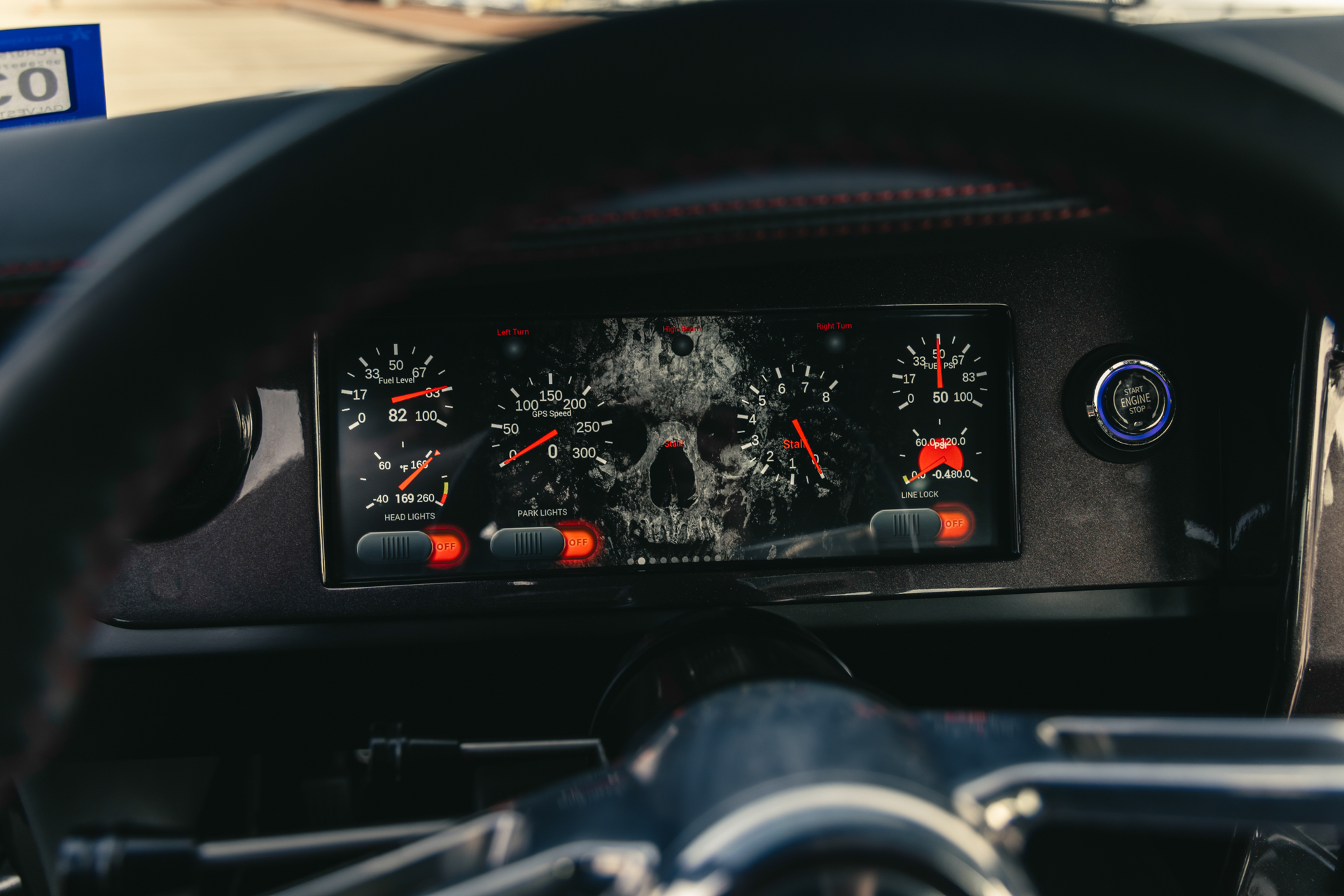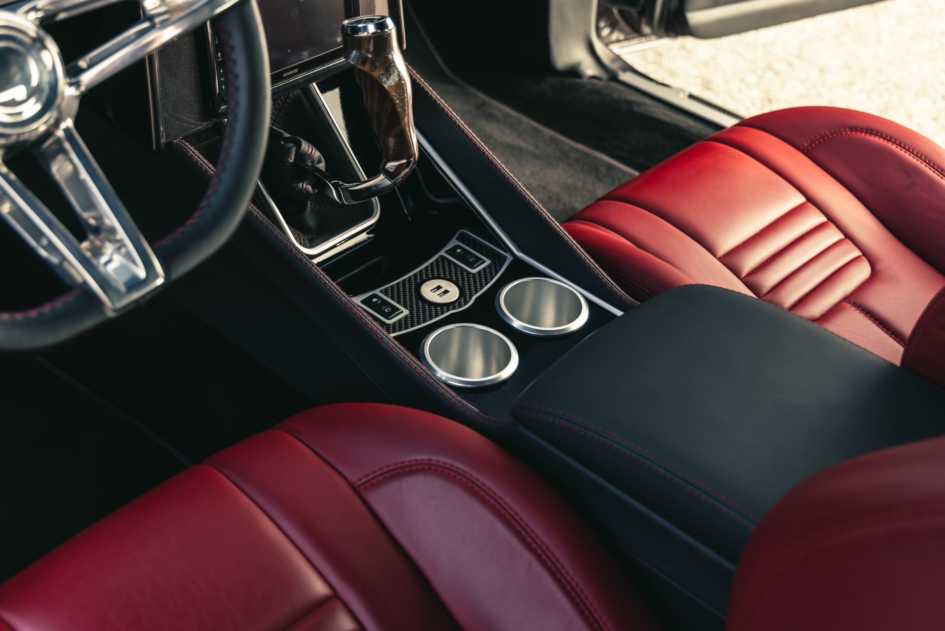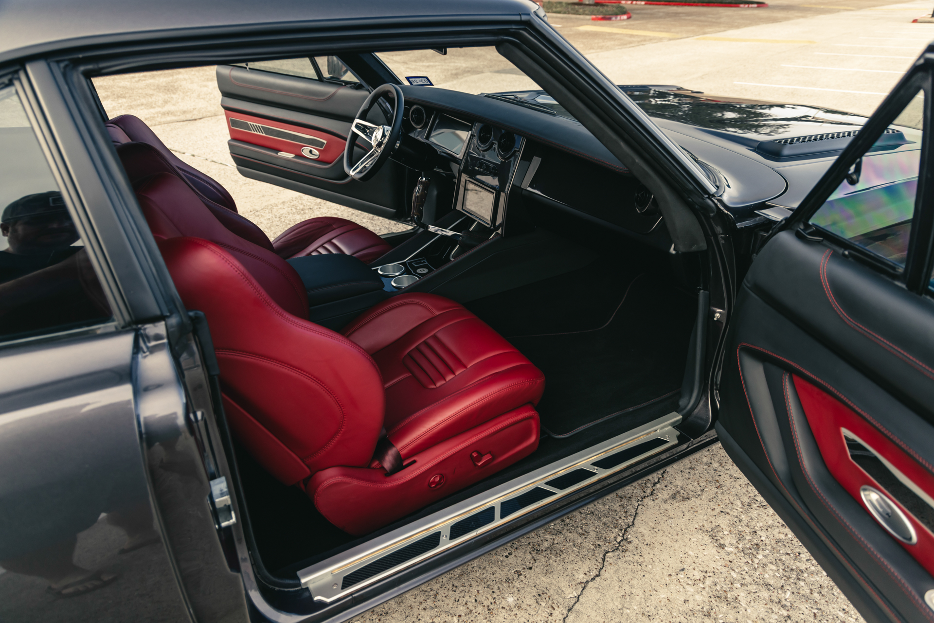 Work involved the installation of an Indy/Callies 528ci wedge V8 and a Tremec six-speed manual transmission as well as Wilwood four-wheel disc brakes, power rack-and-pinion steering, independent control-arm front suspension, a triangulated four-link rear suspension, adjustable coilovers, and Schott 19″ and 20″ wheels. The body was refinished in metallic gray with ghosted tail stripes over a red-and-black-leather interior outfitted with power-adjustable front bucket seats, Vintage Air climate control, a custom center console, power windows, a Holley EFI Pro Dash, and a Kenwood multimedia receiver with Bluetooth connectivity, JL Audio amplifiers, and Morel speakers. T