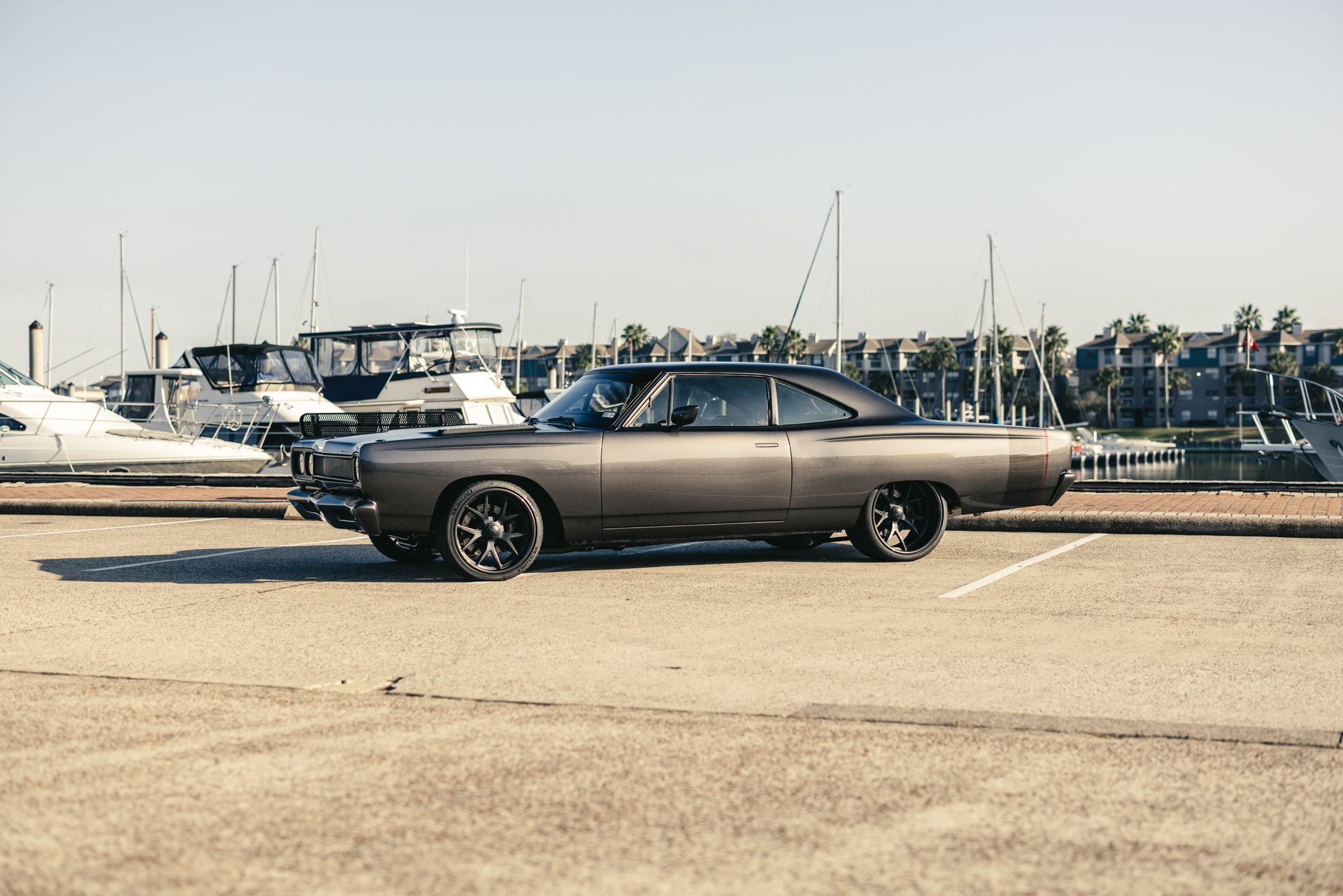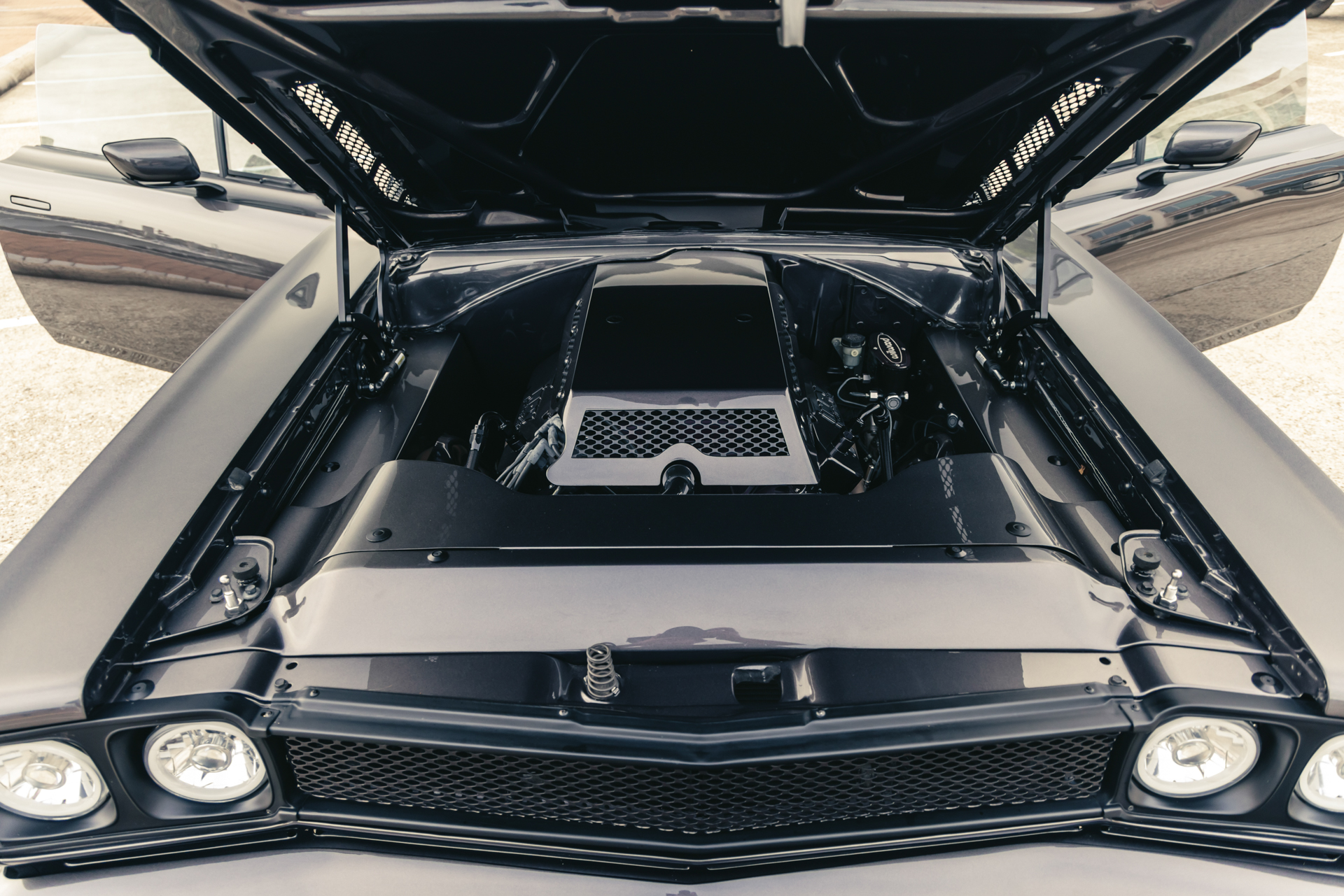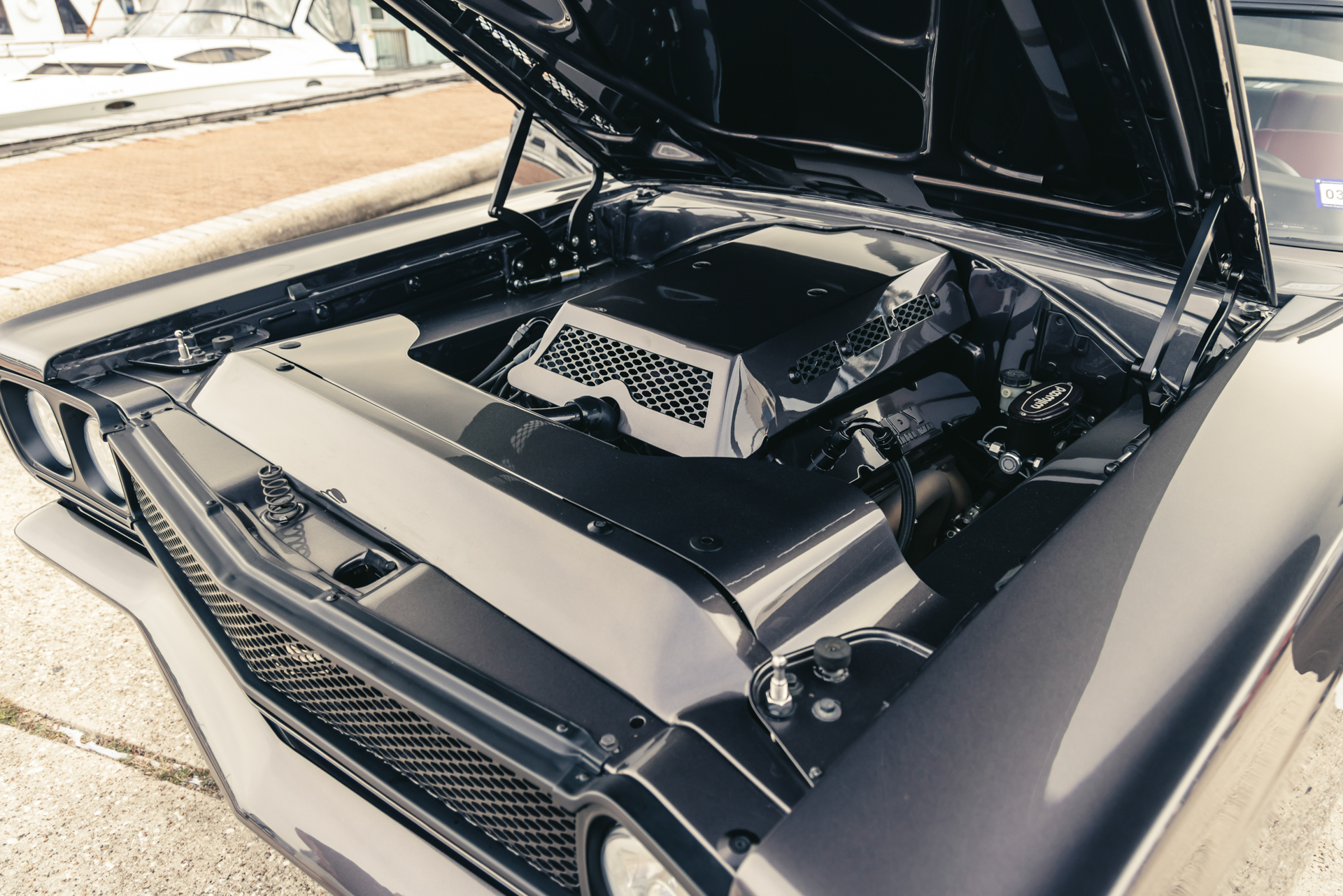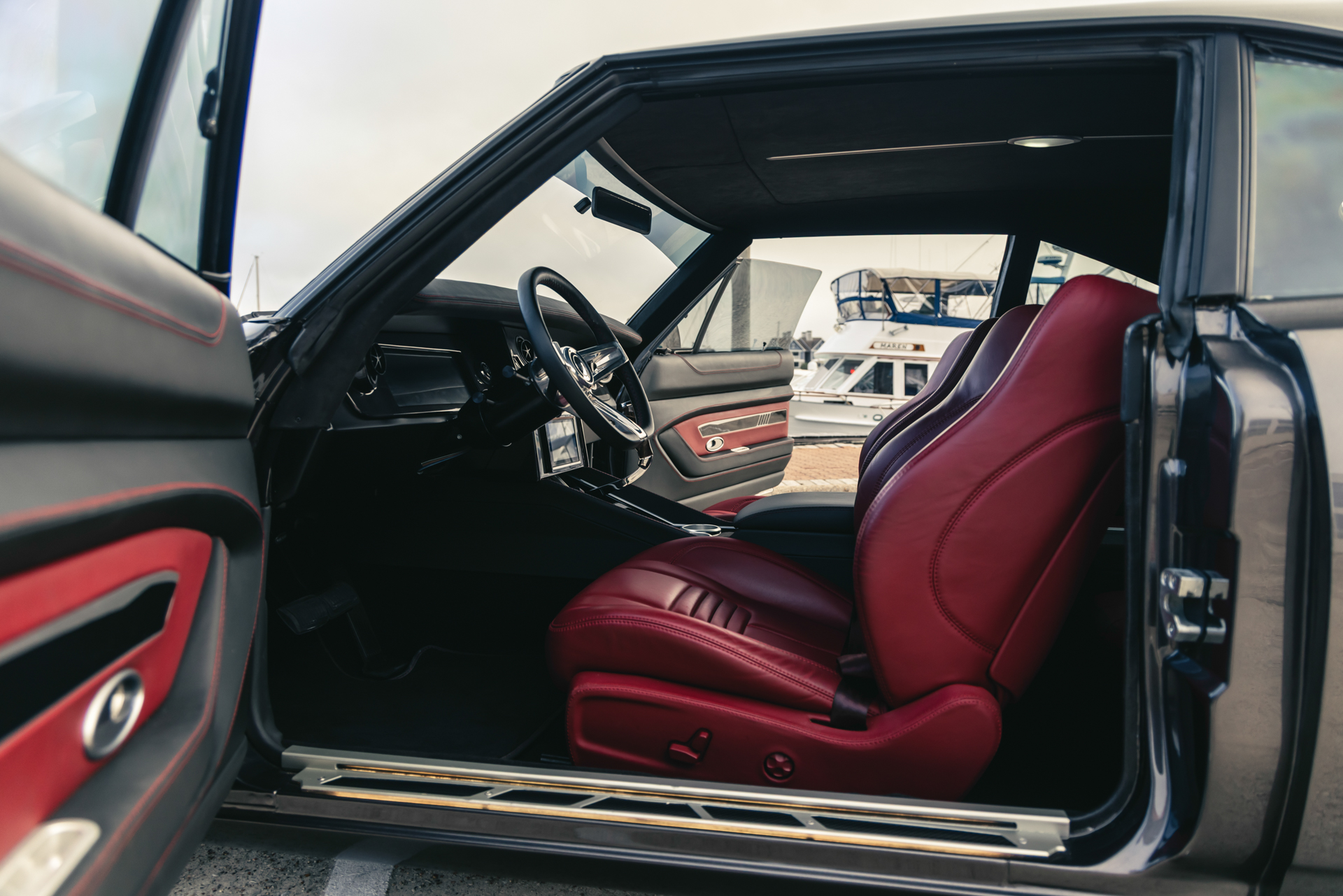 Work involved the installation of an Indy/Callies 528ci wedge V8 and a Tremec six-speed manual transmission as well as Wilwood four-wheel disc brakes, power rack-and-pinion steering, independent control-arm front suspension, a triangulated four-link rear suspension, adjustable coilovers, and Schott 19″ and 20″ wheels. The body was refinished in metallic gray with ghosted tail stripes over a red-and-black-leather interior outfitted with power-adjustable front bucket seats, Vintage Air climate control, a custom center console, power windows, a Holley EFI Pro Dash, and a Kenwood multimedia receiver with Bluetooth connectivity, JL Audio amplifiers, and Morel speakers. T