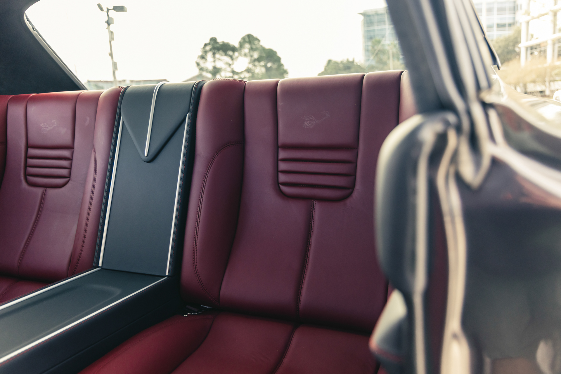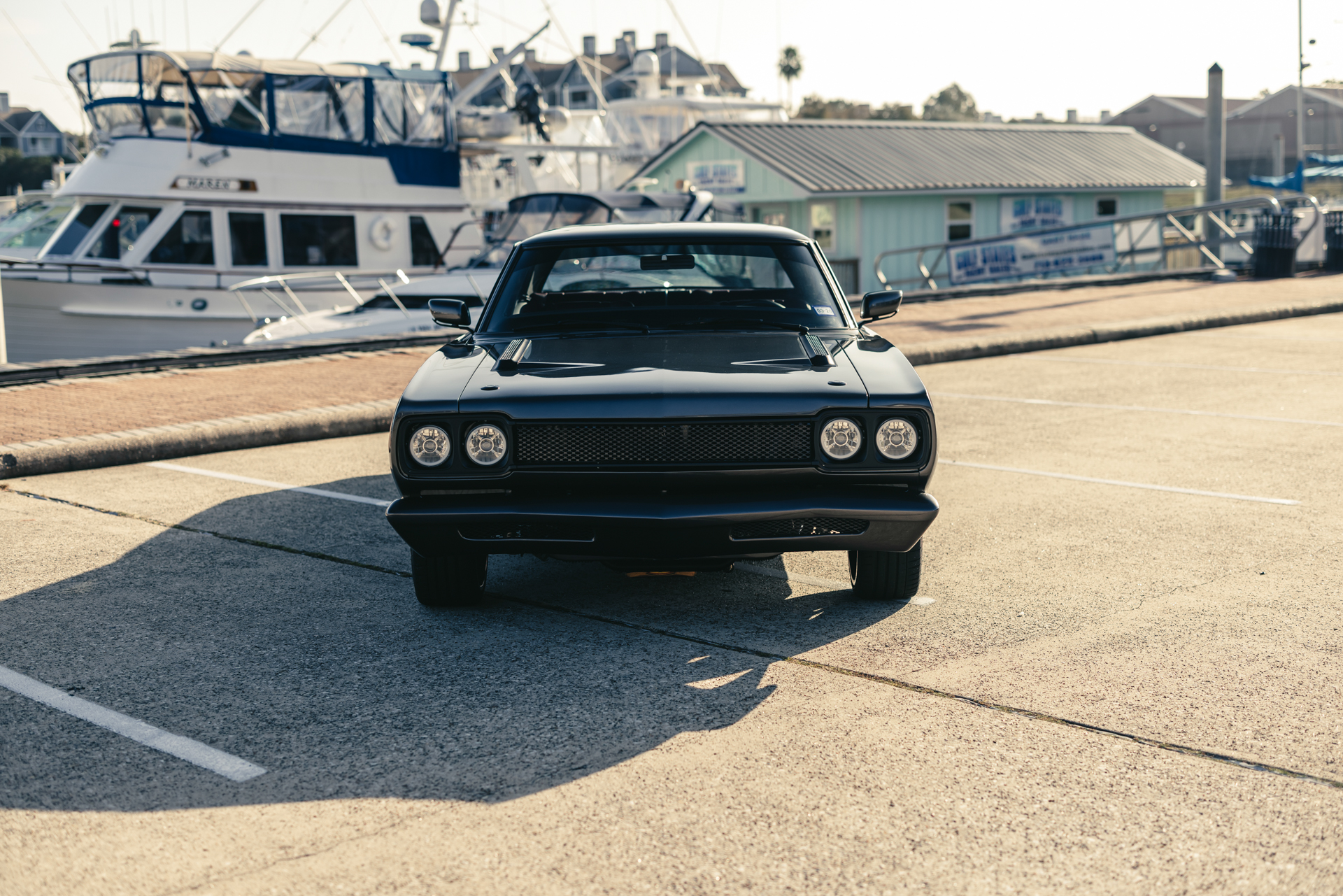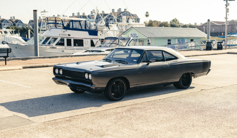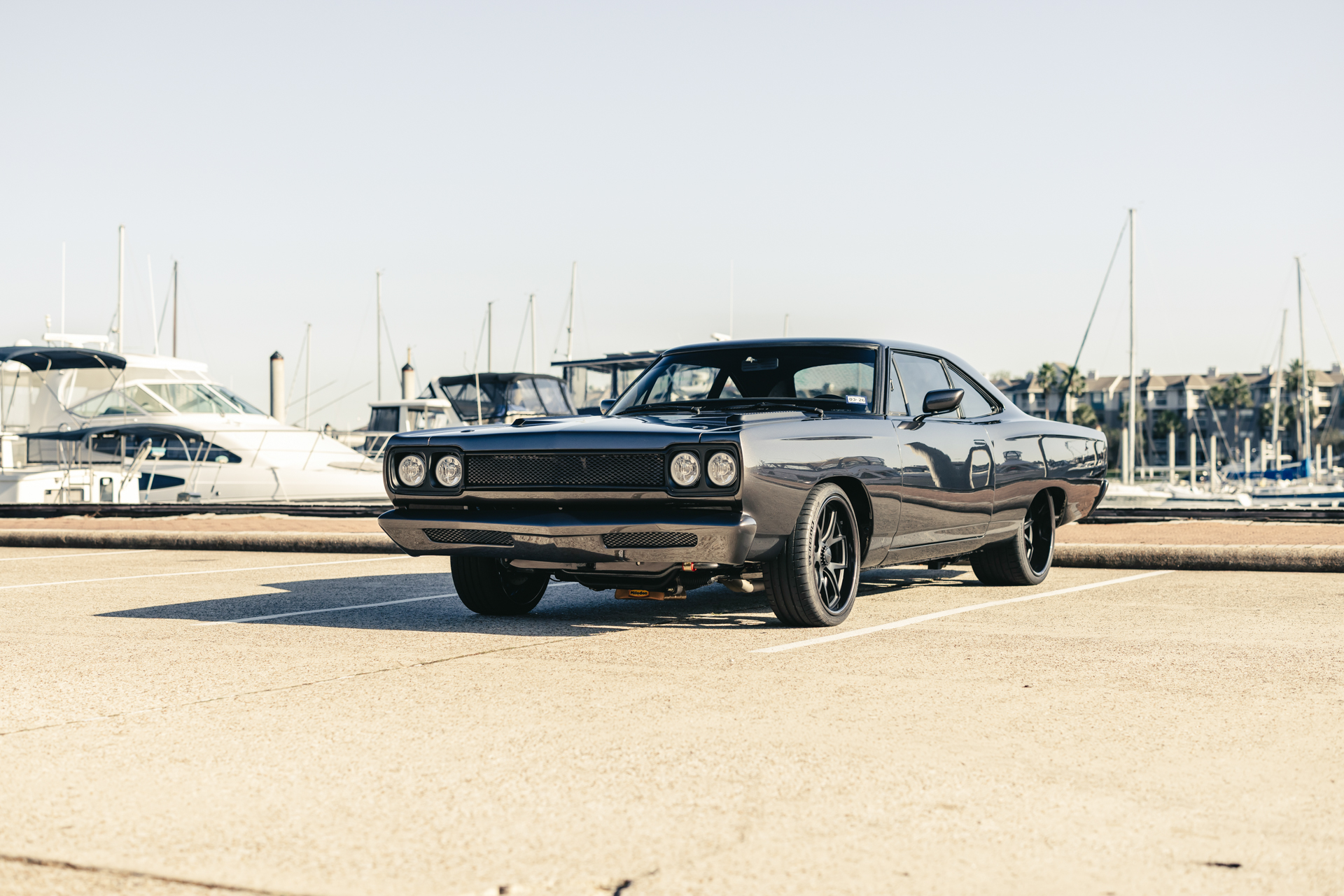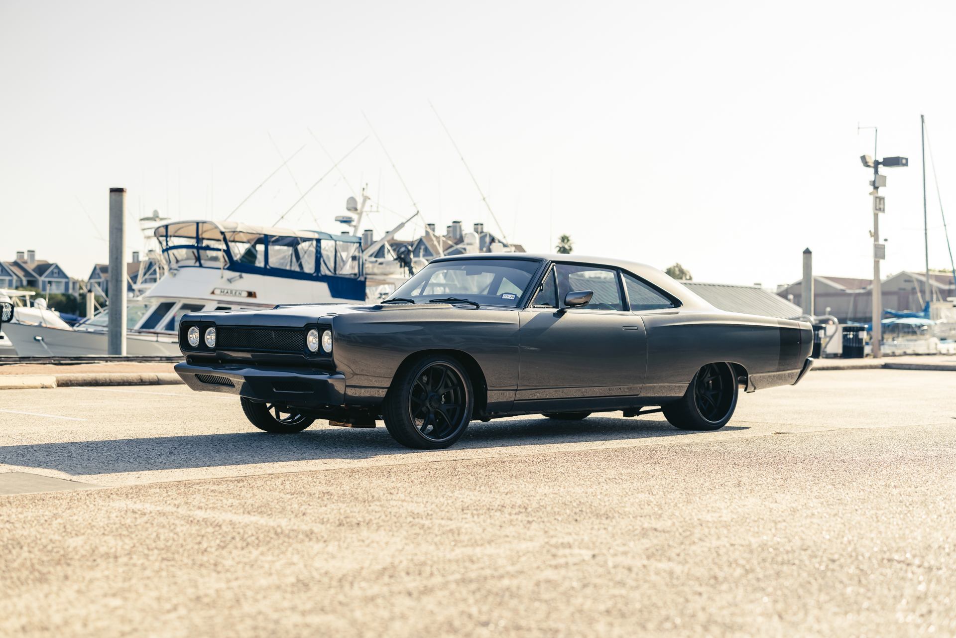Work involved the installation of an Indy/Callies 528ci wedge V8 and a Tremec six-speed manual transmission as well as Wilwood four-wheel disc brakes, power rack-and-pinion steering, independent control-arm front suspension, a triangulated four-link rear suspension, adjustable coilovers, and Schott 19″ and 20″ wheels. The body was refinished in metallic gray with ghosted tail stripes over a red-and-black-leather interior outfitted with power-adjustable front bucket seats, Vintage Air climate control, a custom center console, power windows, a Holley EFI Pro Dash, and a Kenwood multimedia receiver with Bluetooth connectivity, JL Audio amplifiers, and Morel speakers. T