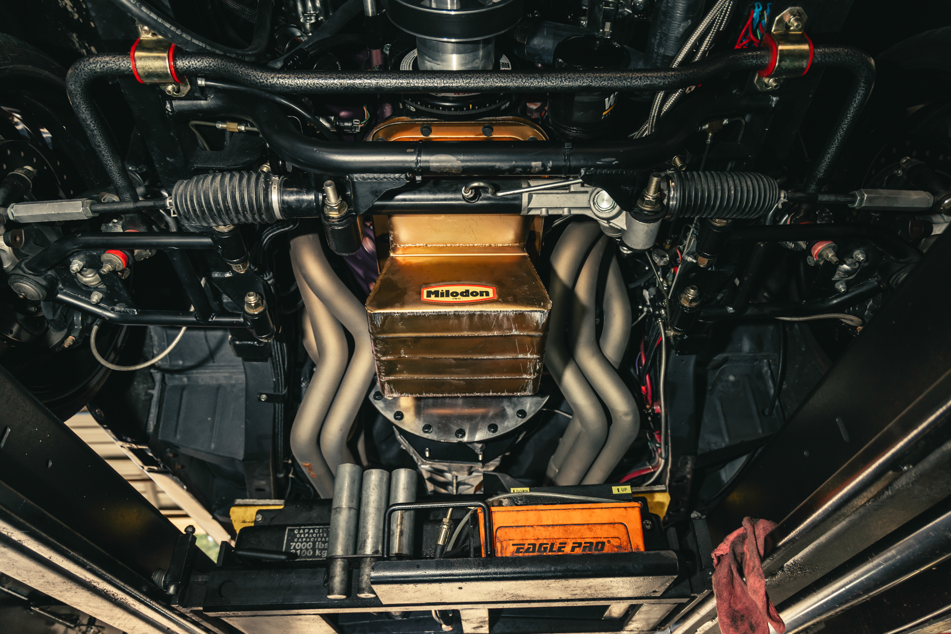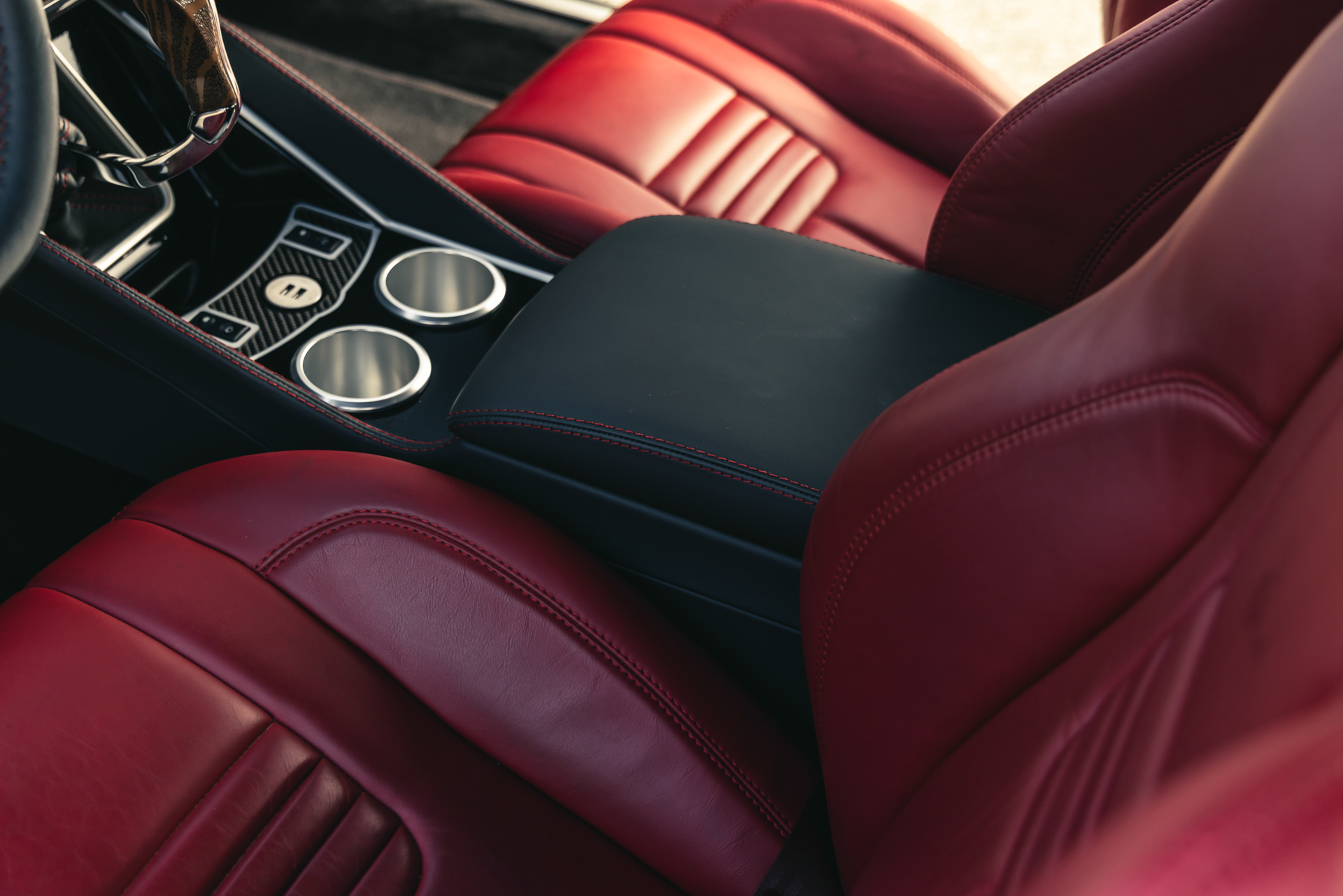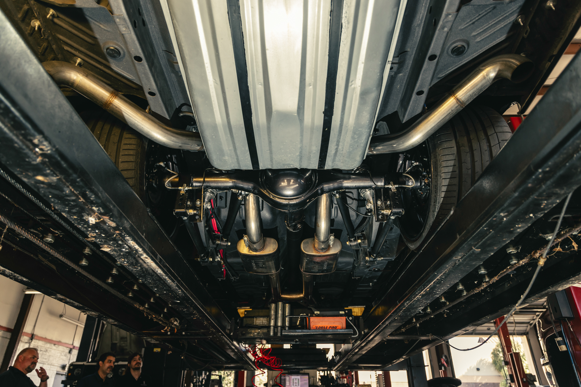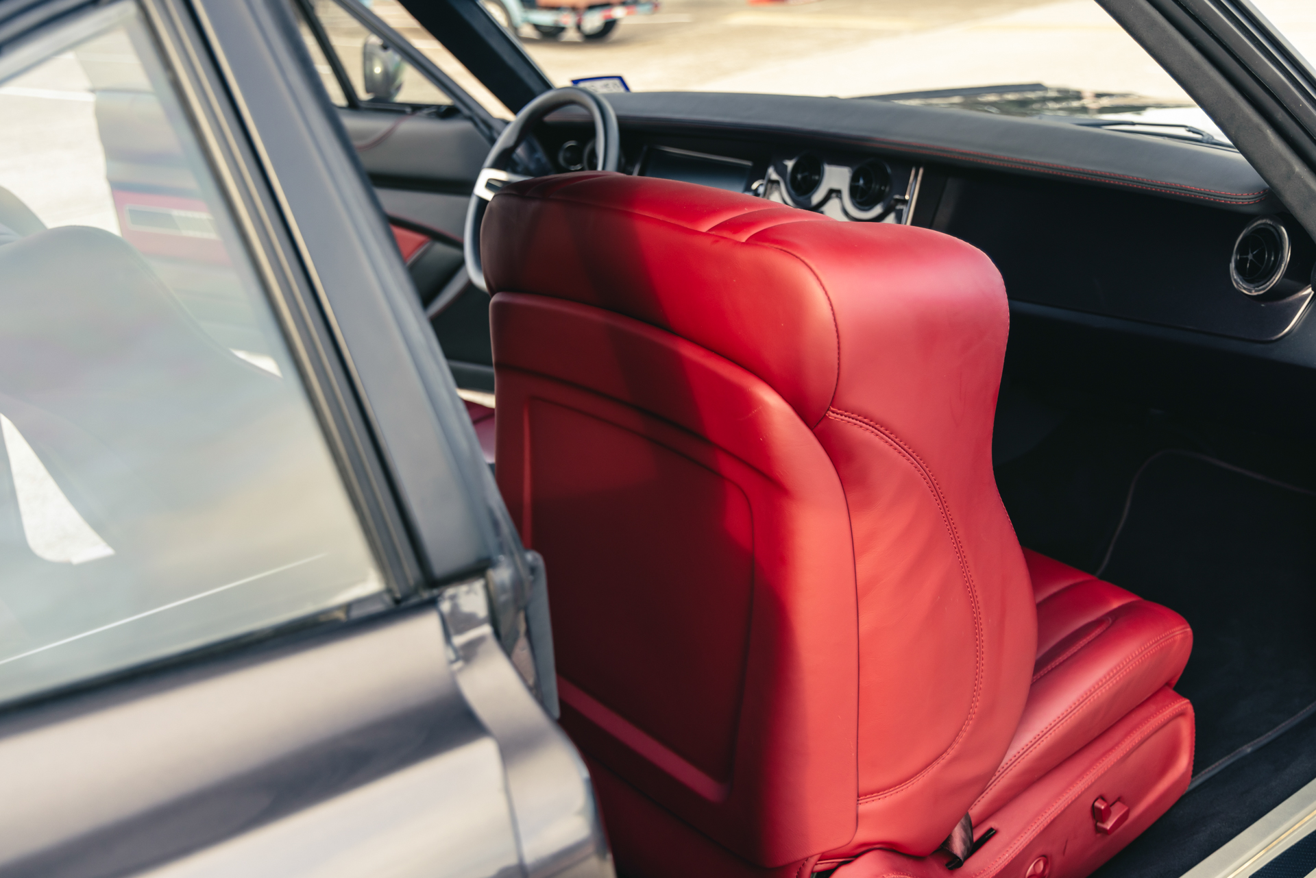 Work involved the installation of an Indy/Callies 528ci wedge V8 and a Tremec six-speed manual transmission as well as Wilwood four-wheel disc brakes, power rack-and-pinion steering, independent control-arm front suspension, a triangulated four-link rear suspension, adjustable coilovers, and Schott 19″ and 20″ wheels. The body was refinished in metallic gray with ghosted tail stripes over a red-and-black-leather interior outfitted with power-adjustable front bucket seats, Vintage Air climate control, a custom center console, power windows, a Holley EFI Pro Dash, and a Kenwood multimedia receiver with Bluetooth connectivity, JL Audio amplifiers, and Morel speakers. T