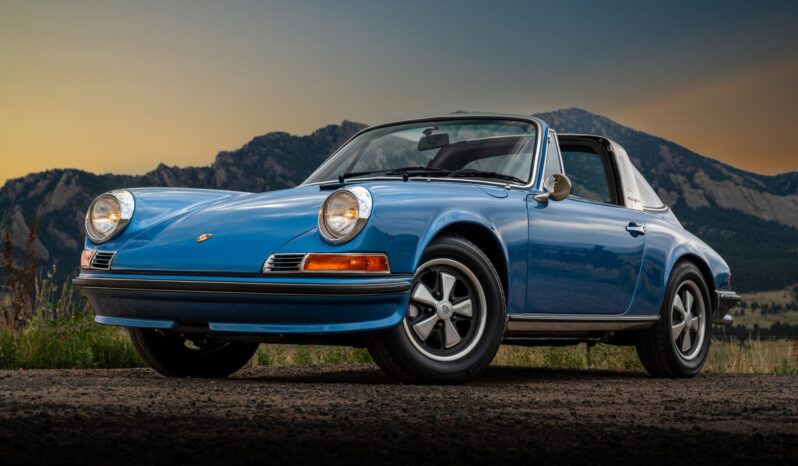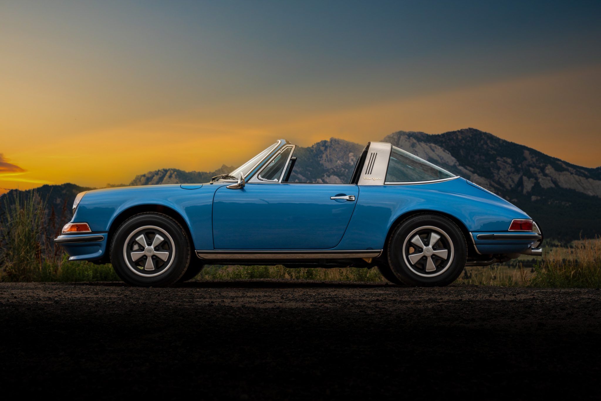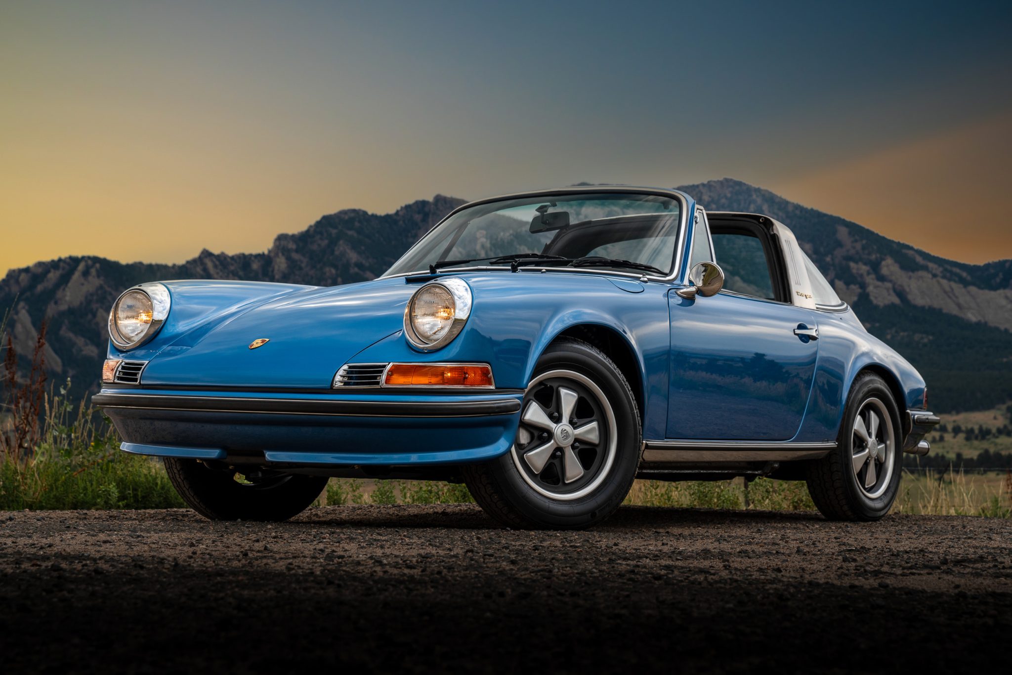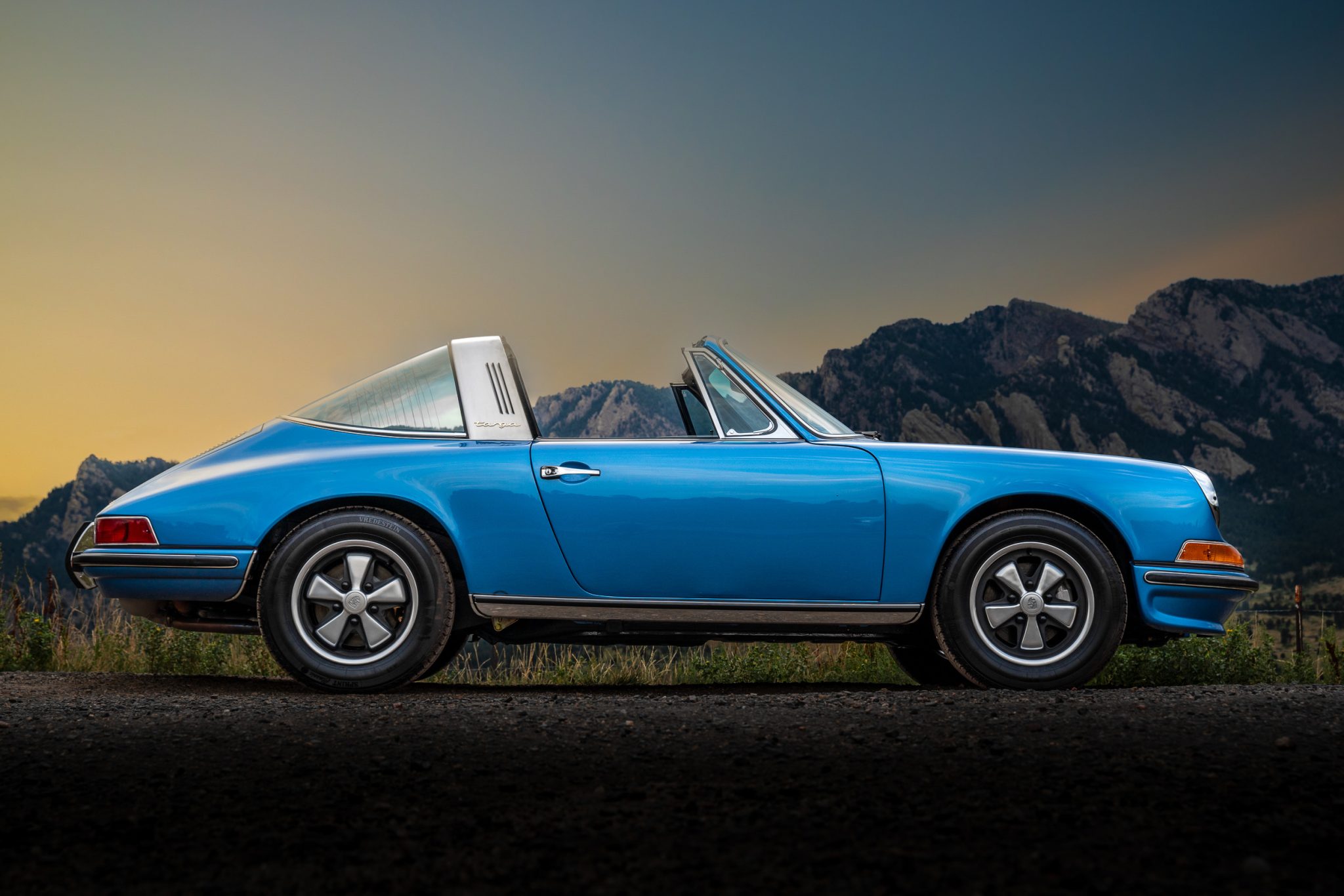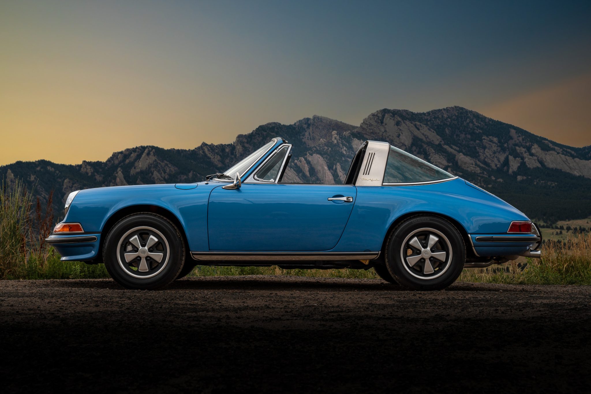 This 1969 Porsche 911E Targa was refurbished in 2022, with work reportedly involving a repaint, reupholstered interior, replacement of the 15″ Fuchs wheels and exhaust system, and overhauls of the engine, transaxle, disc brakes, and suspension. It is finished in Metallic Blue over black leatherette and is powered by a replacement 2.4-liter flat-six paired with a five-speed 901 manual transaxle. Equipment includes a removable Targa panel, a 911S-style front bumper, an AM radio, and front comfort seats.