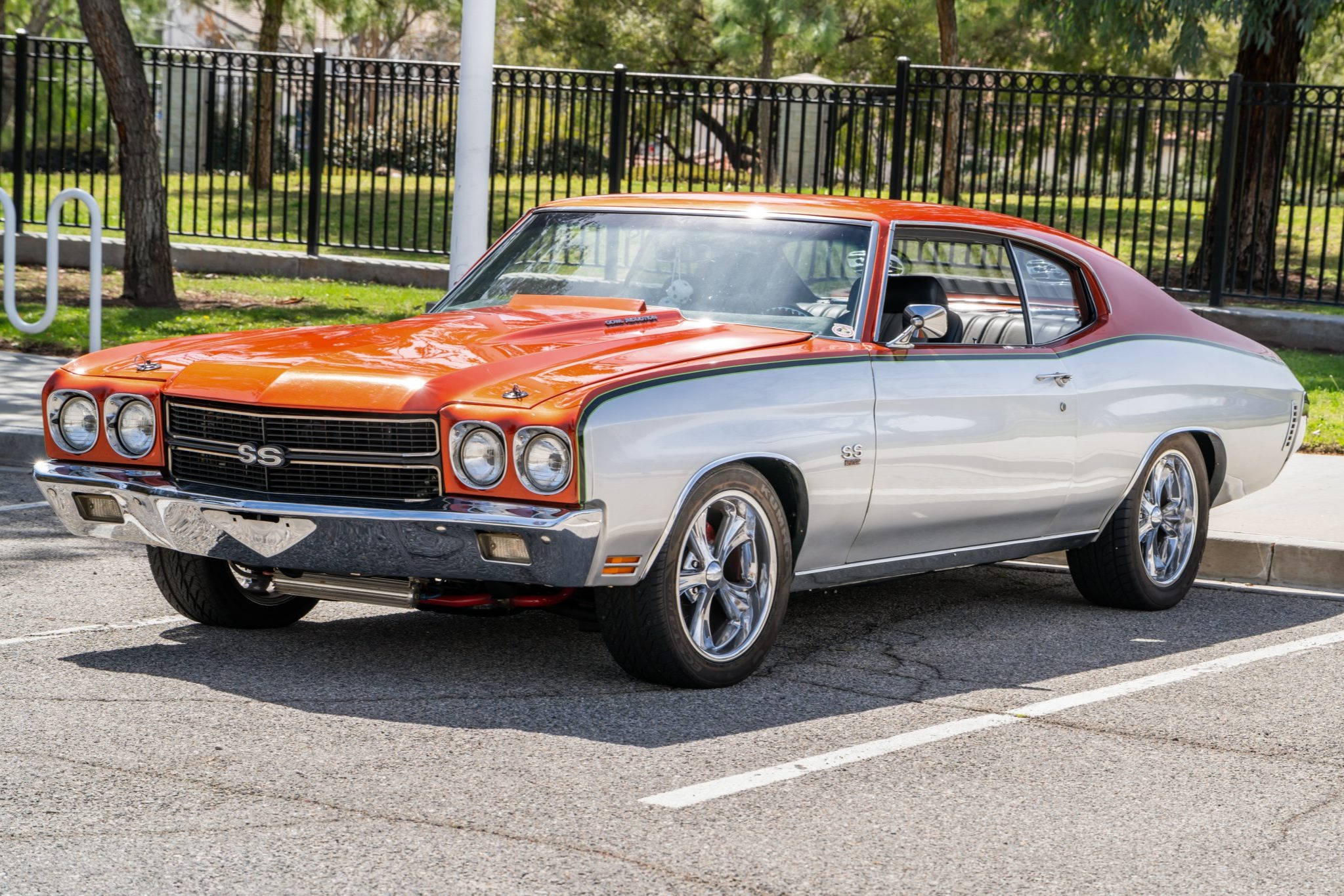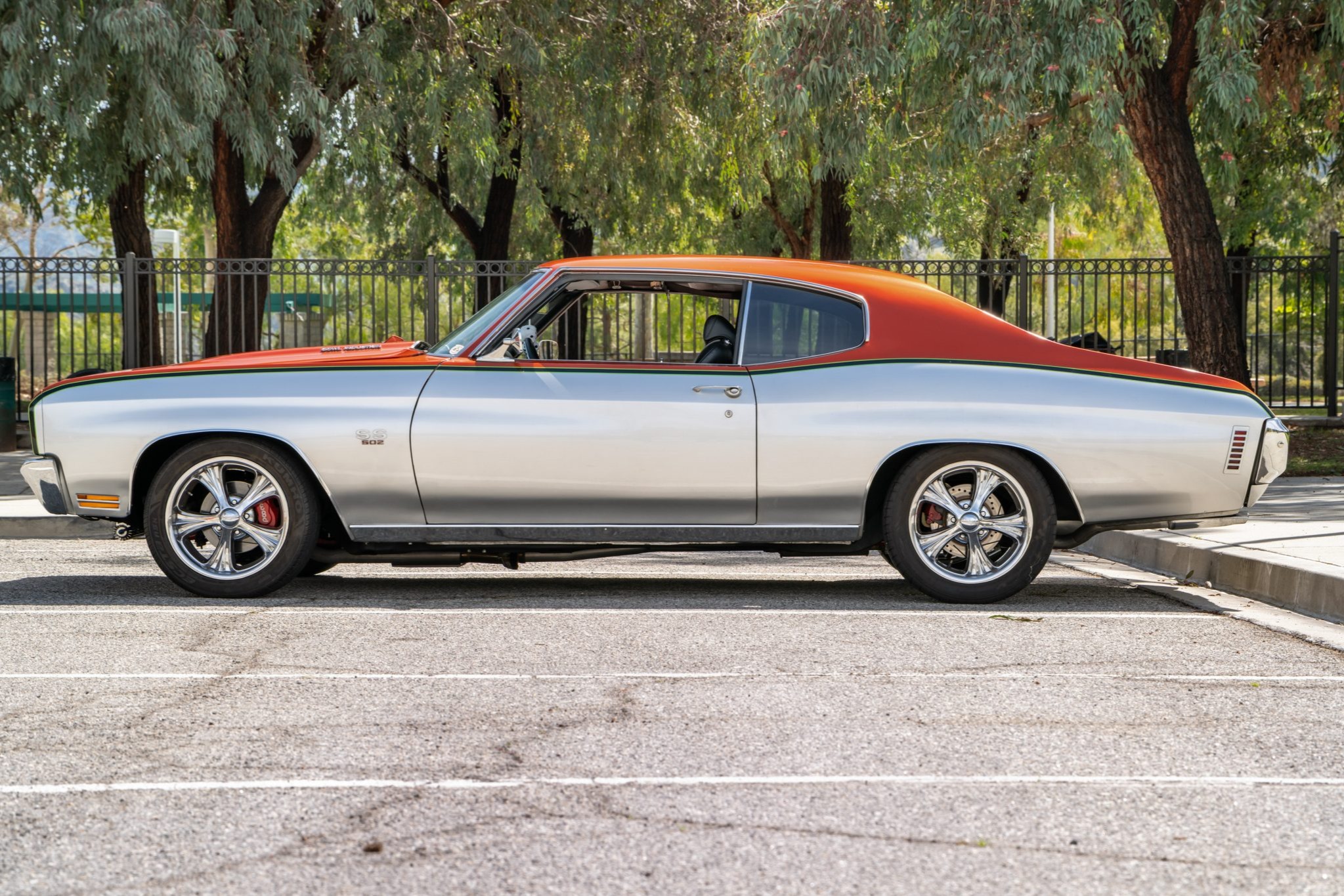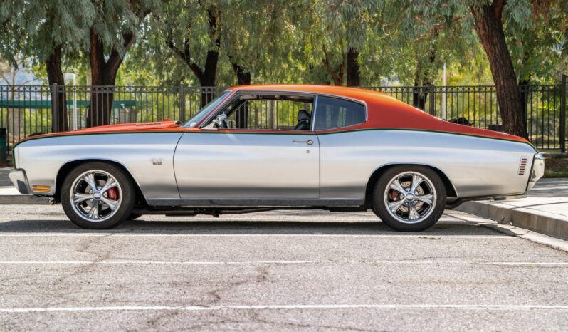 This 1970 Chevrolet Chevelle Malibu sport coupe was refurbished in 2016, which included refinishing the exterior in metallic orange and silver with black and green accent stripes. The ZZ502 crate V8 is equipped with Edelbrock aluminum heads and a NASCAR Edition intake manifold as well as a Holley carburetor, and power is routed through a modified 700R4 automatic transmission that is linked to a limited-slip differential with 3.73:1 gears. The car rides on a high-performance suspension with coilovers and heavy-duty sway bars, and the Boyd Coddington 17″ wheels are mounted over power four-wheel disc brakes. Details include a cowl-induction hood, SS-style trim, black and gray vinyl upholstery, a digital stereo, air conditioning, and front bucket seats.