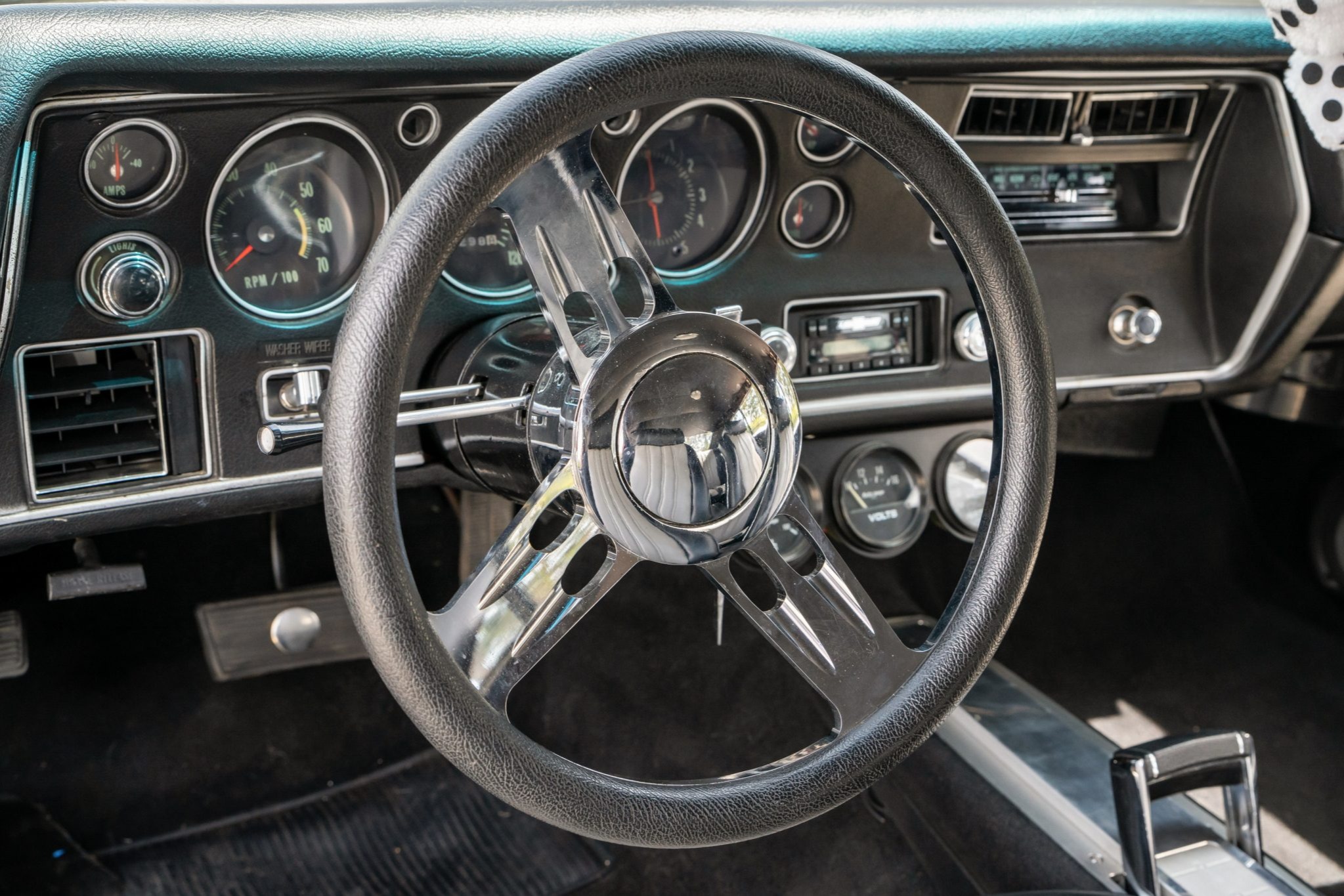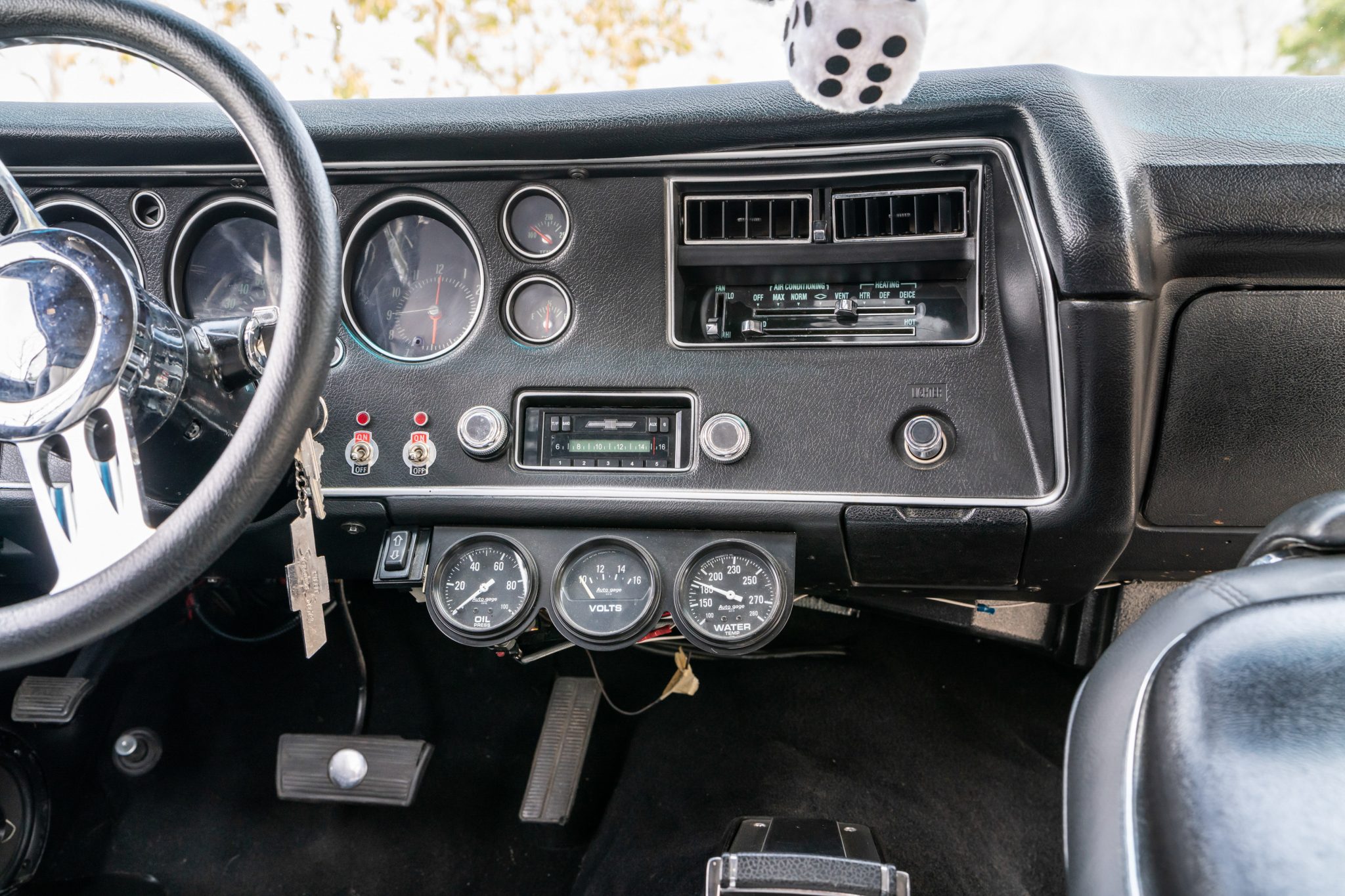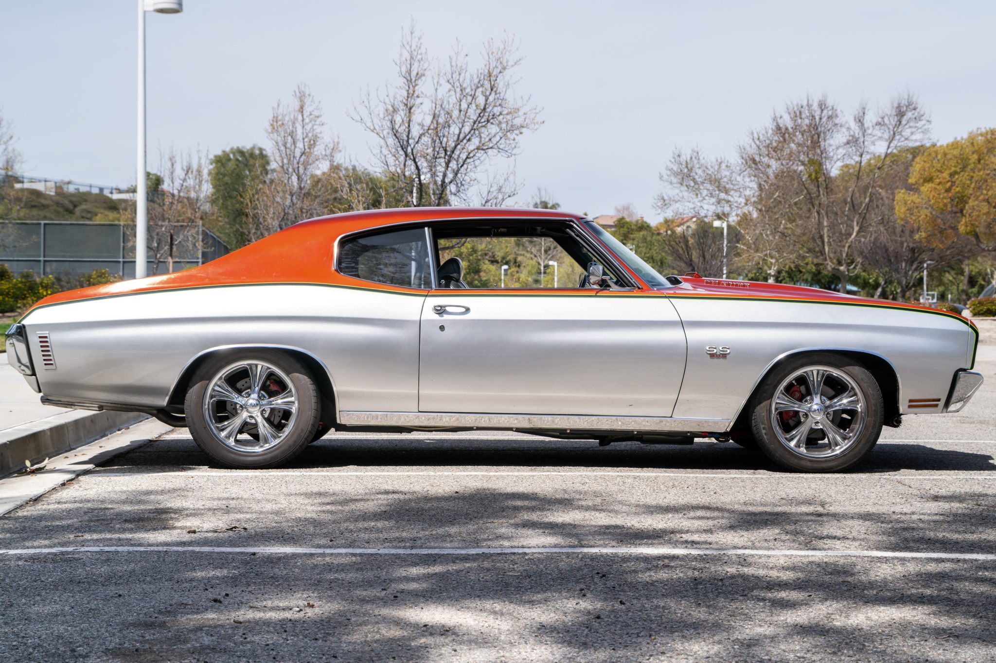 This 1970 Chevrolet Chevelle Malibu sport coupe was refurbished in 2016, which included refinishing the exterior in metallic orange and silver with black and green accent stripes. The ZZ502 crate V8 is equipped with Edelbrock aluminum heads and a NASCAR Edition intake manifold as well as a Holley carburetor, and power is routed through a modified 700R4 automatic transmission that is linked to a limited-slip differential with 3.73:1 gears. The car rides on a high-performance suspension with coilovers and heavy-duty sway bars, and the Boyd Coddington 17″ wheels are mounted over power four-wheel disc brakes. Details include a cowl-induction hood, SS-style trim, black and gray vinyl upholstery, a digital stereo, air conditioning, and front bucket seats.