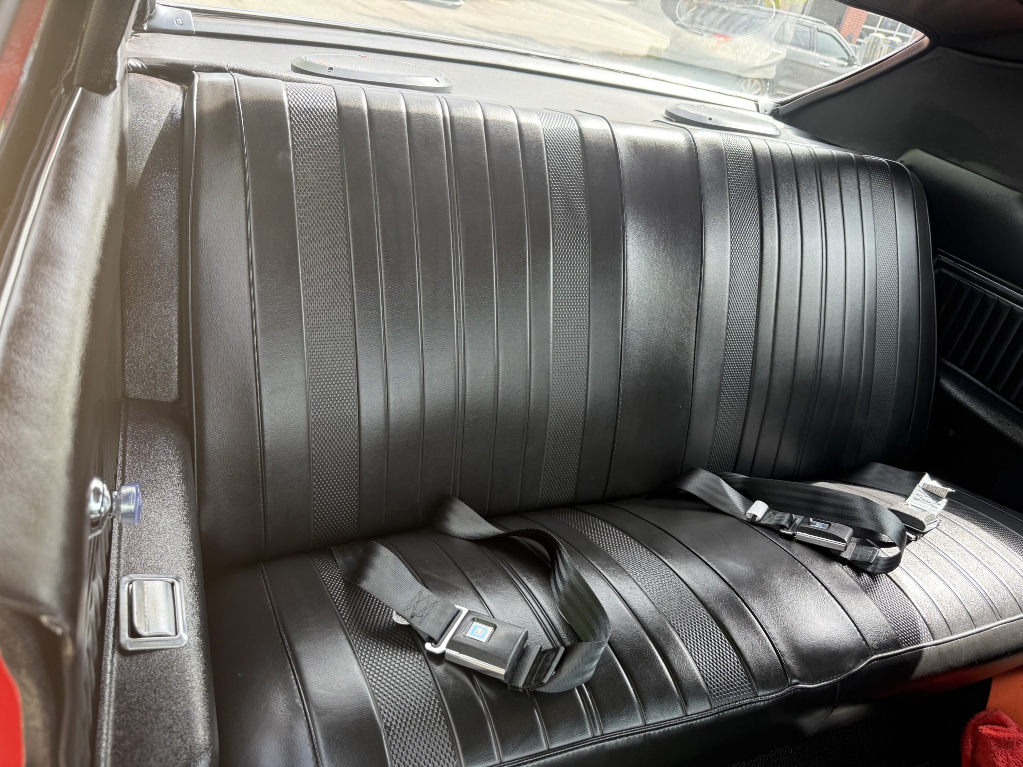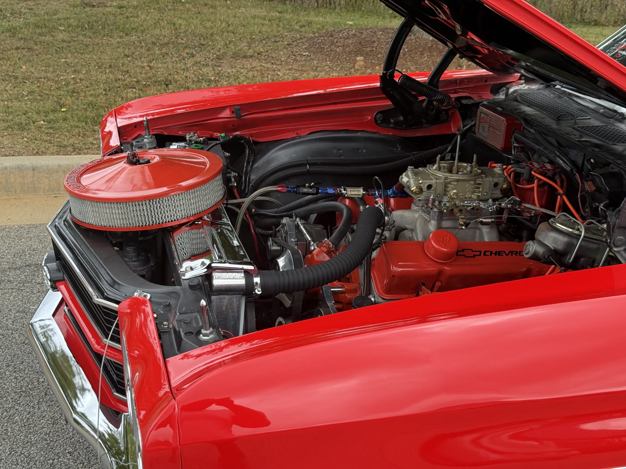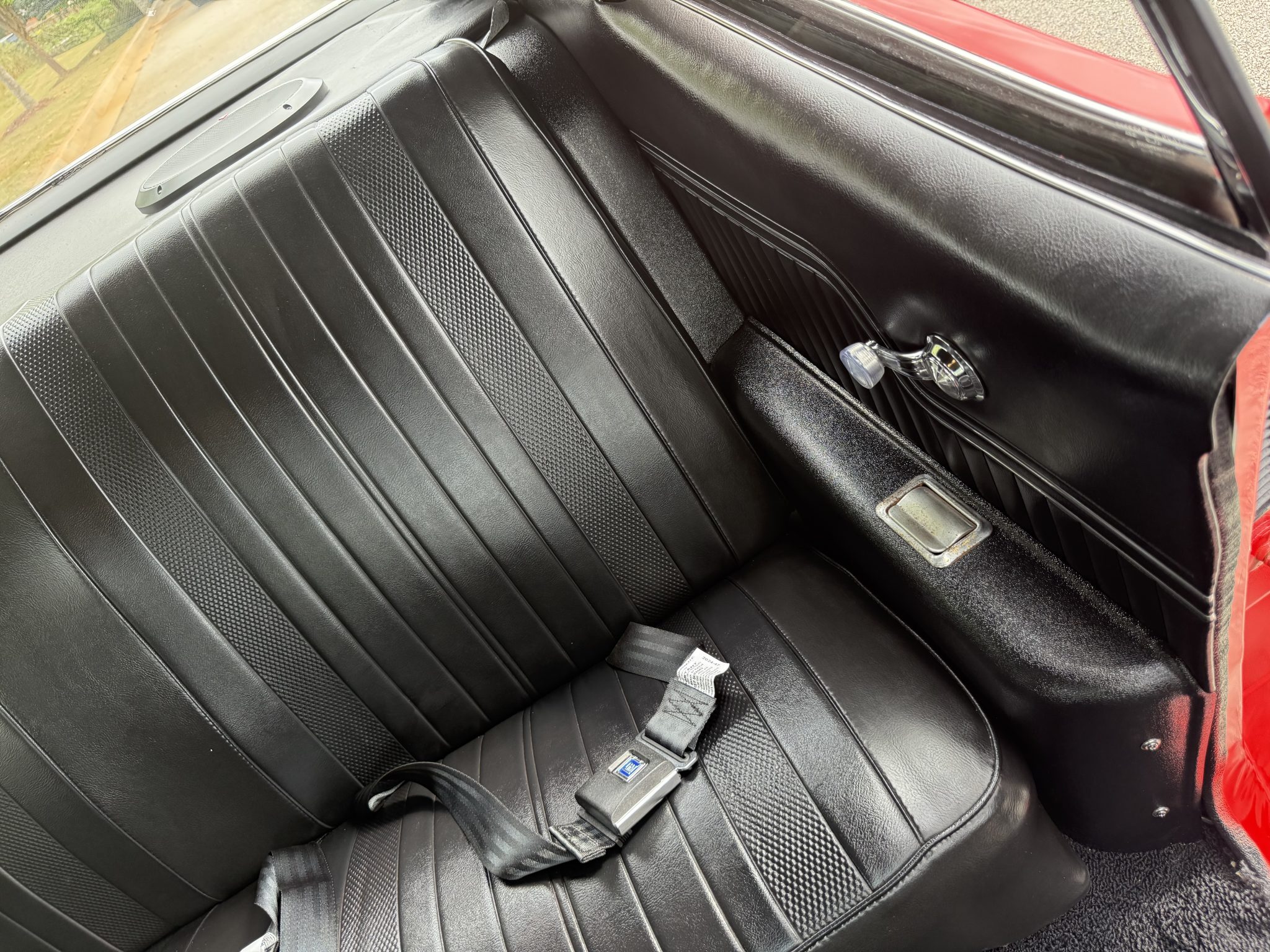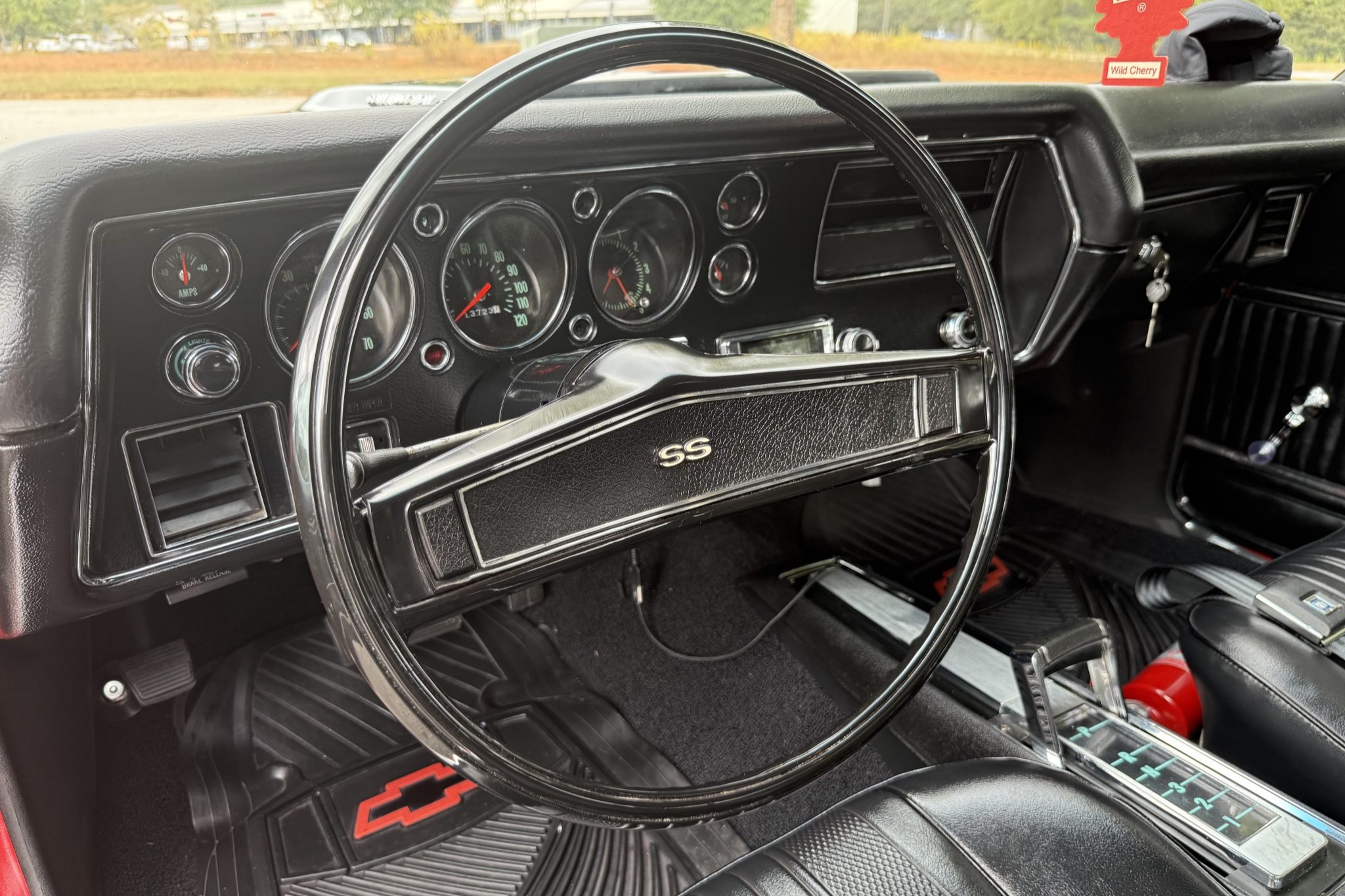 A 385ci small-block stroker V8 was installed in 2020 and is linked to a TCI TH350 three-speed automatic transmission and a 10-bolt rear end with a 3.73:1 differential. Inside, the front bucket seats and rear bench are trimmed in black vinyl and accompanied by a center console, a horseshoe shifter, and a RetroSound stereo. Additional equipment includes a dual exhaust system, front and rear QA1 adjustable coilovers, power-assisted front disc brakes, an aluminum radiator with dual electric fans, a Holley carburetor, and an Edelbrock Performer RPM intake manifold, camshaft, and cylinder heads.