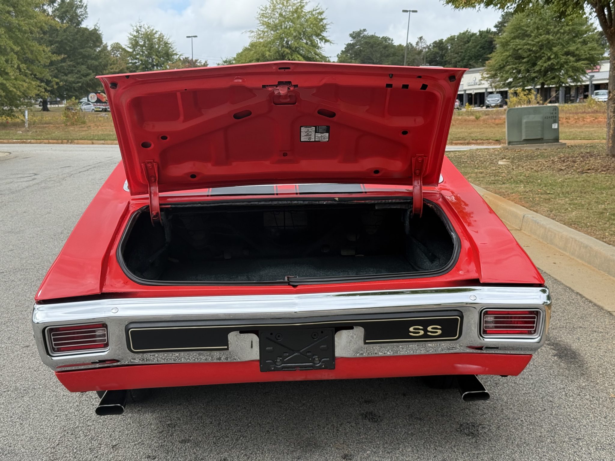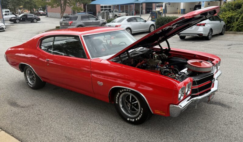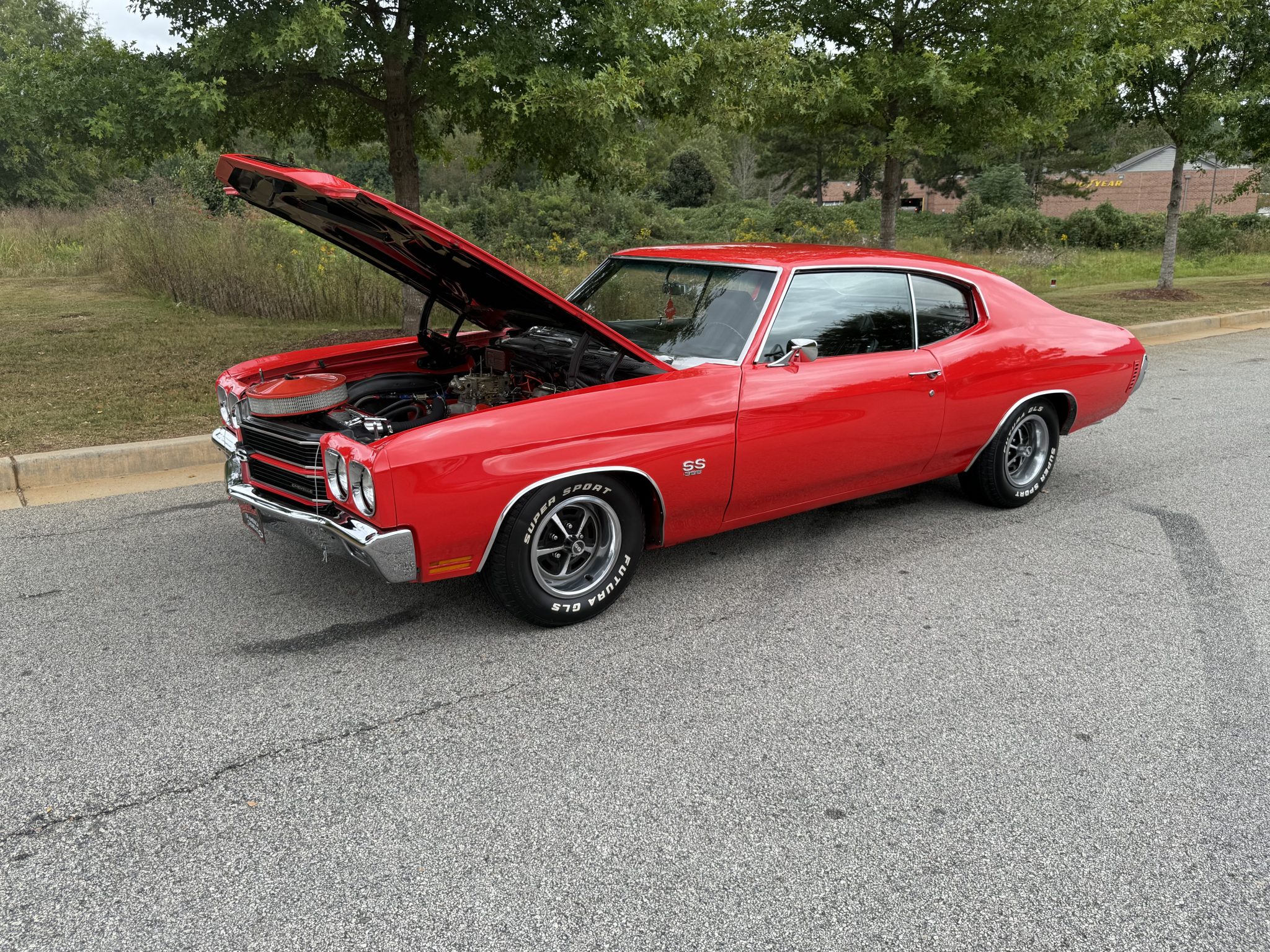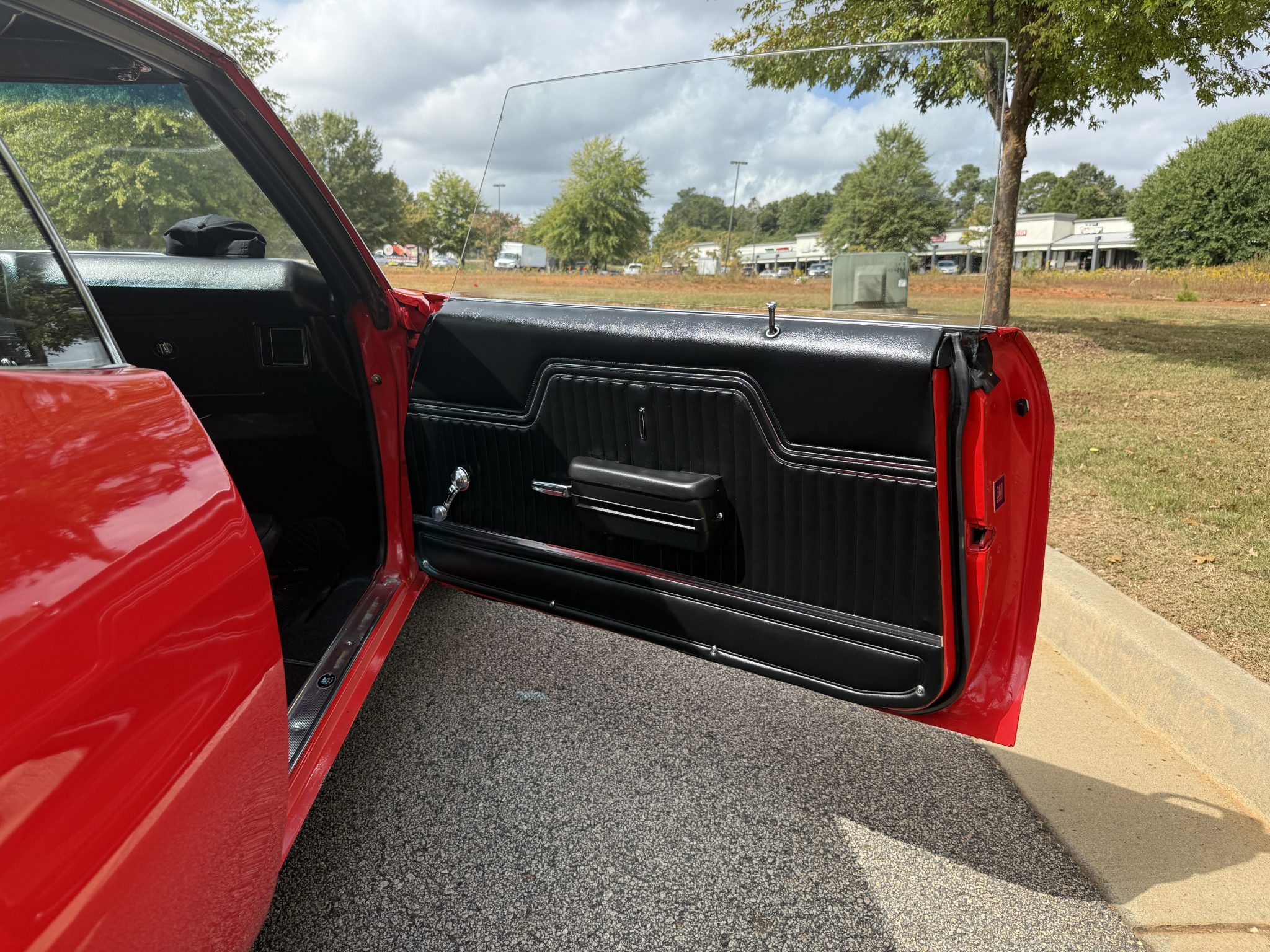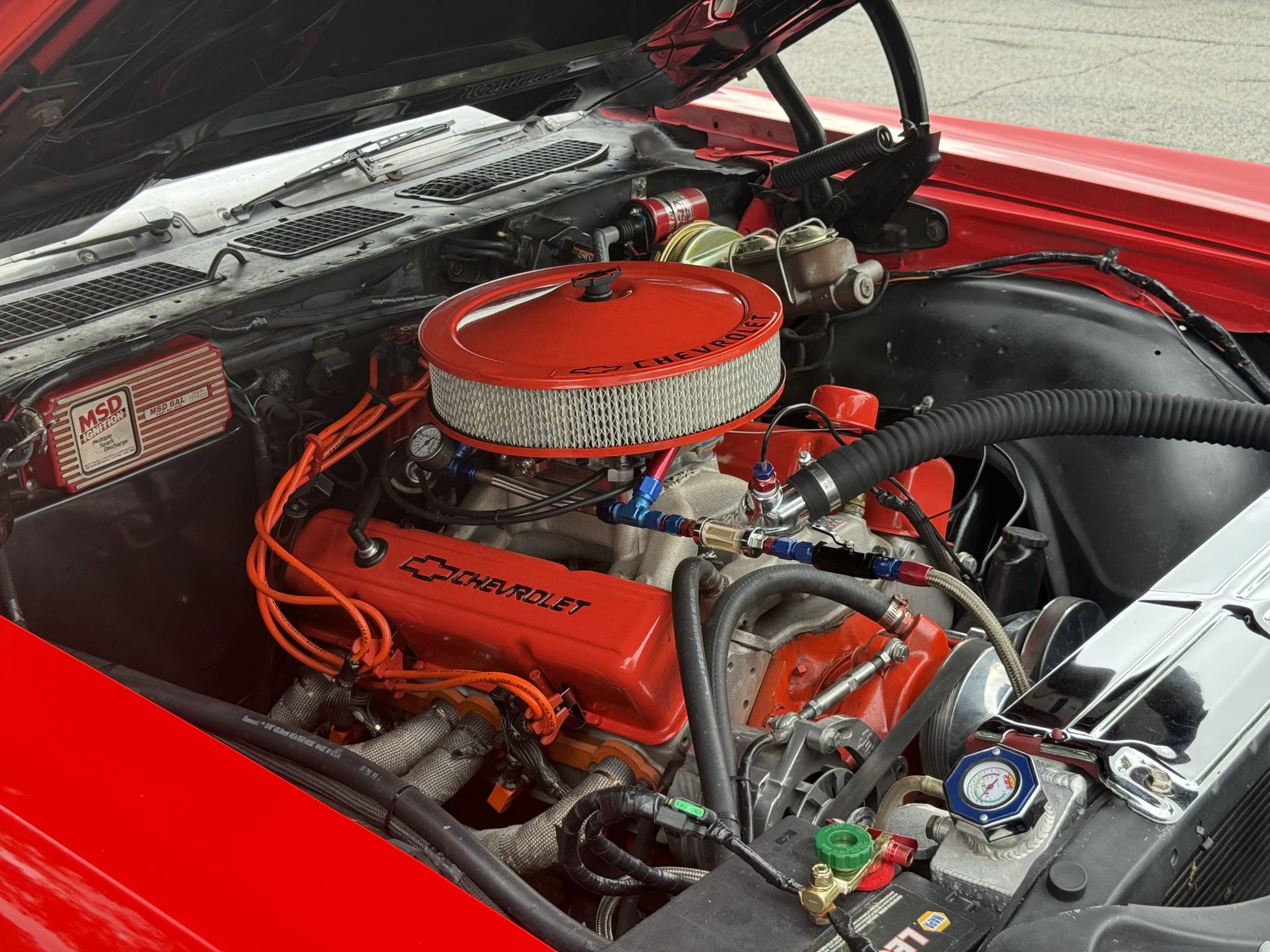 A 385ci small-block stroker V8 was installed in 2020 and is linked to a TCI TH350 three-speed automatic transmission and a 10-bolt rear end with a 3.73:1 differential. Inside, the front bucket seats and rear bench are trimmed in black vinyl and accompanied by a center console, a horseshoe shifter, and a RetroSound stereo. Additional equipment includes a dual exhaust system, front and rear QA1 adjustable coilovers, power-assisted front disc brakes, an aluminum radiator with dual electric fans, a Holley carburetor, and an Edelbrock Performer RPM intake manifold, camshaft, and cylinder heads.