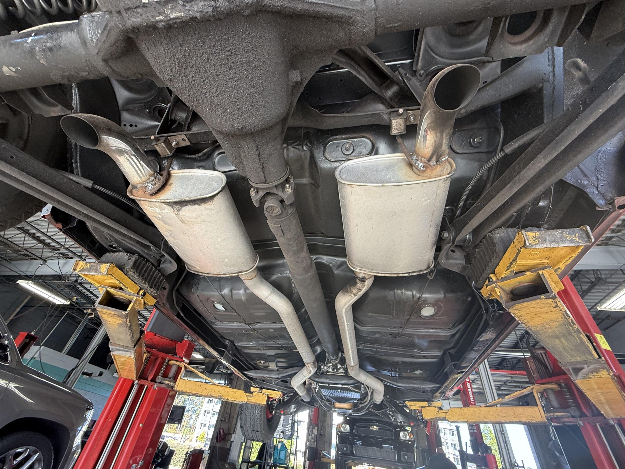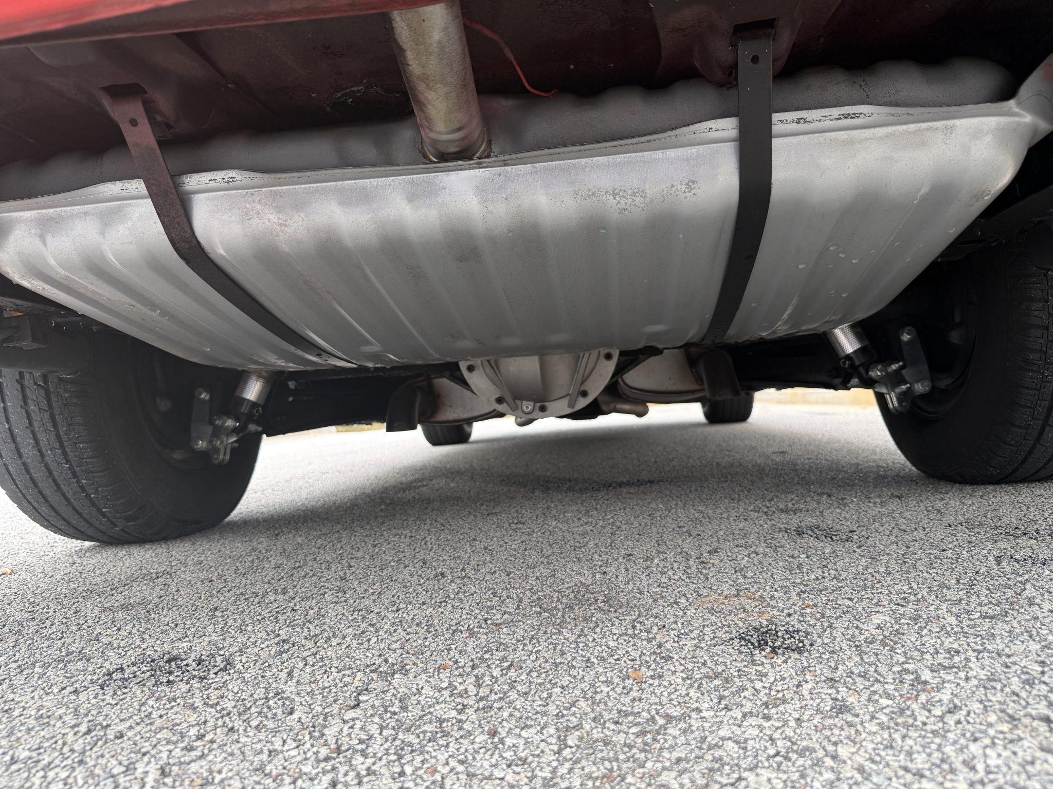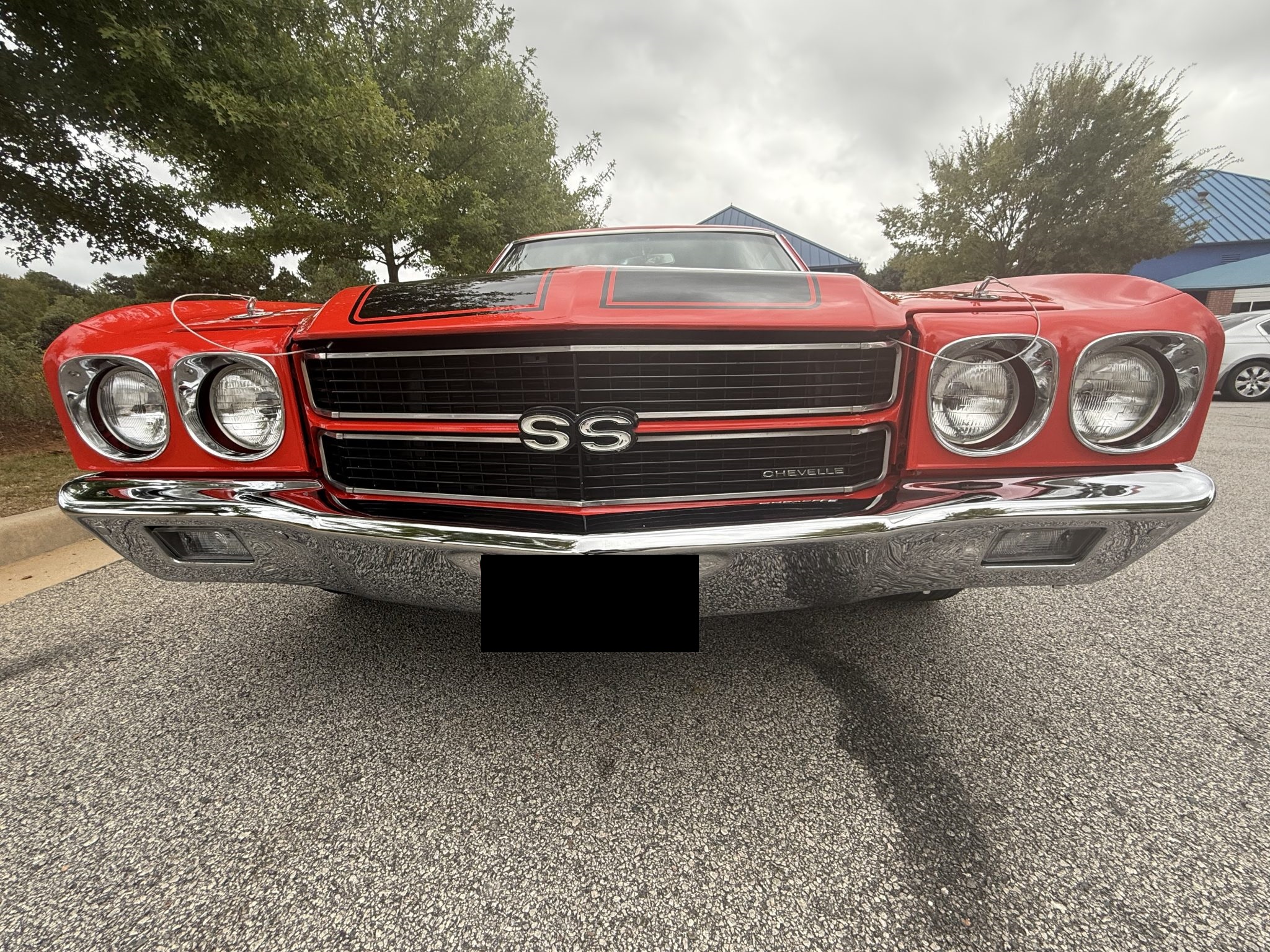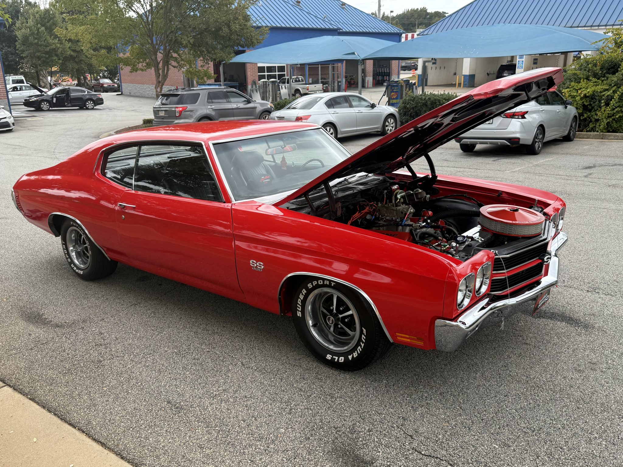 A 385ci small-block stroker V8 was installed in 2020 and is linked to a TCI TH350 three-speed automatic transmission and a 10-bolt rear end with a 3.73:1 differential. Inside, the front bucket seats and rear bench are trimmed in black vinyl and accompanied by a center console, a horseshoe shifter, and a RetroSound stereo. Additional equipment includes a dual exhaust system, front and rear QA1 adjustable coilovers, power-assisted front disc brakes, an aluminum radiator with dual electric fans, a Holley carburetor, and an Edelbrock Performer RPM intake manifold, camshaft, and cylinder heads.