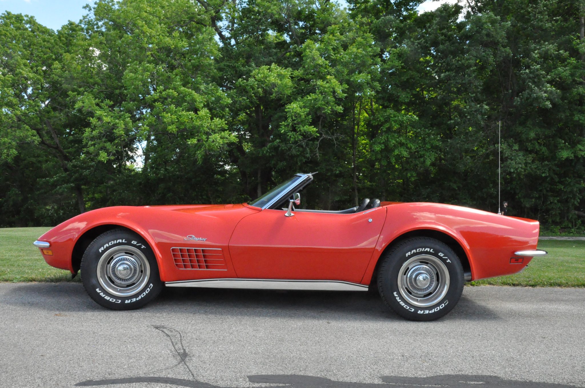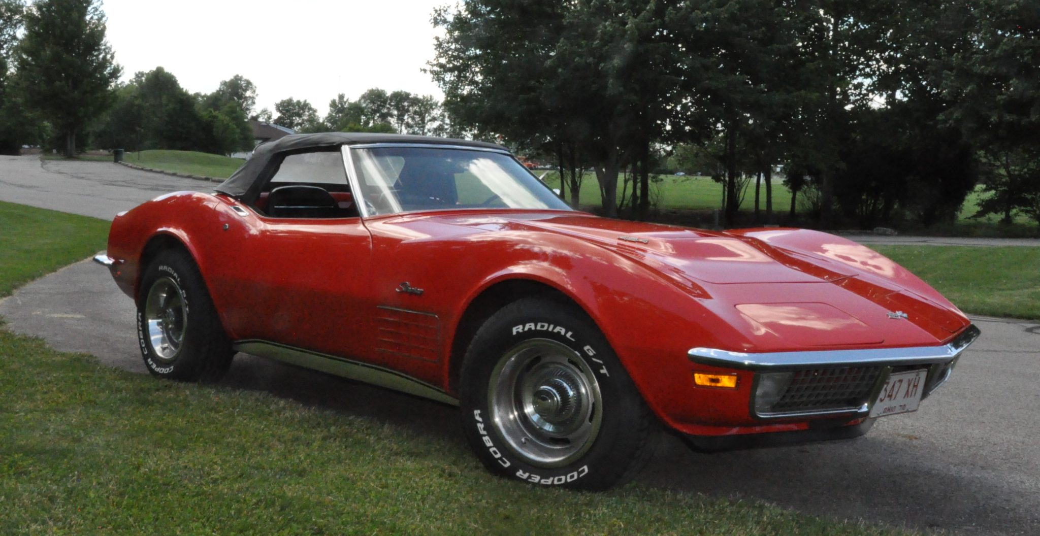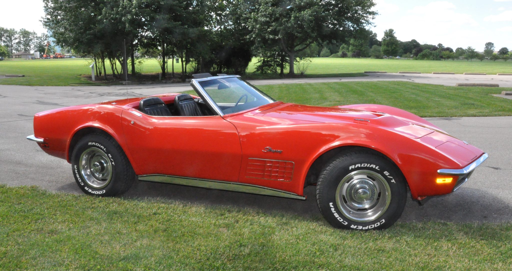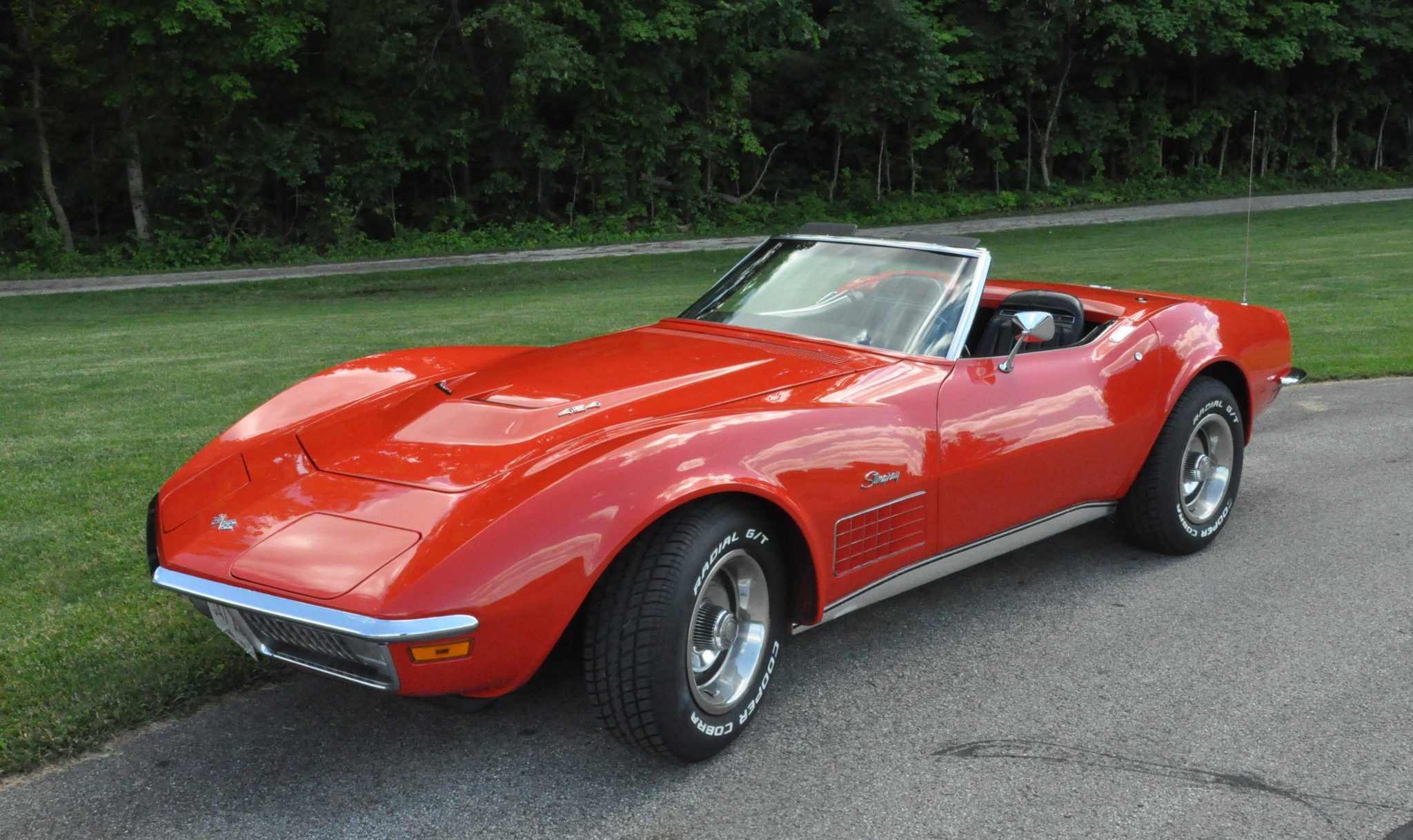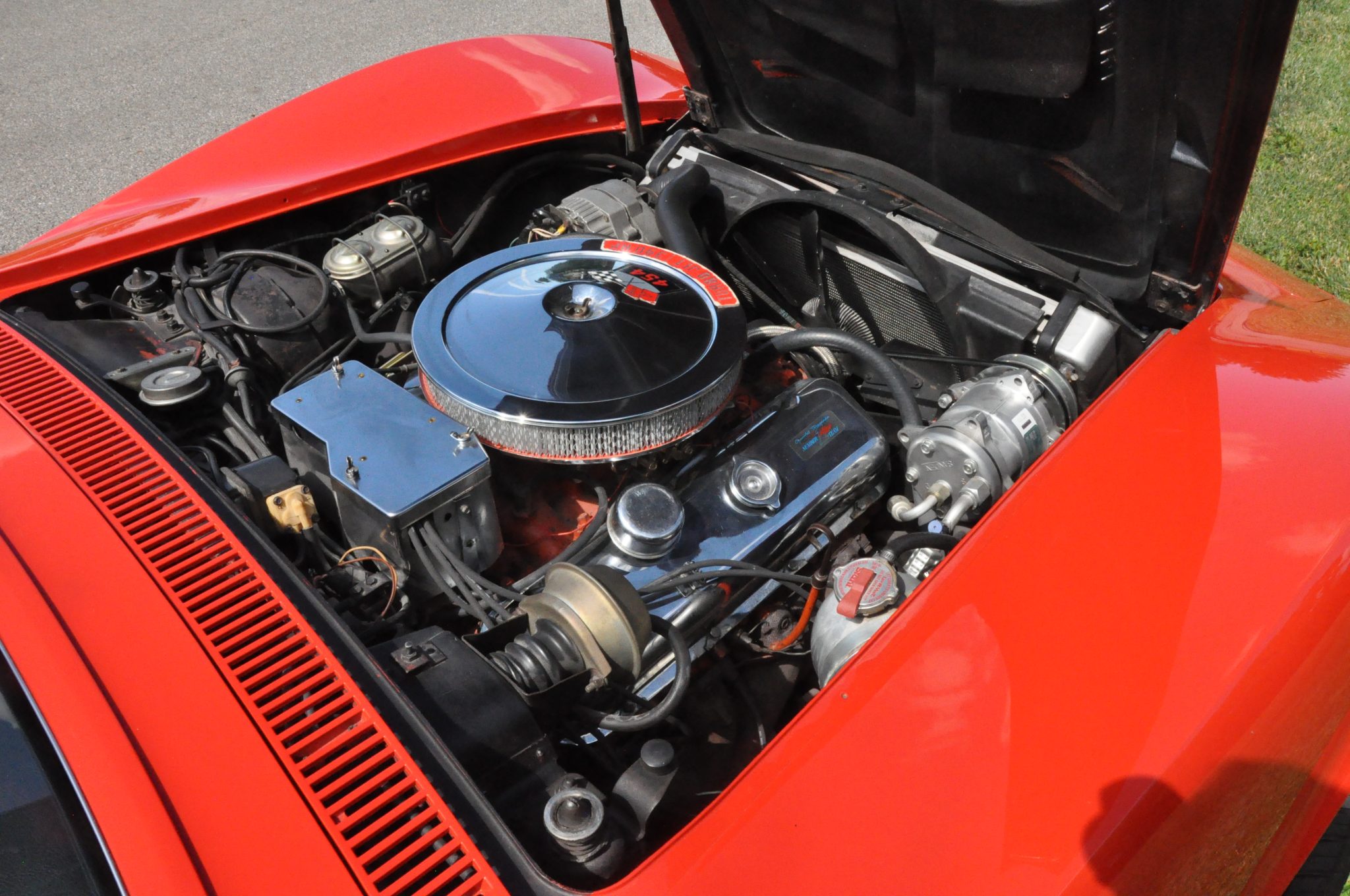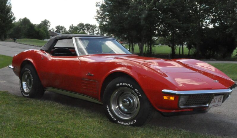 The car is powered by a 454ci LS5 V8 linked with a Muncie four-speed manual transmission and a PosiTraction differential, and it rides on 15″ Rally wheels mounted over four-wheel discs. It is finished in Monza Red with a black soft top and further equipped with an Edelbrock carburetor, an aluminum radiator, power steering, pop-up headlights, power windows, air conditioning, and a retro-look digital stereo.