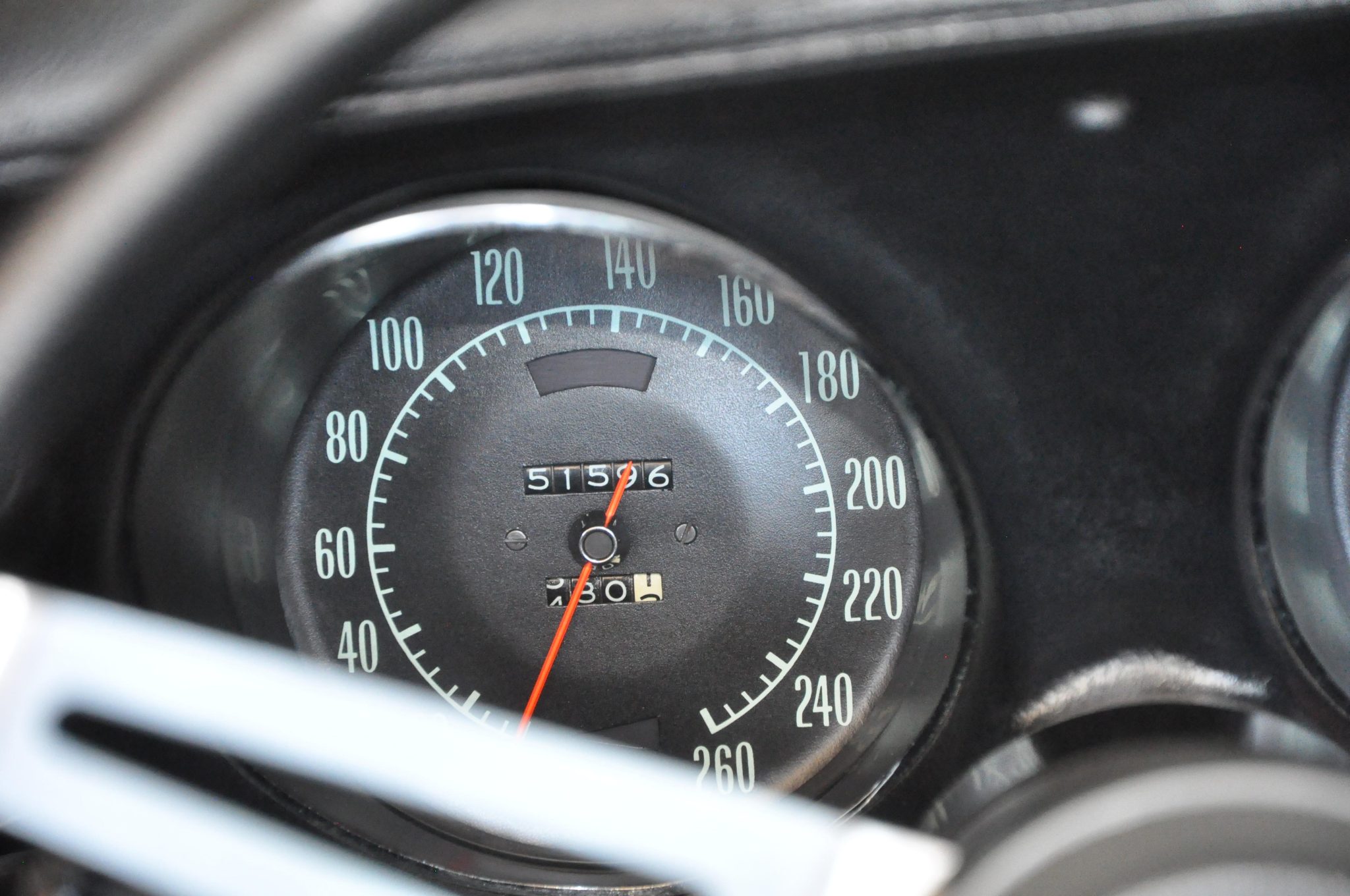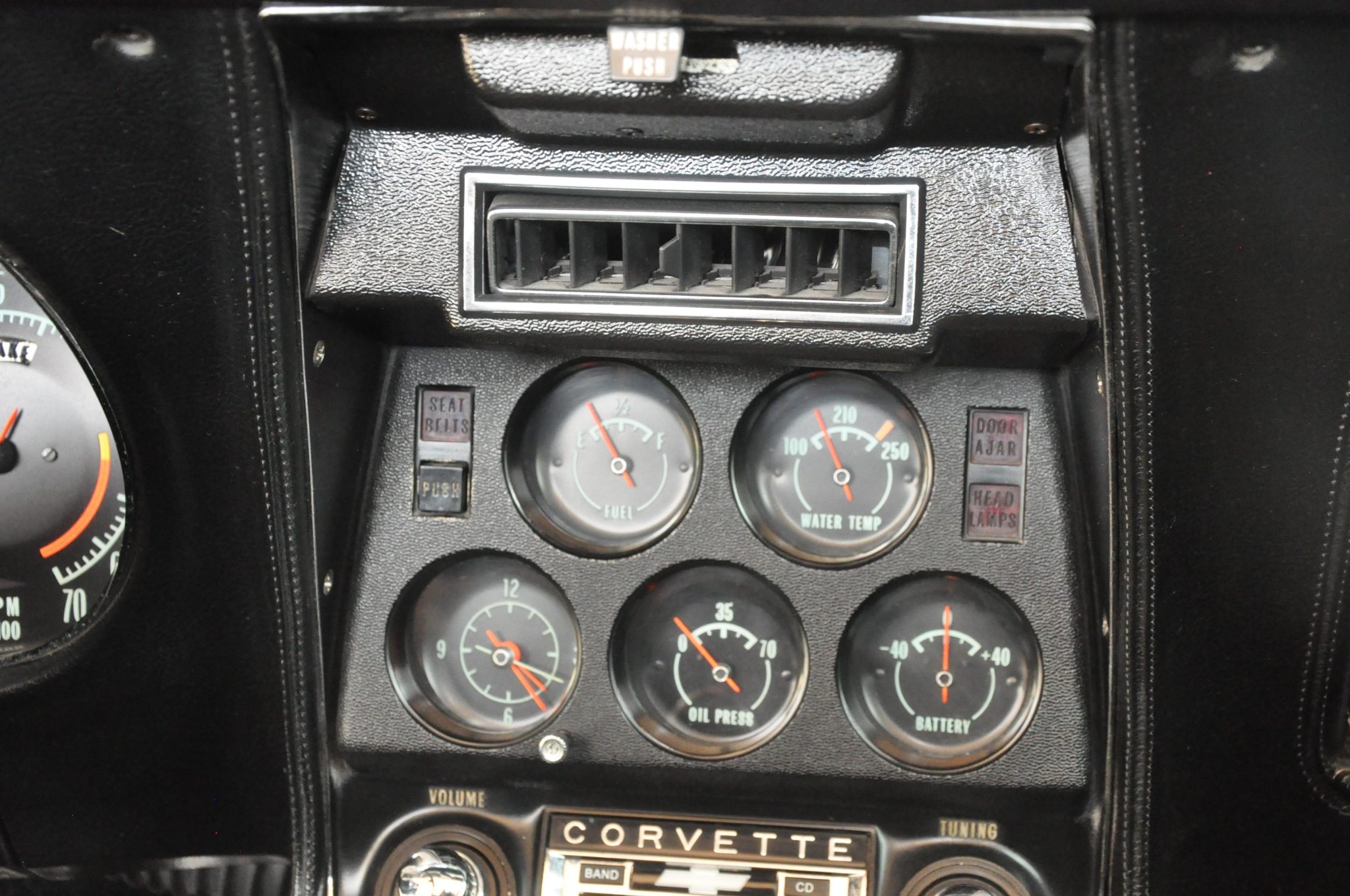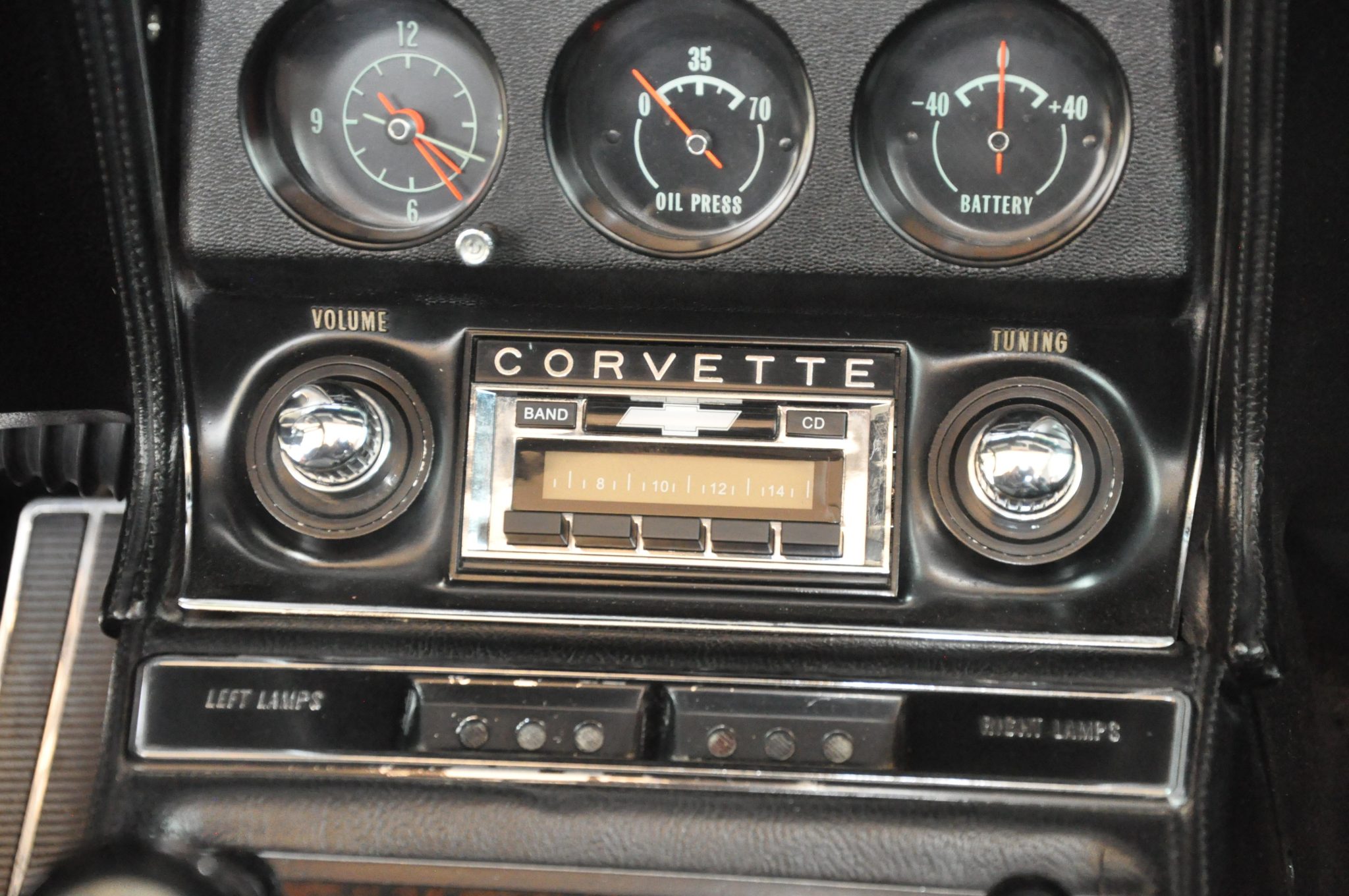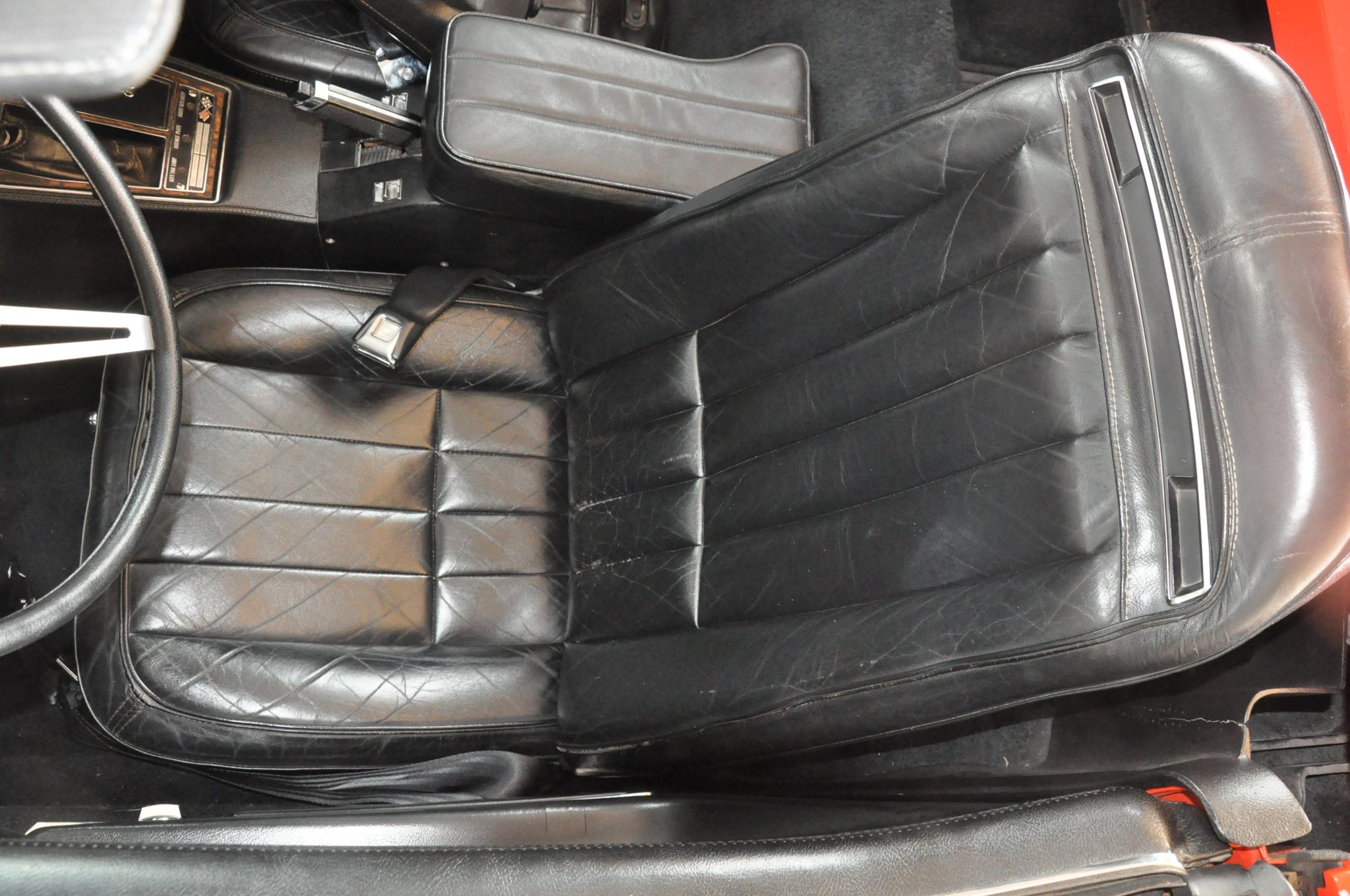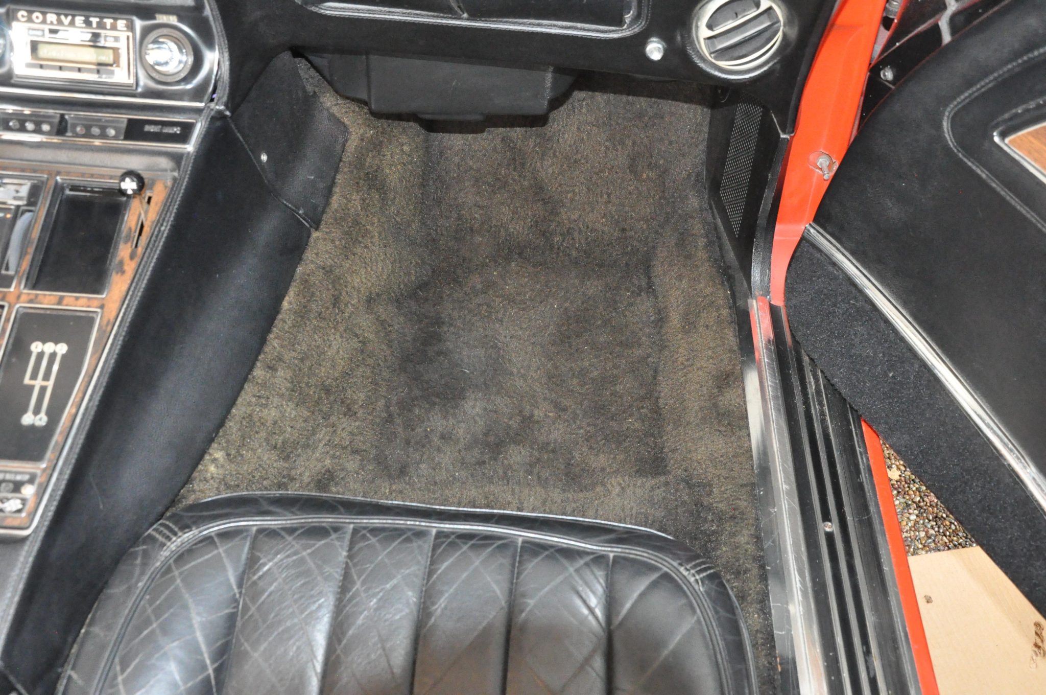 The car is powered by a 454ci LS5 V8 linked with a Muncie four-speed manual transmission and a PosiTraction differential, and it rides on 15″ Rally wheels mounted over four-wheel discs. It is finished in Monza Red with a black soft top and further equipped with an Edelbrock carburetor, an aluminum radiator, power steering, pop-up headlights, power windows, air conditioning, and a retro-look digital stereo.