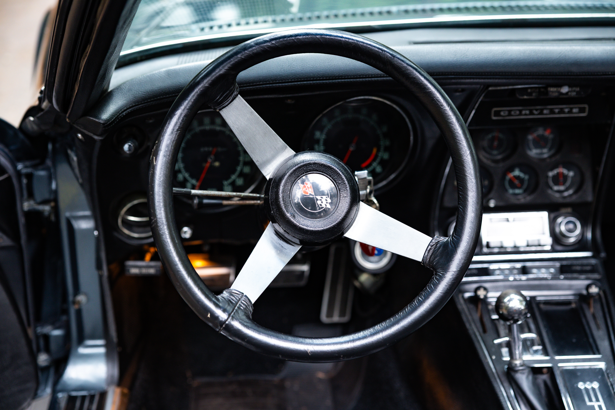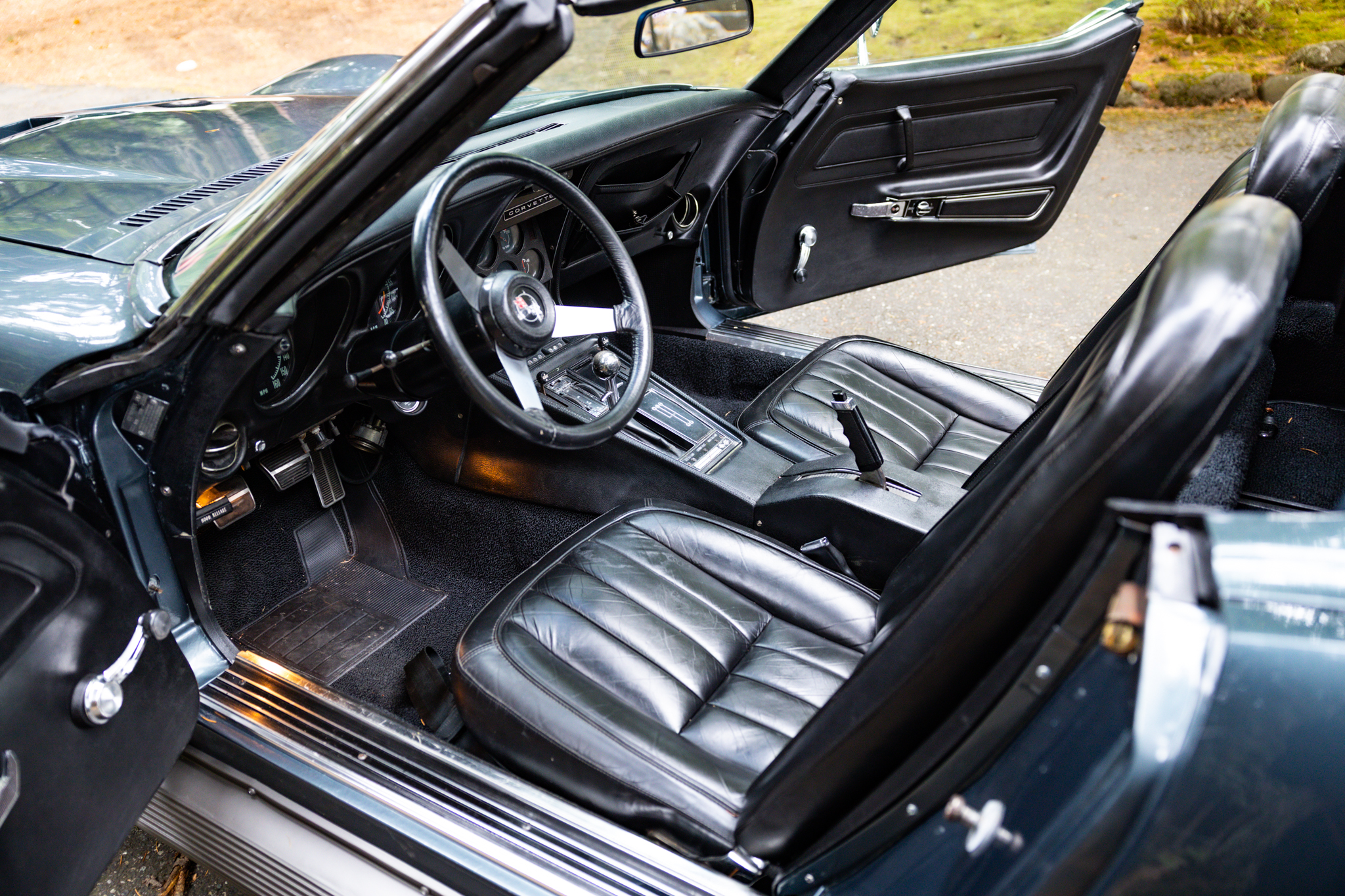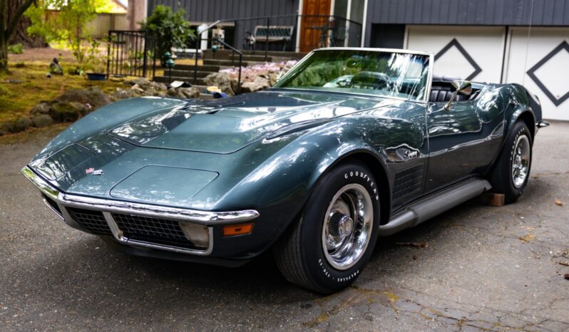 This 1970 Chevrolet Corvette convertible is finished in Laguna Gray over black and is powered by a 350ci L46 V8 paired with a four-speed manual transmission. Features include a Positraction limited-slip differential, a black convertible top, a removable hardtop, 15″ Rally wheels, disc brakes, power steering, retractable headlights, a cabin heater, and an AM/FM stereo.