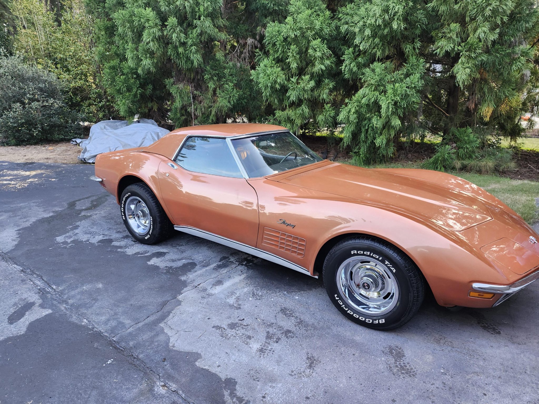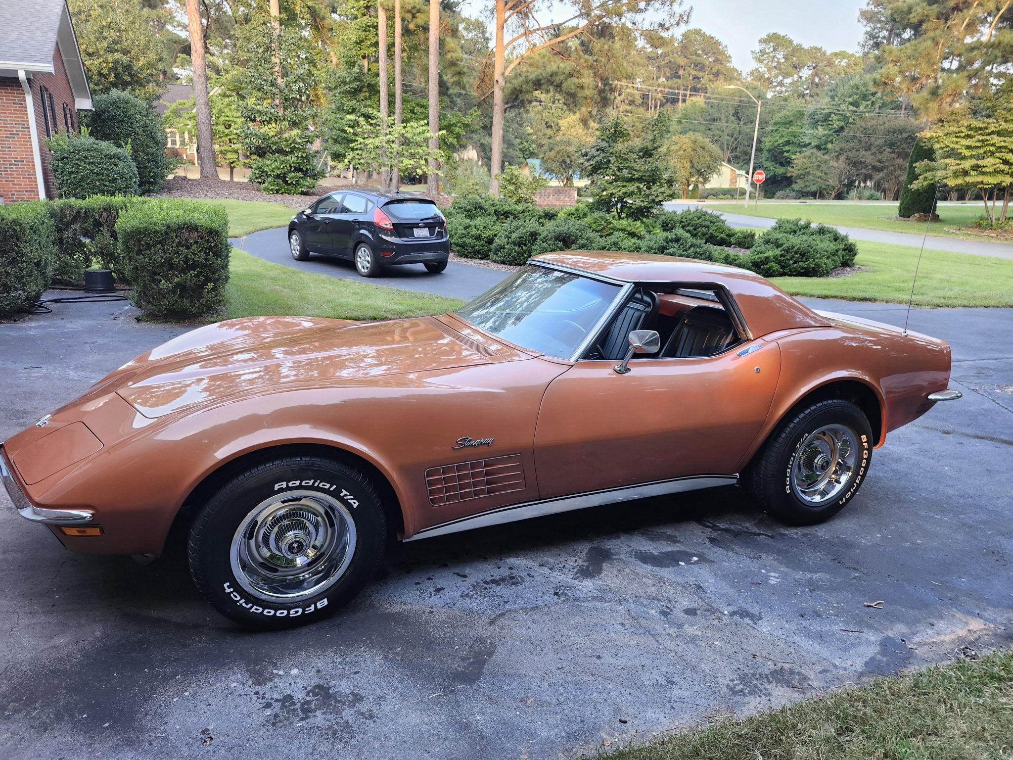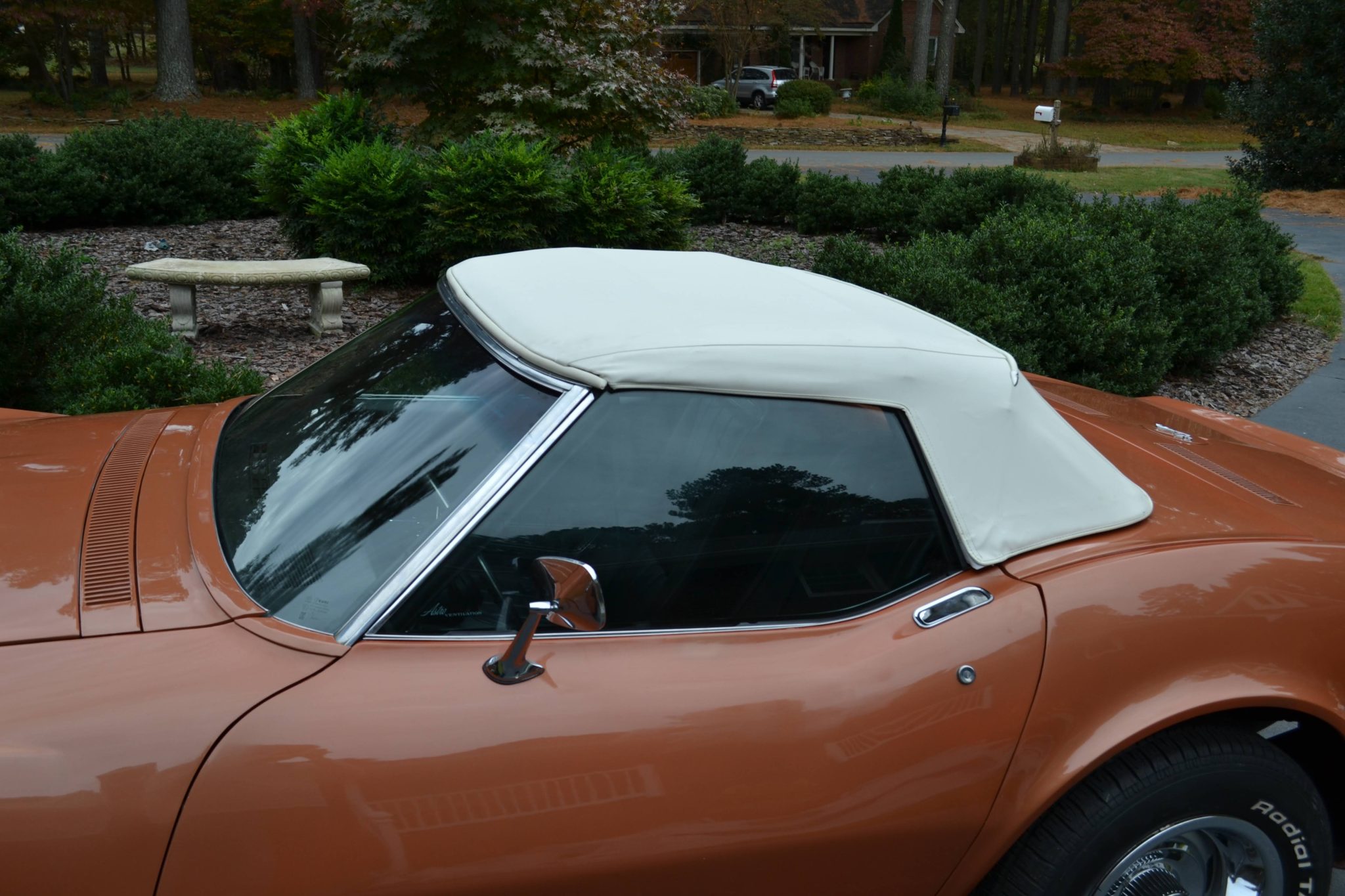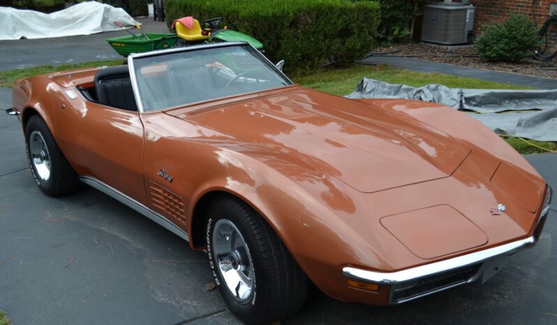 This 1970 Chevrolet Corvette convertible was refurbished and is powered by a 350ci L46 V8 paired with a four-speed manual transmission. Repainted in Corvette Bronze over black vinyl upholstery, the car is equipped with a Positraction limited-slip differential, a white convertible top, and a removable hardtop in addition to 15″ Rally wheels, disc brakes, power steering, retractable headlights, a cabin heater, and an AM/FM stereo.