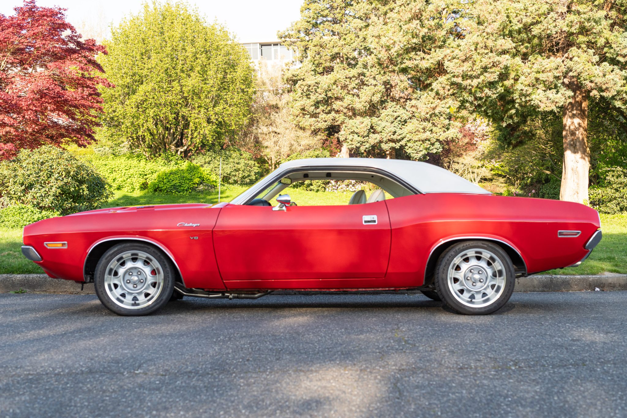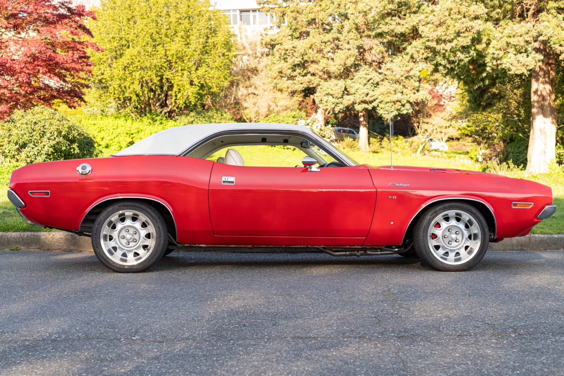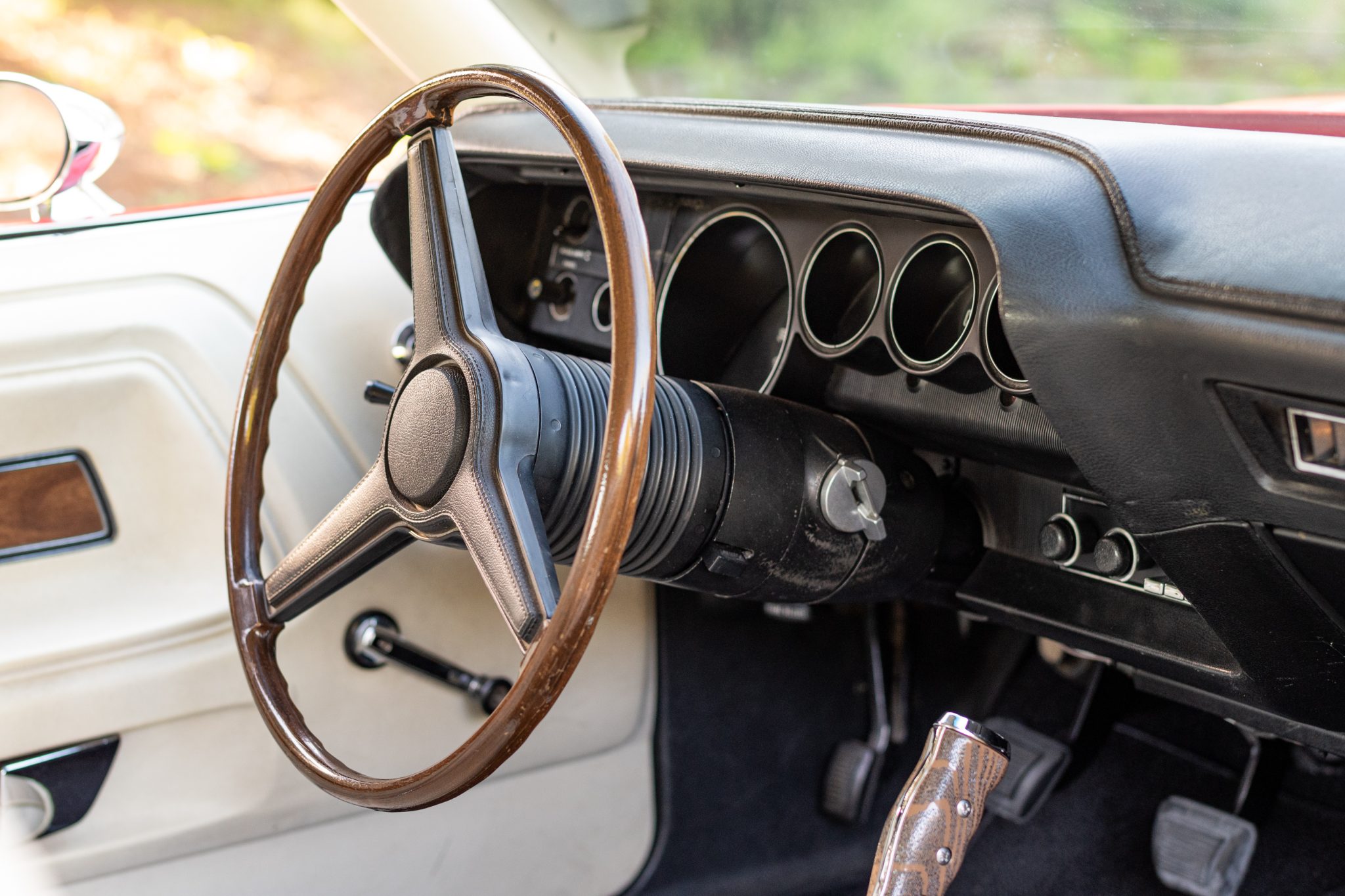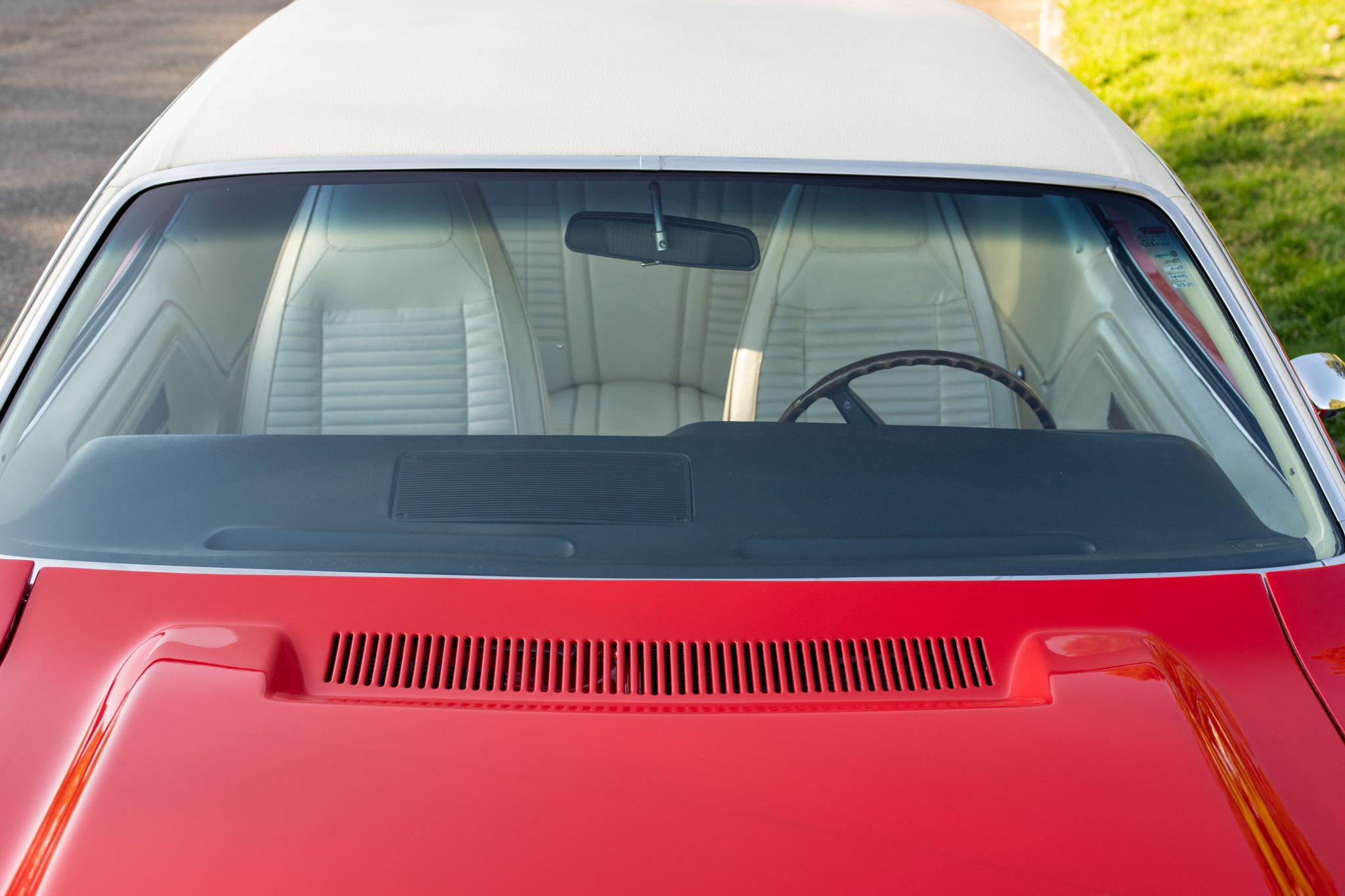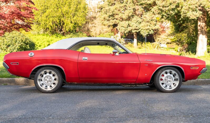 A replacement white vinyl roof cover was installed and the trunk floor was repaired in 2015, and a 5.7-liter Gen-III Hemi V8 was installed in 2020 along with a Tremec five-speed manual transmission and an AlterKtion front suspension system with coilovers and rack-and-pinion steering. The interior is trimmed in white vinyl with black carpeting and equipped with a center console, a pistol-grip shifter, an AM/FM radio, and air conditioning. Additional modifications include an aluminum radiator, full-length headers, MagnaFlow mufflers, Wilwood front disc brakes, and 17″ Rallye wheels