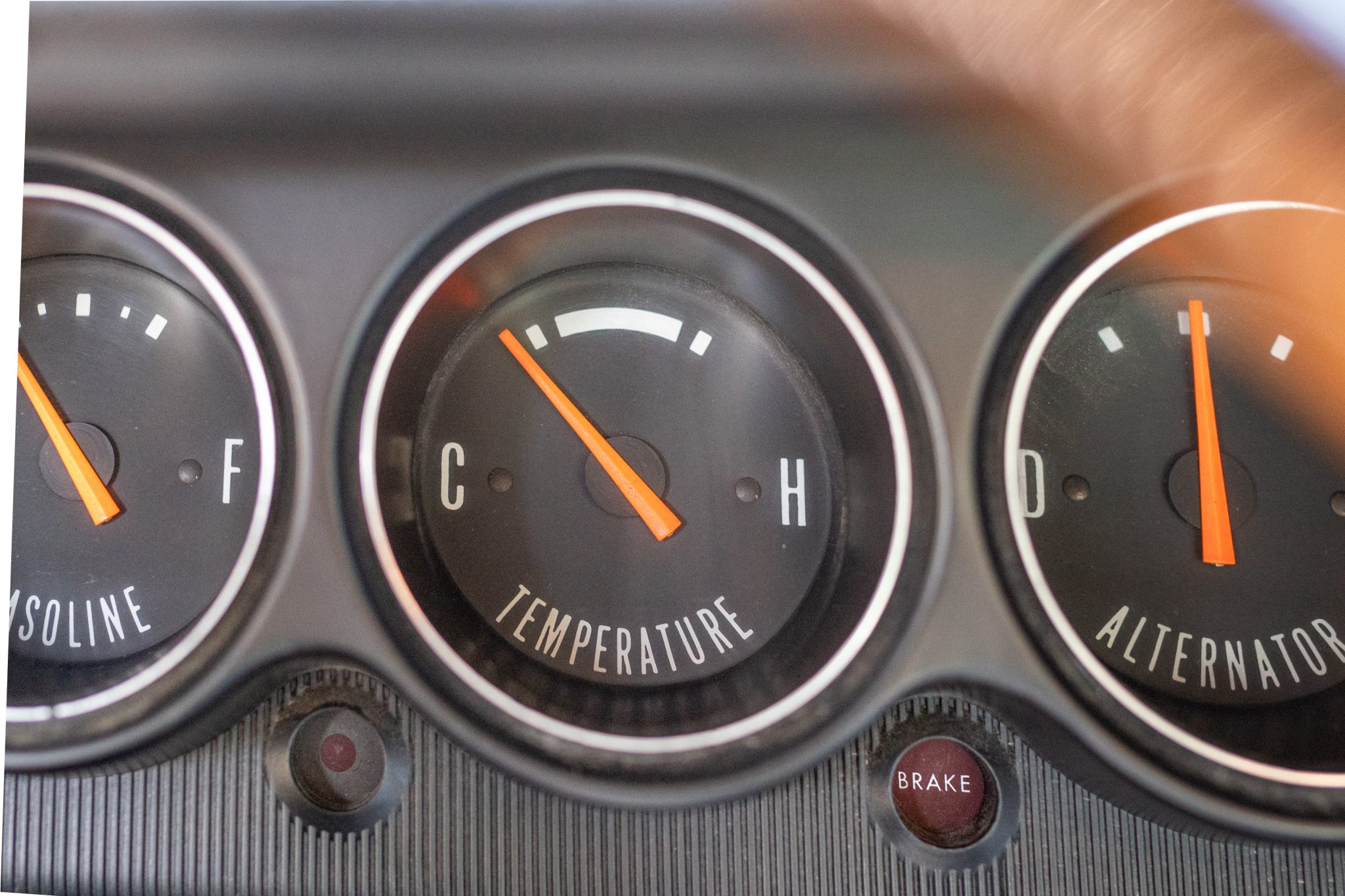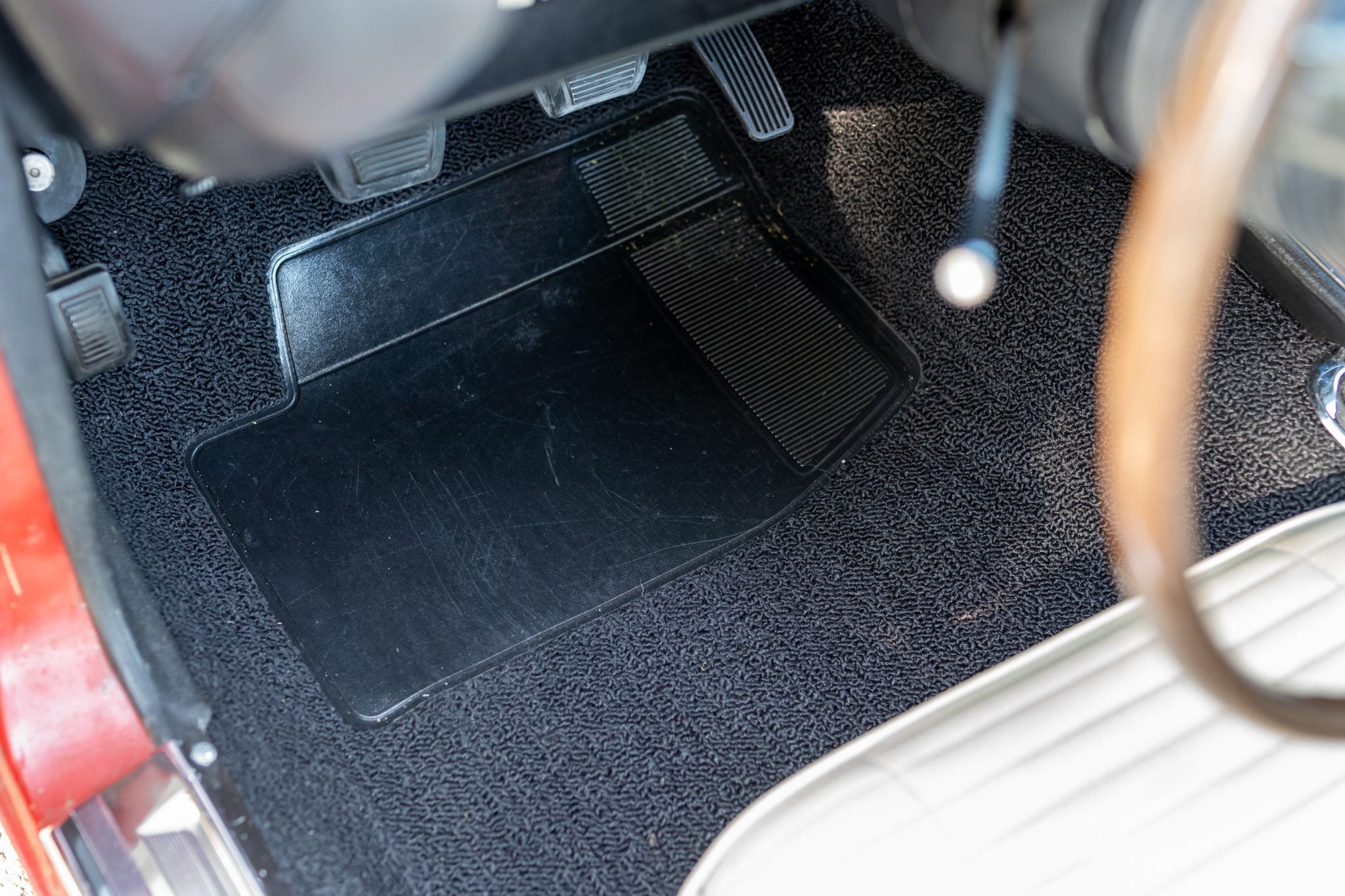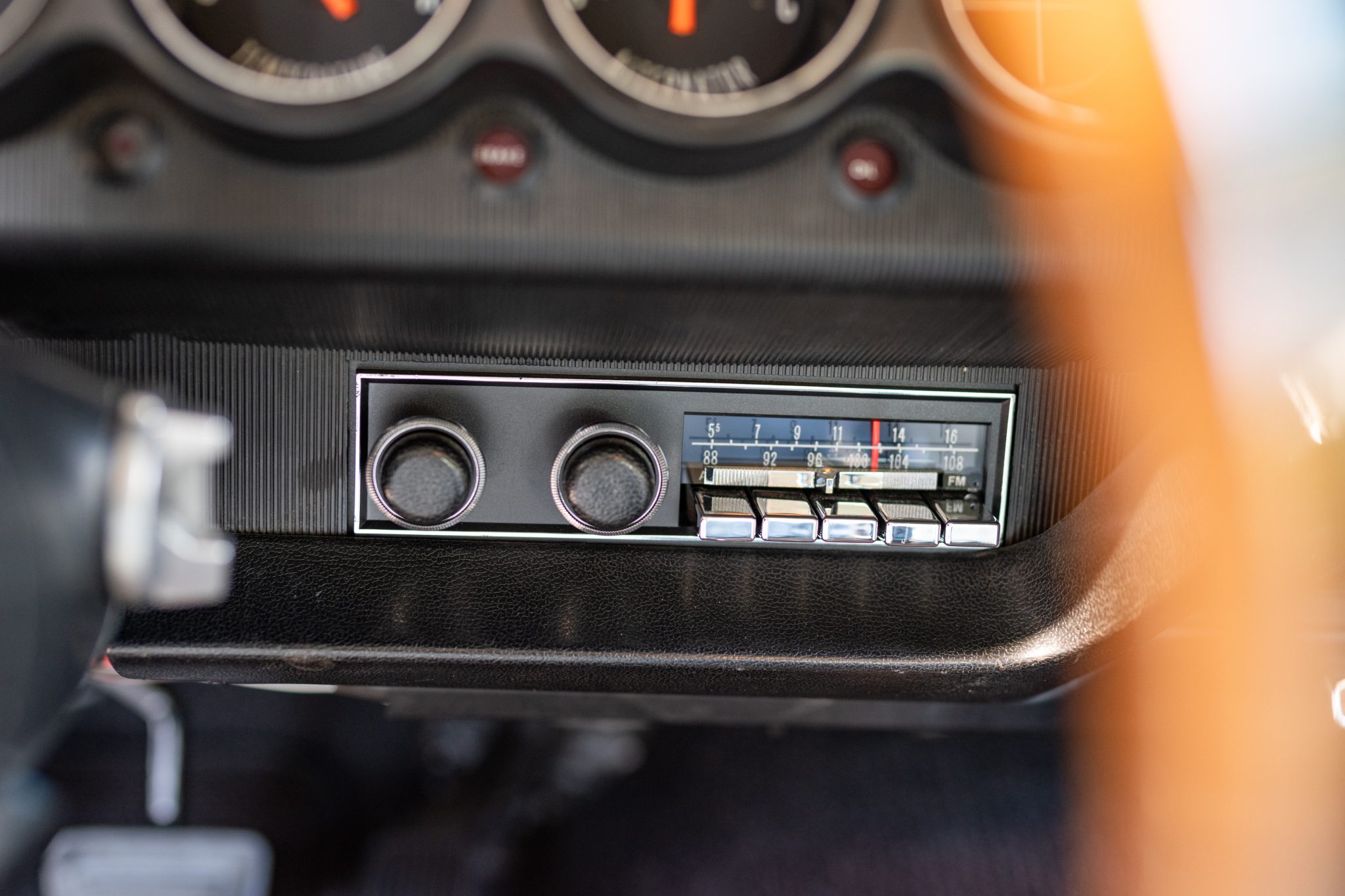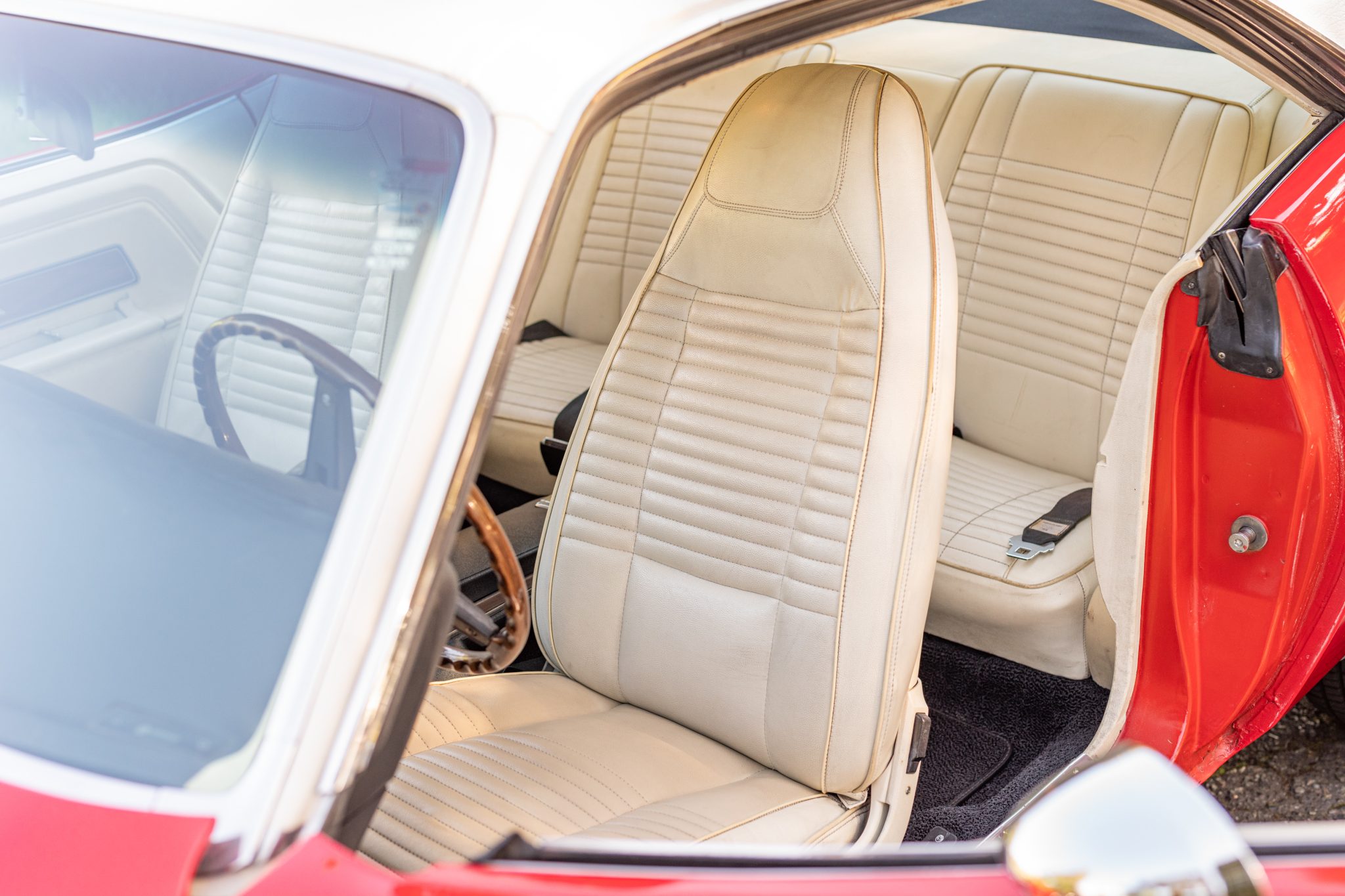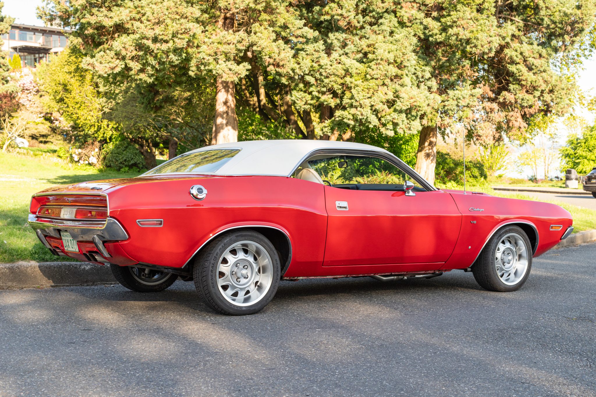 A replacement white vinyl roof cover was installed and the trunk floor was repaired in 2015, and a 5.7-liter Gen-III Hemi V8 was installed in 2020 along with a Tremec five-speed manual transmission and an AlterKtion front suspension system with coilovers and rack-and-pinion steering. The interior is trimmed in white vinyl with black carpeting and equipped with a center console, a pistol-grip shifter, an AM/FM radio, and air conditioning. Additional modifications include an aluminum radiator, full-length headers, MagnaFlow mufflers, Wilwood front disc brakes, and 17″ Rallye wheels
