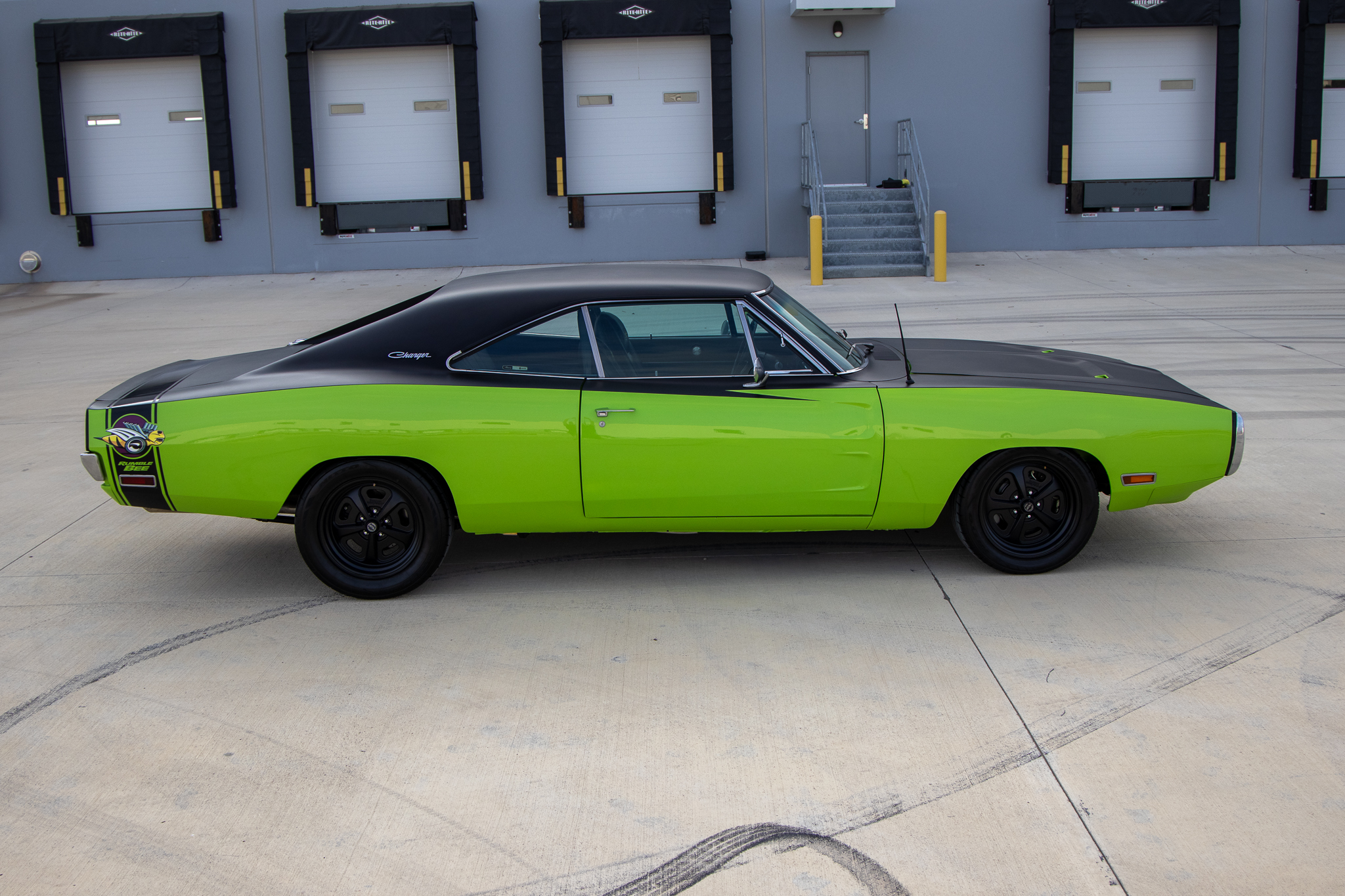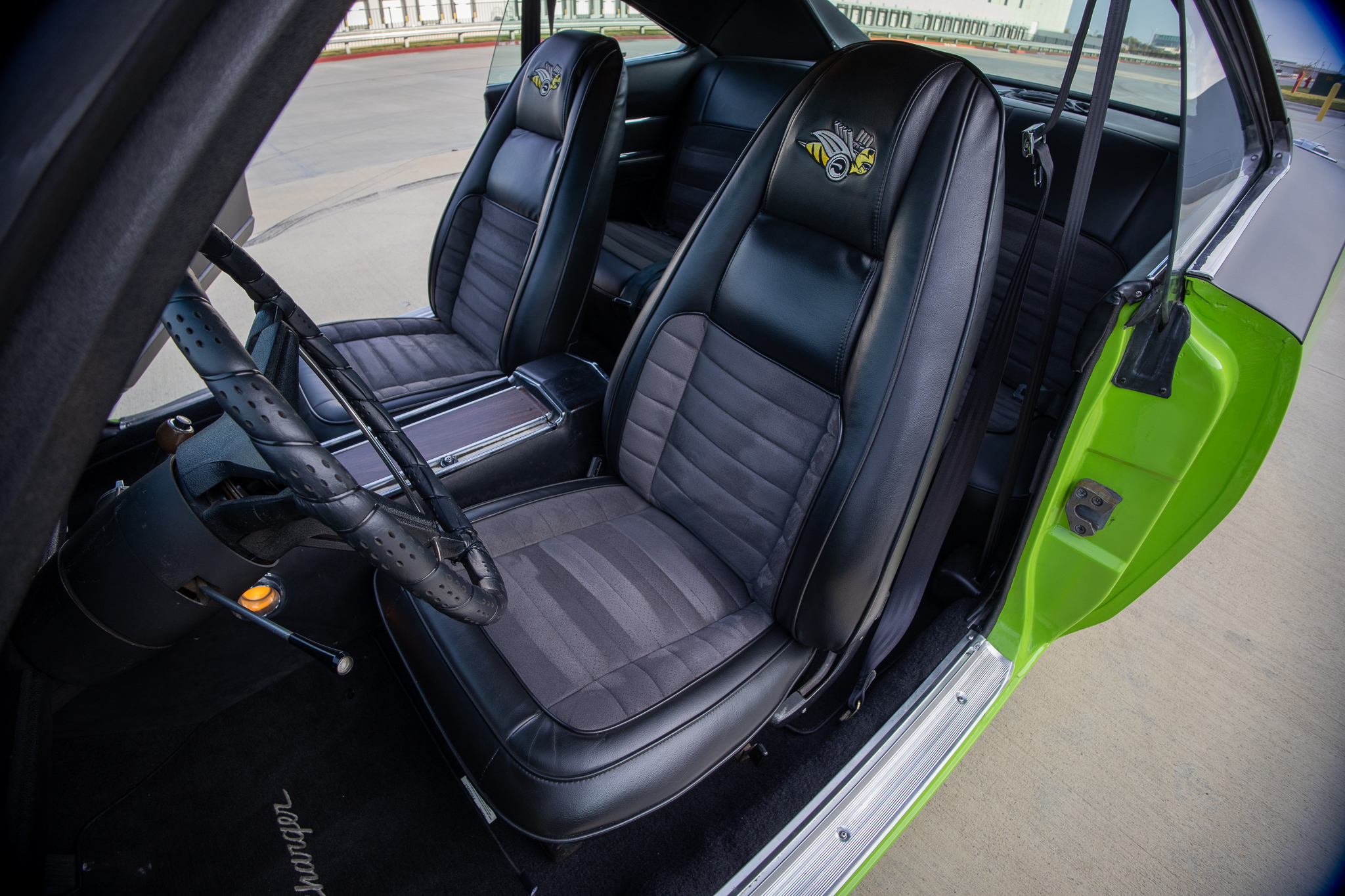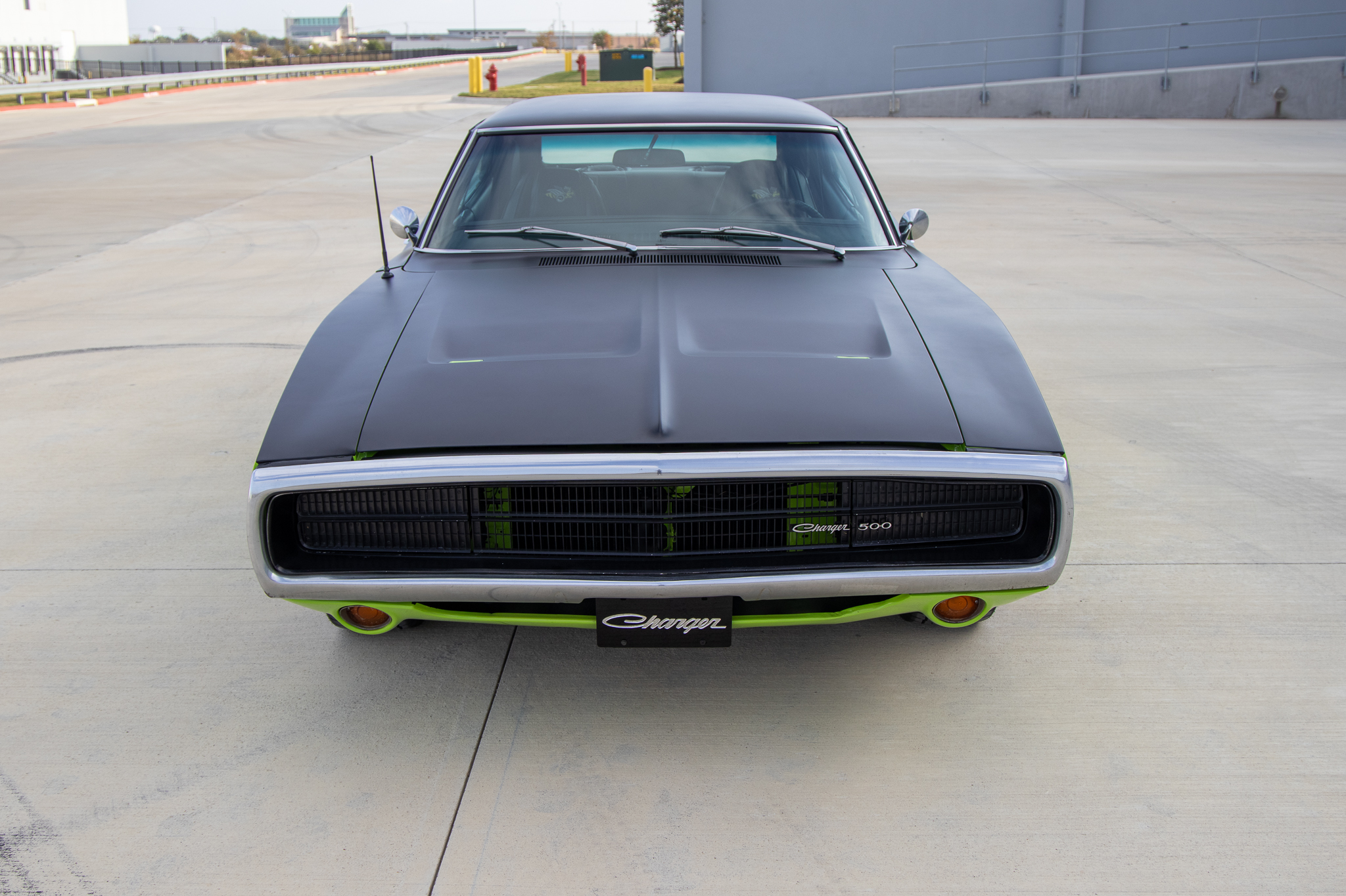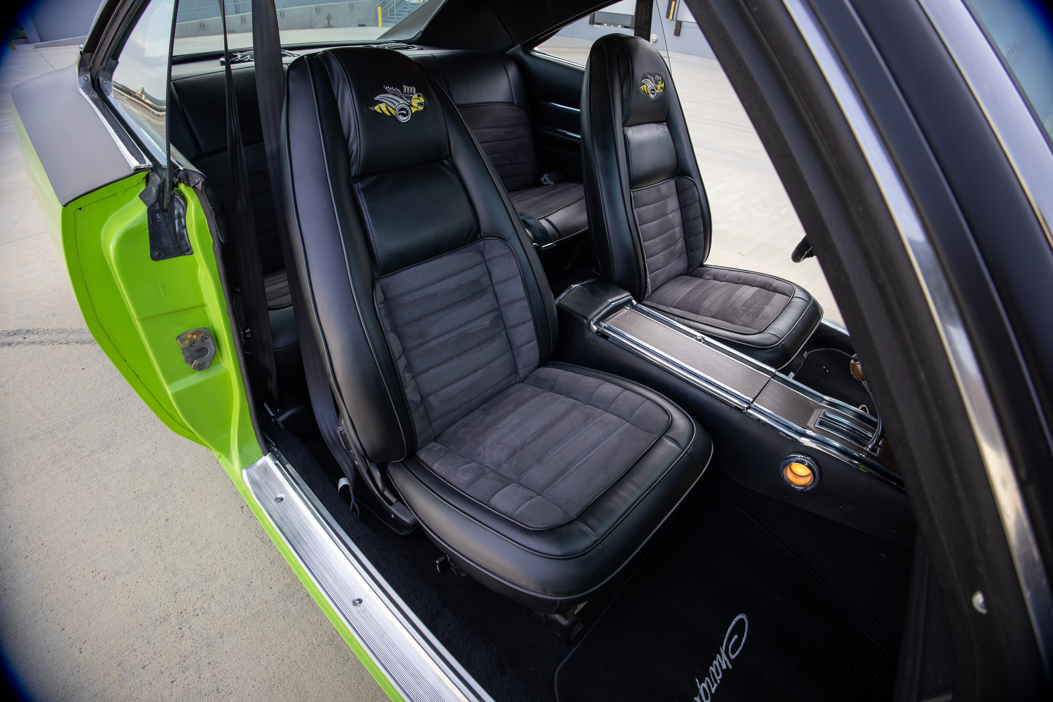 This 1970 Dodge Charger 500 was refurbished in the early 2010s and has been modified with a 440ci V8, which is linked to a TorqueFlite three-speed automatic transmission. The car has been repainted in Sublime with satin-black-painted upper sections, and the interior is trimmed in black vinyl with suede inserts. subsequent work involved adapting four-wheel disc brakes and also overhauling the suspension with parts including PST tubular upper control arms, Hellwig sway bars, polygraphite torsion bars, Bilstein shocks, and Global West subframe connectors. Other features include Rumble Bee graphics, American Racing 17″ wheels, power steering, woodgrain interior trim, a center console, a Pioneer stereo, Autogage auxiliary gauges, and a Holley intake manifold.