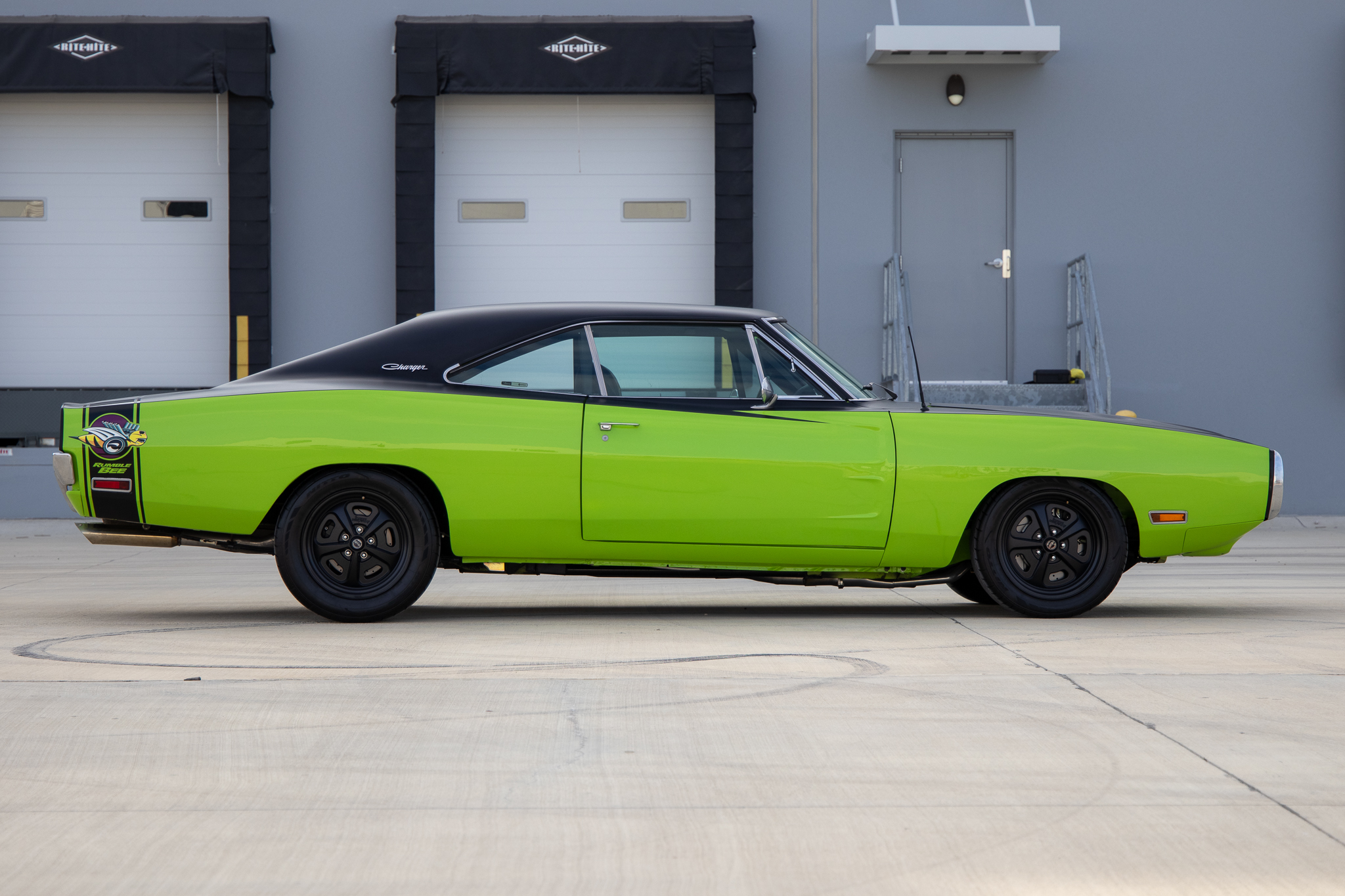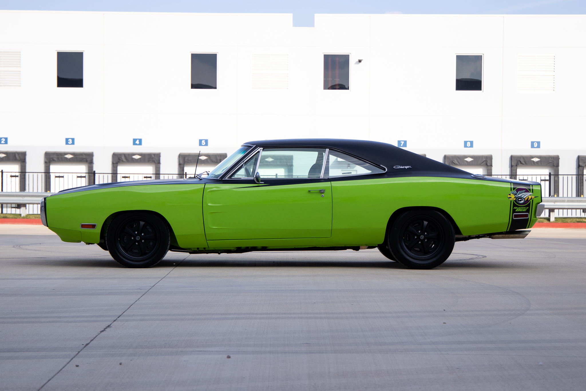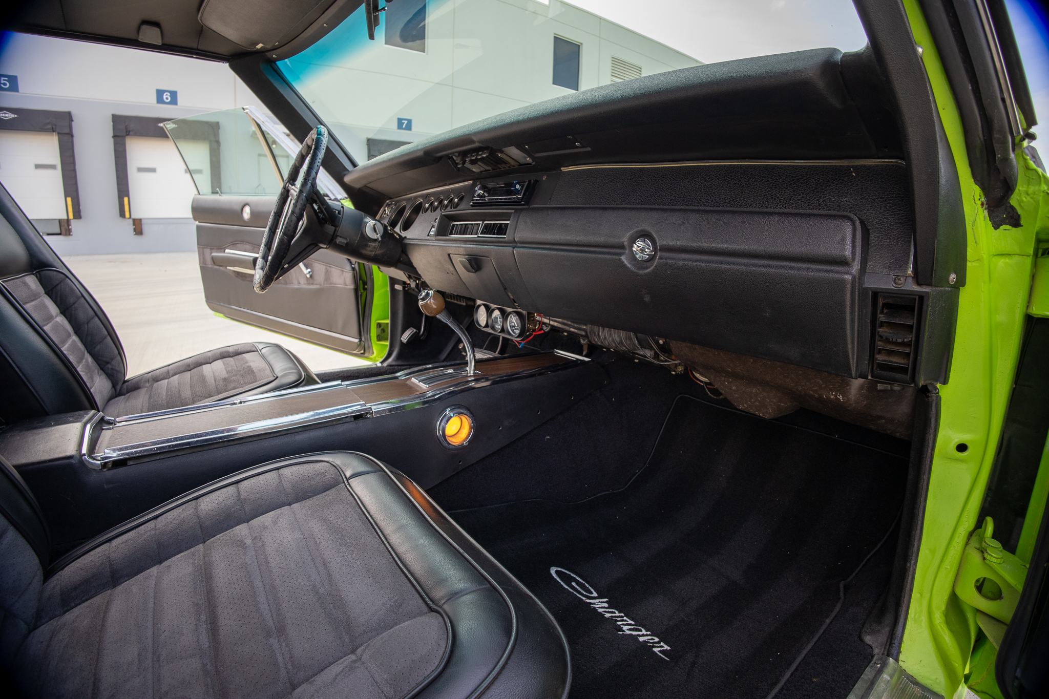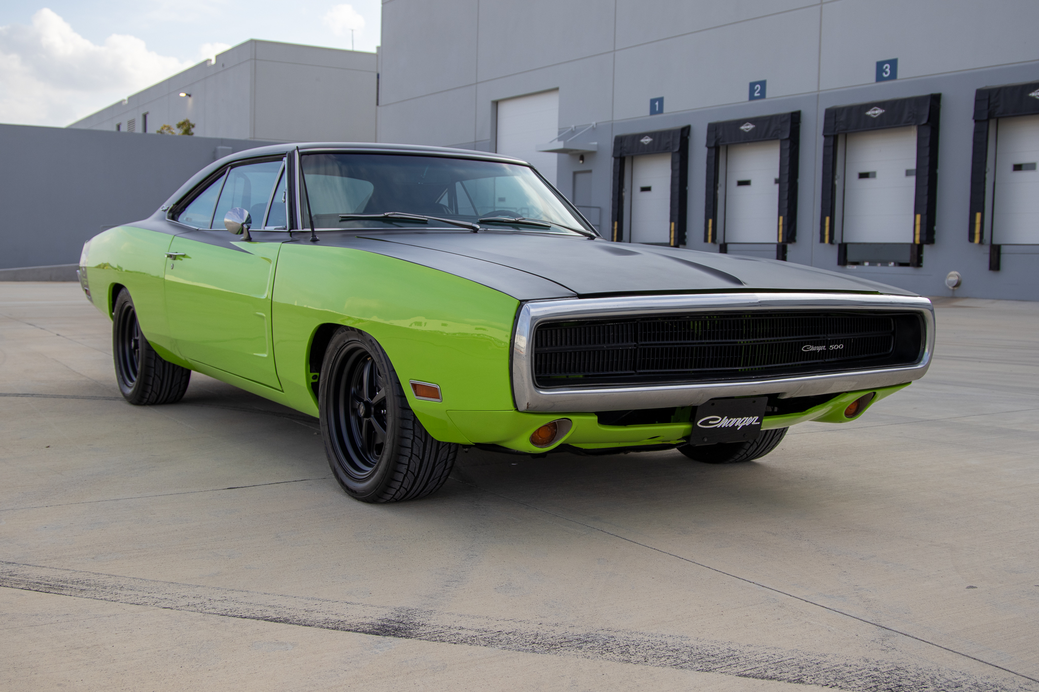 This 1970 Dodge Charger 500 was refurbished in the early 2010s and has been modified with a 440ci V8, which is linked to a TorqueFlite three-speed automatic transmission. The car has been repainted in Sublime with satin-black-painted upper sections, and the interior is trimmed in black vinyl with suede inserts. subsequent work involved adapting four-wheel disc brakes and also overhauling the suspension with parts including PST tubular upper control arms, Hellwig sway bars, polygraphite torsion bars, Bilstein shocks, and Global West subframe connectors. Other features include Rumble Bee graphics, American Racing 17″ wheels, power steering, woodgrain interior trim, a center console, a Pioneer stereo, Autogage auxiliary gauges, and a Holley intake manifold.