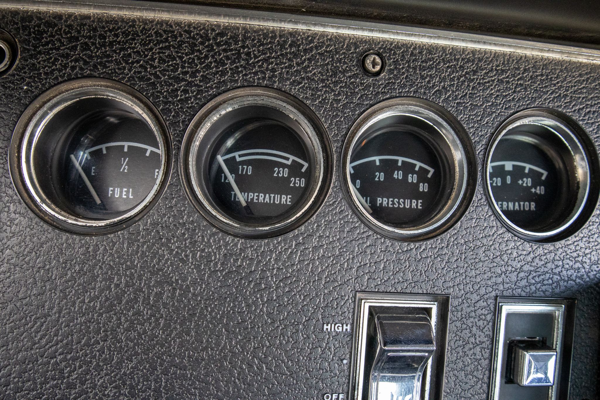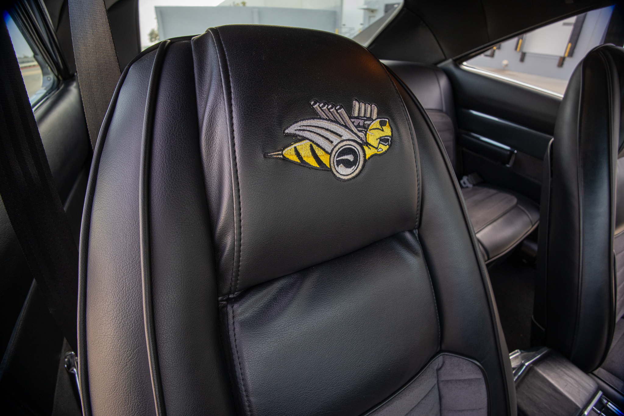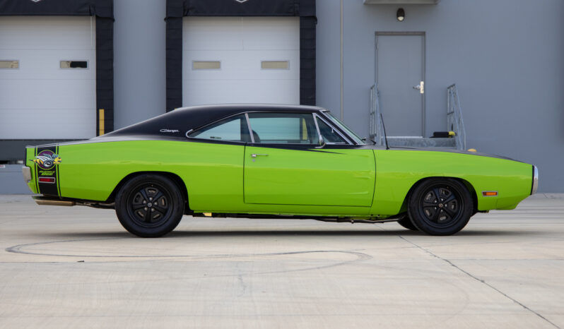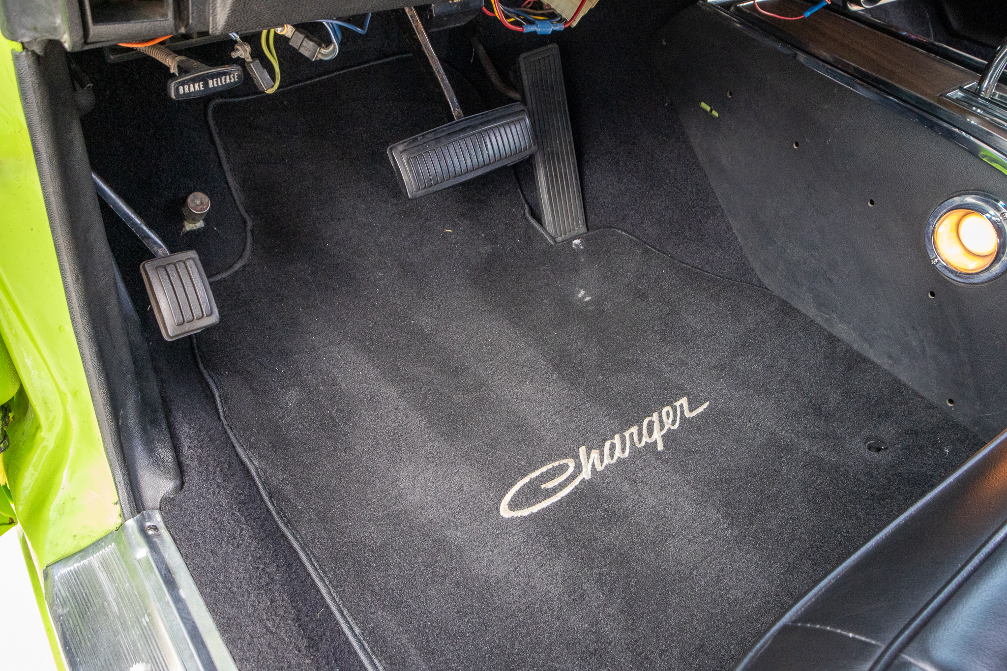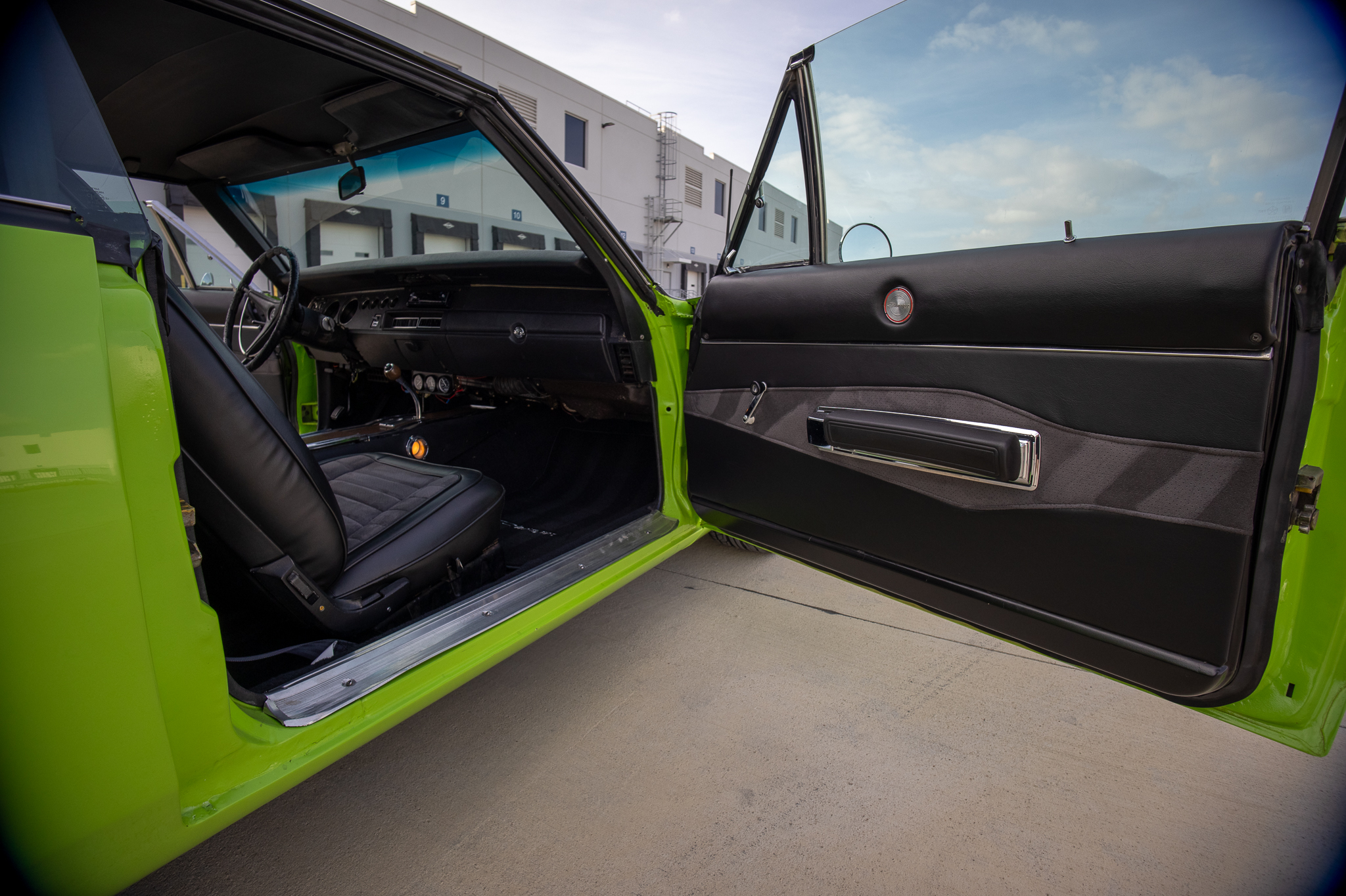 This 1970 Dodge Charger 500 was refurbished in the early 2010s and has been modified with a 440ci V8, which is linked to a TorqueFlite three-speed automatic transmission. The car has been repainted in Sublime with satin-black-painted upper sections, and the interior is trimmed in black vinyl with suede inserts. subsequent work involved adapting four-wheel disc brakes and also overhauling the suspension with parts including PST tubular upper control arms, Hellwig sway bars, polygraphite torsion bars, Bilstein shocks, and Global West subframe connectors. Other features include Rumble Bee graphics, American Racing 17″ wheels, power steering, woodgrain interior trim, a center console, a Pioneer stereo, Autogage auxiliary gauges, and a Holley intake manifold.