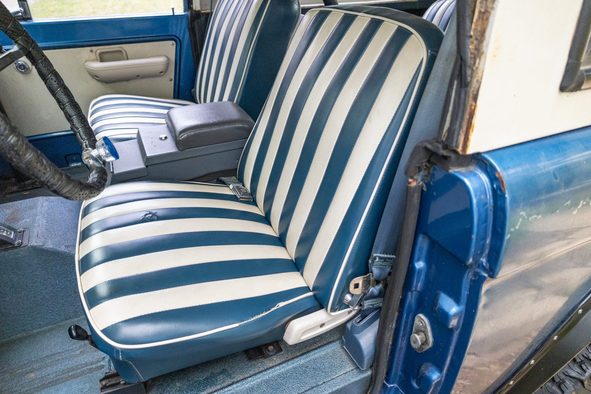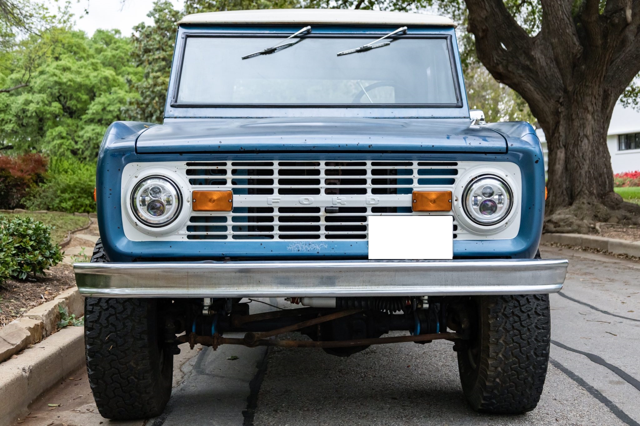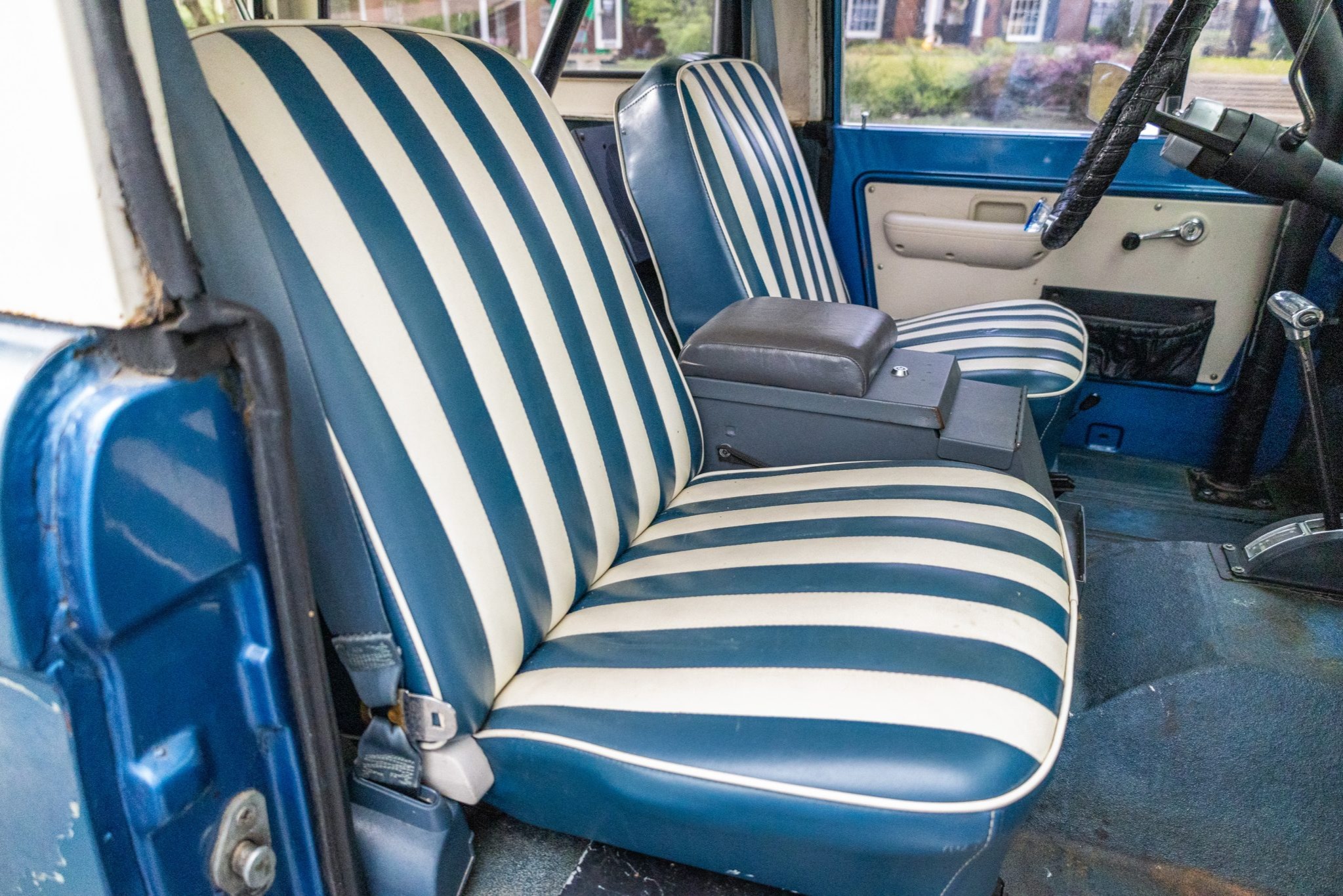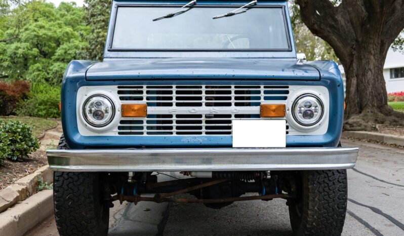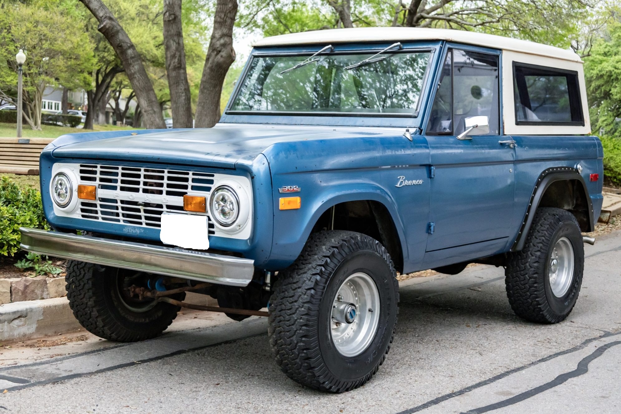 The truck rides on a 2.5″ suspension lift with dual Bilstein front and rear shocks over 15″ Eagle Alloys wheels and four-wheel disc brakes, and it is powered by a 302ci V8 linked to a three-speed manual transmission and a dual-range transfer case. It is finished in Acapulco Blue over blue and white vinyl upholstery, and additional equipment includes a Wild Horses radiator, a Painless wiring harness, a white hardtop, a receiver hitch, LED headlights, a roll bar, an Alpine stereo, and an aftermarket center console.