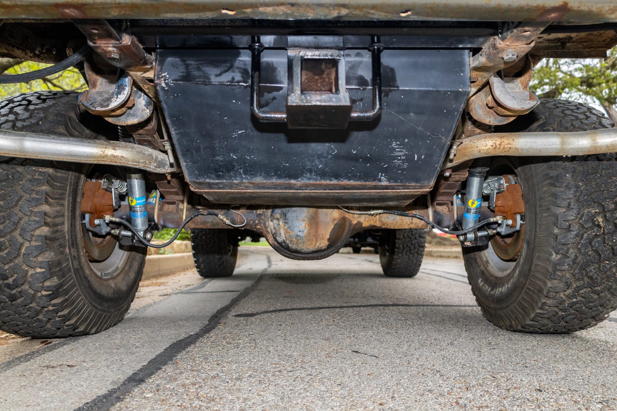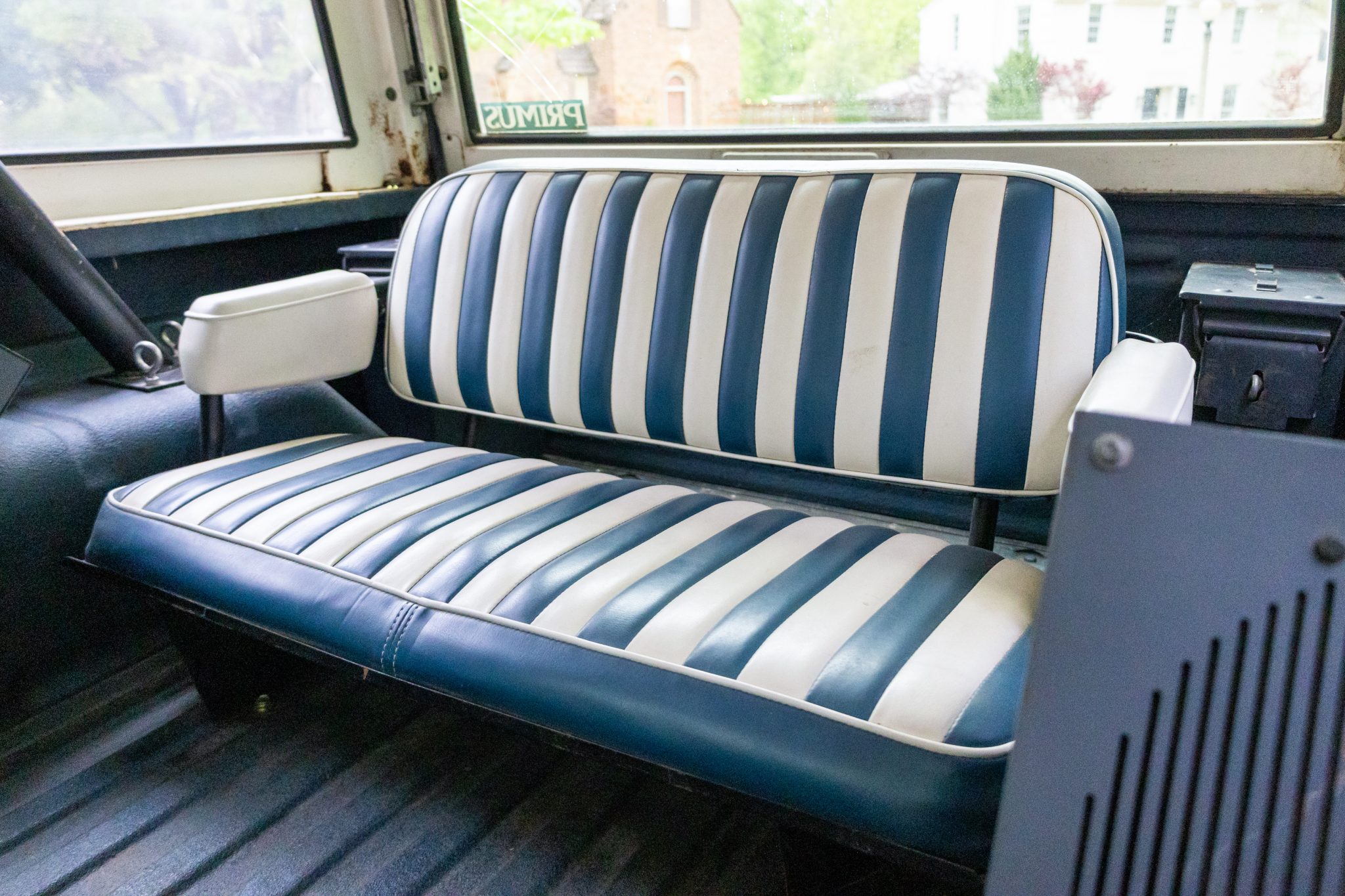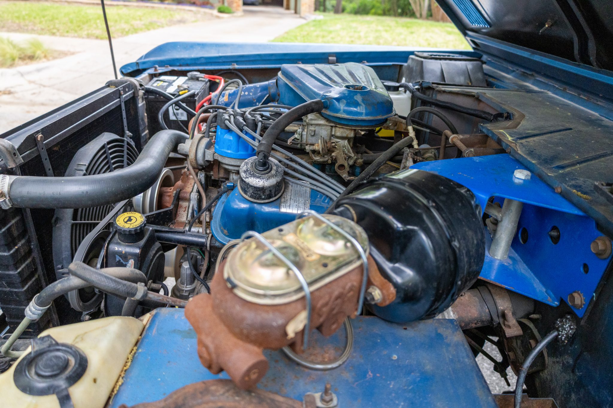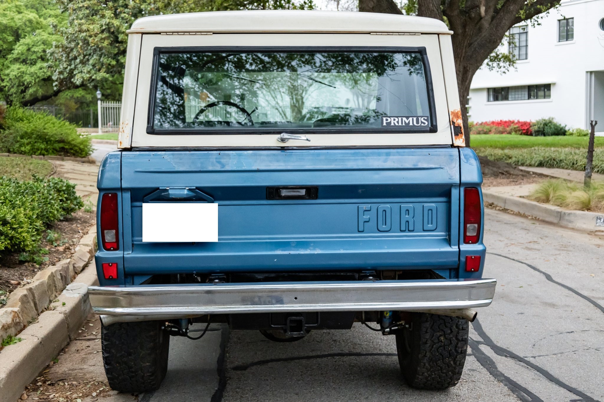 The truck rides on a 2.5″ suspension lift with dual Bilstein front and rear shocks over 15″ Eagle Alloys wheels and four-wheel disc brakes, and it is powered by a 302ci V8 linked to a three-speed manual transmission and a dual-range transfer case. It is finished in Acapulco Blue over blue and white vinyl upholstery, and additional equipment includes a Wild Horses radiator, a Painless wiring harness, a white hardtop, a receiver hitch, LED headlights, a roll bar, an Alpine stereo, and an aftermarket center console.