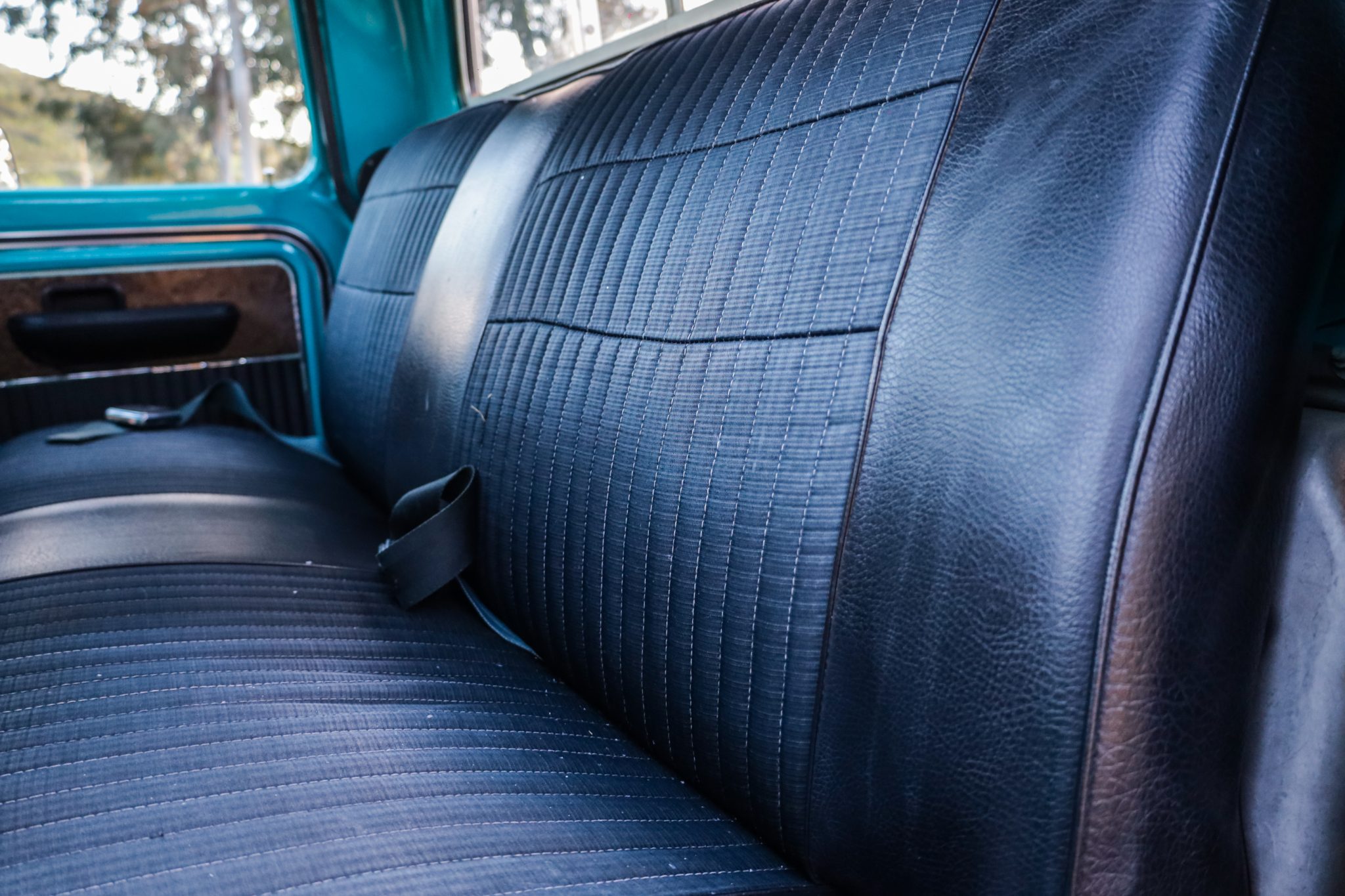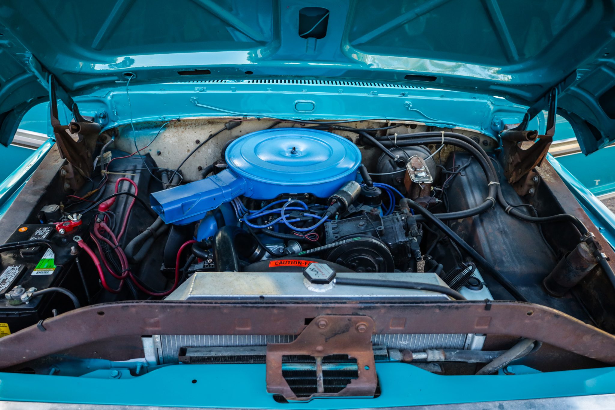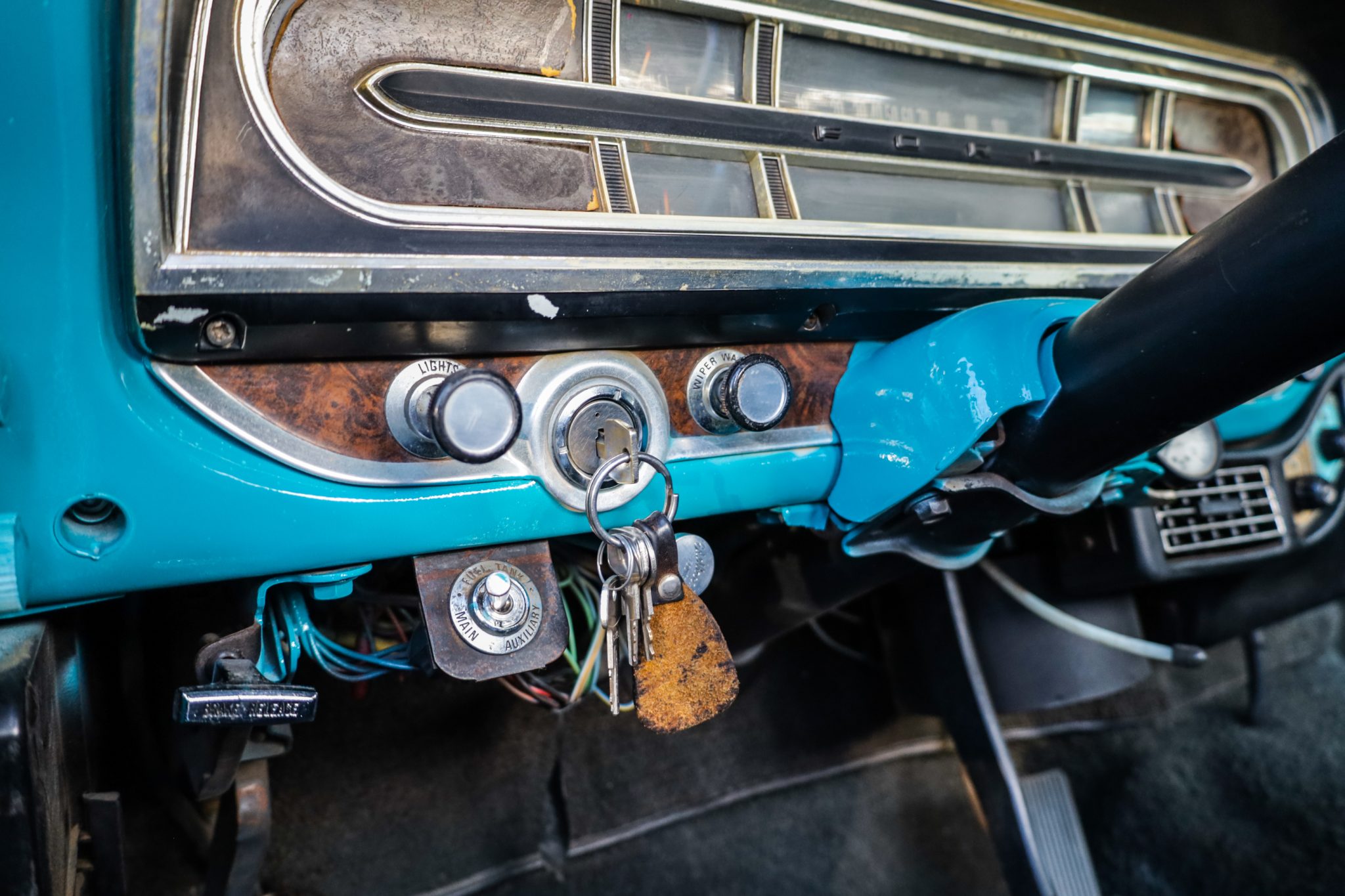 The 360ci V8 was rebuilt in 2020 and sends power to the rear wheels through a three-speed Cruise-O-Matic automatic transmission. Equipment includes a RedHead power steering gear, front disc brakes, 16″ American Racing Outlaw II wheels, air conditioning, a Sanyo cassette stereo, and a Holley carburetor.
