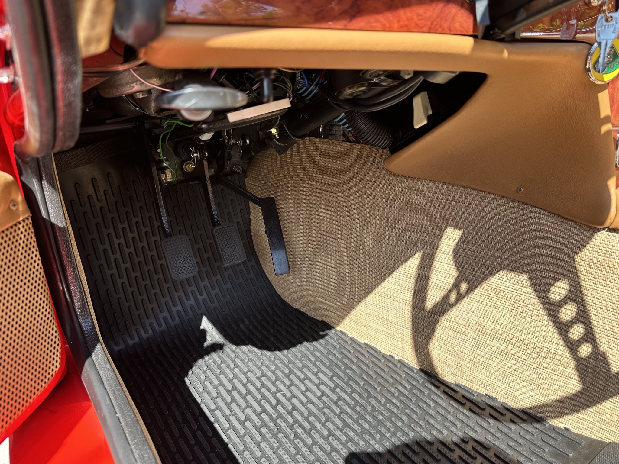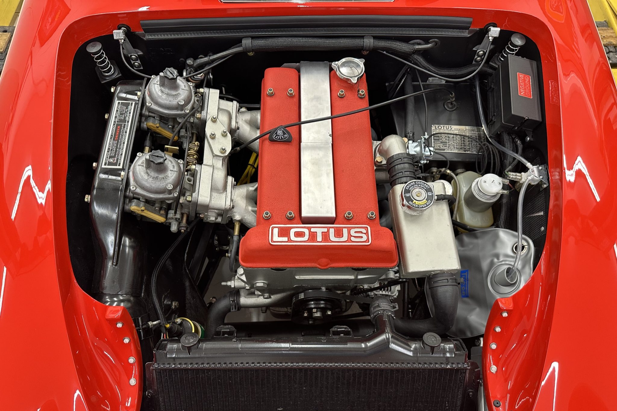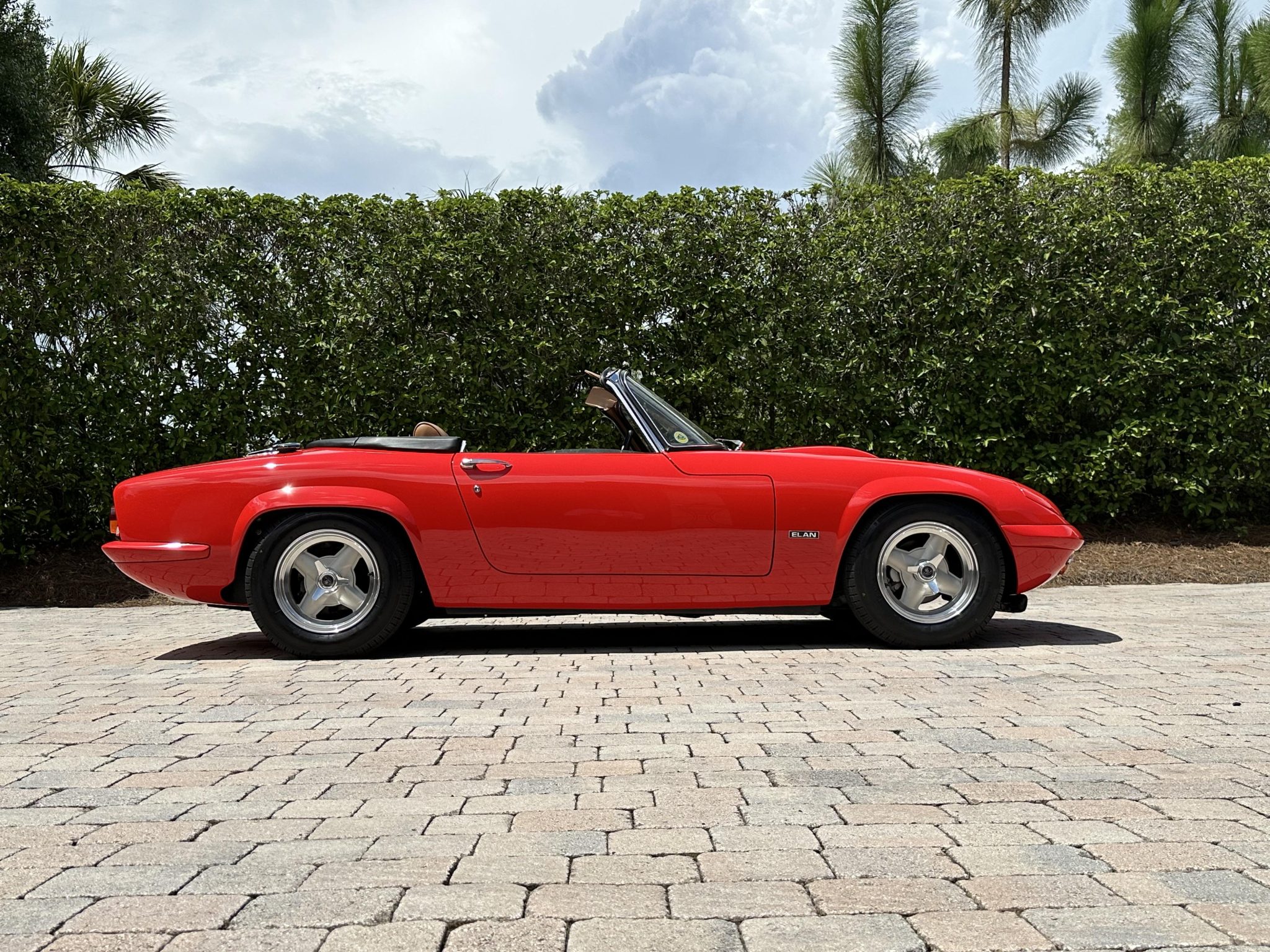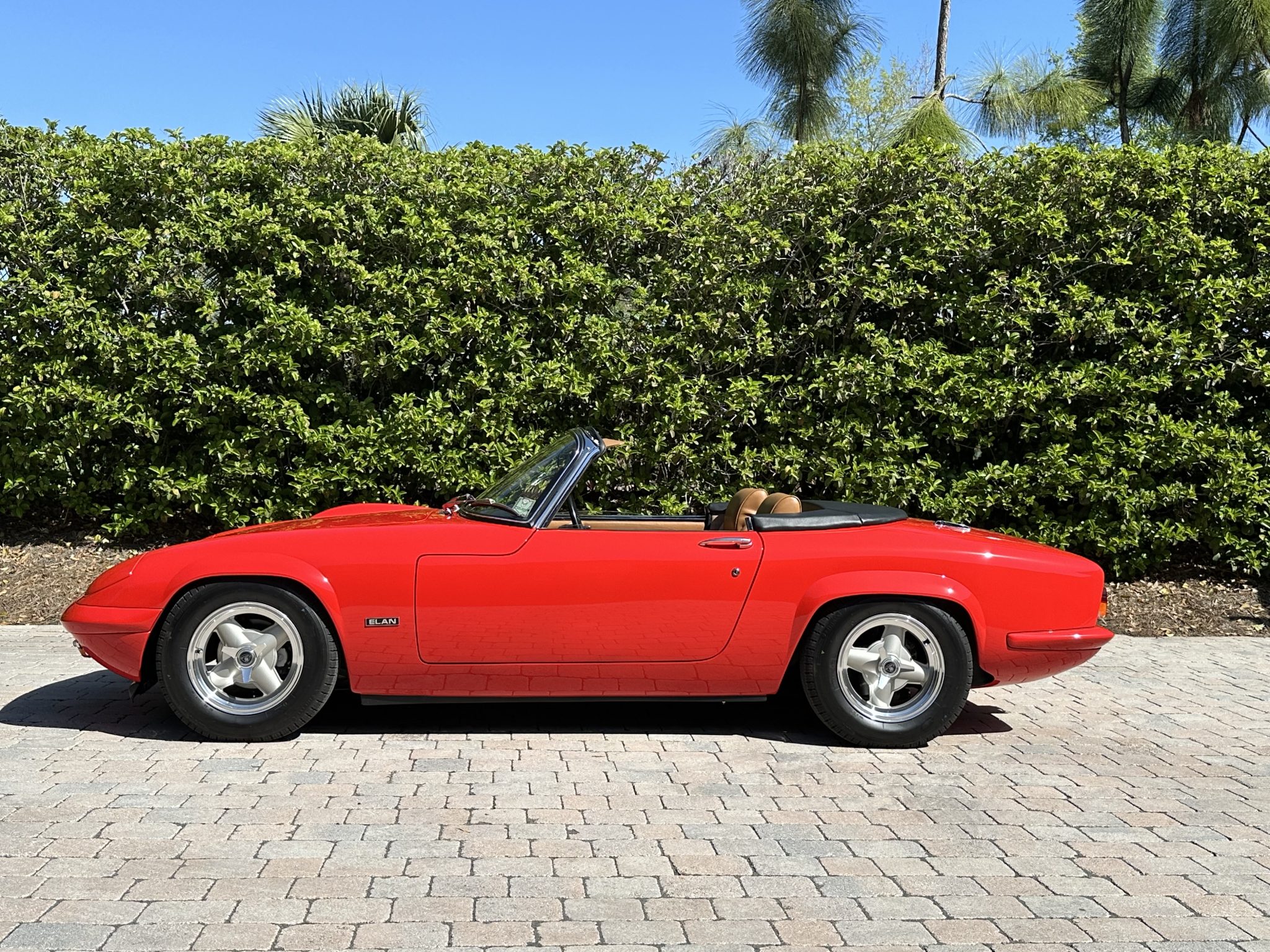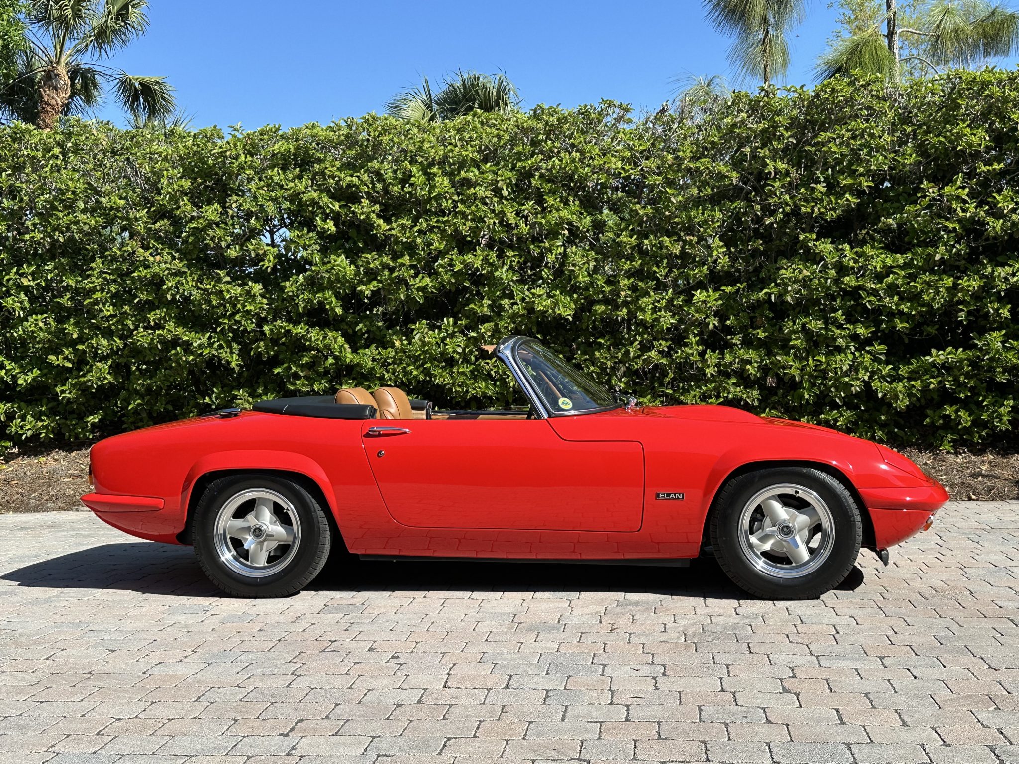 It was subsequently fitted with a replacement tubular chassis from Spyder Cars as part of a multi-year refurbishment that also involved a repaint, an interior re-trim, an engine reseal, and rebuilds of the transmission and rear end. Finished in Rosso Scuderia with a black soft top, the car features retractable headlights as well as adjustable coilovers and rides on 13″ four-spoke alloy wheels secured with three-ear knockoffs. Inside, London Tan leather–trimmed bucket seats are accompanied by a burled walnut dash and a Nakamichi stereo. The twin-cam 1.6L inline-four is fitted with dual Stromberg carburetors as well as a stainless-steel exhaust header, while shifting is through a four-speed manual transmission.