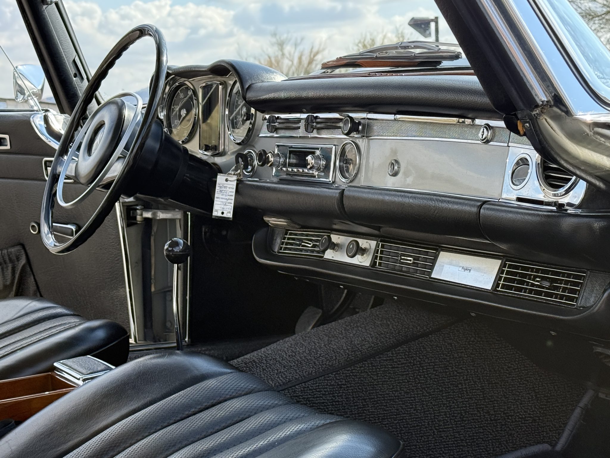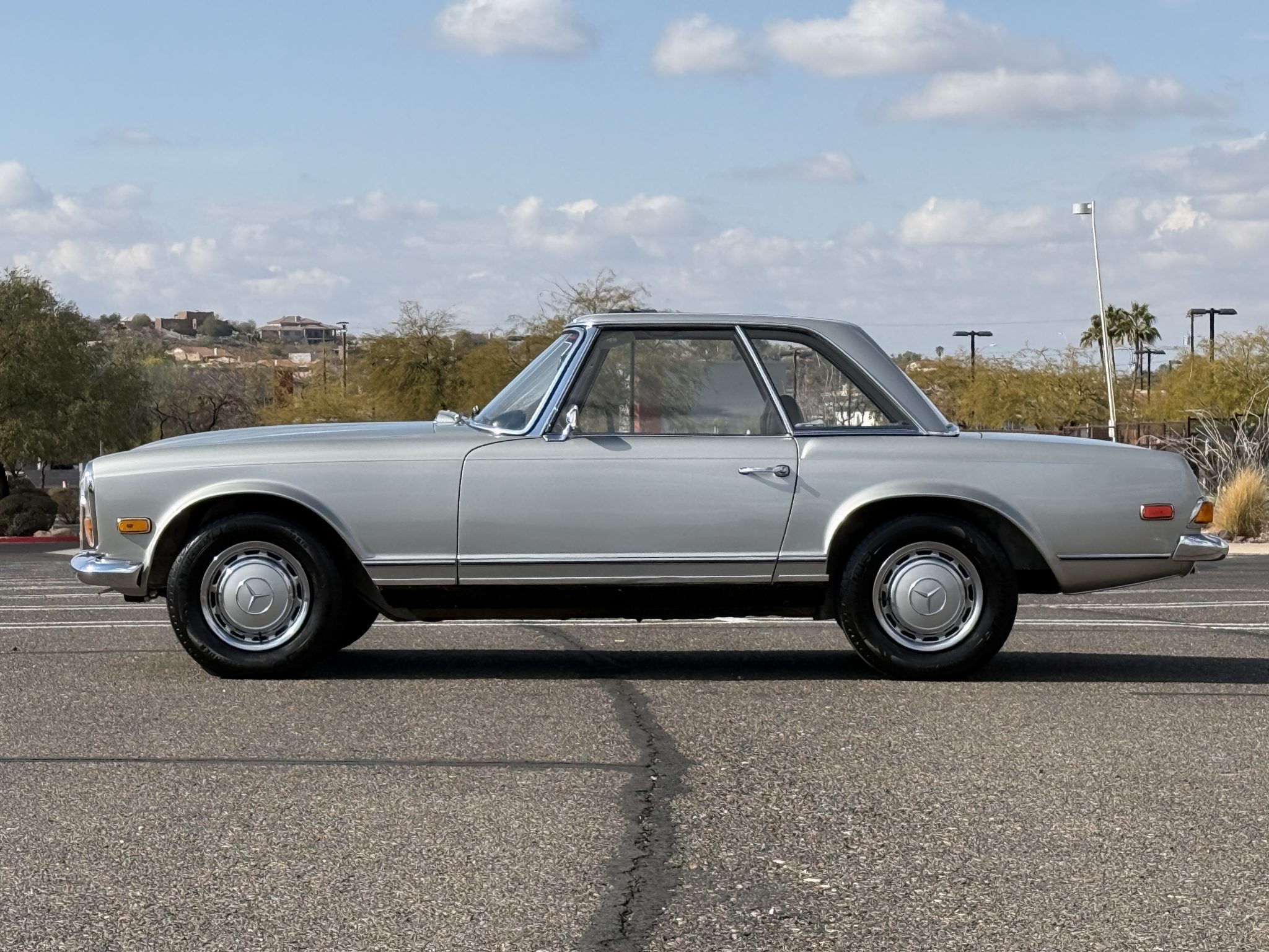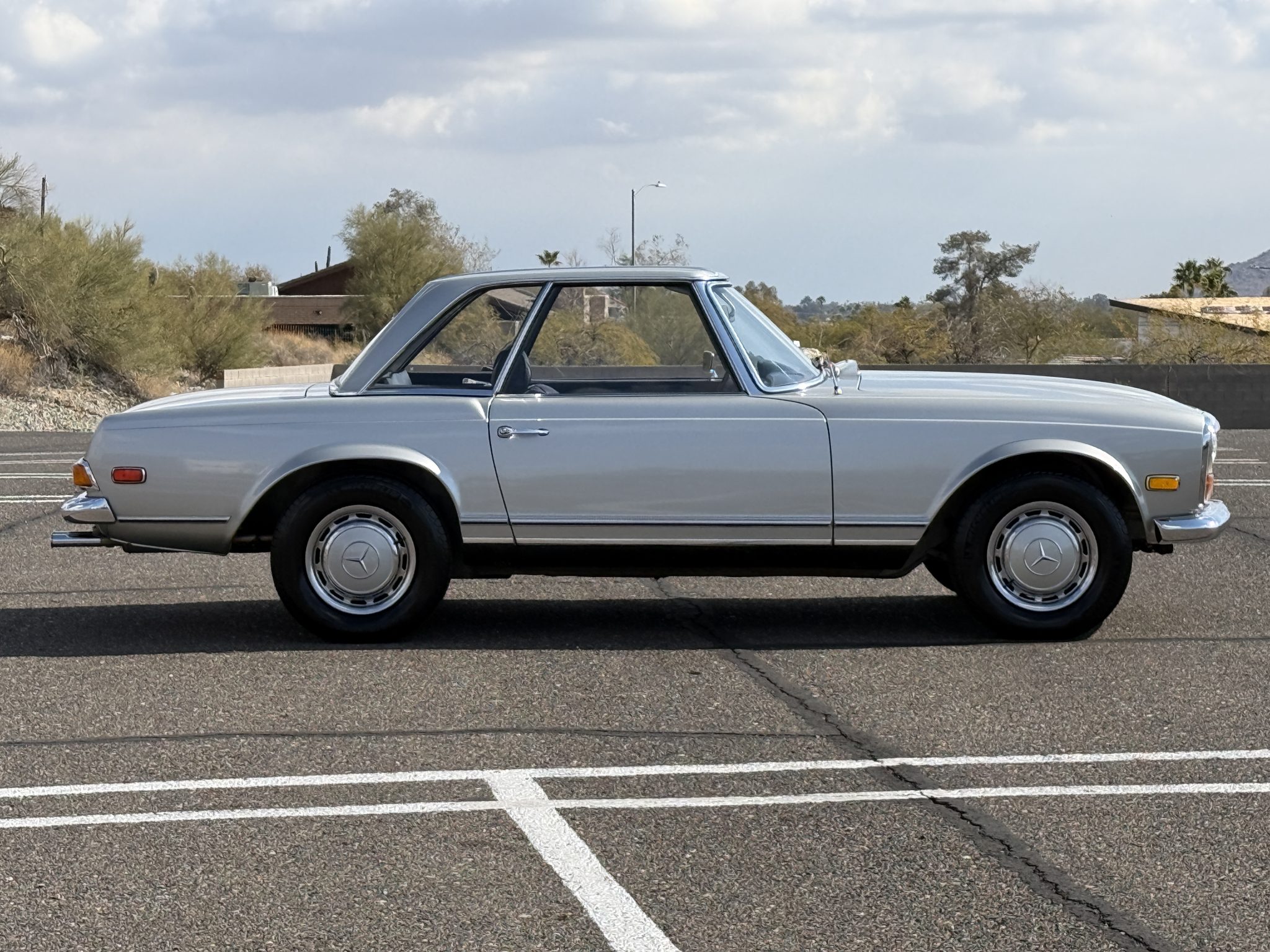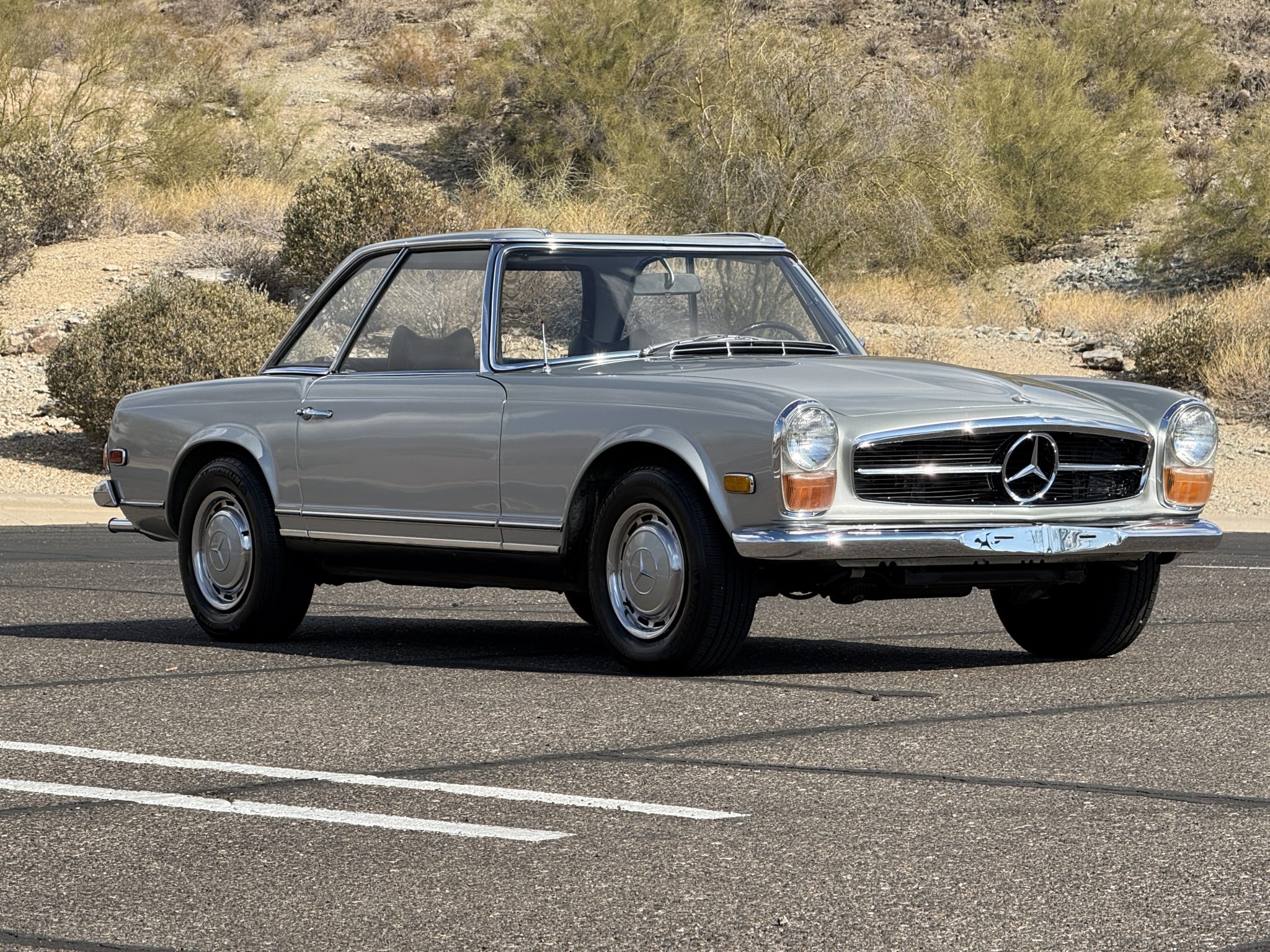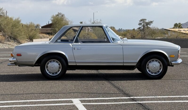 This 1970 Mercedes-Benz 280SL California Coupe including a refresh of the interior, the installation of air conditioning, and replacement of the water pump, power steering pump, engine and subframe mounts, brake master cylinder, rear shocks, radiator, and oil cooler. It is powered by a 2.8-liter inline-six paired with a four-speed manual transmission and is finished in Silver Gray Metallic over black leather. The car came equipped from the factory with the California Coupe option, which added rear bench seating in place of the soft top as well as a body-color removable hardtop.