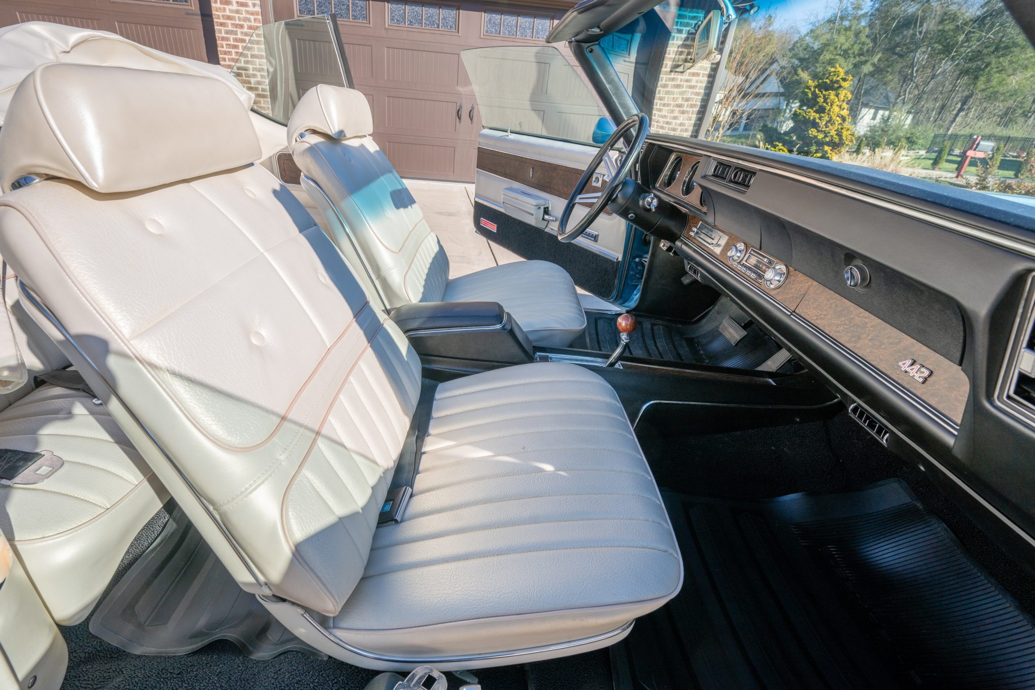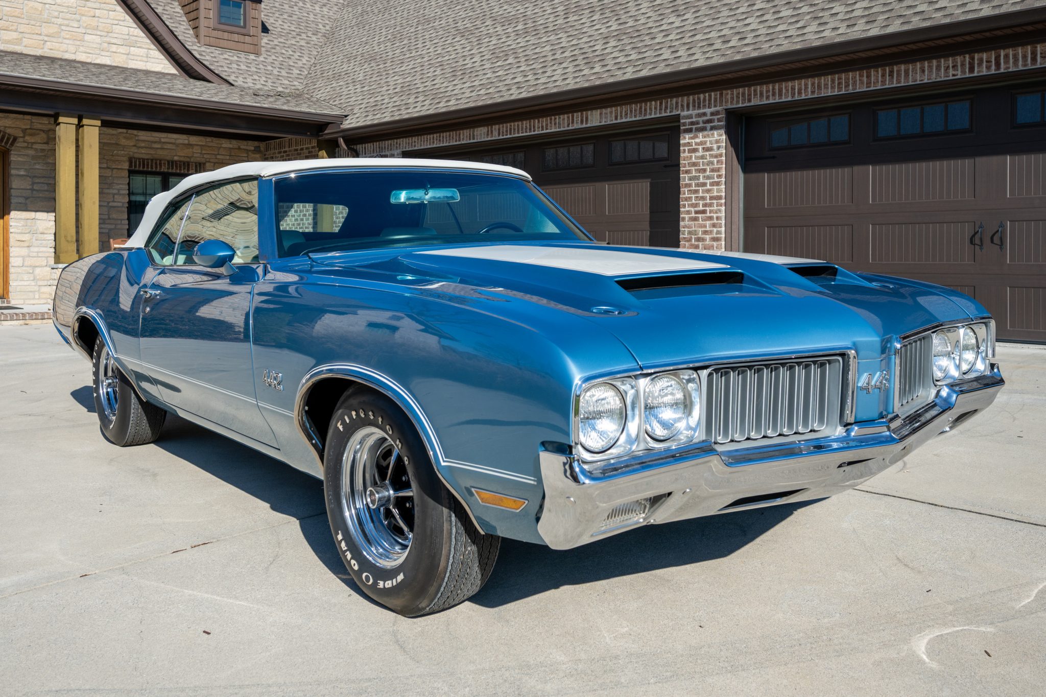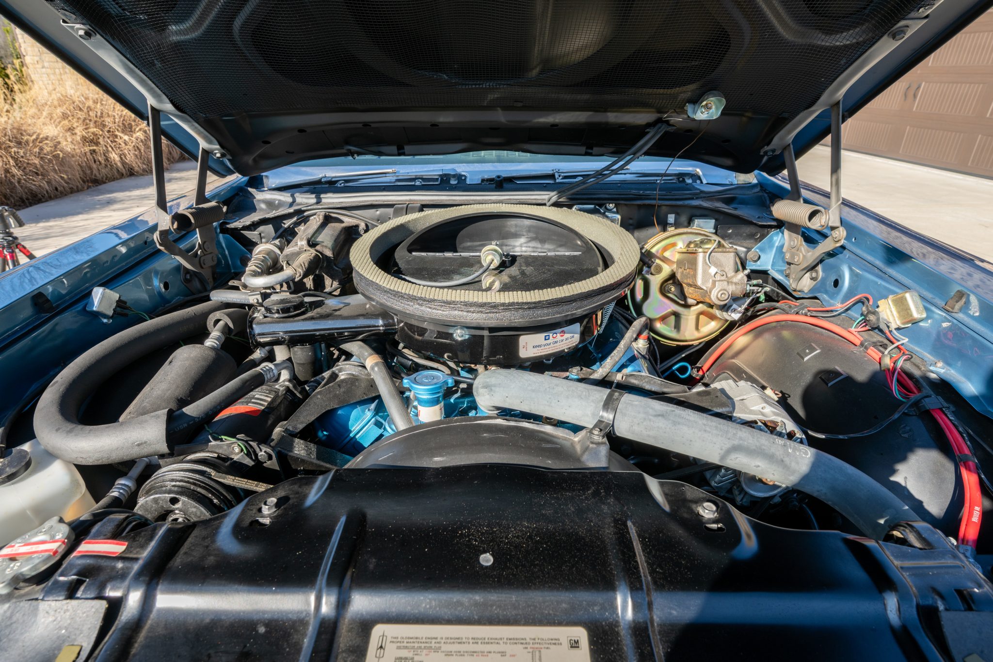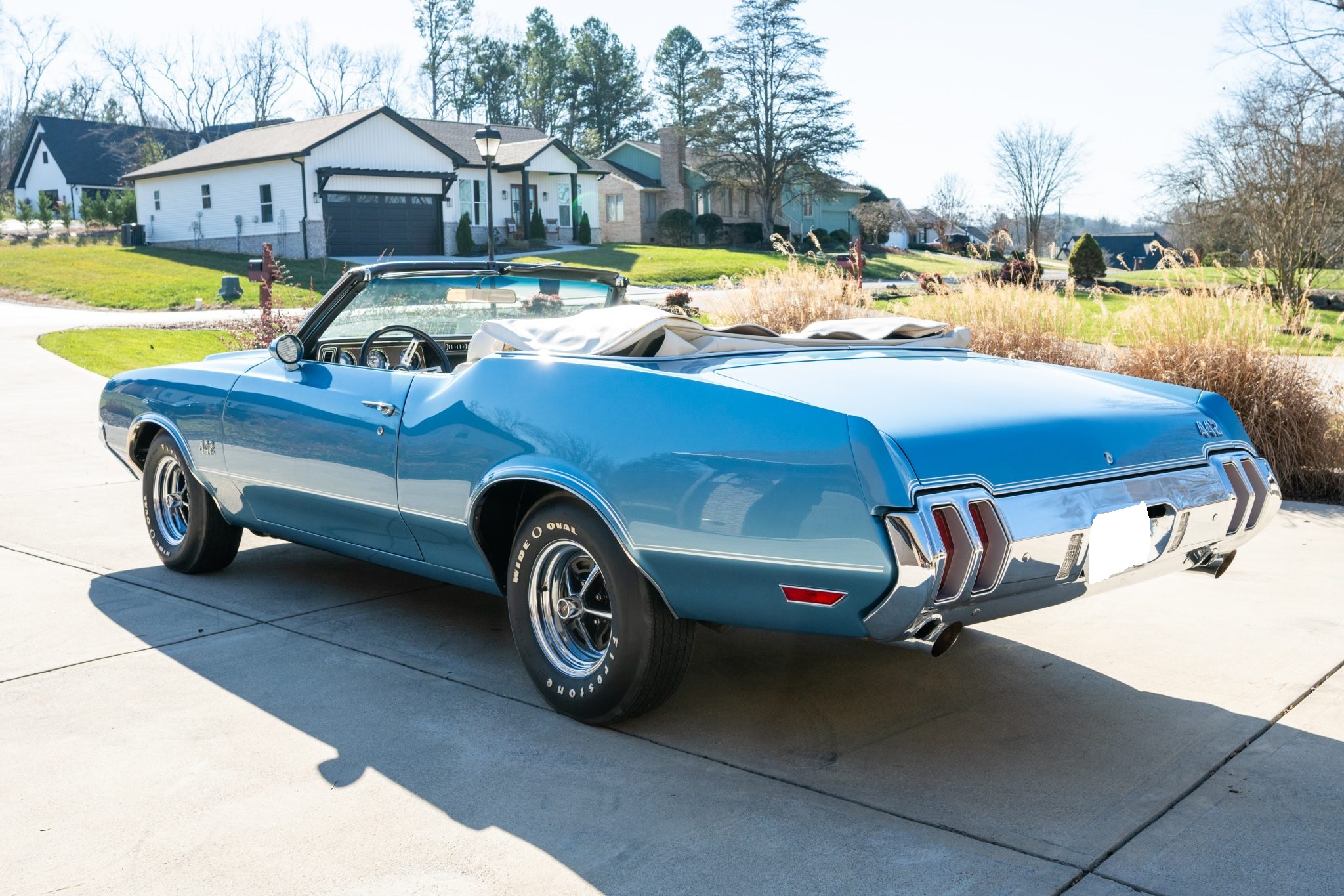 The blue convertible body is complemented with a white convertible top and stripes, and the cabin is outfitted with Ivory vinyl upholstery, faux woodgrain trim, a Custom Sport steering wheel, air conditioning, an AM/FM radio, and power windows. The overhauled drivetrain is comprised of a 455ci Rocket V8, a three-speed Turbo Hydramatic transmission, and a 12-bolt limited-slip differential, and further equipment includes 14″ Super Sport I wheels, close-ratio power steering, a dual exhaust system, and power front disc brakes.