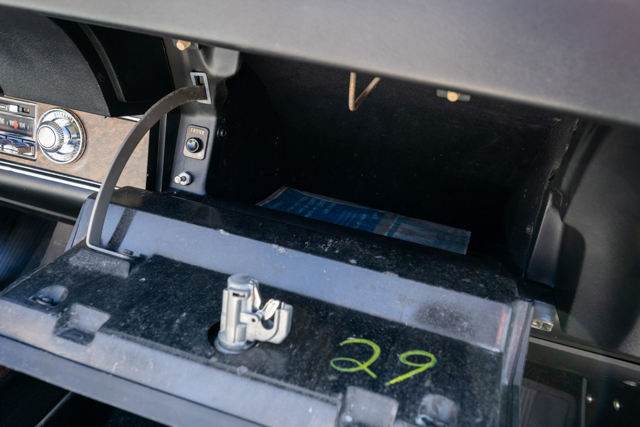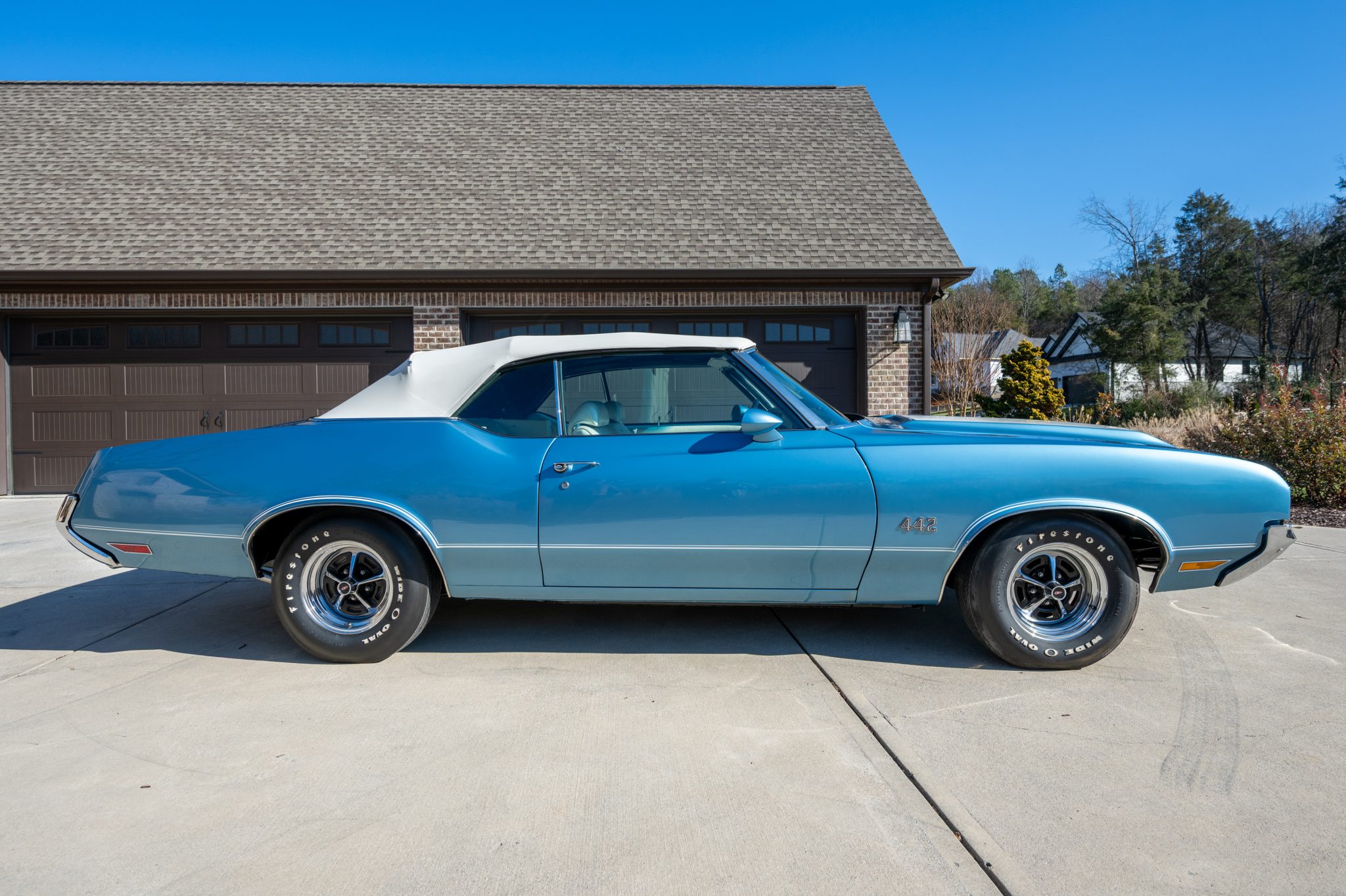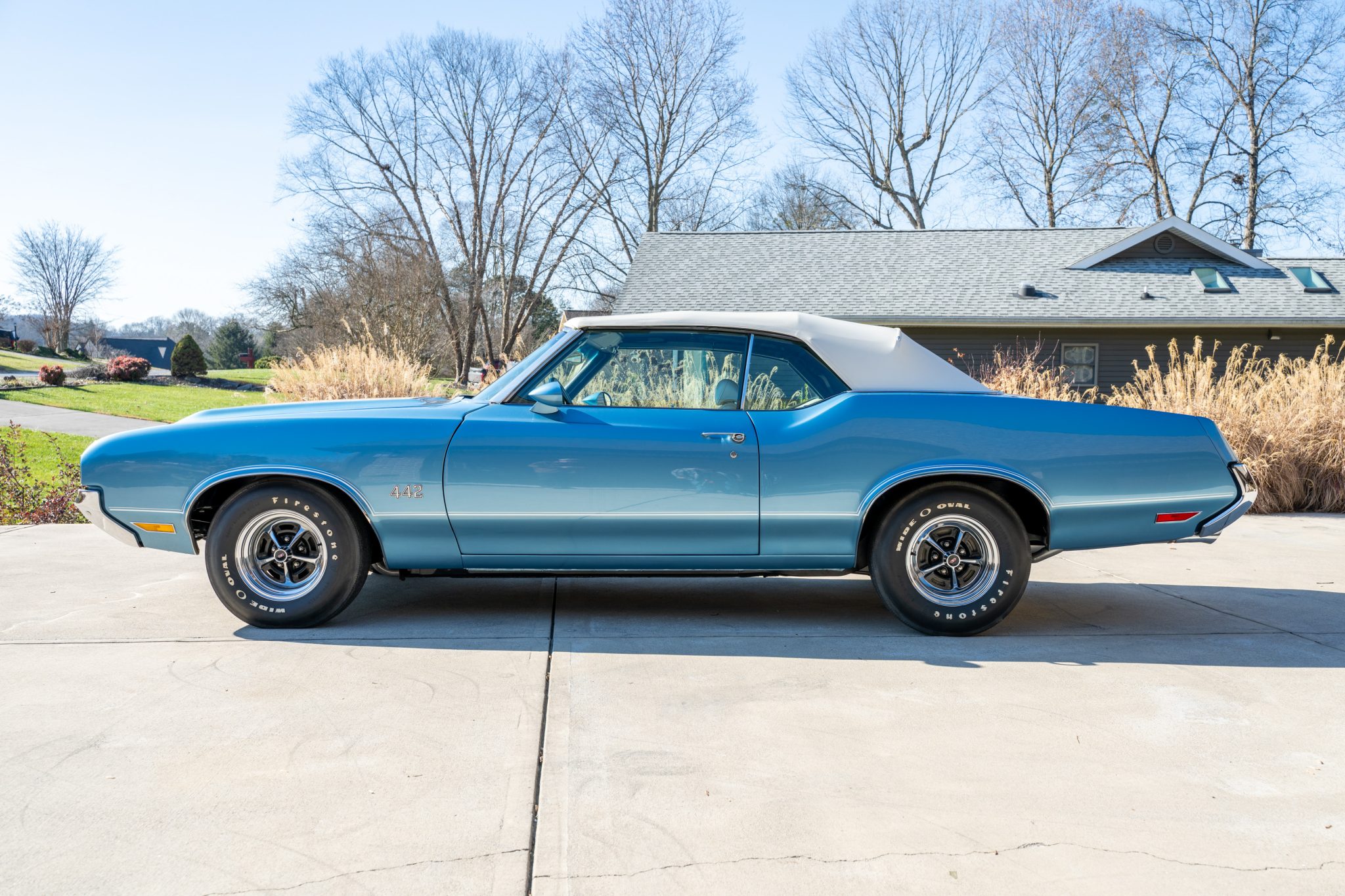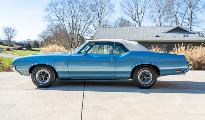 The blue convertible body is complemented with a white convertible top and stripes, and the cabin is outfitted with Ivory vinyl upholstery, faux woodgrain trim, a Custom Sport steering wheel, air conditioning, an AM/FM radio, and power windows. The overhauled drivetrain is comprised of a 455ci Rocket V8, a three-speed Turbo Hydramatic transmission, and a 12-bolt limited-slip differential, and further equipment includes 14″ Super Sport I wheels, close-ratio power steering, a dual exhaust system, and power front disc brakes.