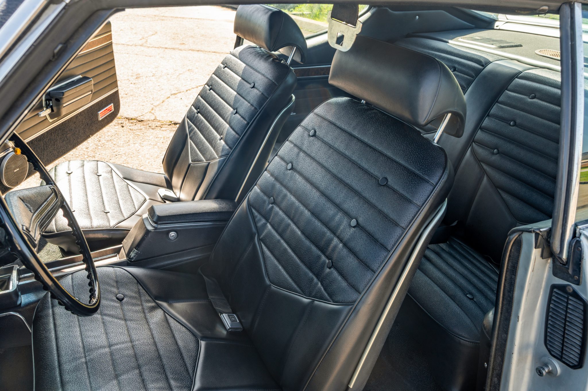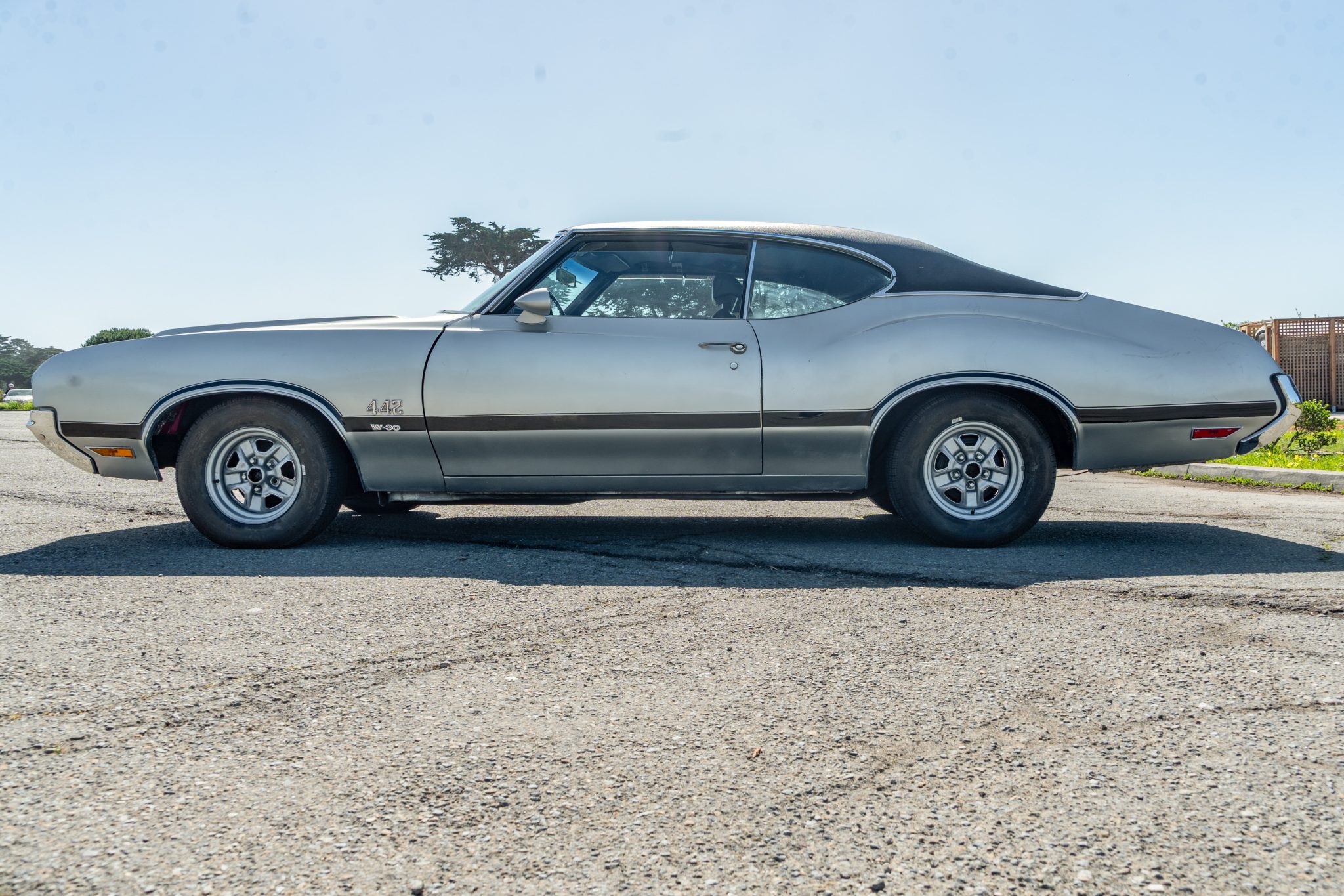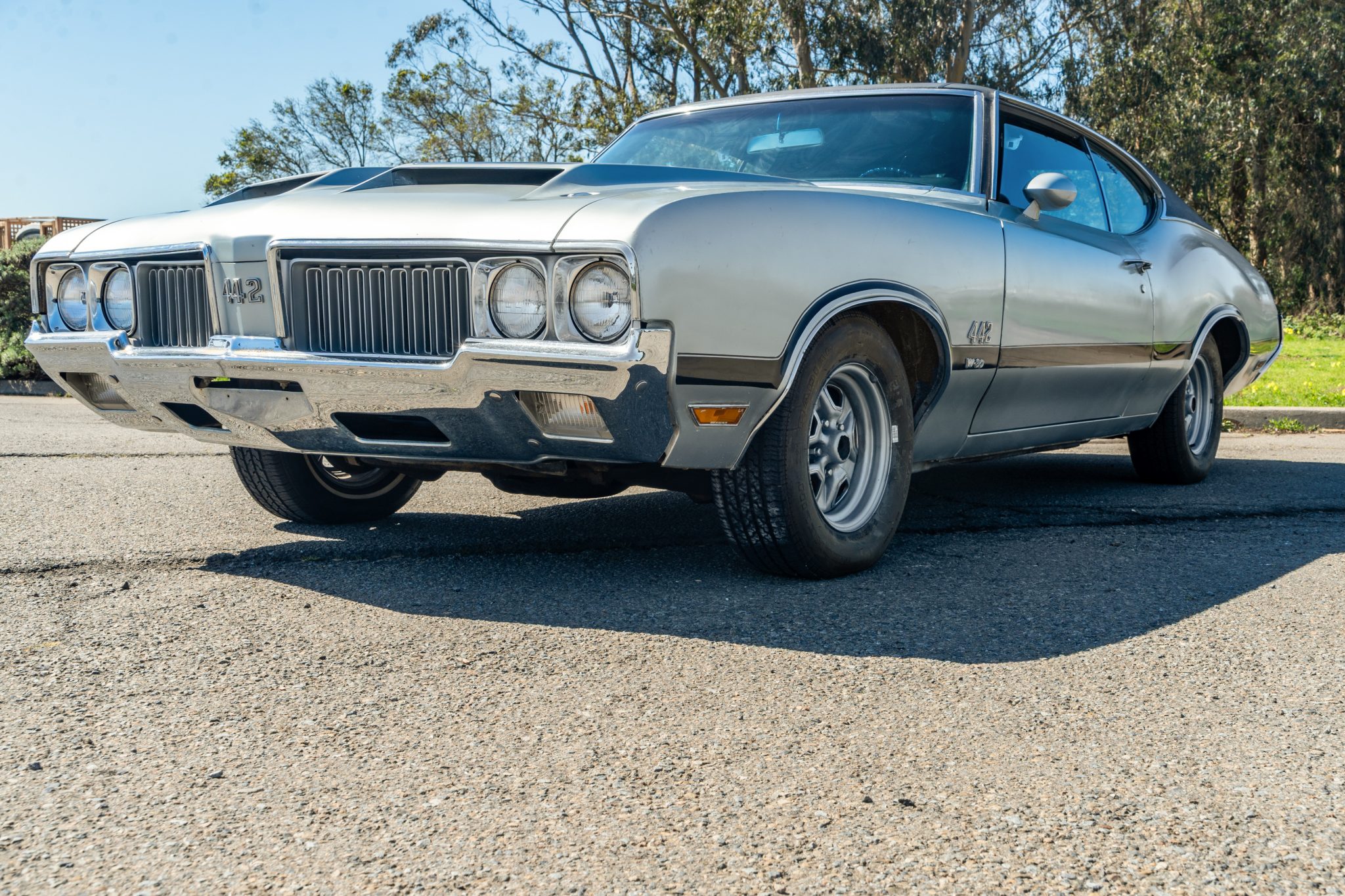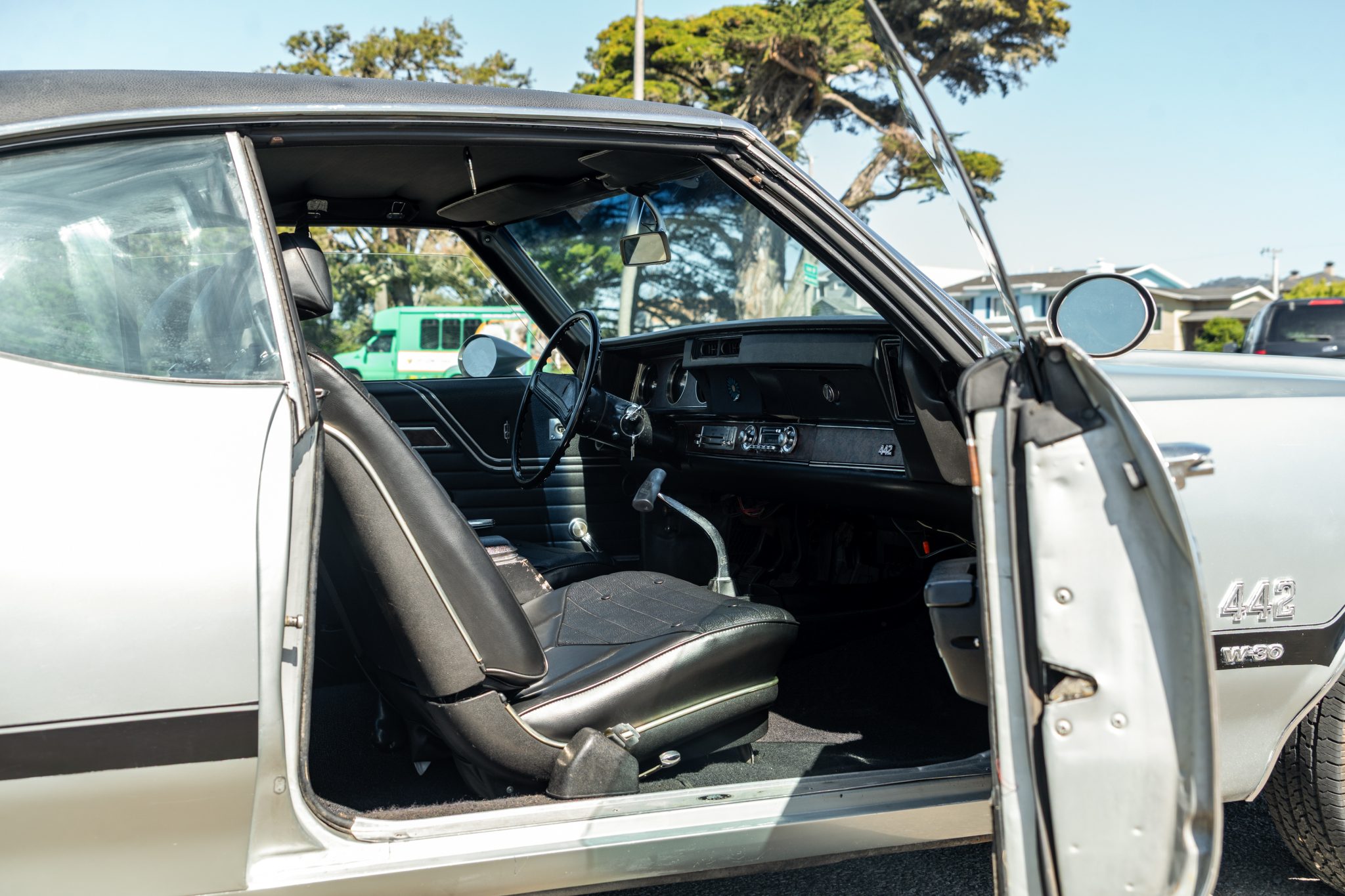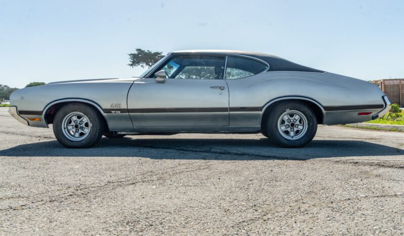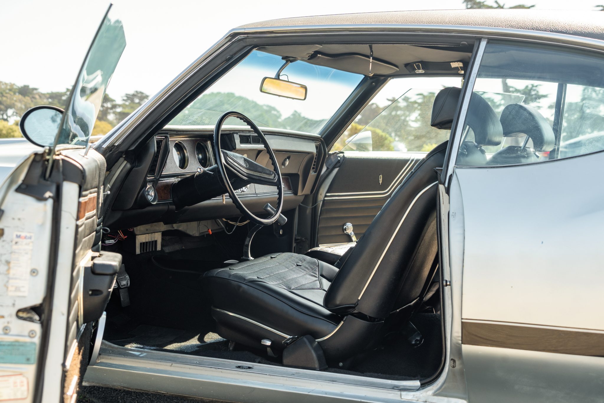 The car is equipped with a 455ci V8, a four-speed manual transmission, a limited-slip rear differential, unassisted front disc brakes, and 14″ Super Stock II wheels. The exterior is finished in Platinum with a black vinyl roof, and black stripes accent the dual-scoop hood and bodysides. The cabin is outfitted with woodgrain trim, an AM/FM stereo, a Hurst shifter, a center console, and front bucket seats trimmed in black vinyl.