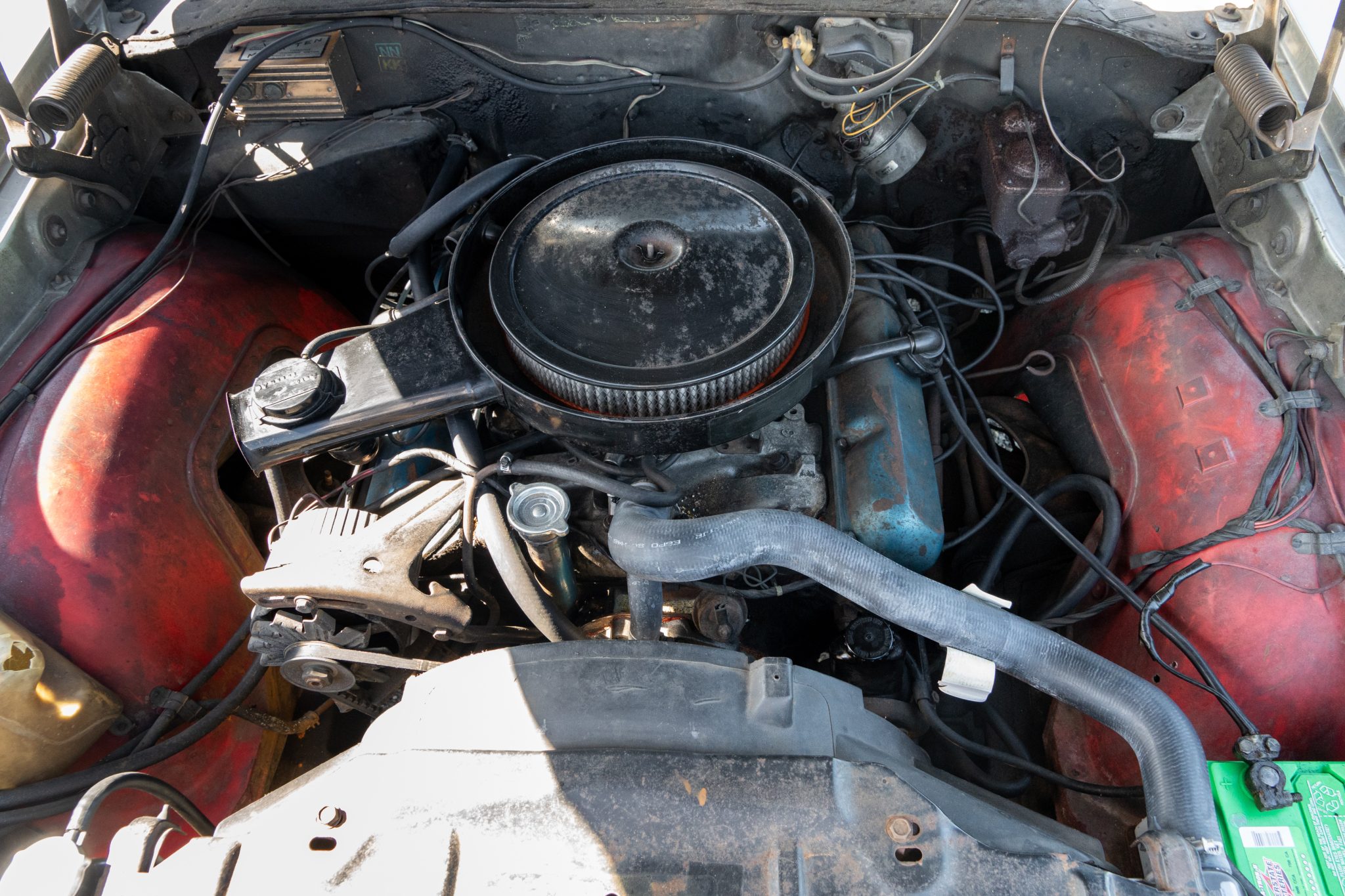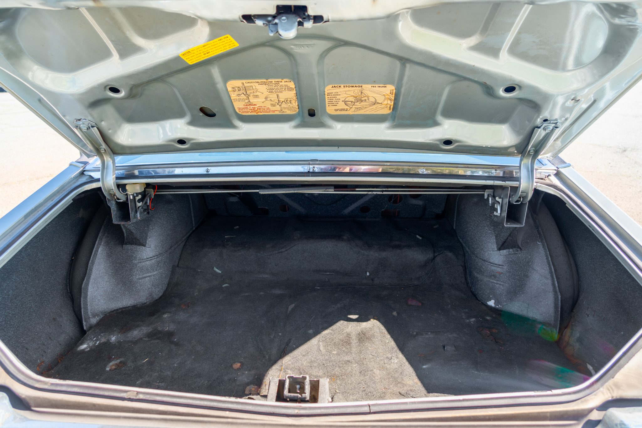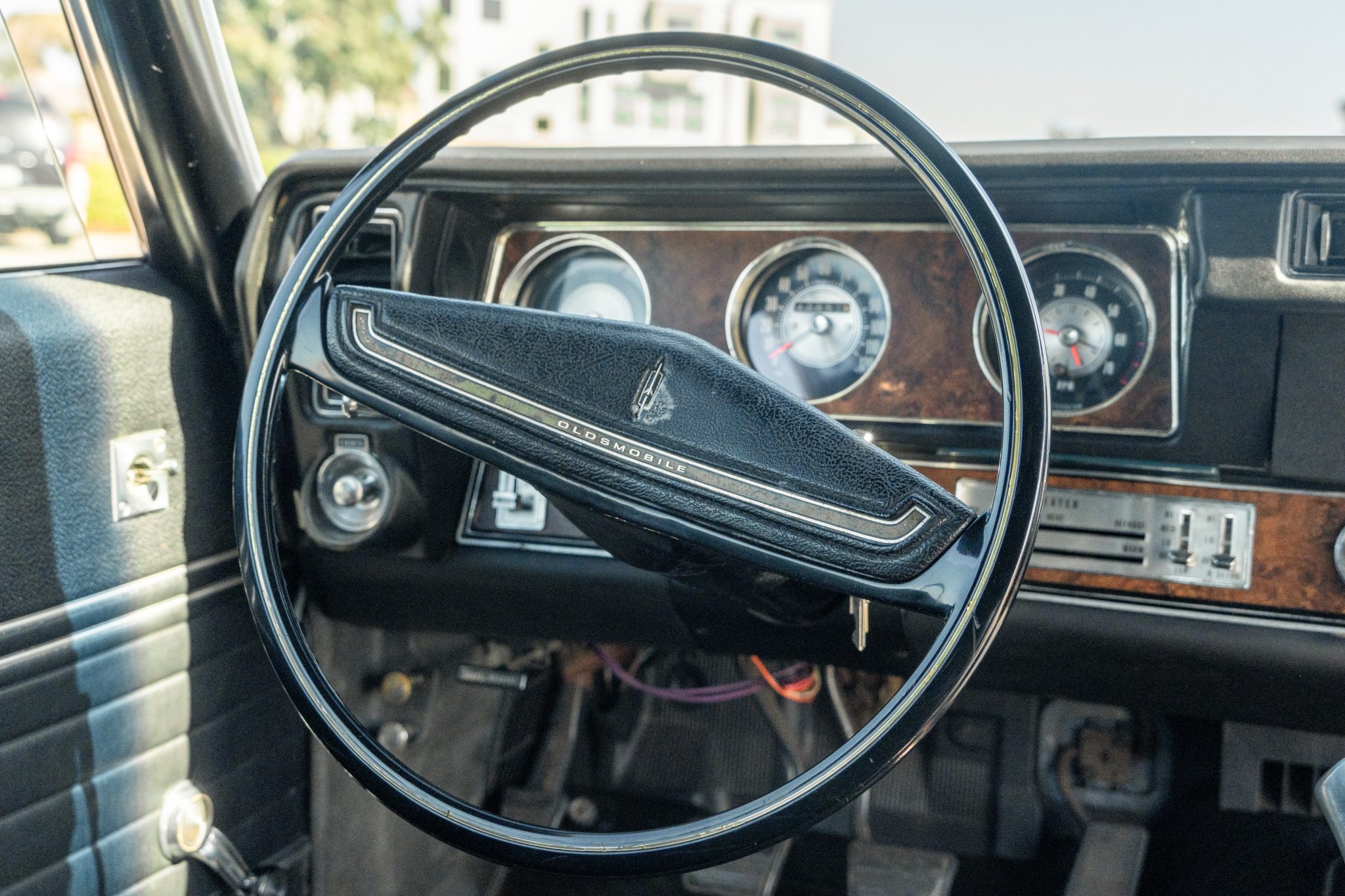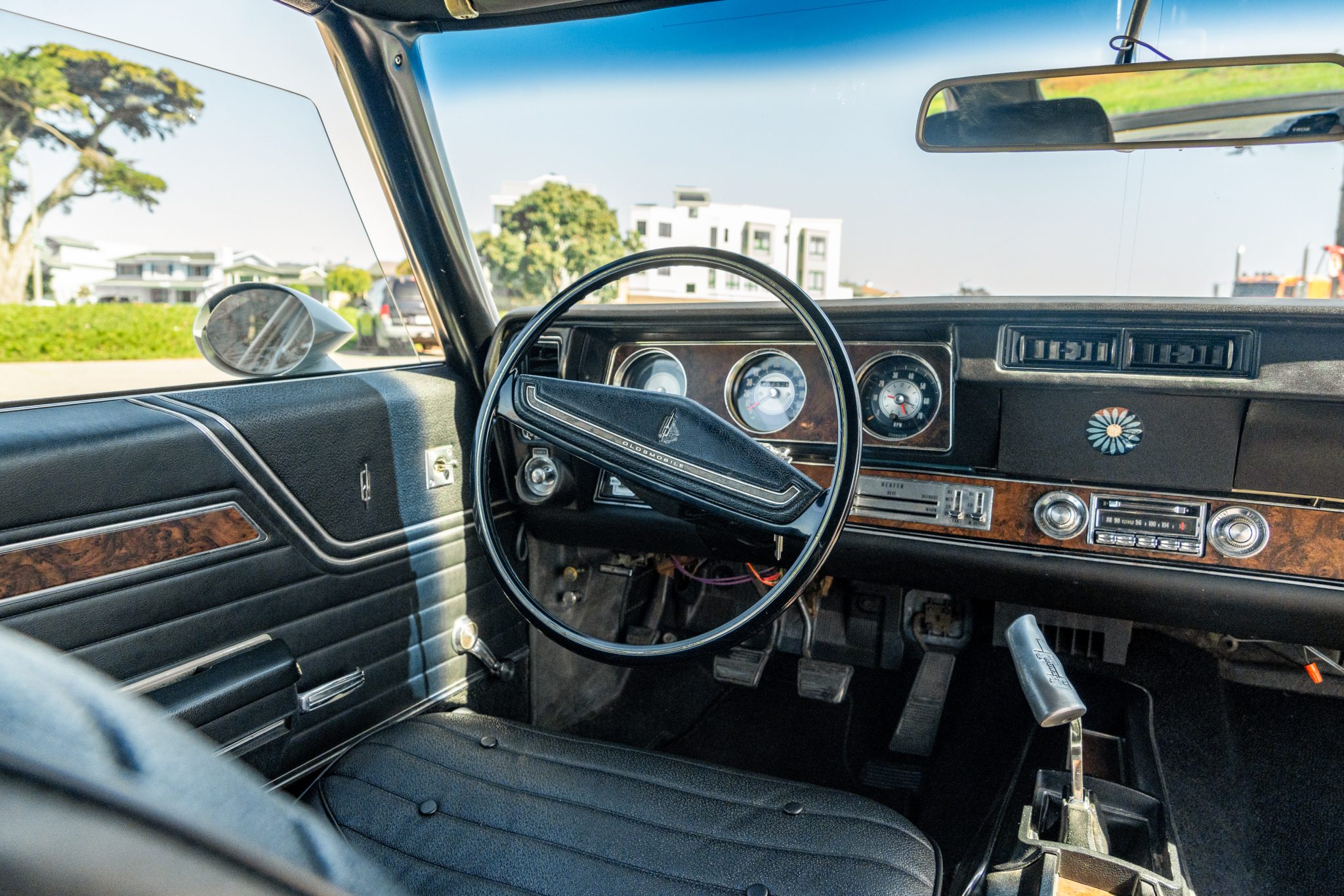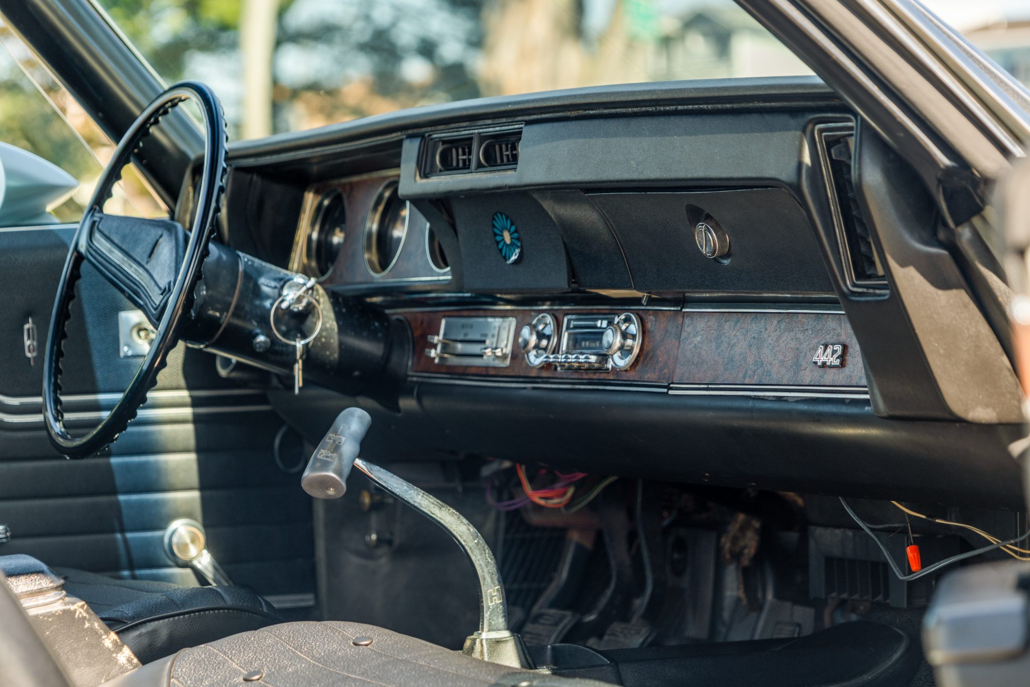 The car is equipped with a 455ci V8, a four-speed manual transmission, a limited-slip rear differential, unassisted front disc brakes, and 14″ Super Stock II wheels. The exterior is finished in Platinum with a black vinyl roof, and black stripes accent the dual-scoop hood and bodysides. The cabin is outfitted with woodgrain trim, an AM/FM stereo, a Hurst shifter, a center console, and front bucket seats trimmed in black vinyl.