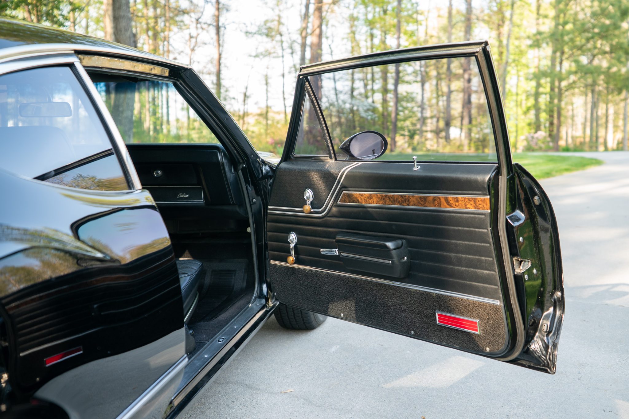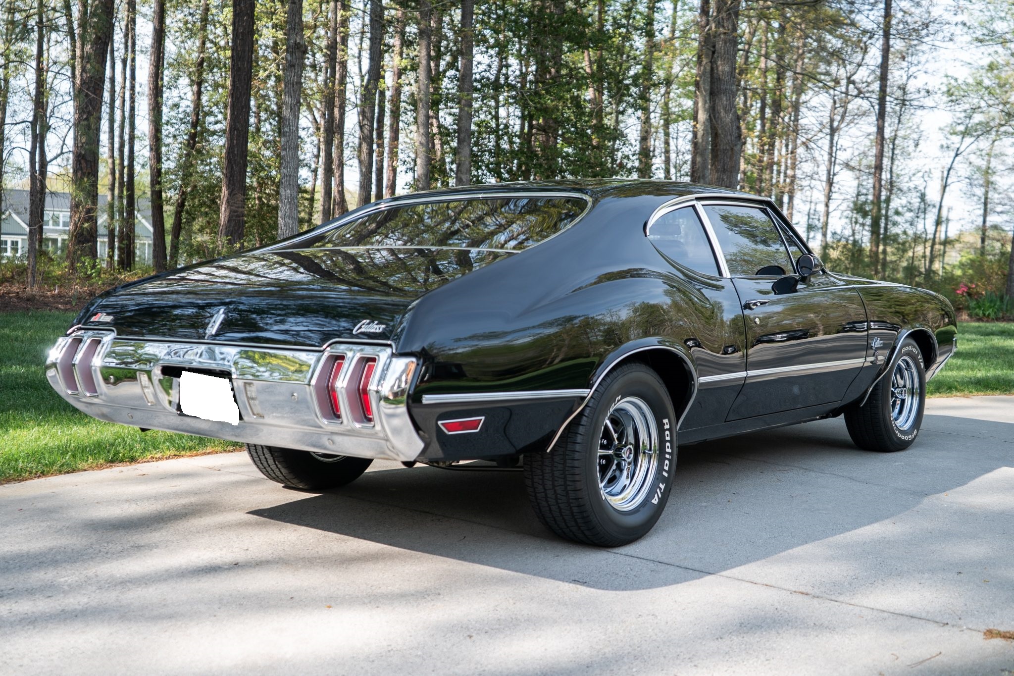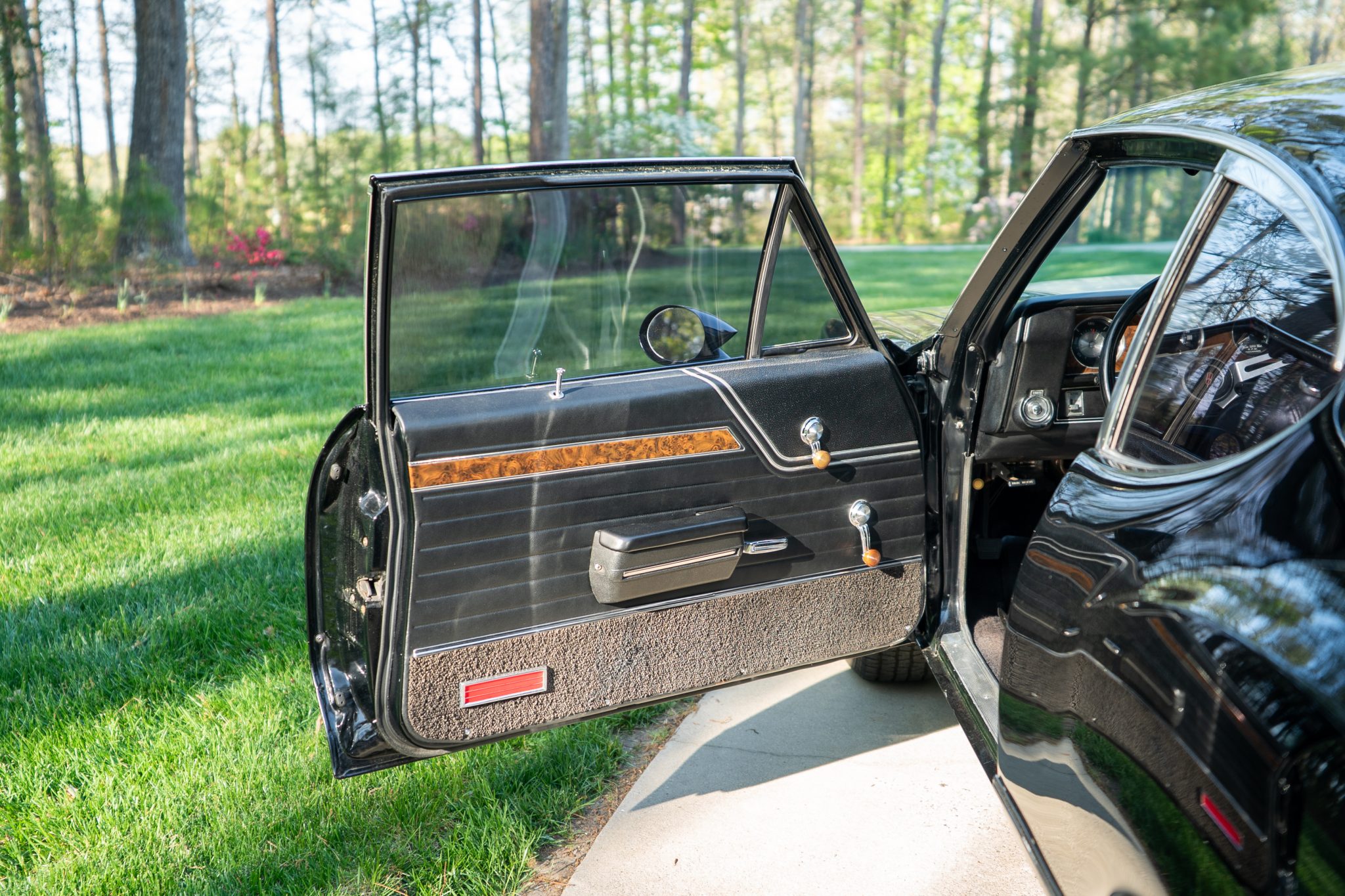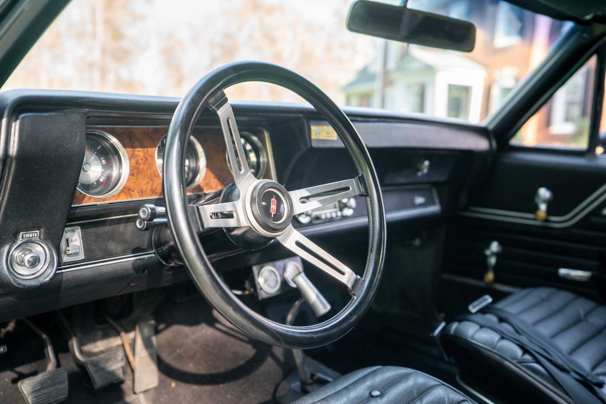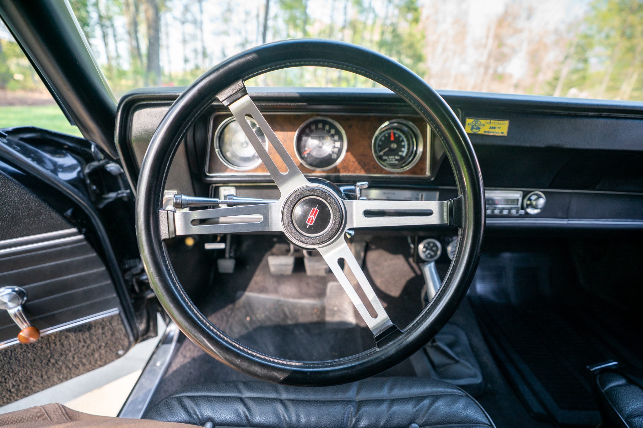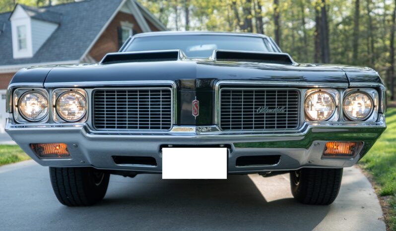 This 1970 Oldsmobile Cutlass S Sports Coupe is a black-over-black example that is powered by a 350ci V8 linked with a four-speed manual transmission. Details include a fiberglass dual-scoop hood, white hood stripes, power-assisted steering, 15″ Super Stock I wheels, a Hurst T-handle shifter, an Edelbrock intake manifold and four-barrel carburetor, tubular exhaust headers, and a push-button AM radio.