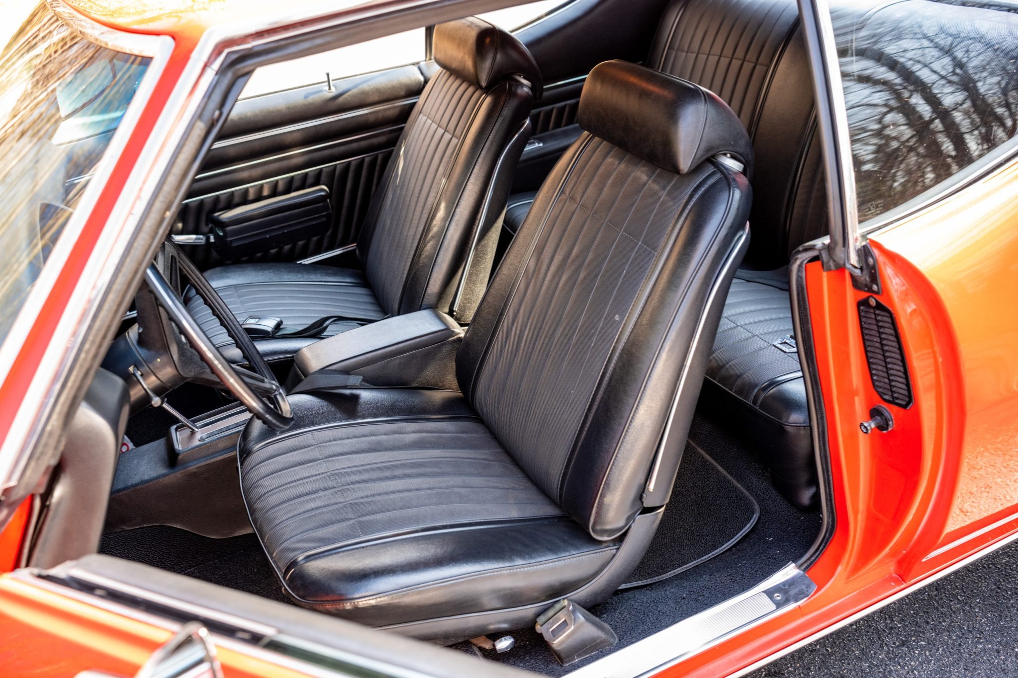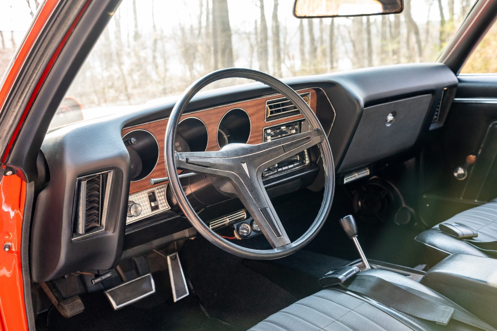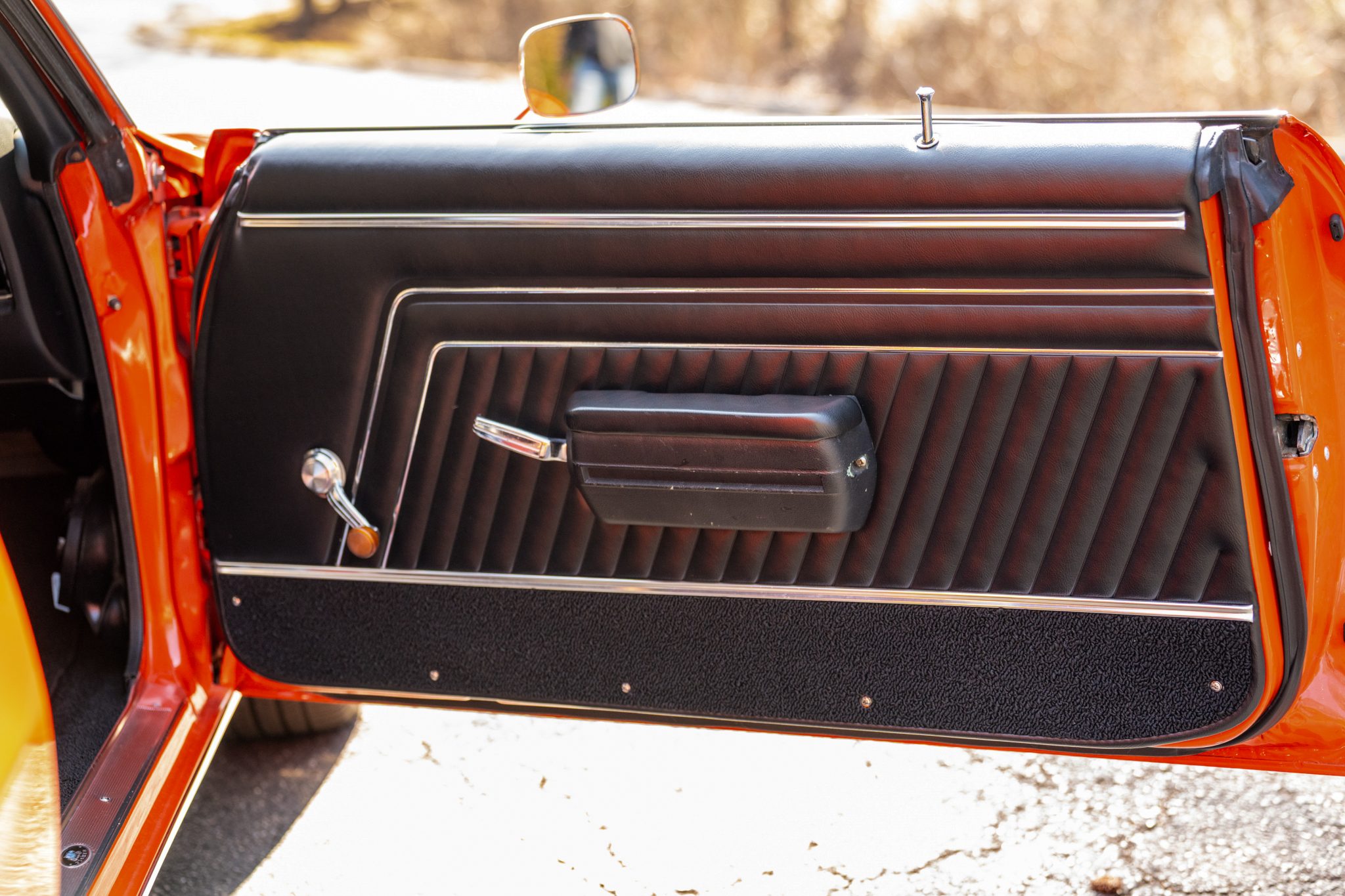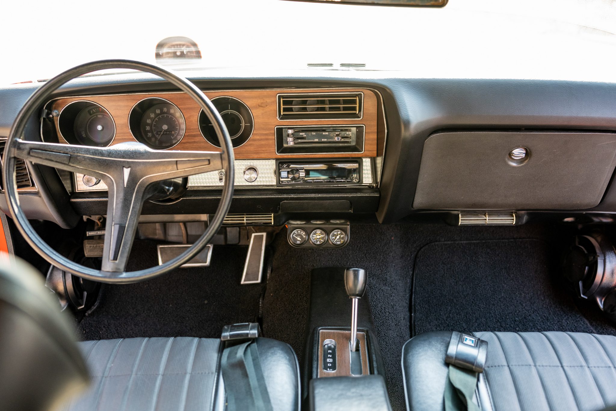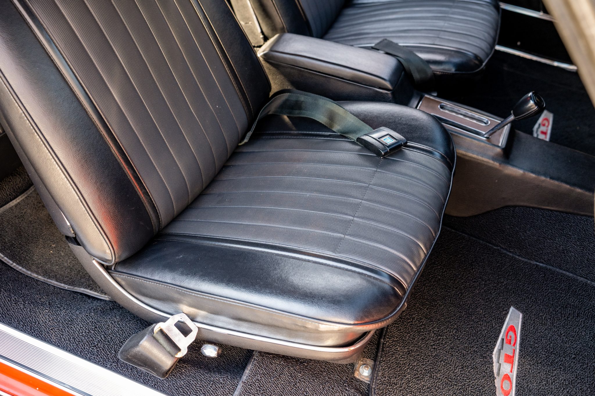 This 1970 Pontiac GTO coupe underwent a refurbishment approximately 10 years ago which included refinishing the body in orange, reupholstering the interior in black, and installing a replacement 455ci V8 linked to a four-speed automatic transmission. The car is equipped with 17″ five-spoke wheels, a body-color Endura front bumper, a twin-scoop hood, a hood-mounted tachometer, a rear spoiler, power steering, a serpentine belt drive system, an aluminum radiator, air conditioning, and an Alpine stereo with Bluetooth connectivity.