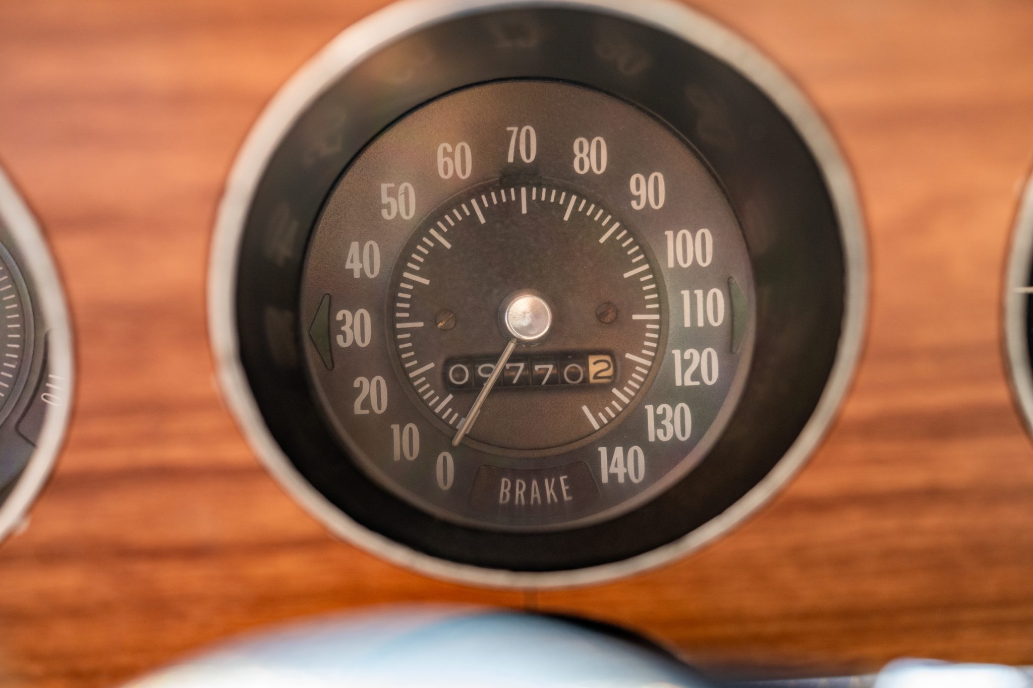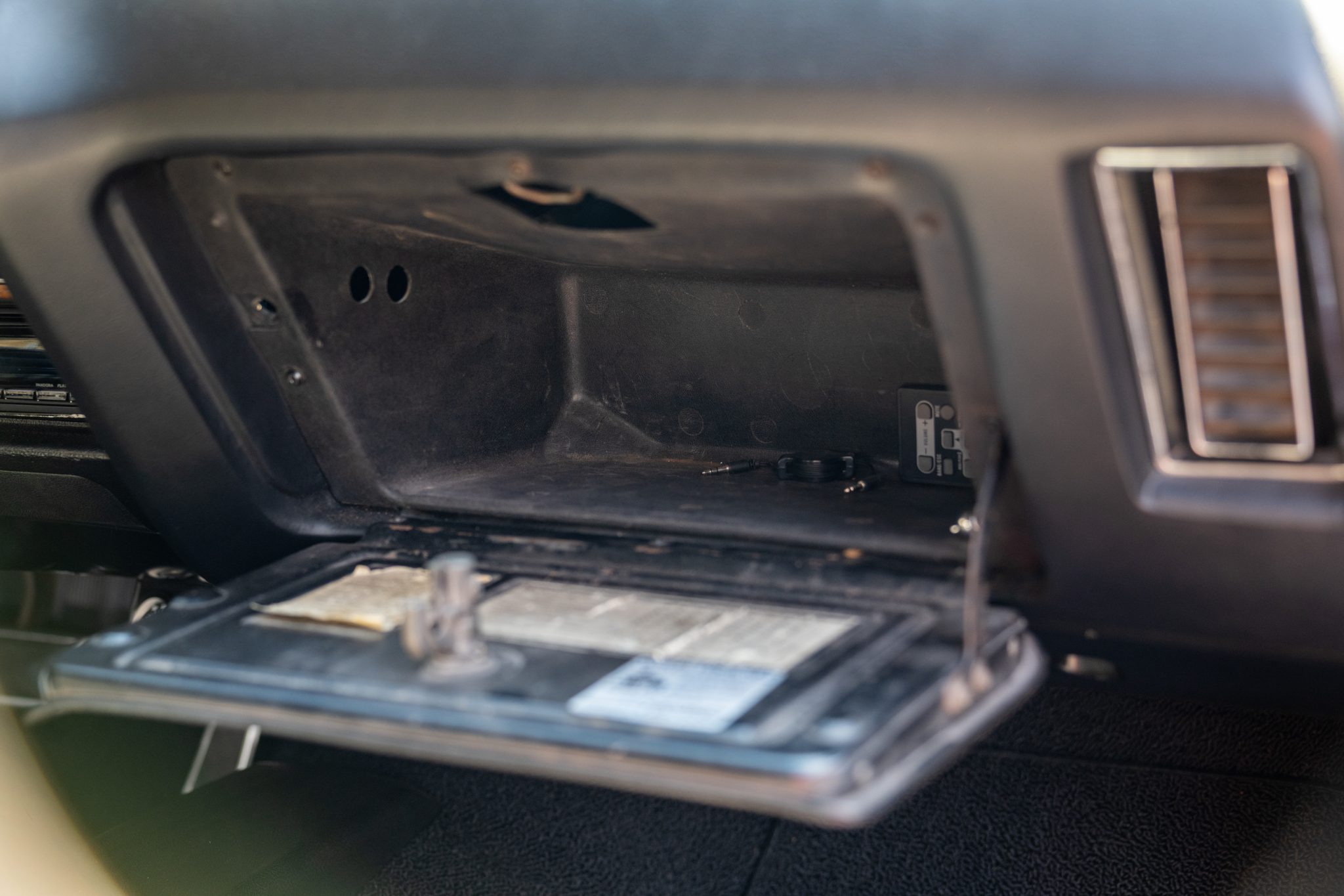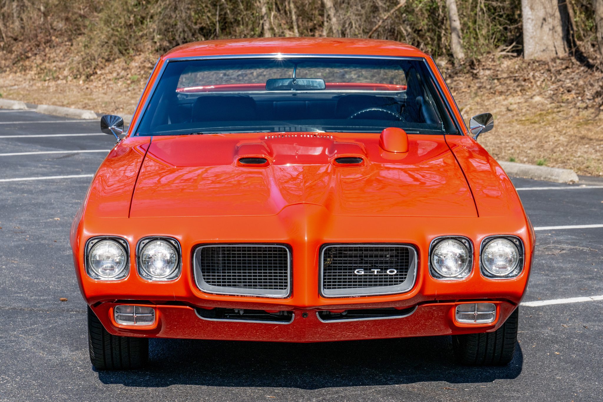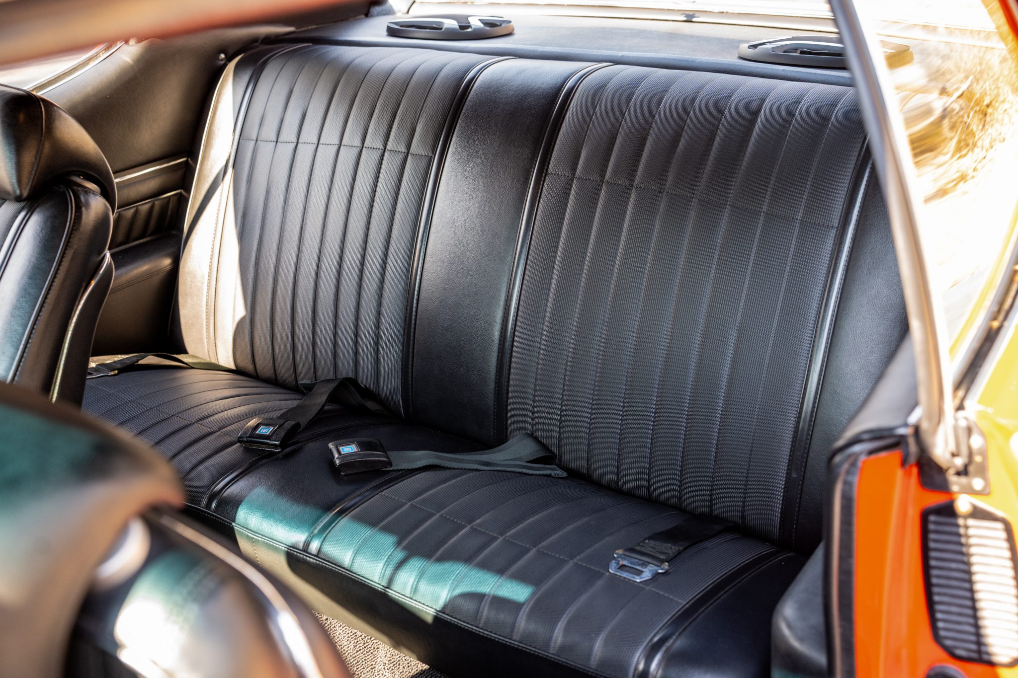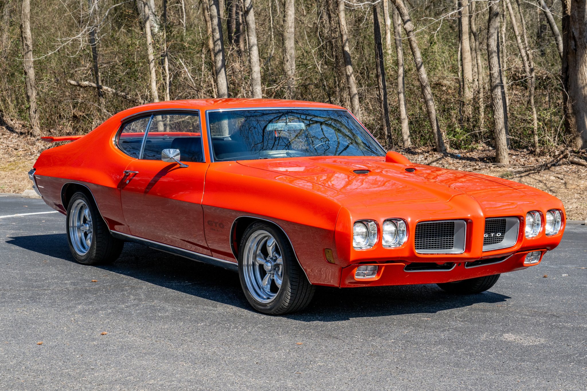 This 1970 Pontiac GTO coupe underwent a refurbishment approximately 10 years ago which included refinishing the body in orange, reupholstering the interior in black, and installing a replacement 455ci V8 linked to a four-speed automatic transmission. The car is equipped with 17″ five-spoke wheels, a body-color Endura front bumper, a twin-scoop hood, a hood-mounted tachometer, a rear spoiler, power steering, a serpentine belt drive system, an aluminum radiator, air conditioning, and an Alpine stereo with Bluetooth connectivity.
