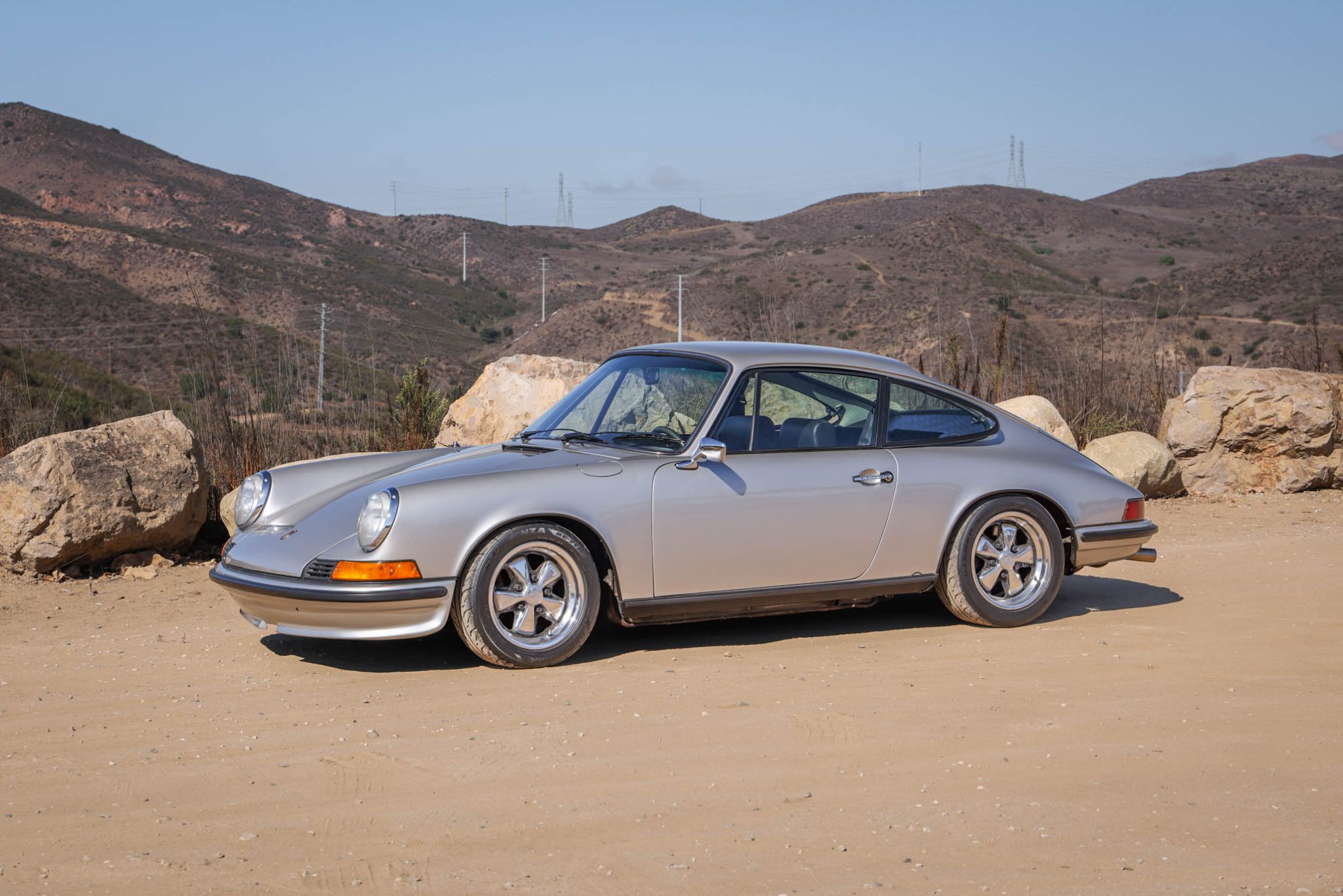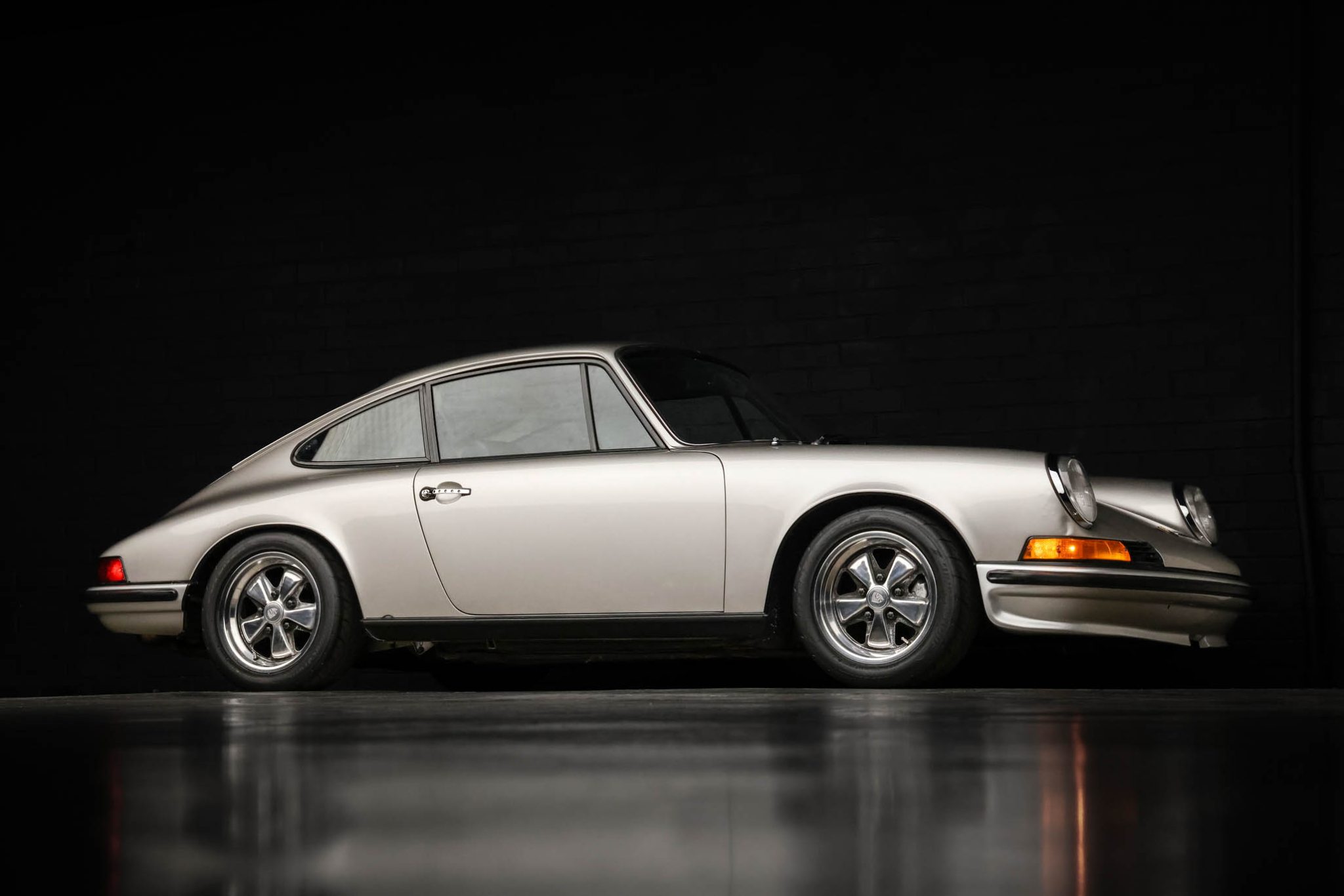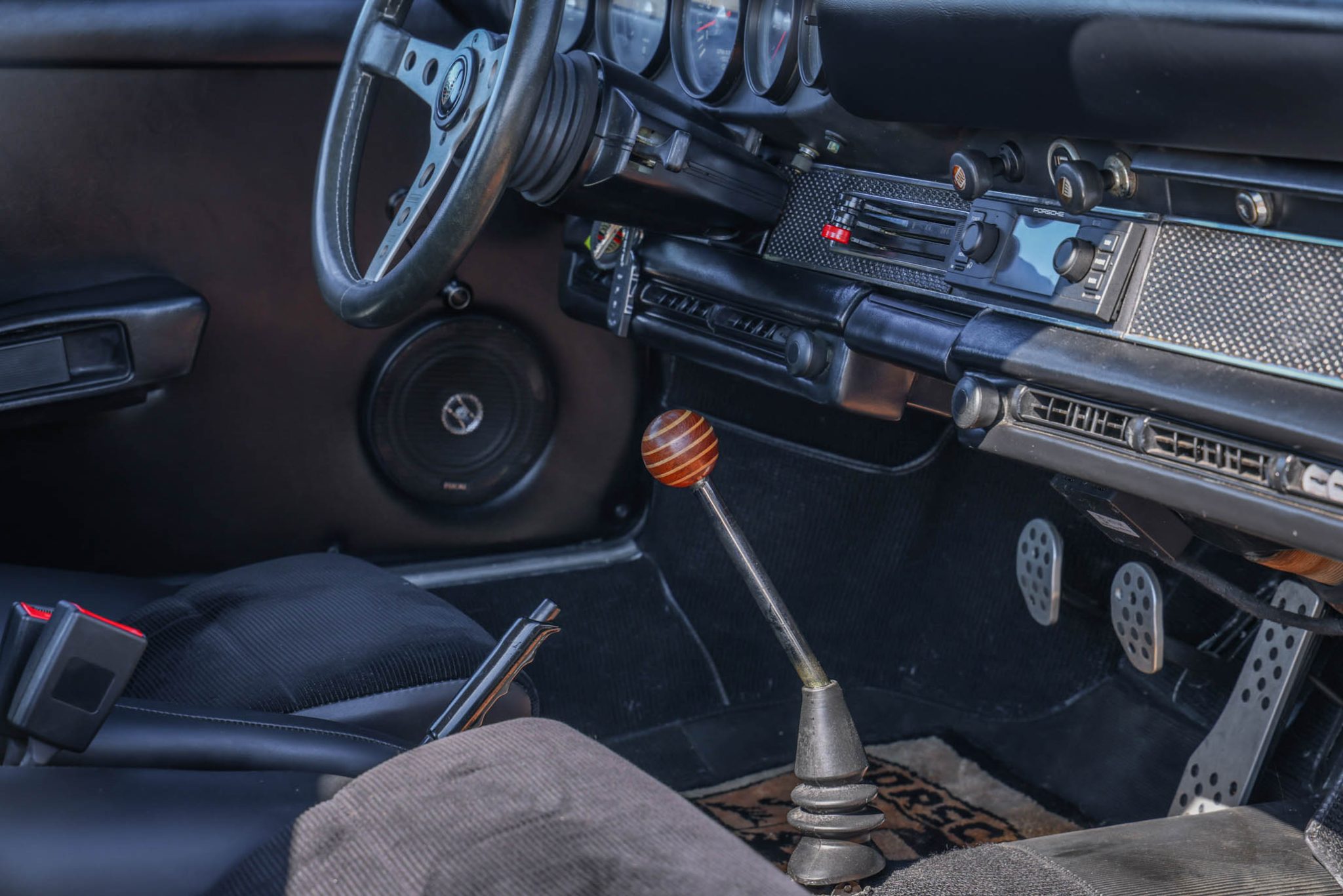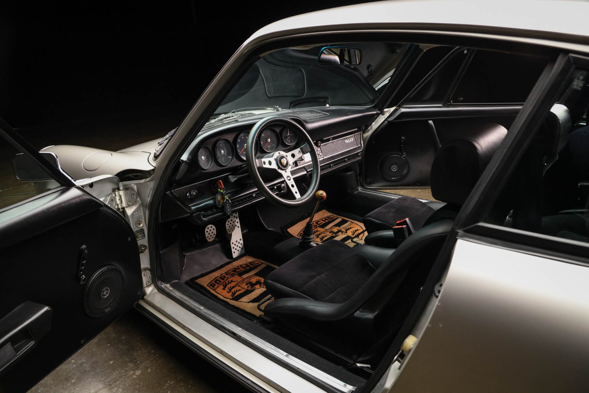 has been refinished in silver over black leather and corduroy. It is powered by a replacement flat-six equipped with fuel injection and linked with a five-speed 901 manual transaxle, and equipment includes a 911S-style front spoiler, H4 headlights, black window trim, polished 15″ Fuchs alloy wheels, aftermarket fixed-back bucket seats, a Porsche Classic radio with navigation, a 917-style shift knob, air conditioning, and a MOMO steering wheel.