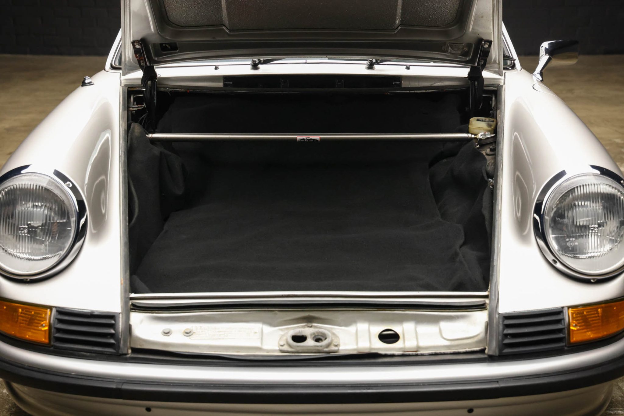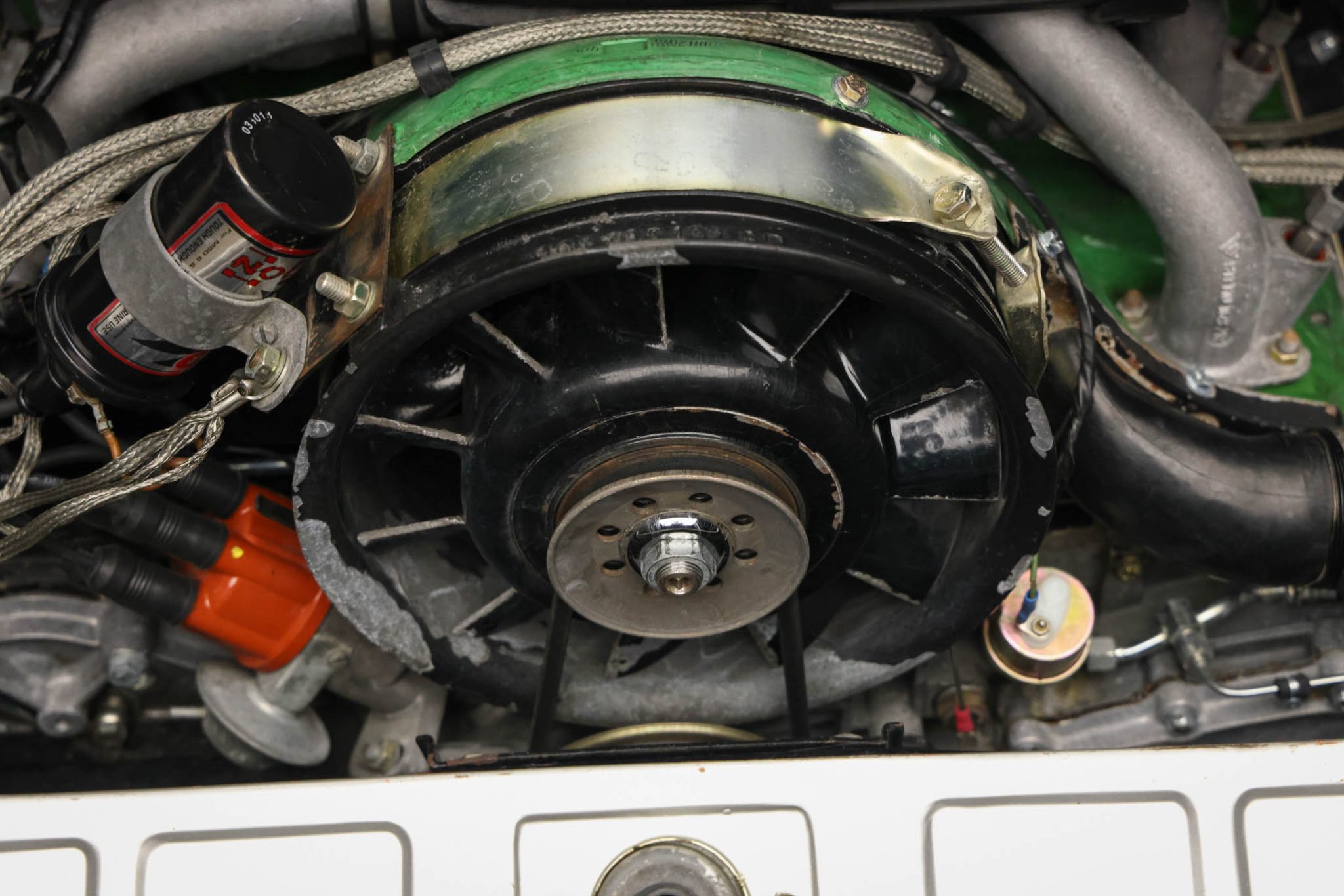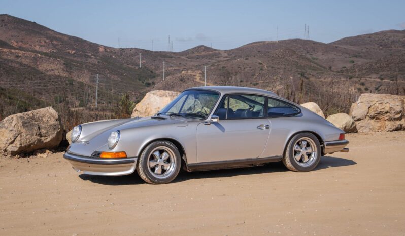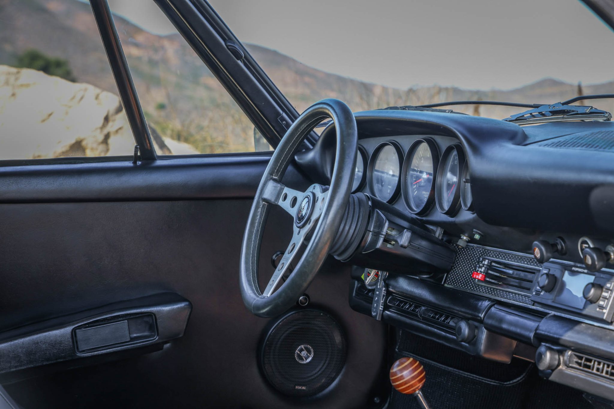 has been refinished in silver over black leather and corduroy. It is powered by a replacement flat-six equipped with fuel injection and linked with a five-speed 901 manual transaxle, and equipment includes a 911S-style front spoiler, H4 headlights, black window trim, polished 15″ Fuchs alloy wheels, aftermarket fixed-back bucket seats, a Porsche Classic radio with navigation, a 917-style shift knob, air conditioning, and a MOMO steering wheel.
