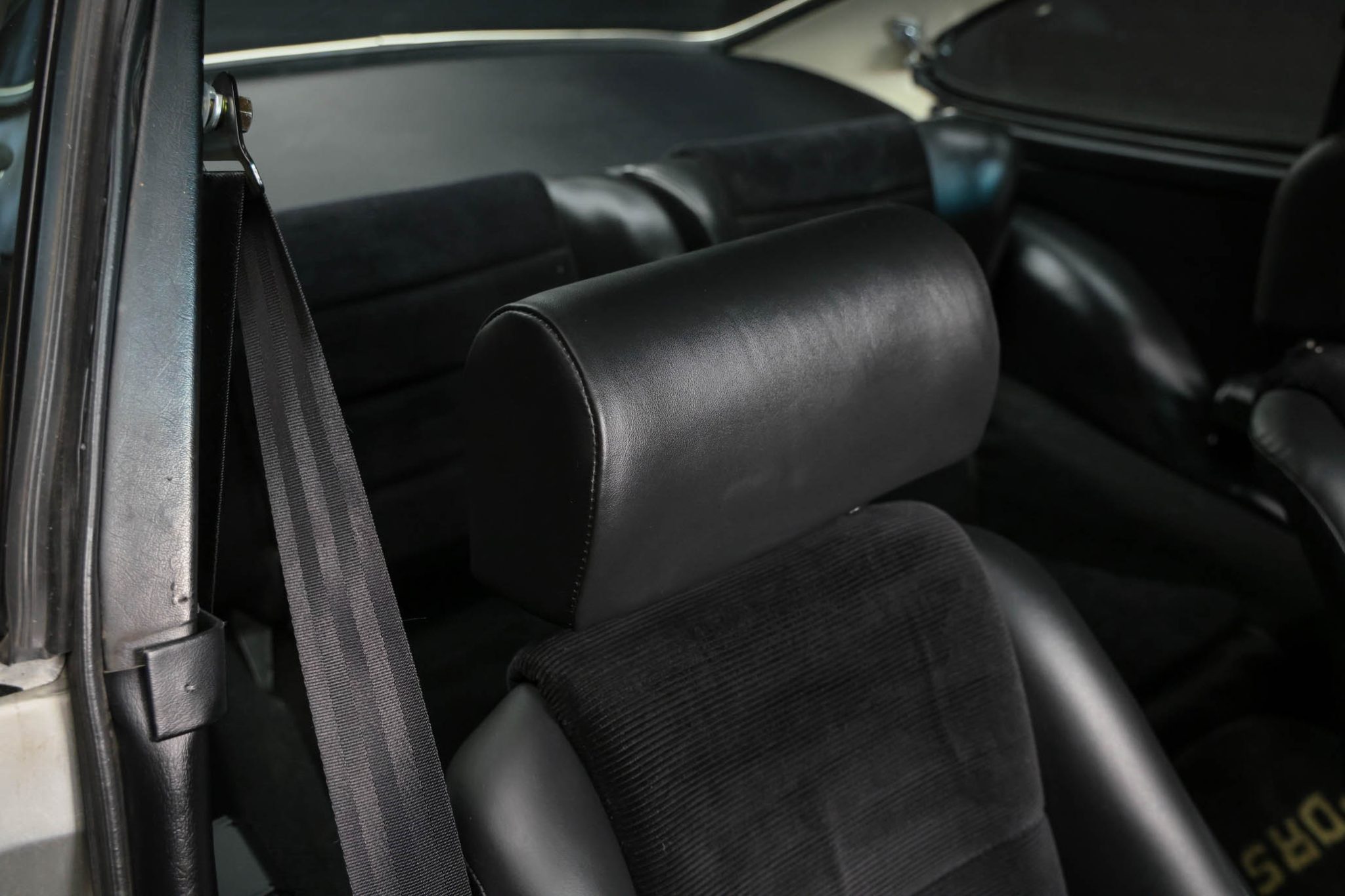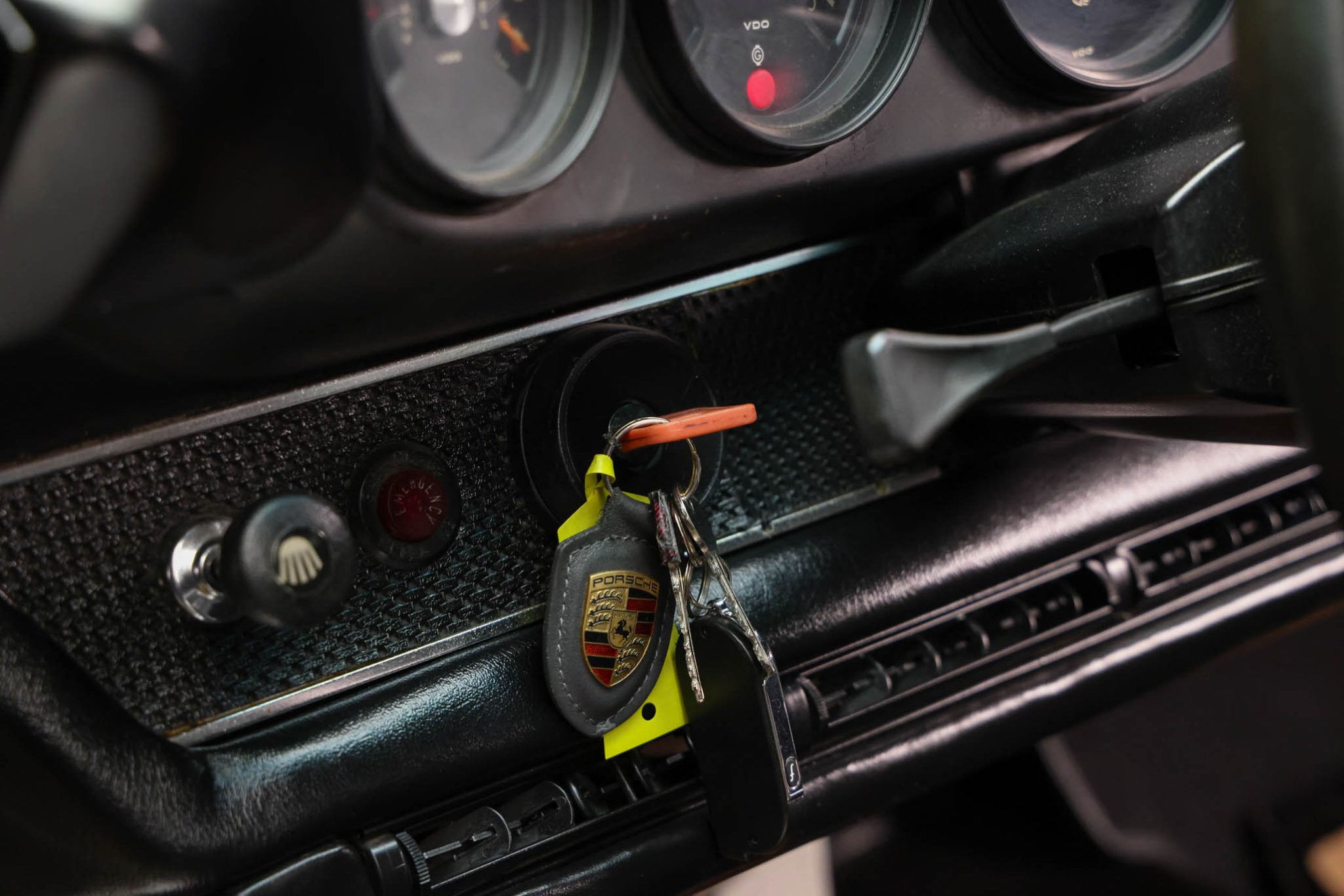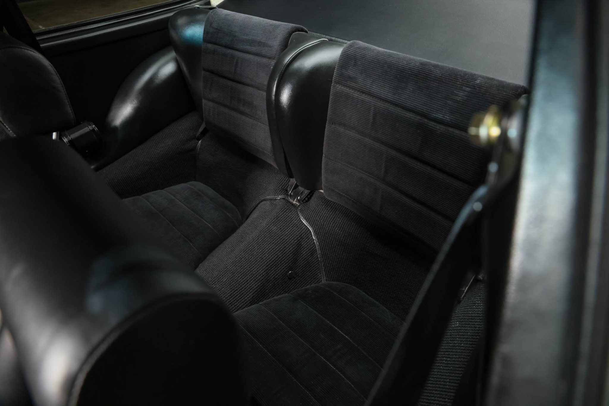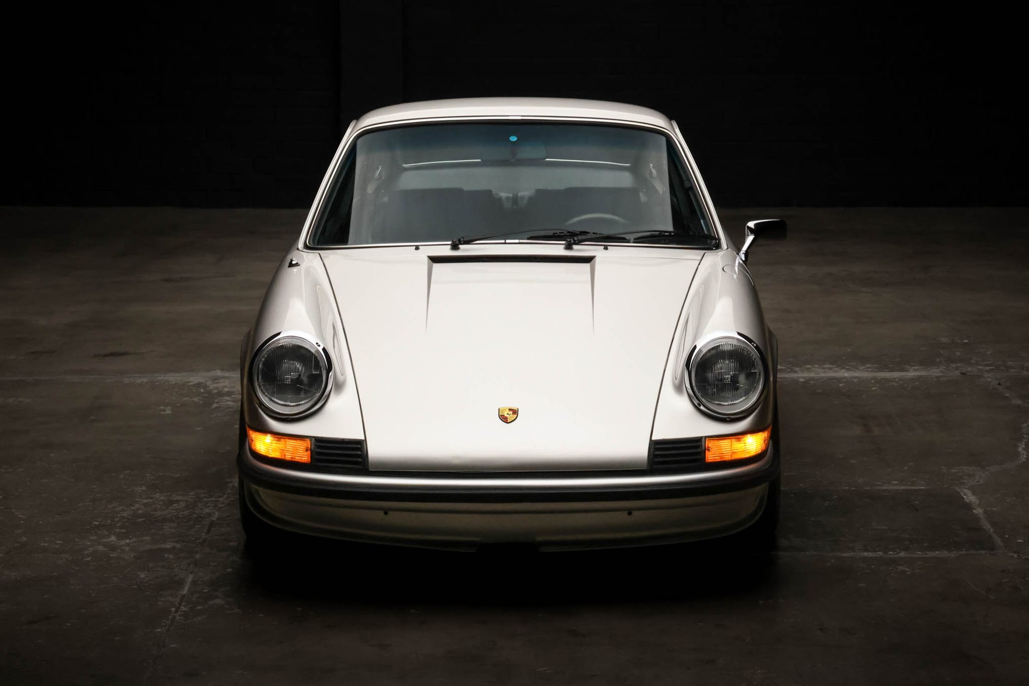 has been refinished in silver over black leather and corduroy. It is powered by a replacement flat-six equipped with fuel injection and linked with a five-speed 901 manual transaxle, and equipment includes a 911S-style front spoiler, H4 headlights, black window trim, polished 15″ Fuchs alloy wheels, aftermarket fixed-back bucket seats, a Porsche Classic radio with navigation, a 917-style shift knob, air conditioning, and a MOMO steering wheel.