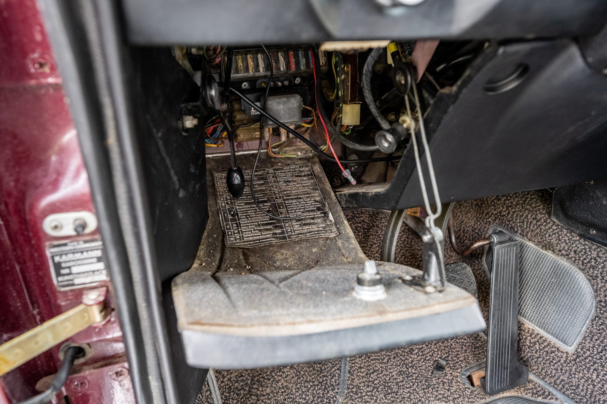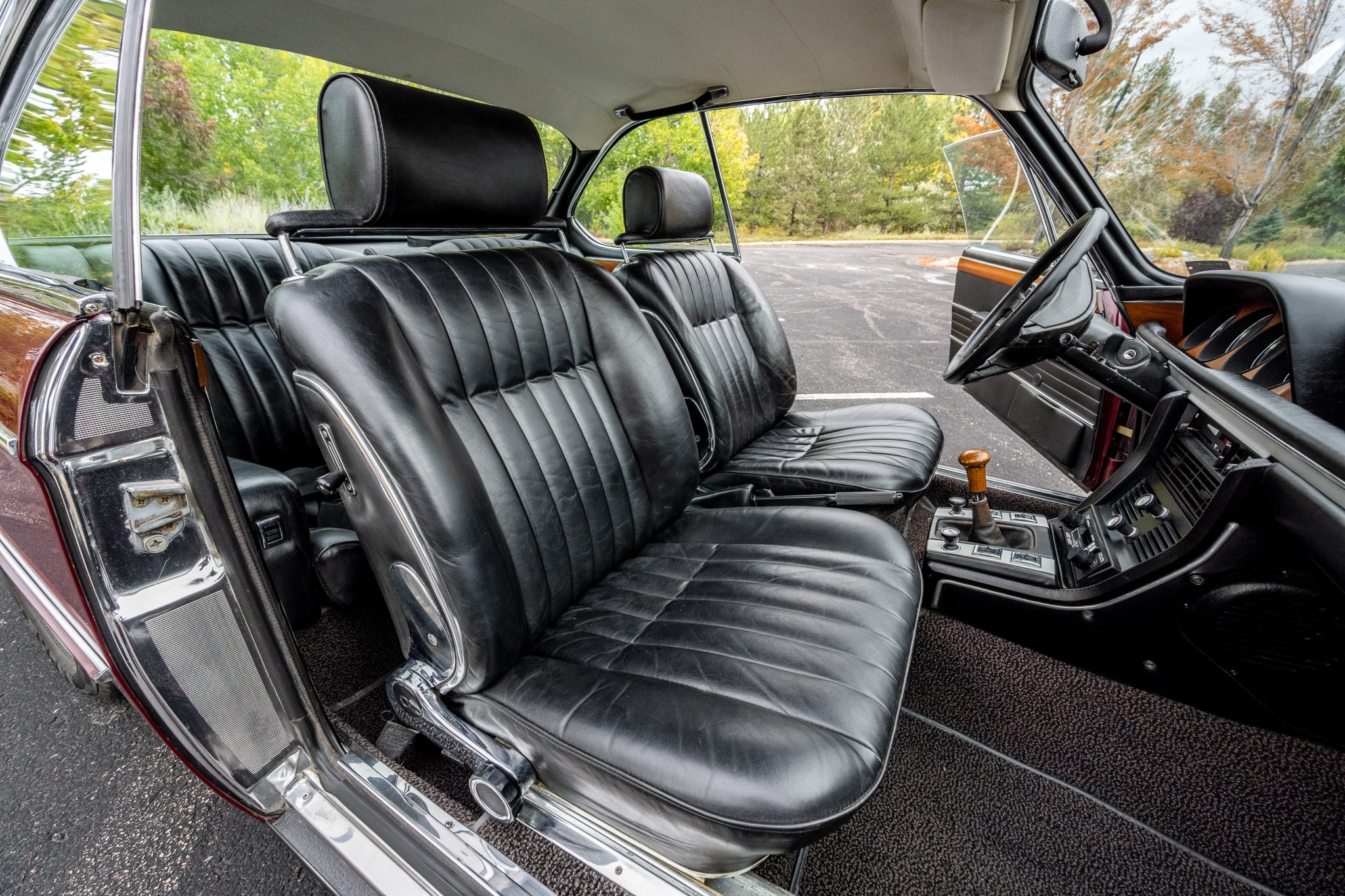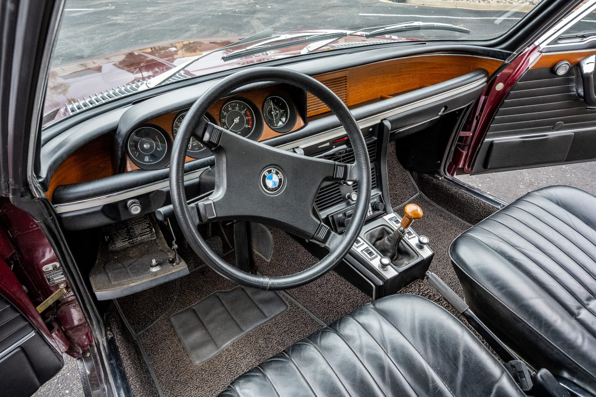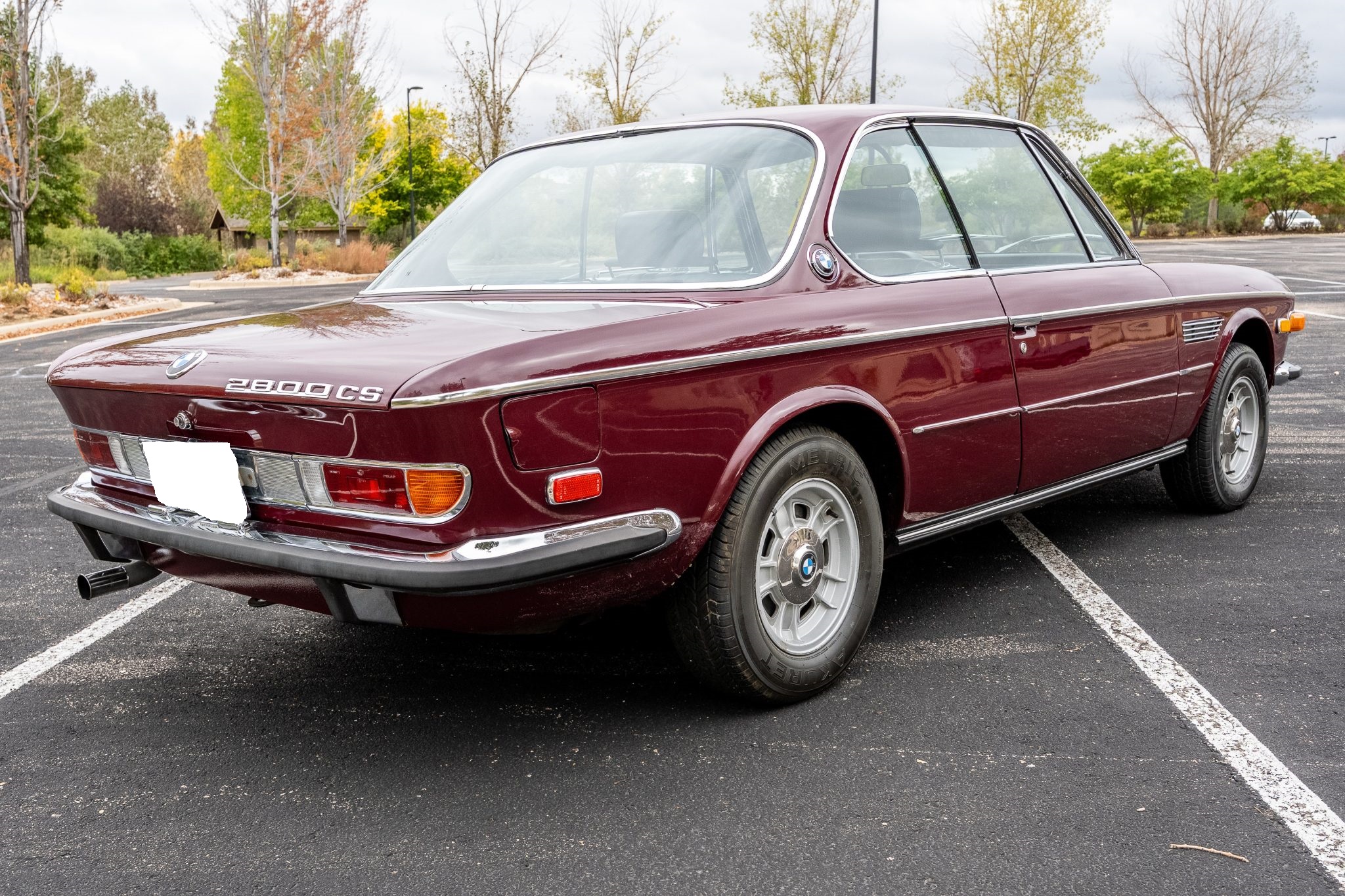 The car is finished in Malaga over black leather and is powered by a 2.8-liter inline-six linked with a four-speed manual transmission. Equipment includes 14″ light metal wheels, power-operated windows, and a cassette stereo.