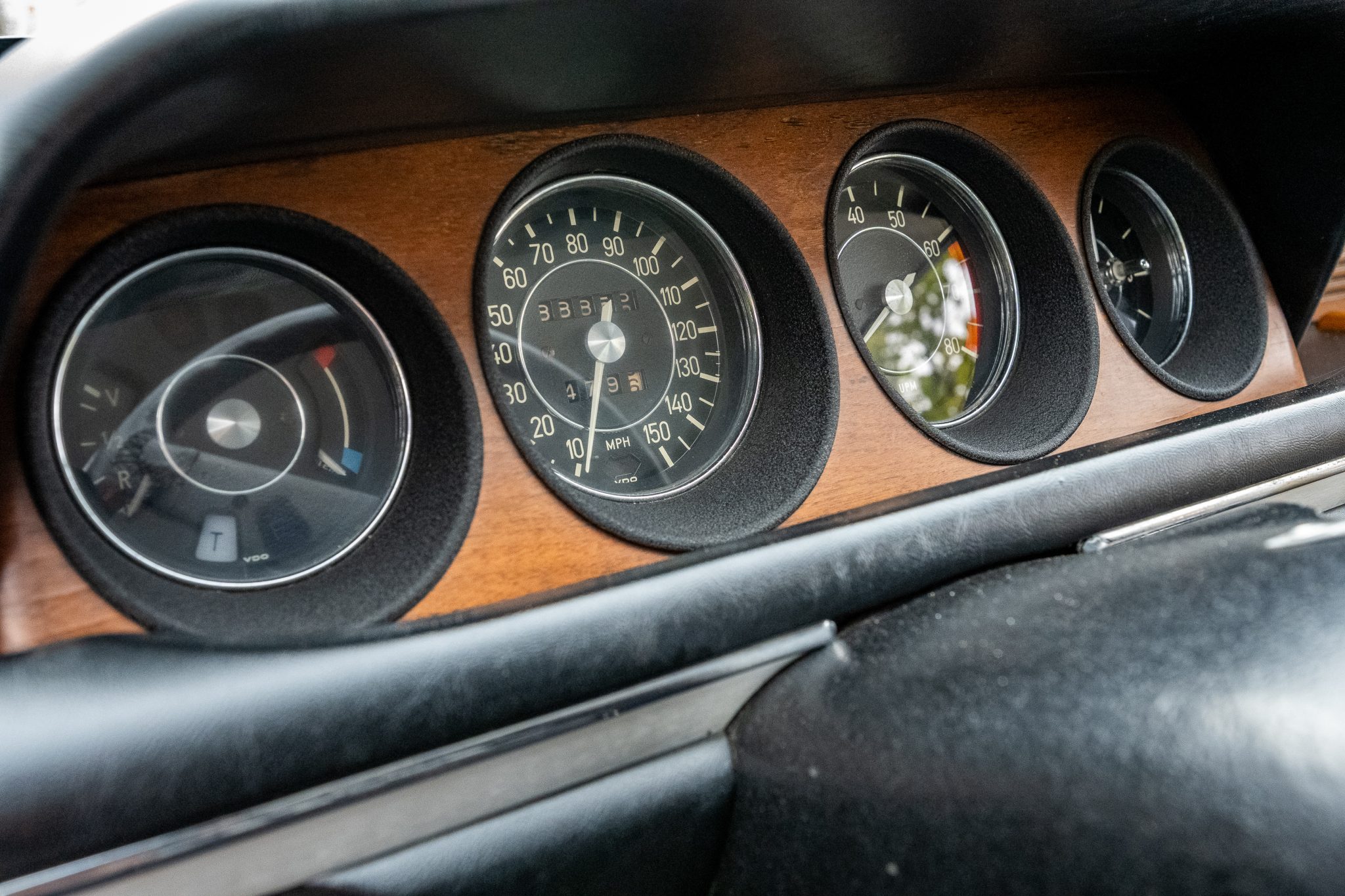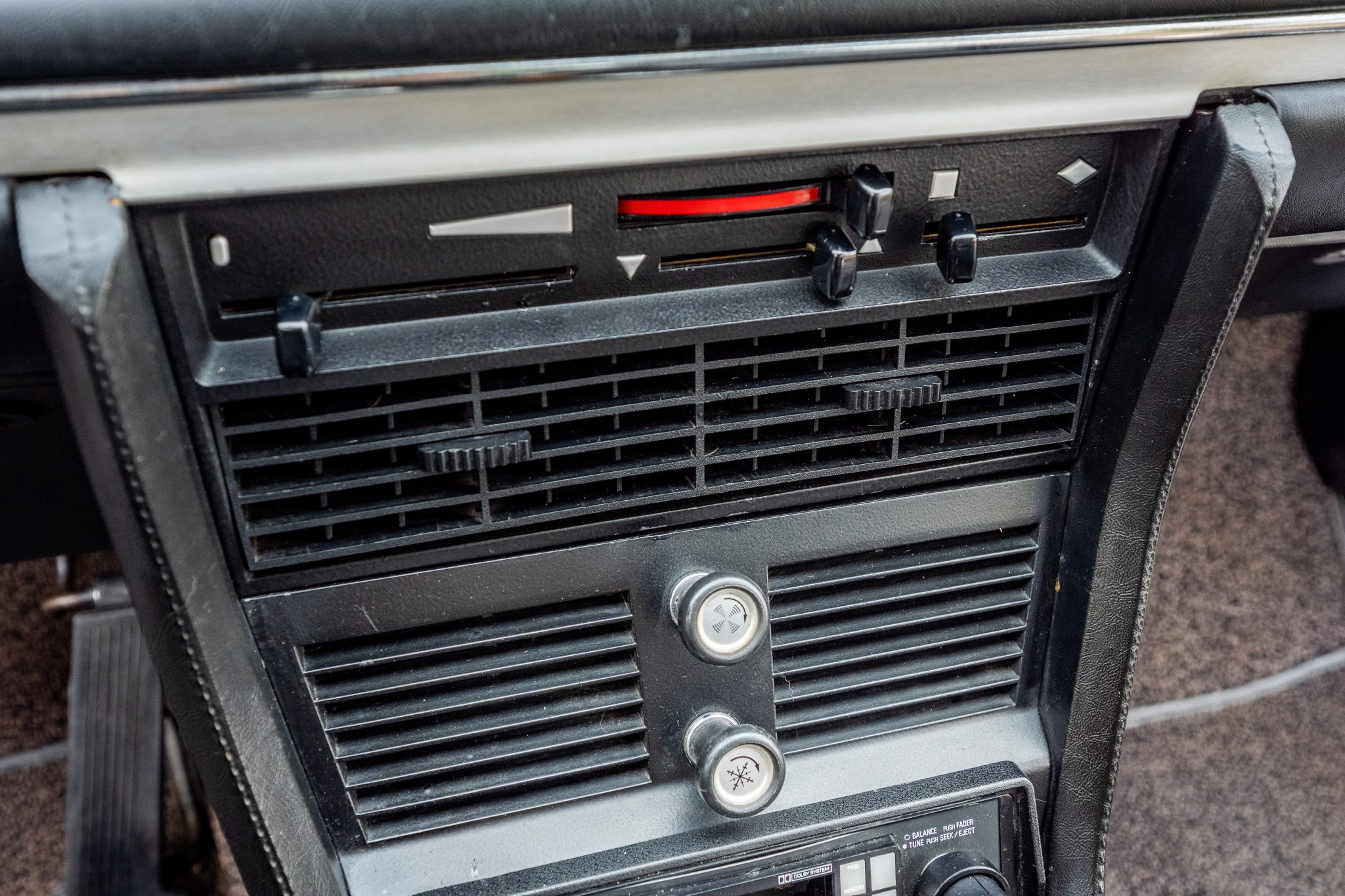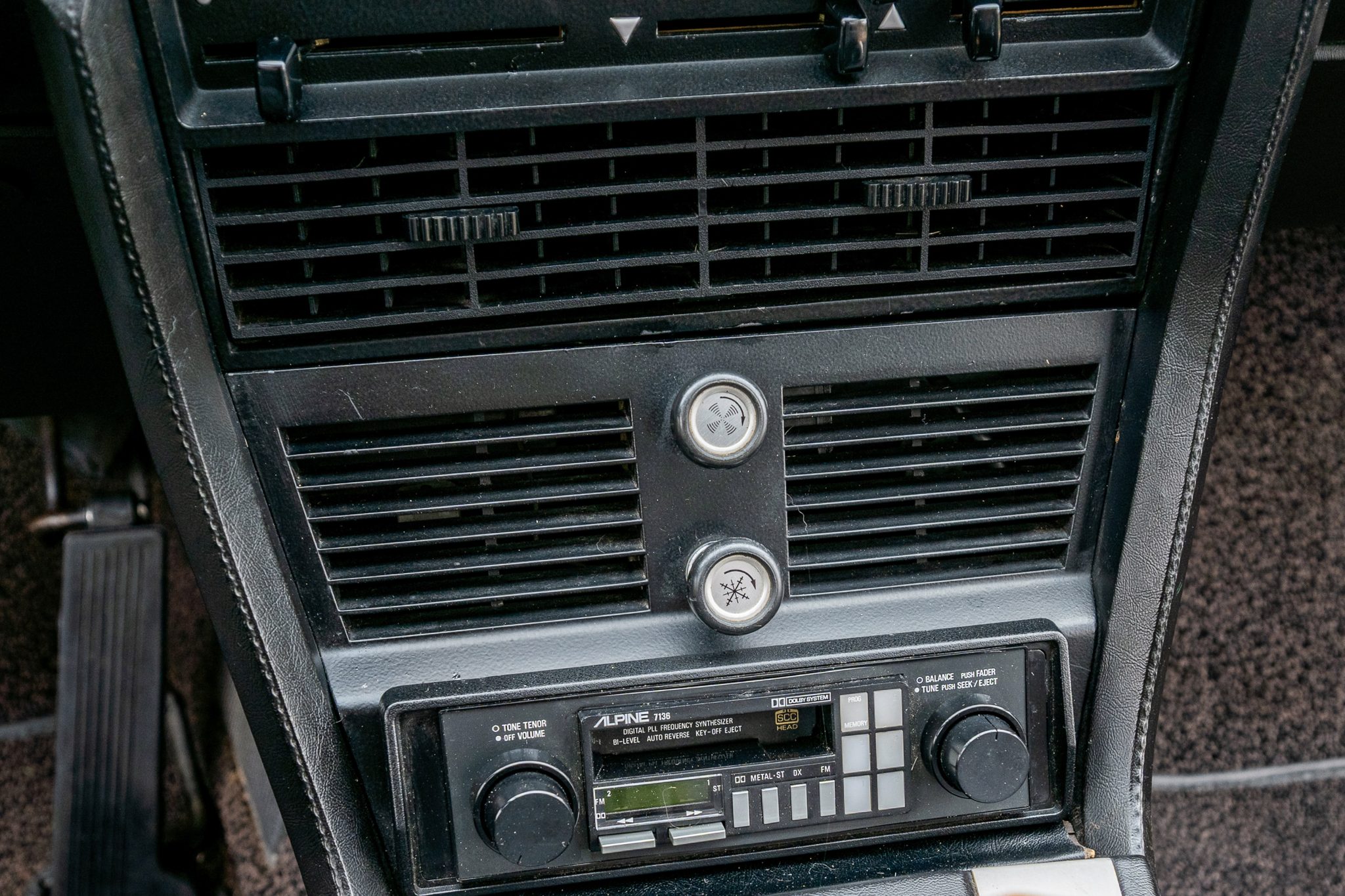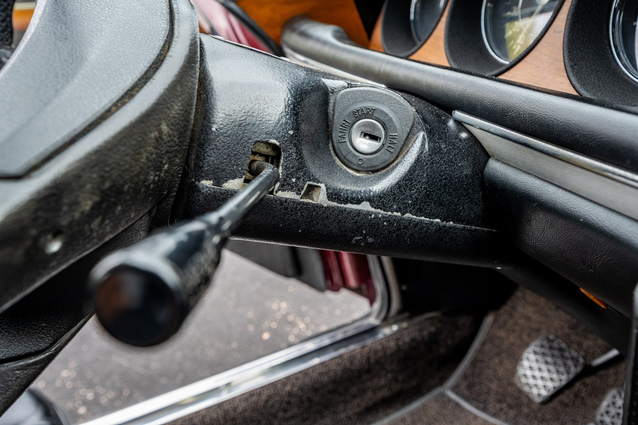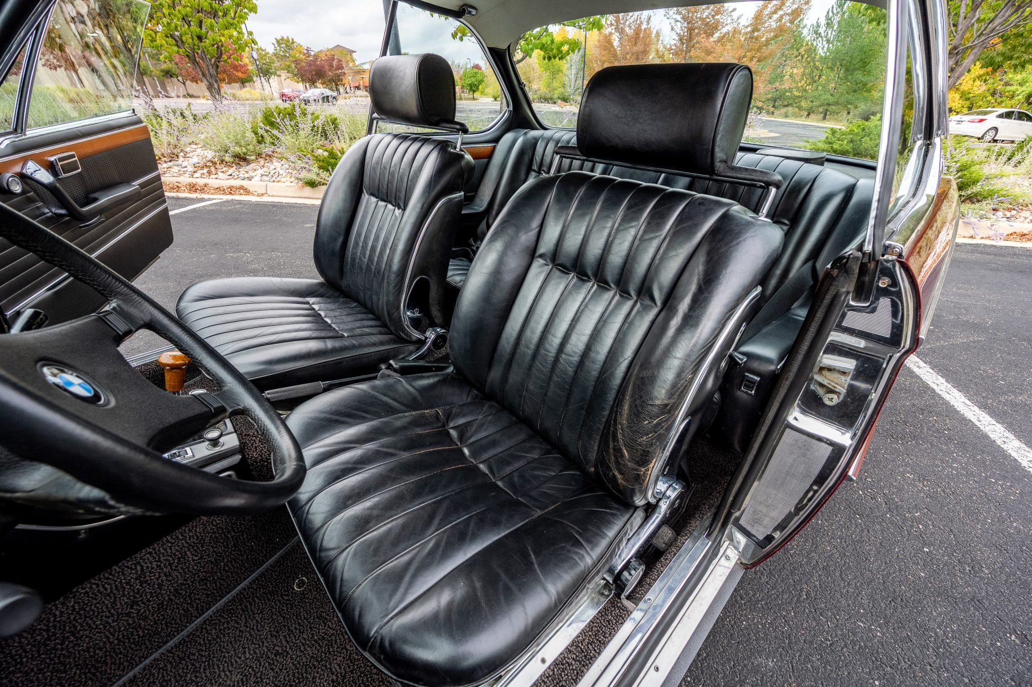 The car is finished in Malaga over black leather and is powered by a 2.8-liter inline-six linked with a four-speed manual transmission. Equipment includes 14″ light metal wheels, power-operated windows, and a cassette stereo.