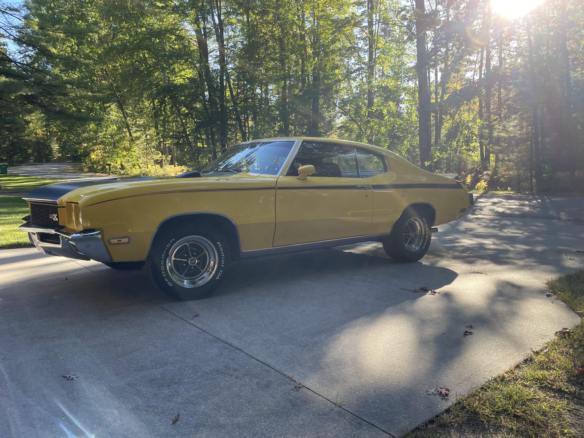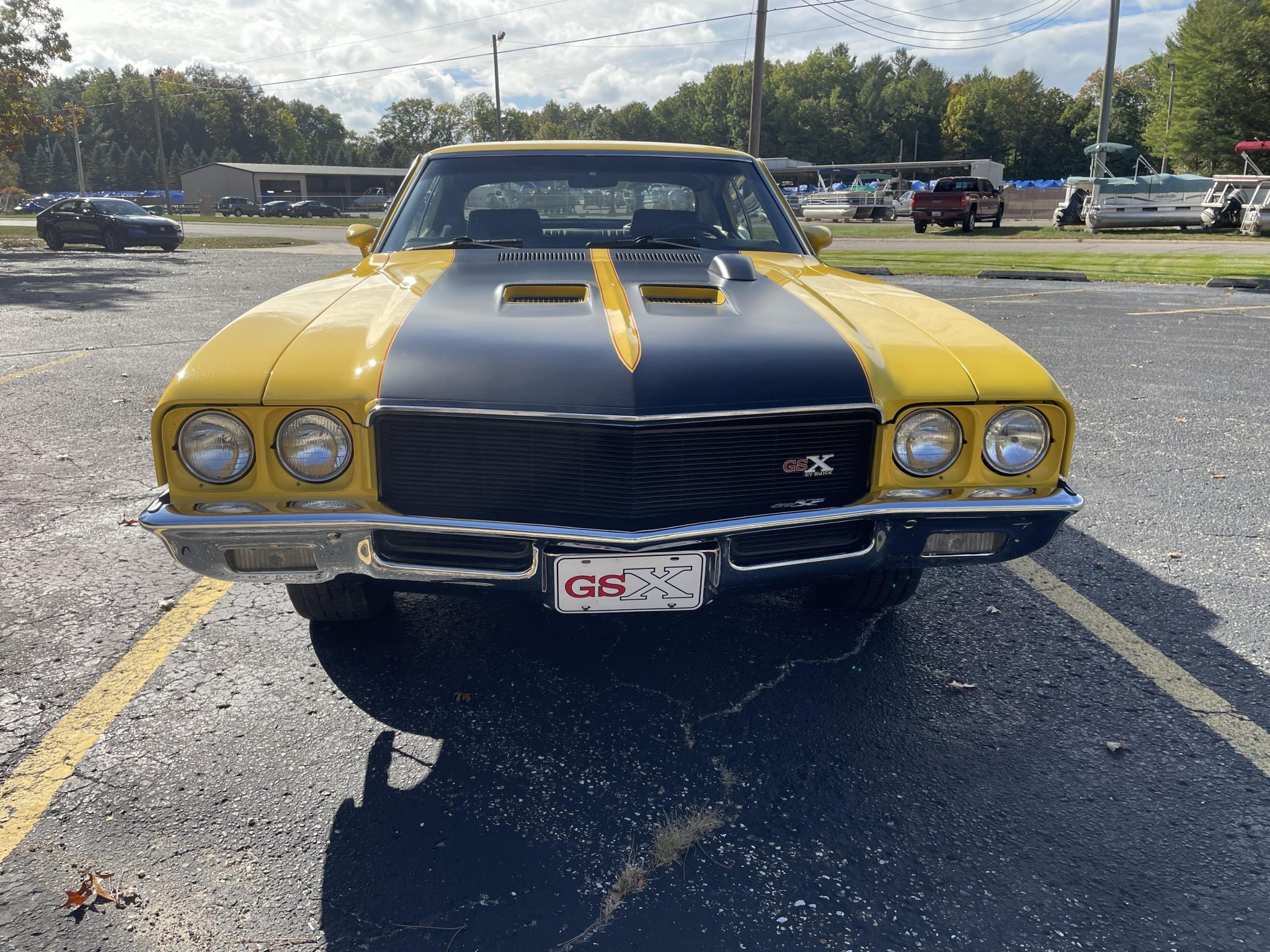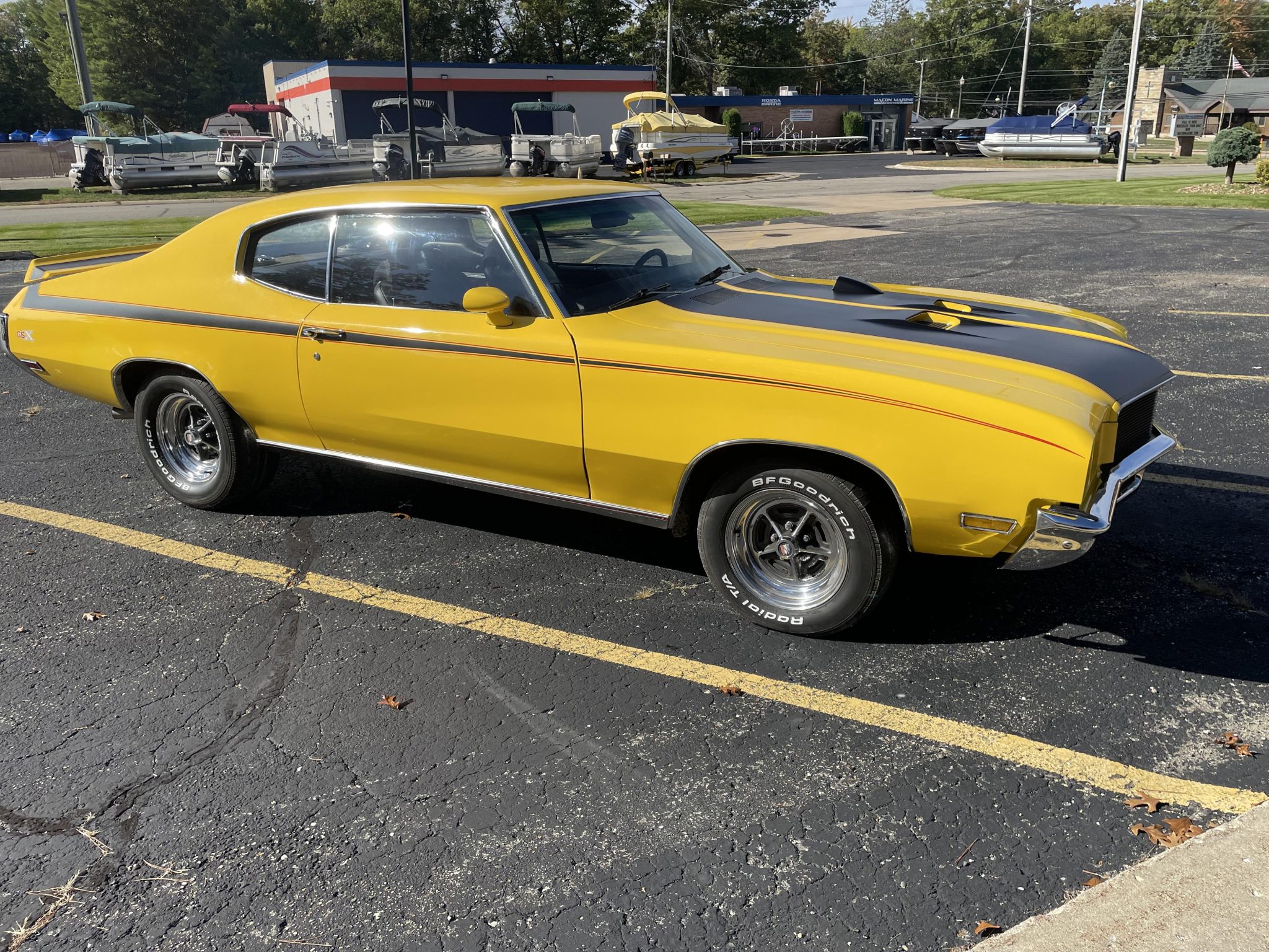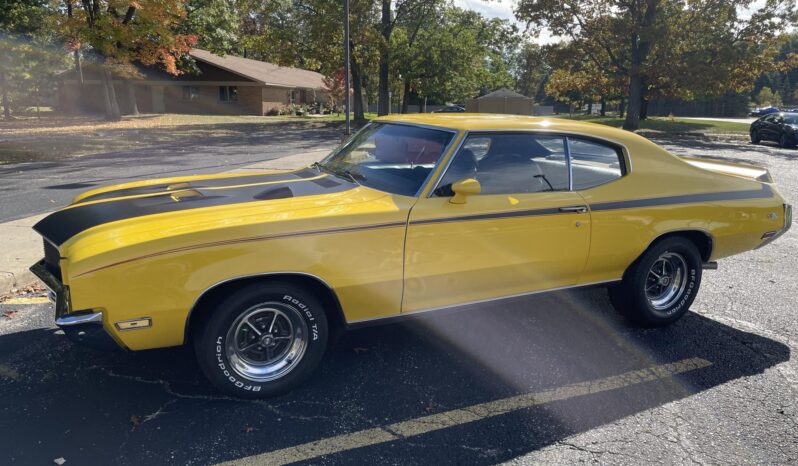 It is powered by a replacement 455ci V8 mated to a three-speed automatic transmission and a 12-bolt limited-slip rear axle, and the body is finished in yellow with black stripes. Equipment includes a hood-mounted tachometer, a raised rear wing, long-tube headers, 15″ Rallye-style wheels, power steering, and a dual exhaust system. The cabin is trimmed in black vinyl and features front bucket seats, a horseshoe-style shifter, a Pioneer stereo, and a center console.