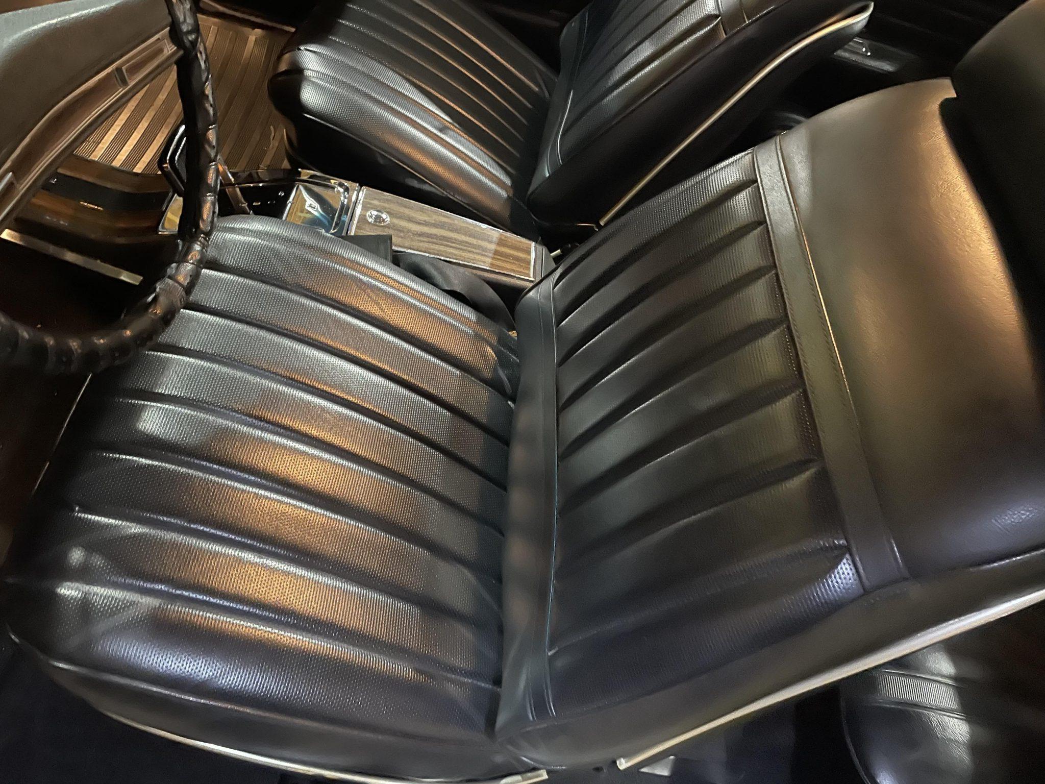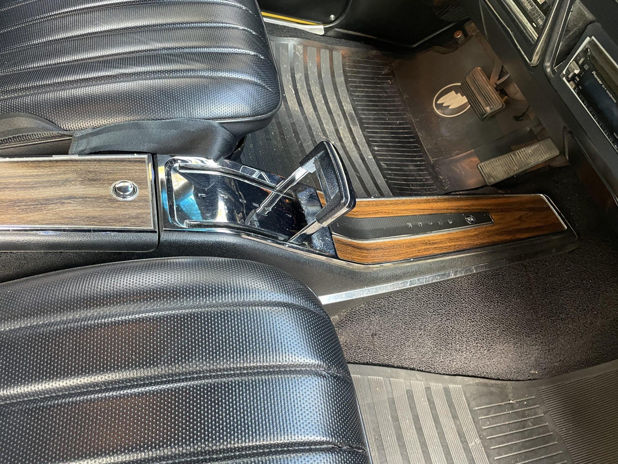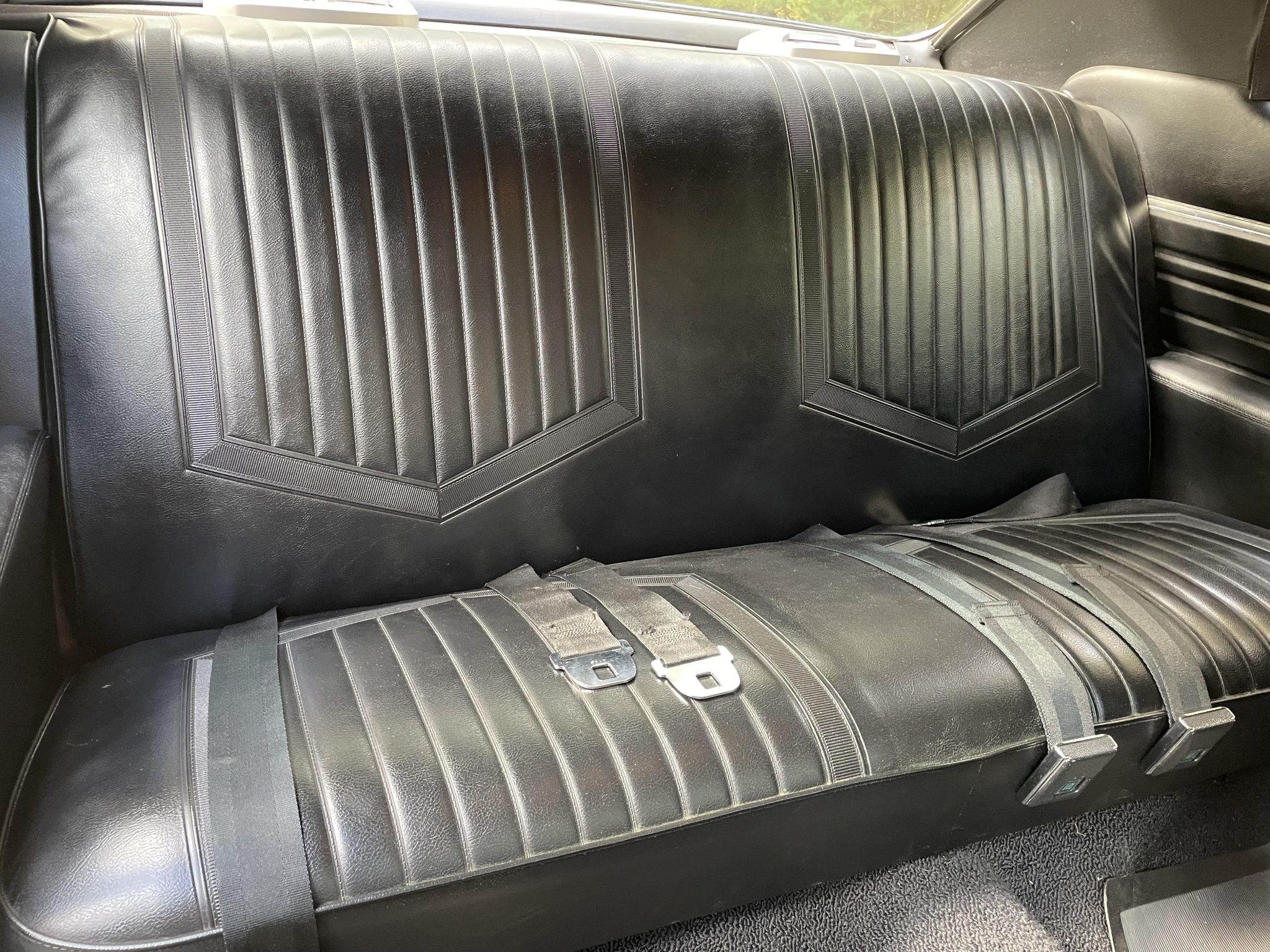 It is powered by a replacement 455ci V8 mated to a three-speed automatic transmission and a 12-bolt limited-slip rear axle, and the body is finished in yellow with black stripes. Equipment includes a hood-mounted tachometer, a raised rear wing, long-tube headers, 15″ Rallye-style wheels, power steering, and a dual exhaust system. The cabin is trimmed in black vinyl and features front bucket seats, a horseshoe-style shifter, a Pioneer stereo, and a center console.