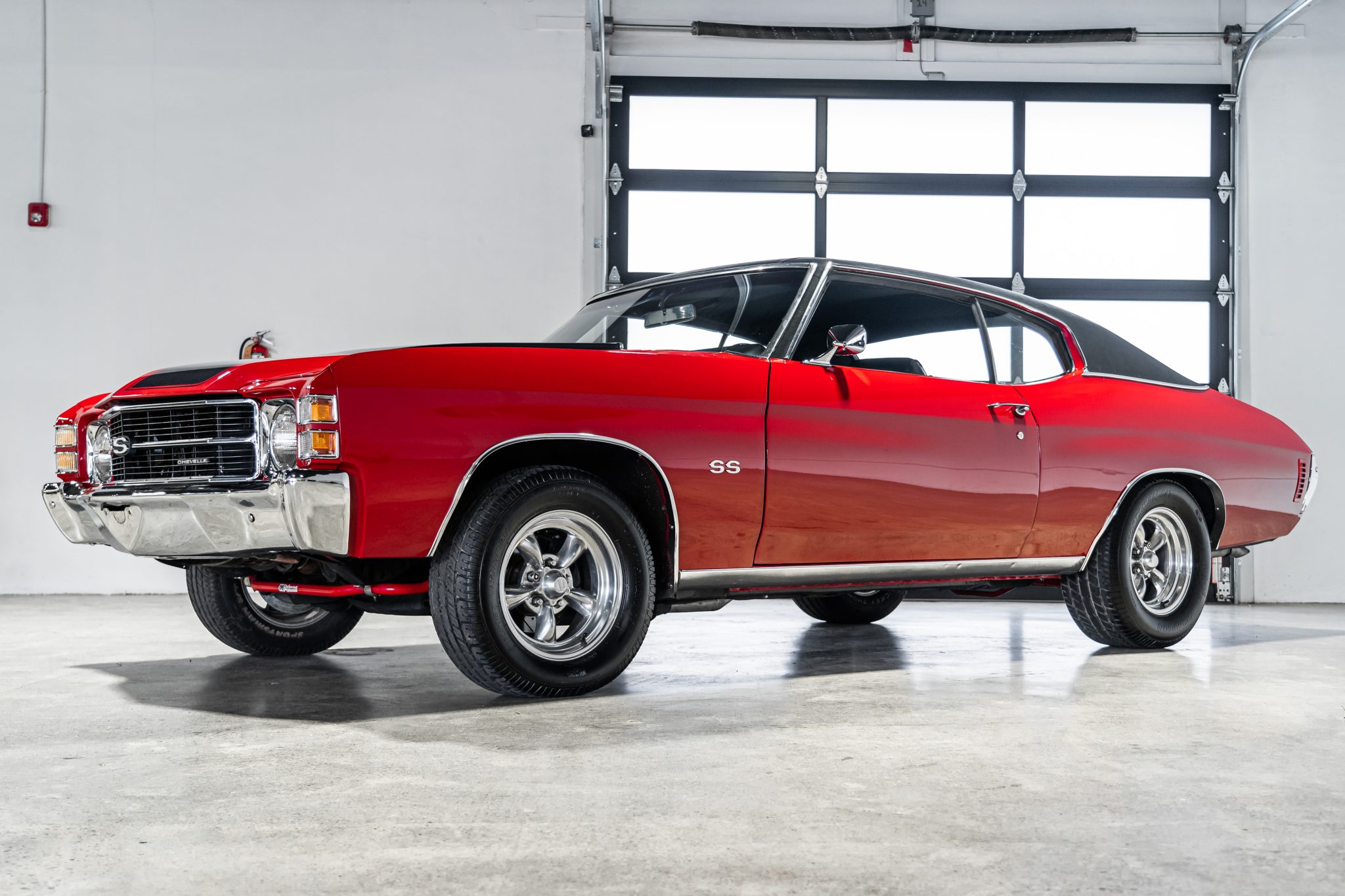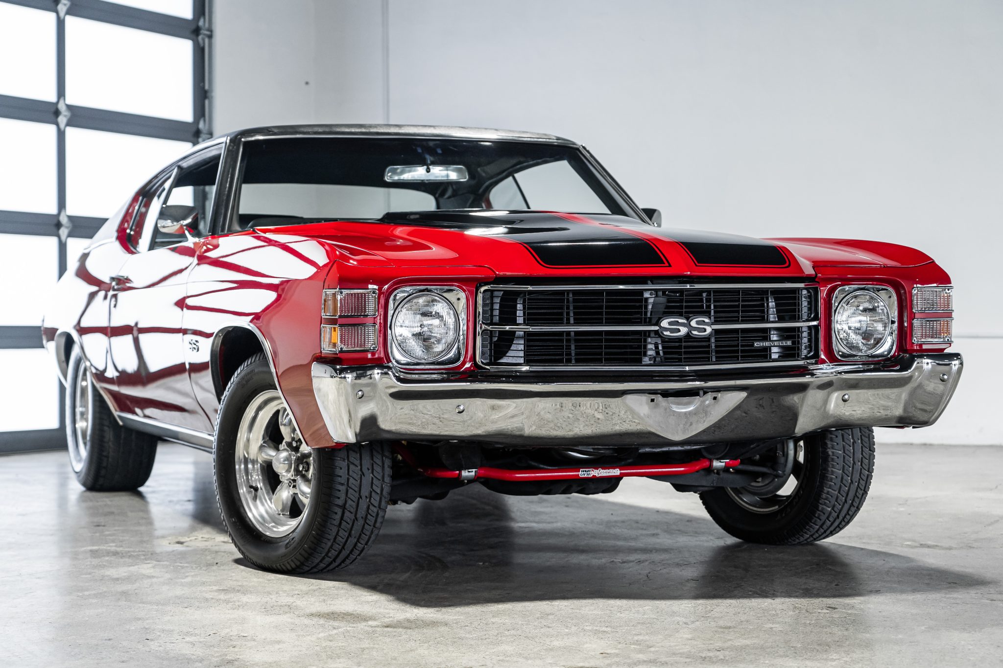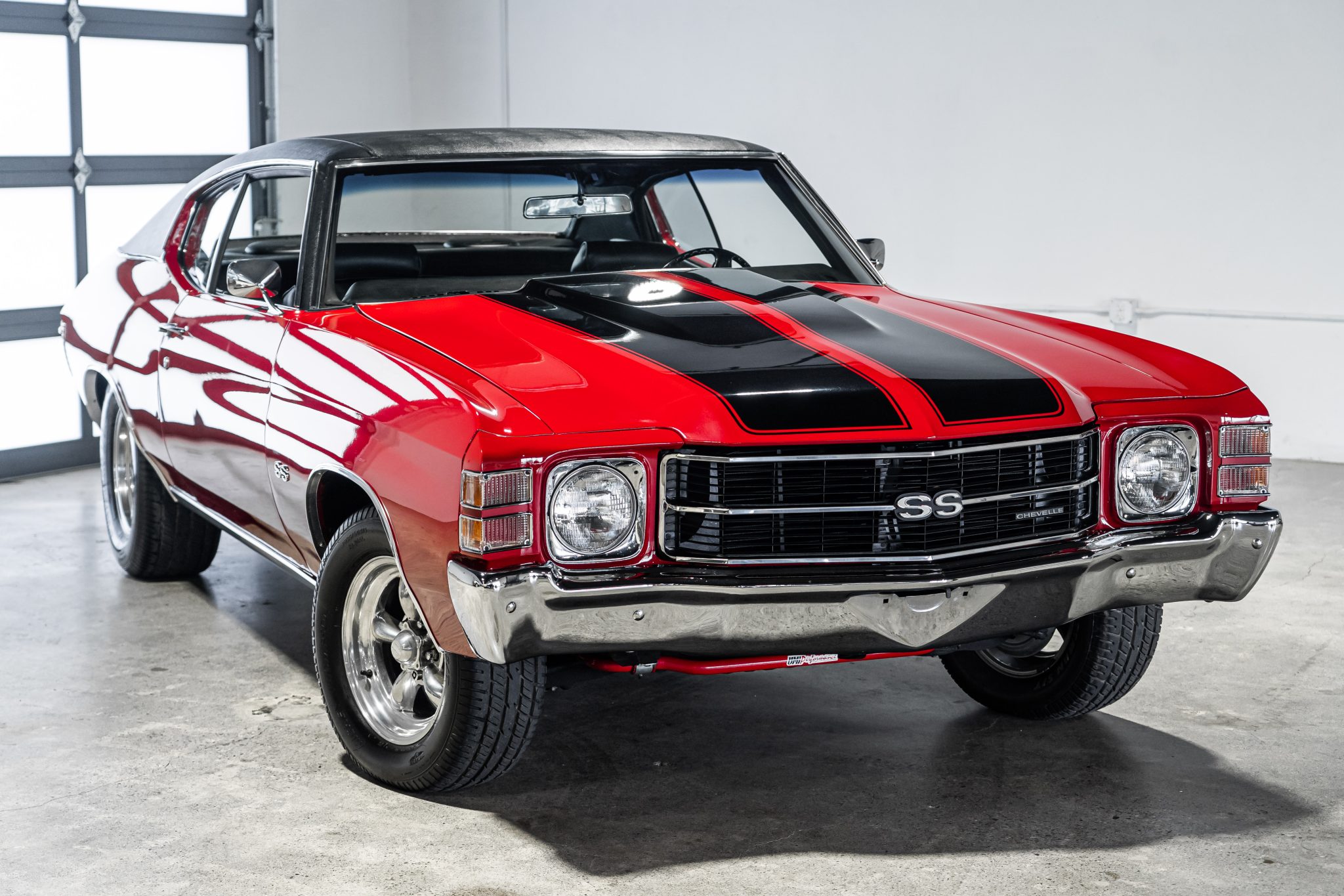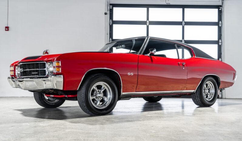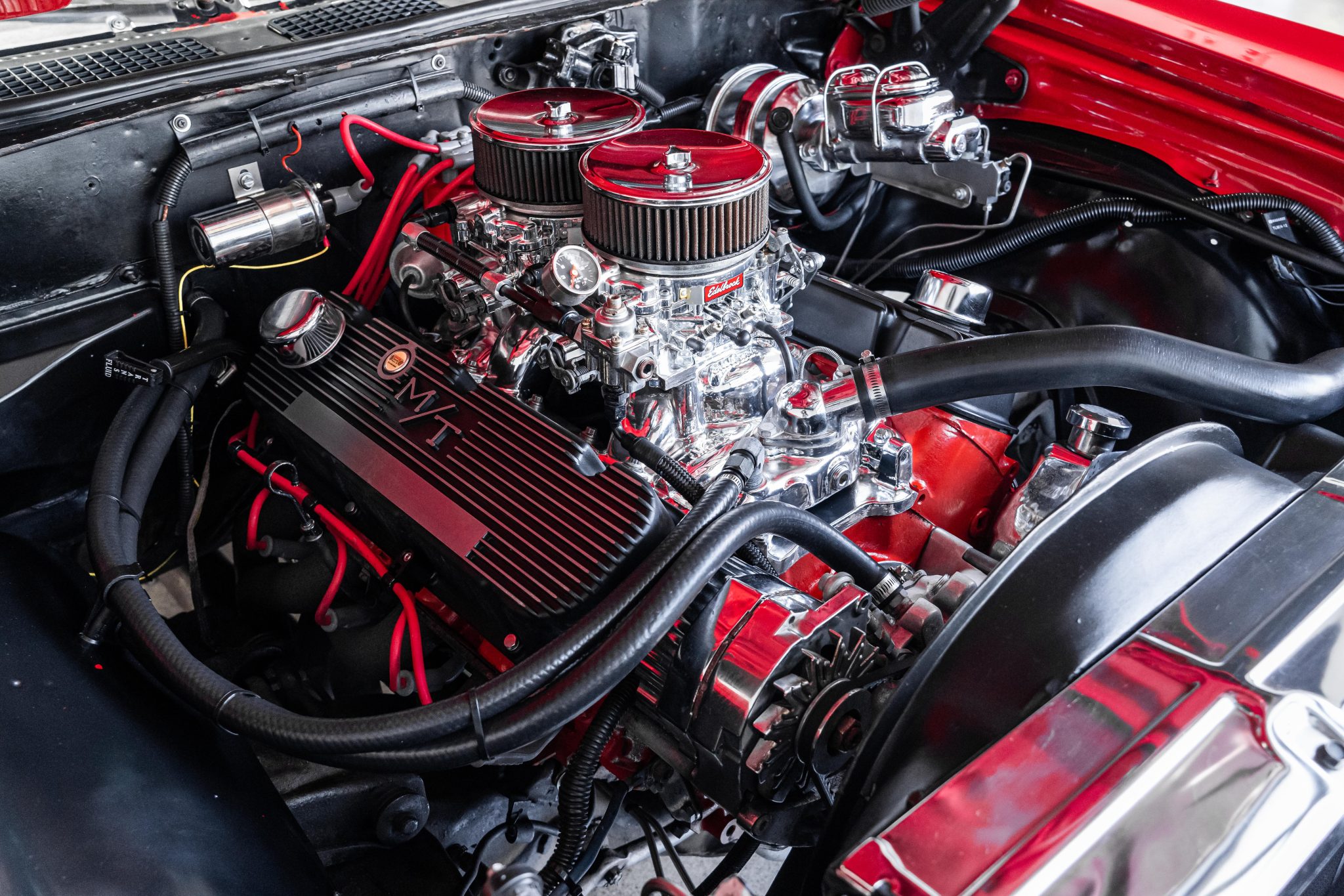 This 1971 Chevrolet Chevelle Malibu sport coupe was refurbished and it is powered by a 396ci V8 with dual Edelbrock four-barrel carburetors. A replacement TH350 three-speed automatic is linked with a 12-bolt rear axle, and additional equipment includes Hooker Competition headers, UMI sway bars, Bilstein shocks, power steering, 15″ Torq Thrust wheels, and power-assisted front disc brakes. The red body is complemented by a black vinyl roof and rally stripes, and the cabin is outfitted with black upholstery, bench seats, a B&M shifter, a cassette deck, and aftermarket gauges.