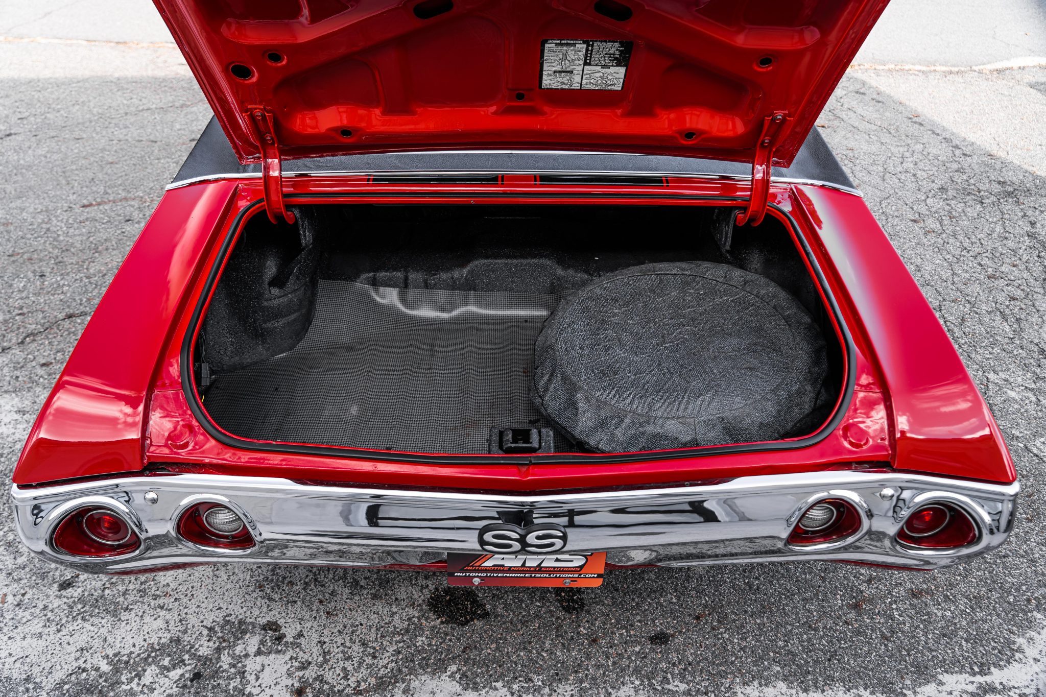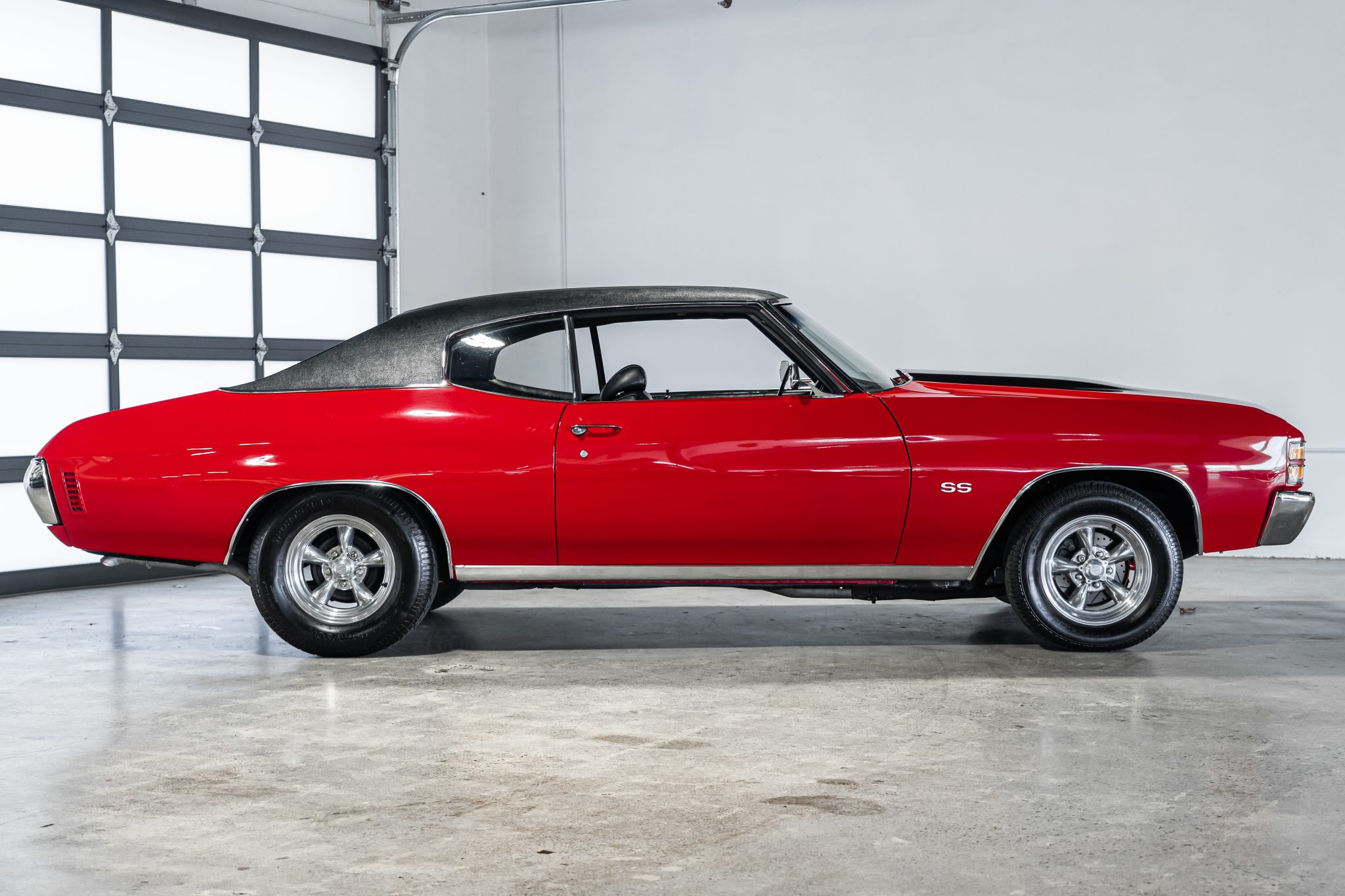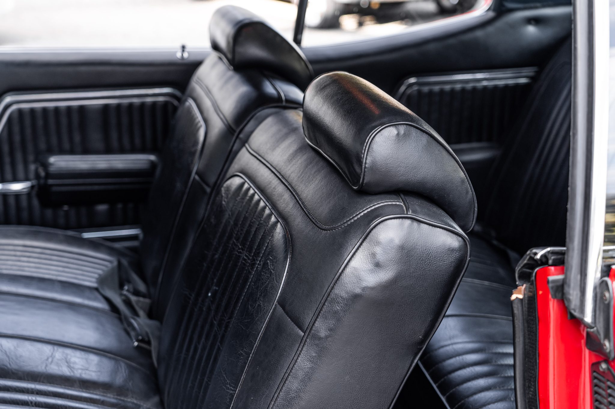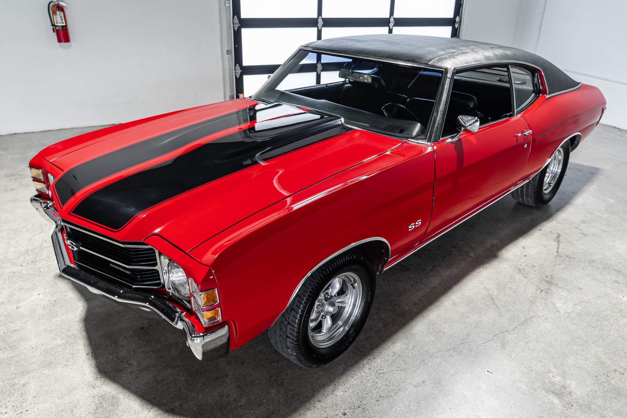 This 1971 Chevrolet Chevelle Malibu sport coupe was refurbished and it is powered by a 396ci V8 with dual Edelbrock four-barrel carburetors. A replacement TH350 three-speed automatic is linked with a 12-bolt rear axle, and additional equipment includes Hooker Competition headers, UMI sway bars, Bilstein shocks, power steering, 15″ Torq Thrust wheels, and power-assisted front disc brakes. The red body is complemented by a black vinyl roof and rally stripes, and the cabin is outfitted with black upholstery, bench seats, a B&M shifter, a cassette deck, and aftermarket gauges.