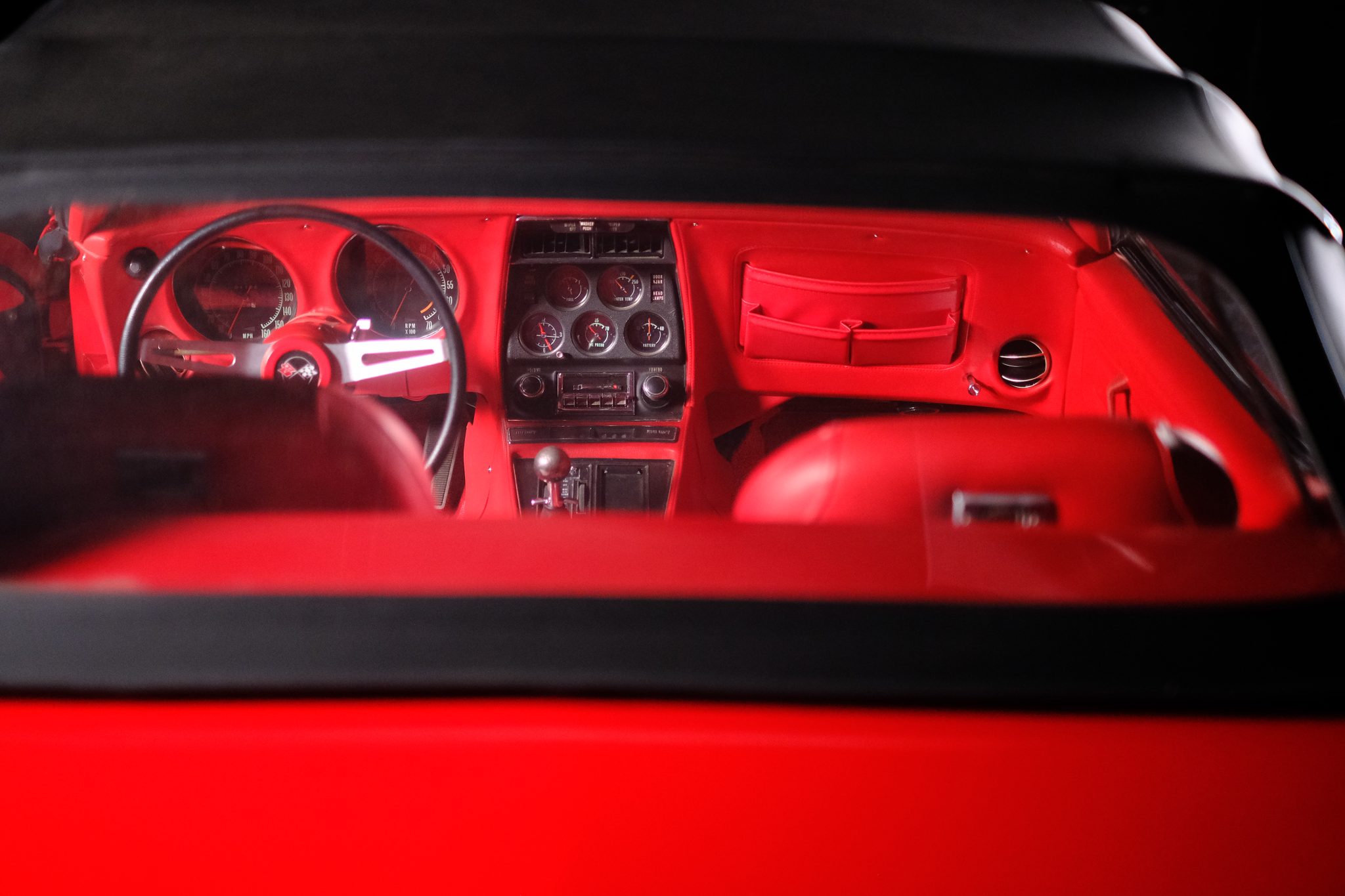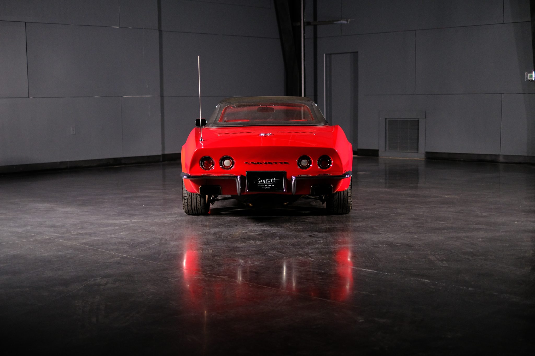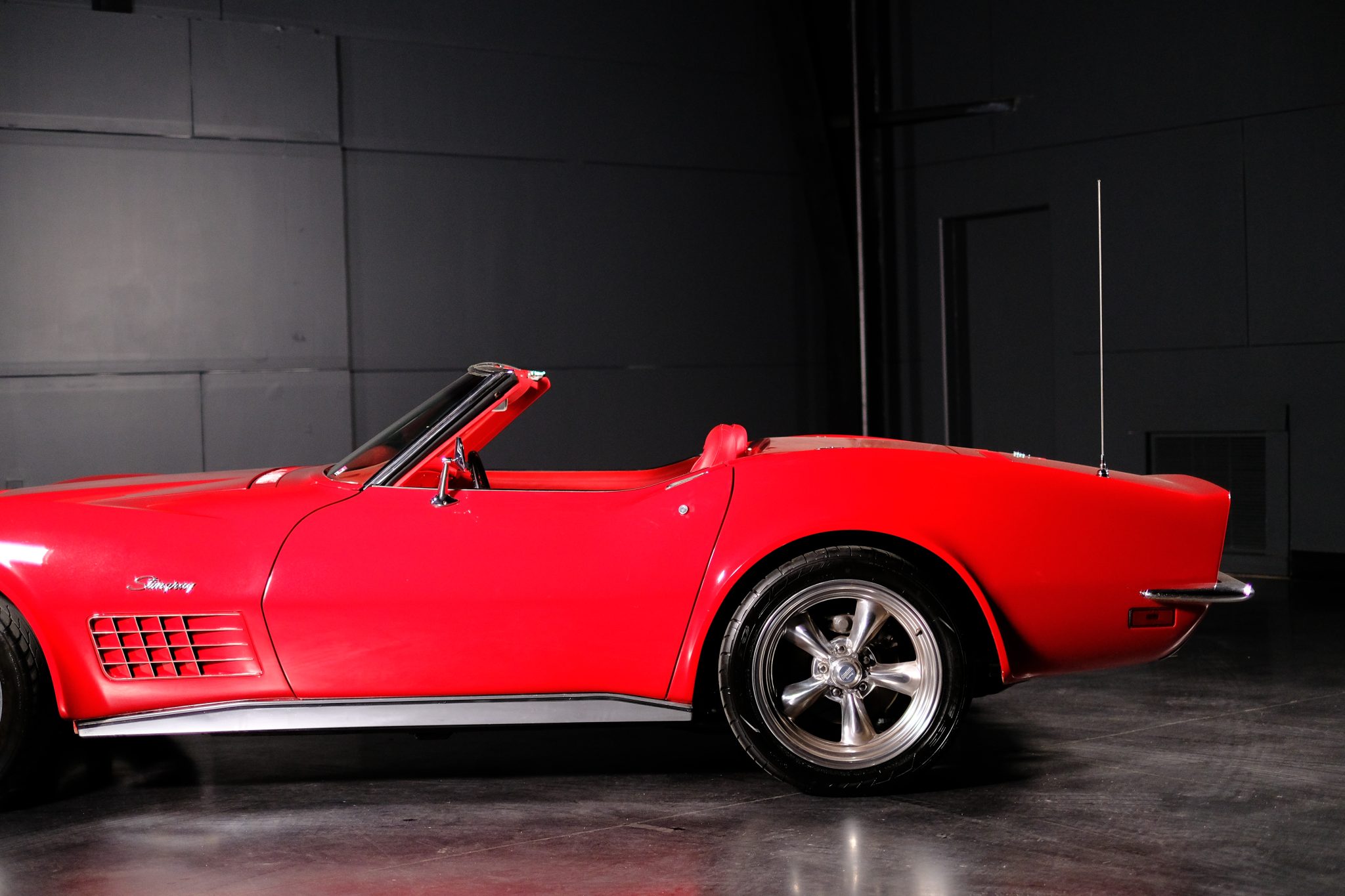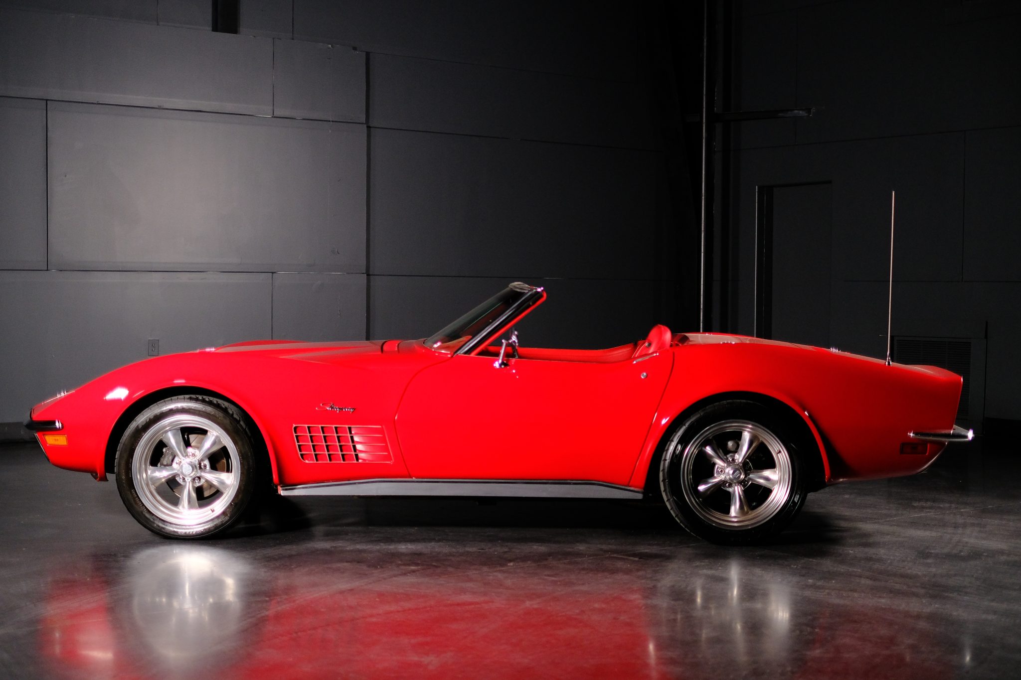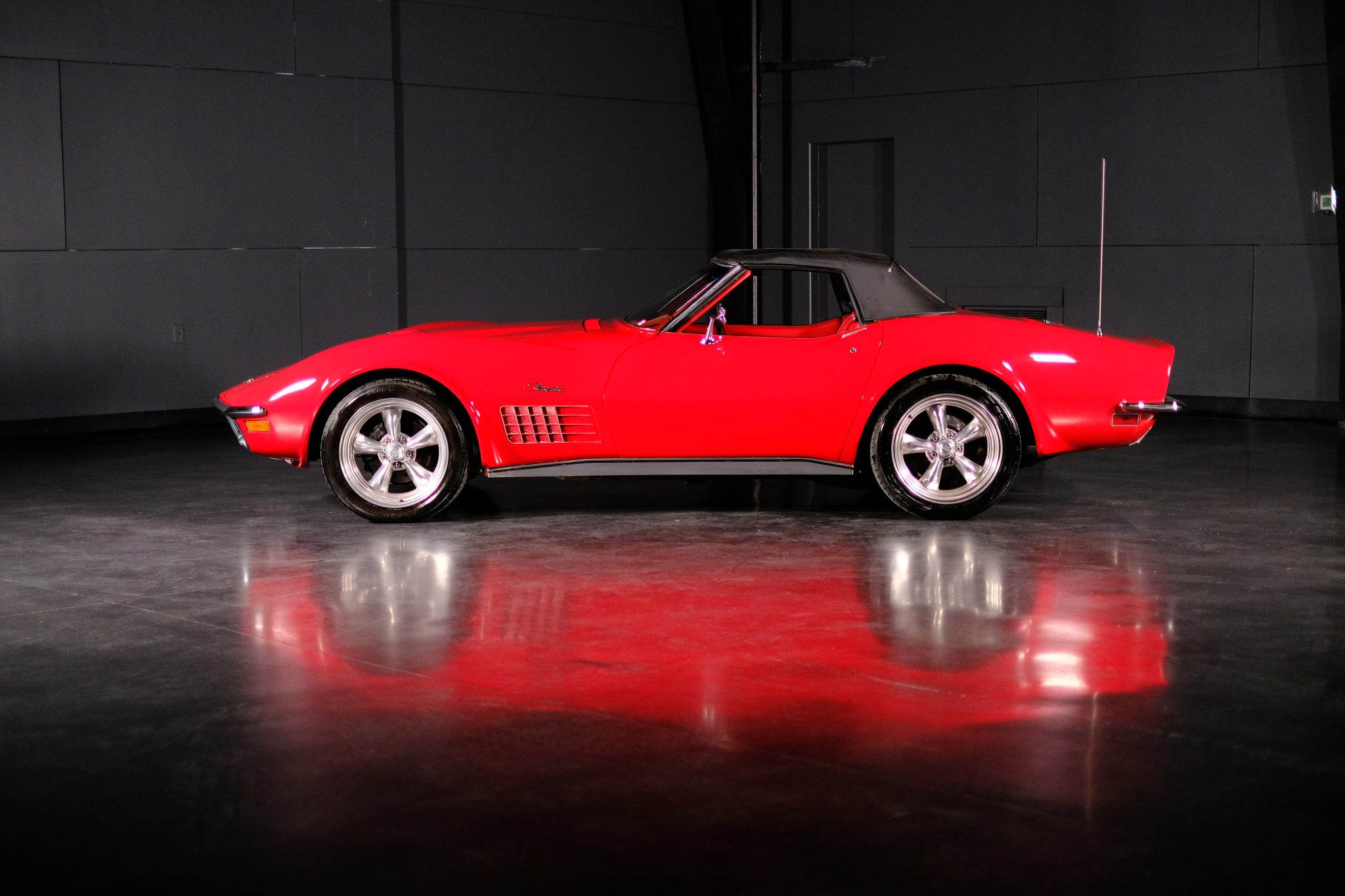 This 1971 Chevrolet Corvette convertible was refurbished and is powered by a 350ci V8 fitted with electronic fuel injection and aluminum cylinder heads. The car is refinished in red over red and further equipped with a four-speed manual transmission, a Positraction limited-slip differential, a black convertible top, 18″ American Racing wheels, disc brakes, power steering, retractable headlights, air conditioning, power windows, and an AM/FM stereo.