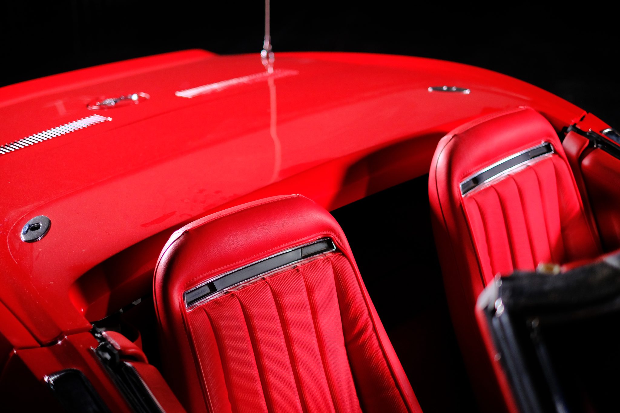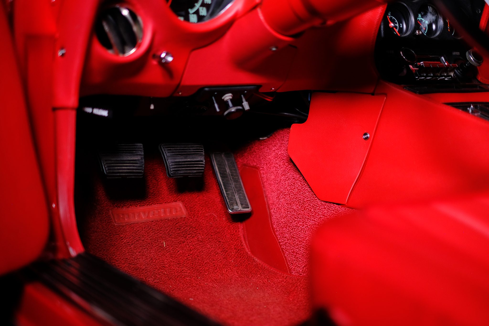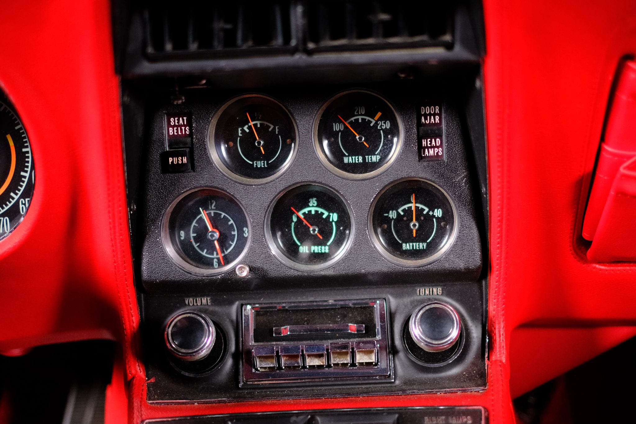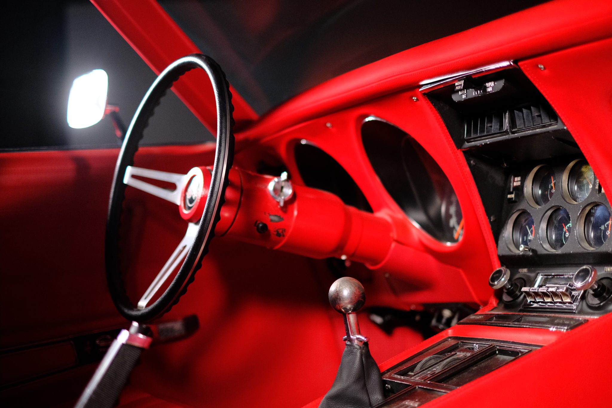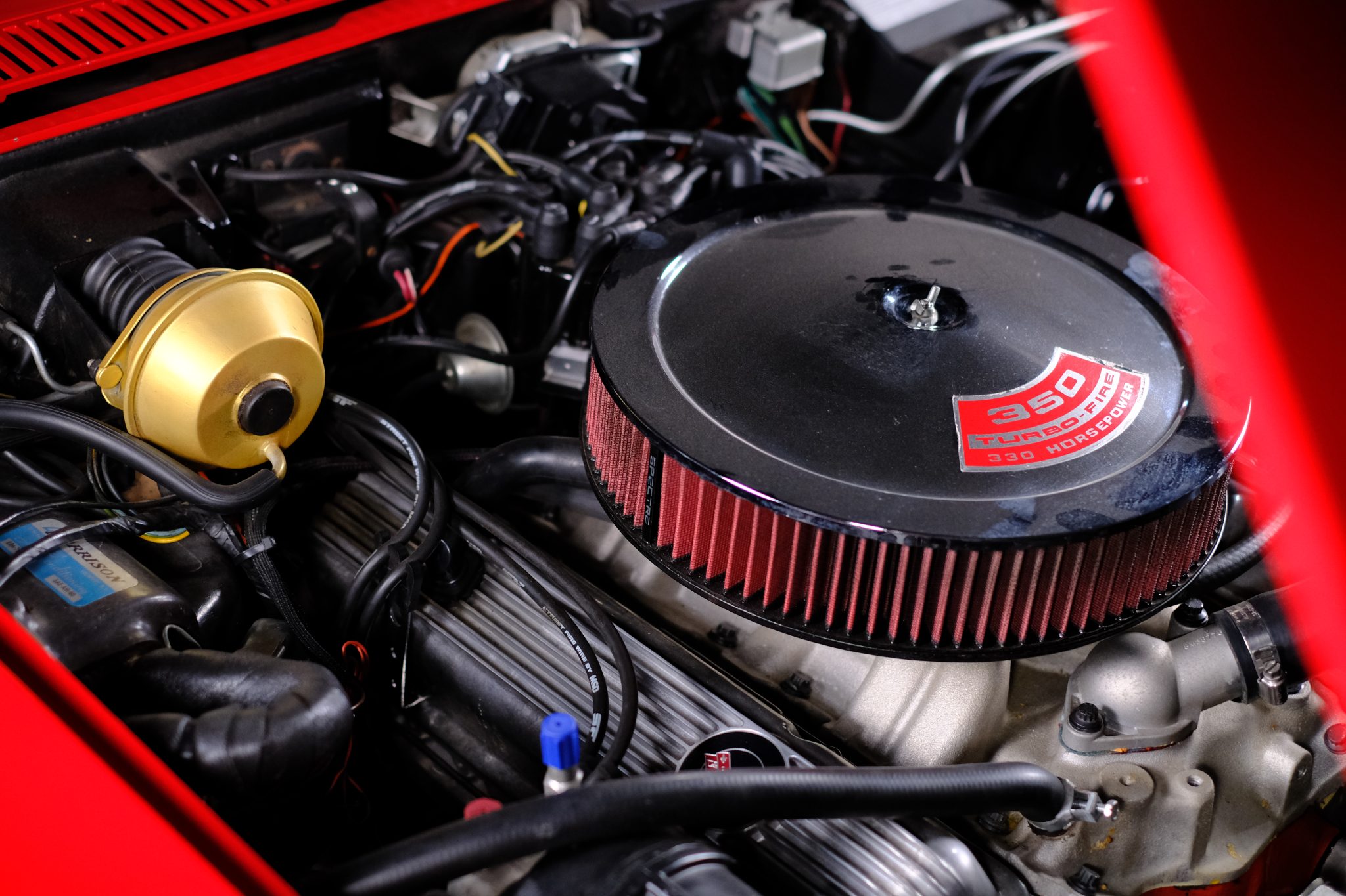 This 1971 Chevrolet Corvette convertible was refurbished and is powered by a 350ci V8 fitted with electronic fuel injection and aluminum cylinder heads. The car is refinished in red over red and further equipped with a four-speed manual transmission, a Positraction limited-slip differential, a black convertible top, 18″ American Racing wheels, disc brakes, power steering, retractable headlights, air conditioning, power windows, and an AM/FM stereo.