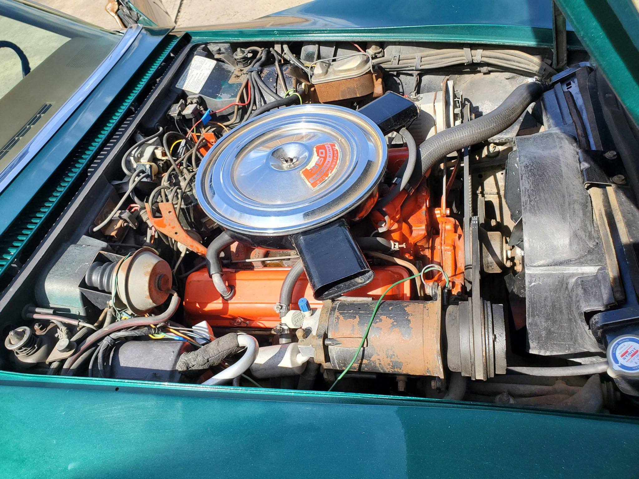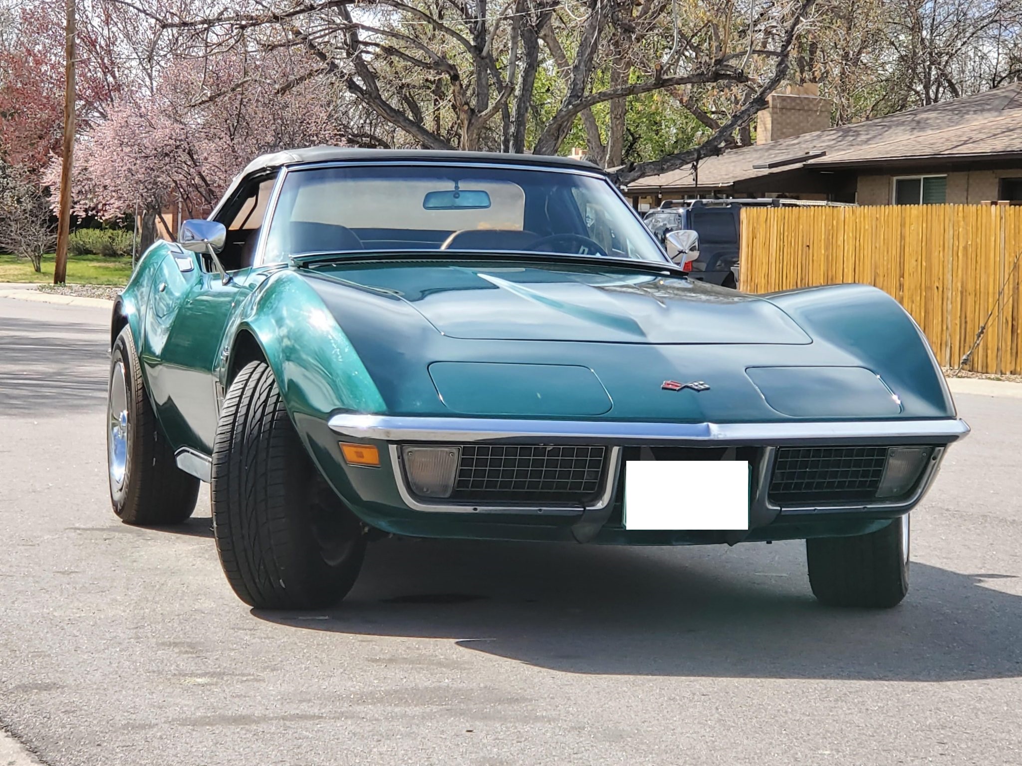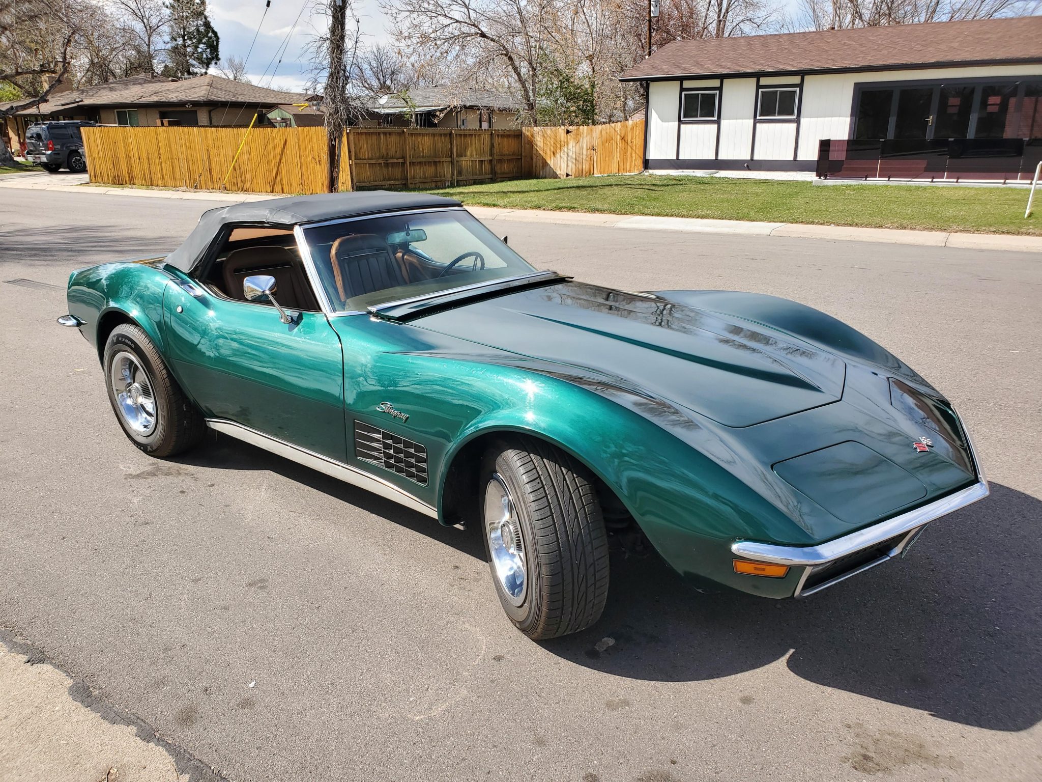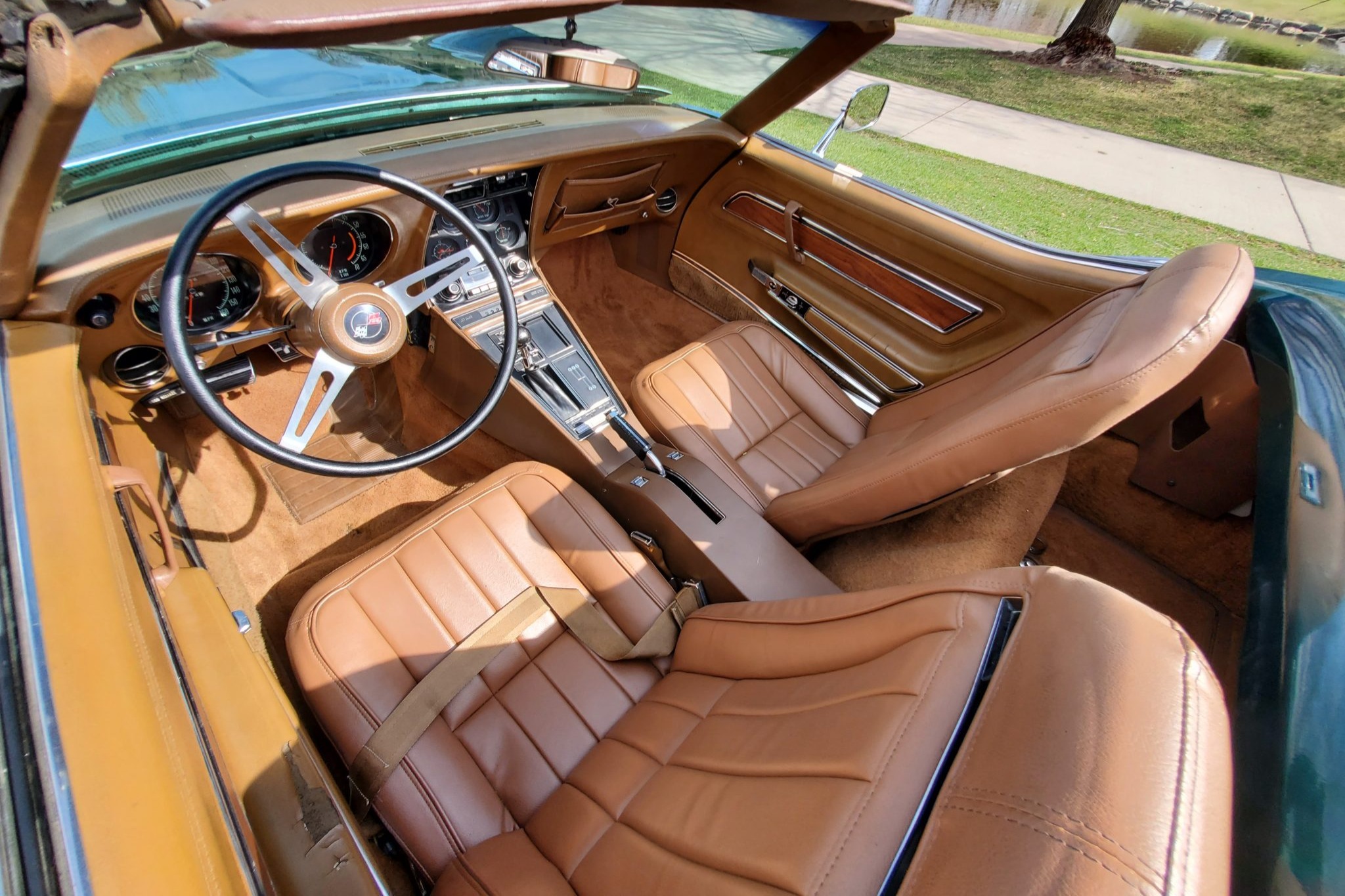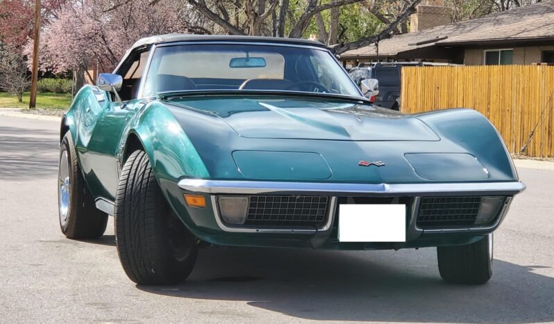 The car is powered by a 350ci V8 paired with a four-speed manual transmission and is finished in Brands Hatch Green over Saddle leather. Features include a Positraction limited-slip differential, a black convertible top, a removable hardtop, 15″ Rally wheels, disc brakes, power steering, retractable headlights, air conditioning, power windows, and an AM/FM stereo.