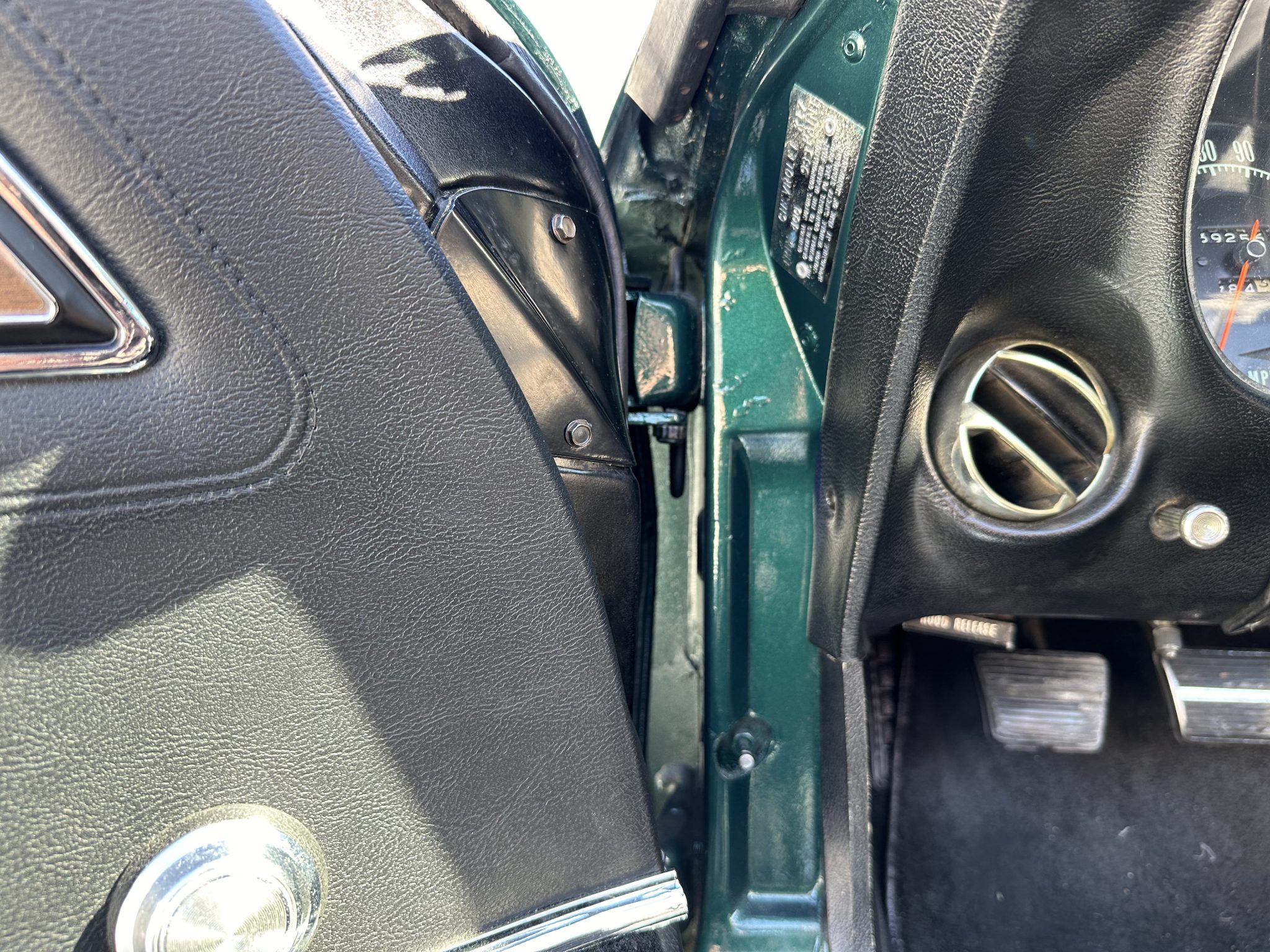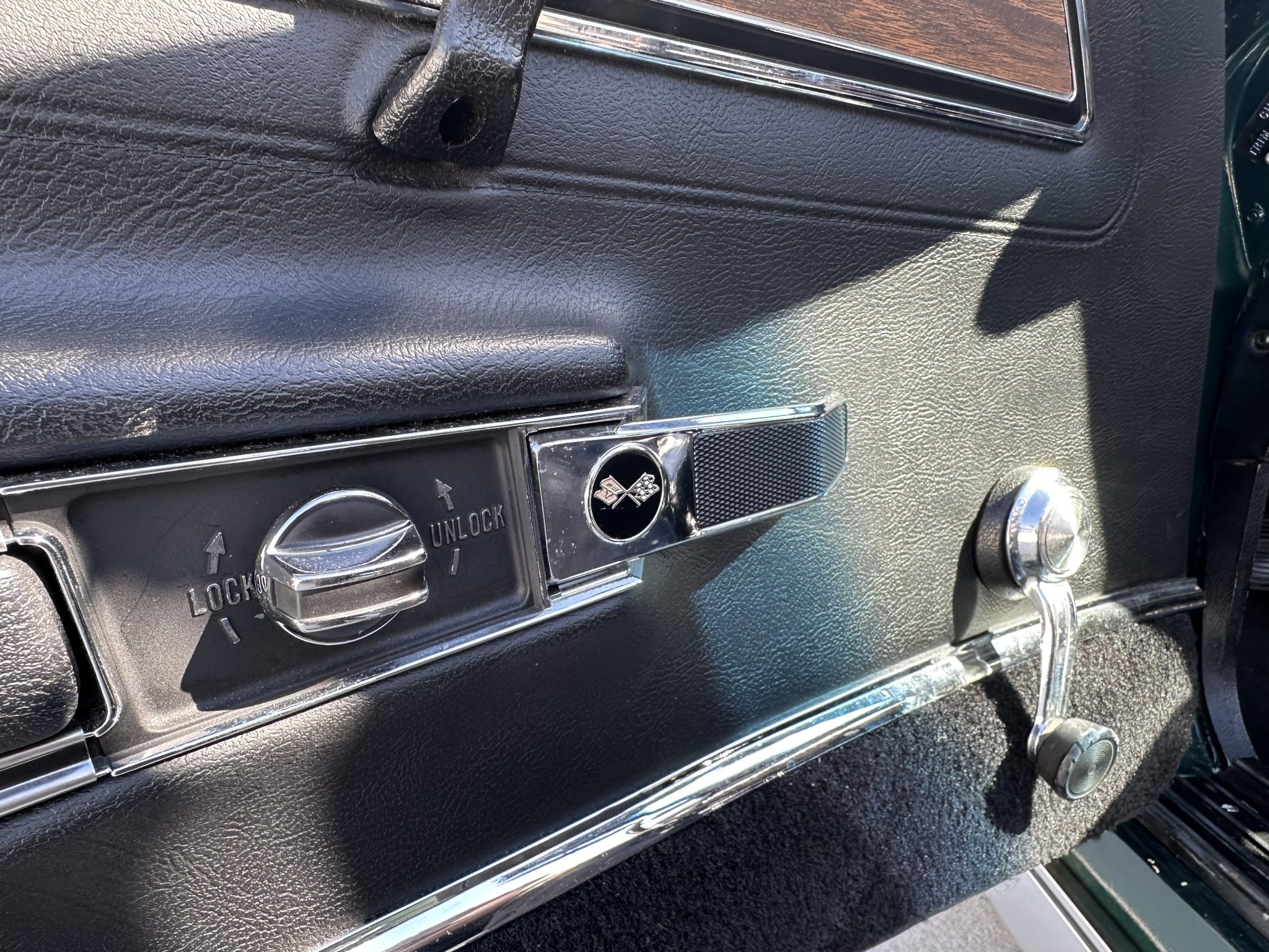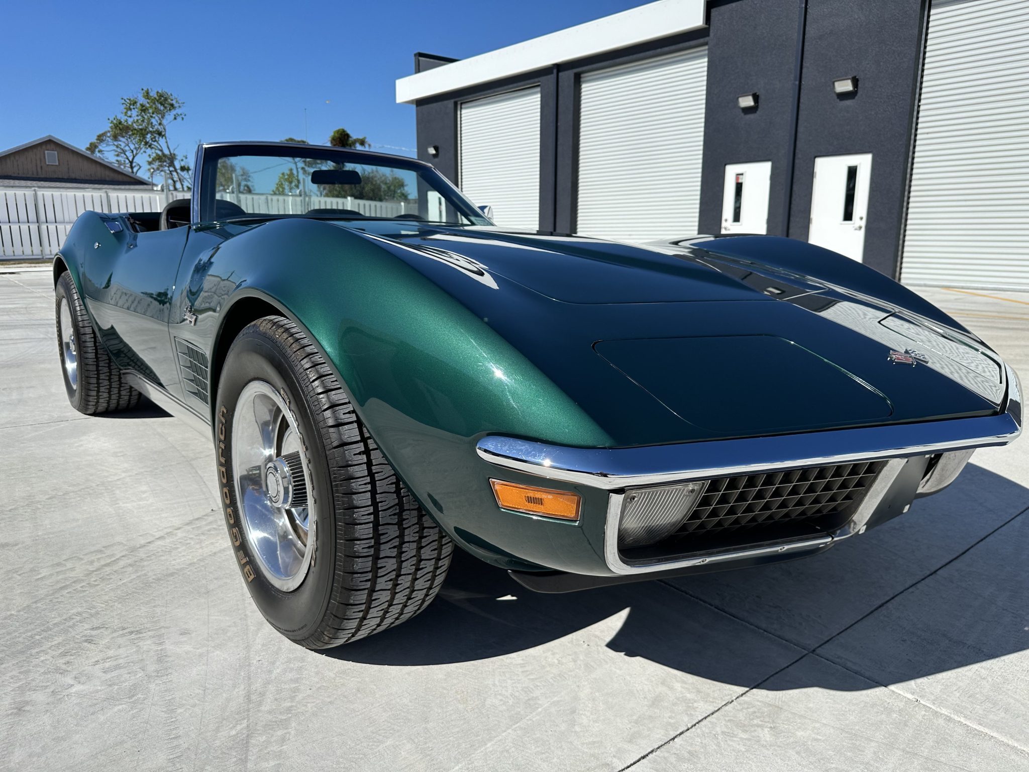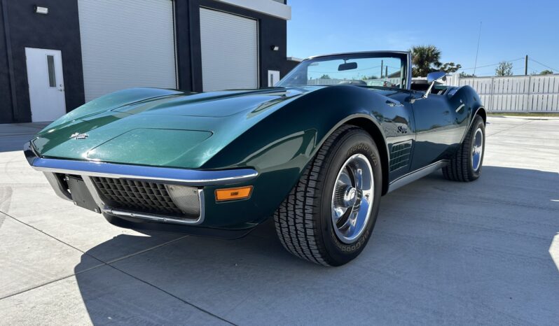 This 1971 Chevrolet Corvette convertible is finished in Brands Hatch Green with a white convertible soft top over a black interior. Powered by a 350ci V8 paired with a four-speed manual transmission, it has a Positraction limited-slip differential, power steering, 15″ Rally wheels, and a retro-look stereo.