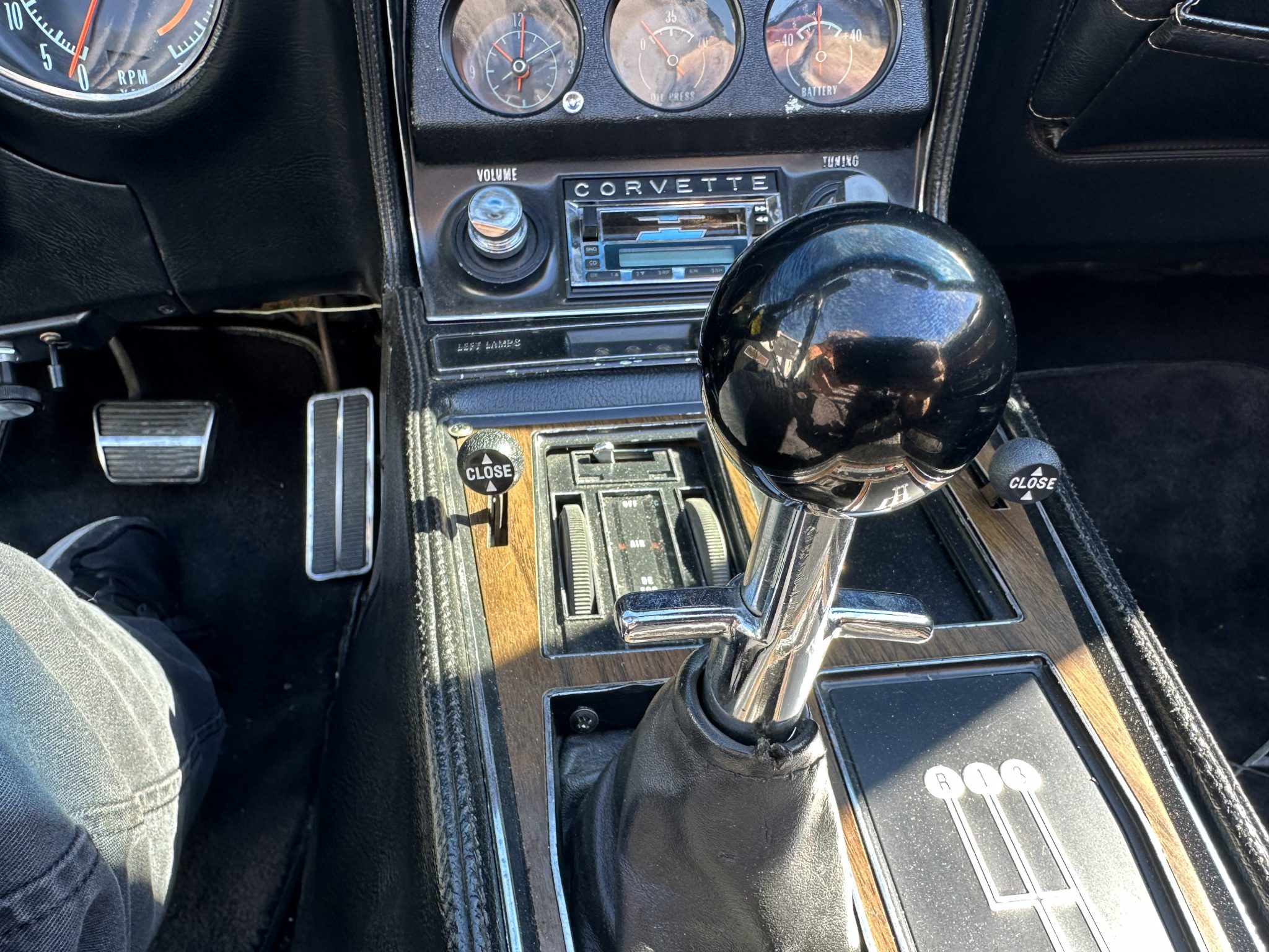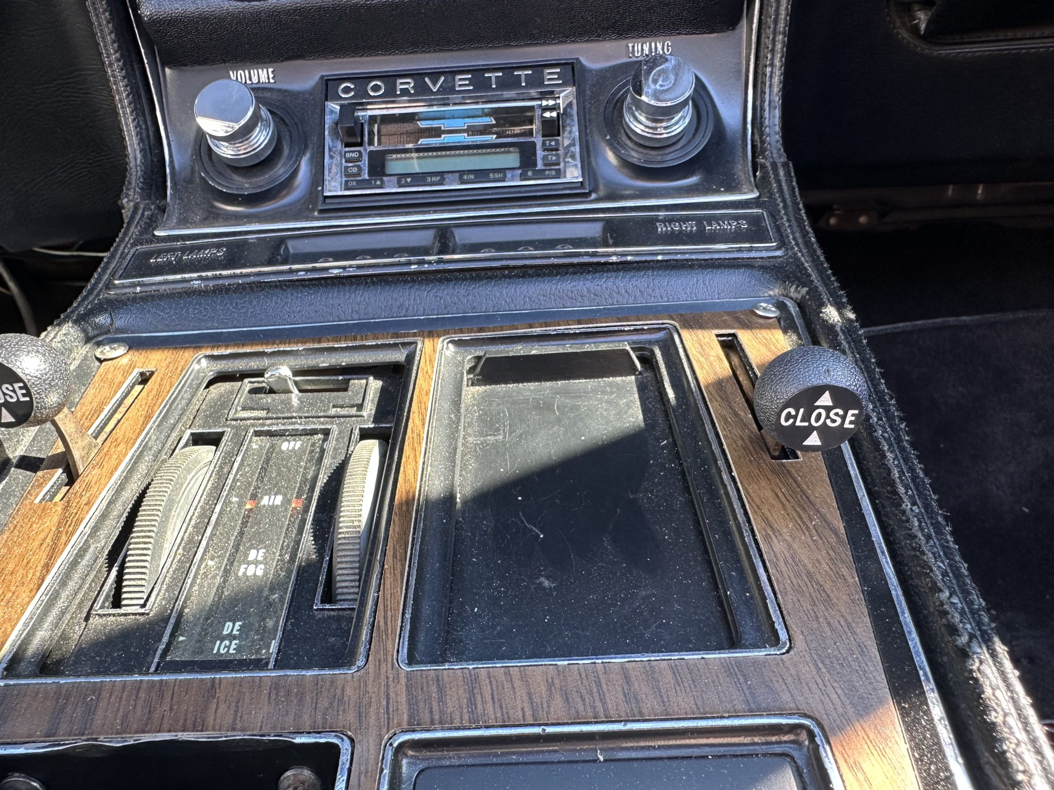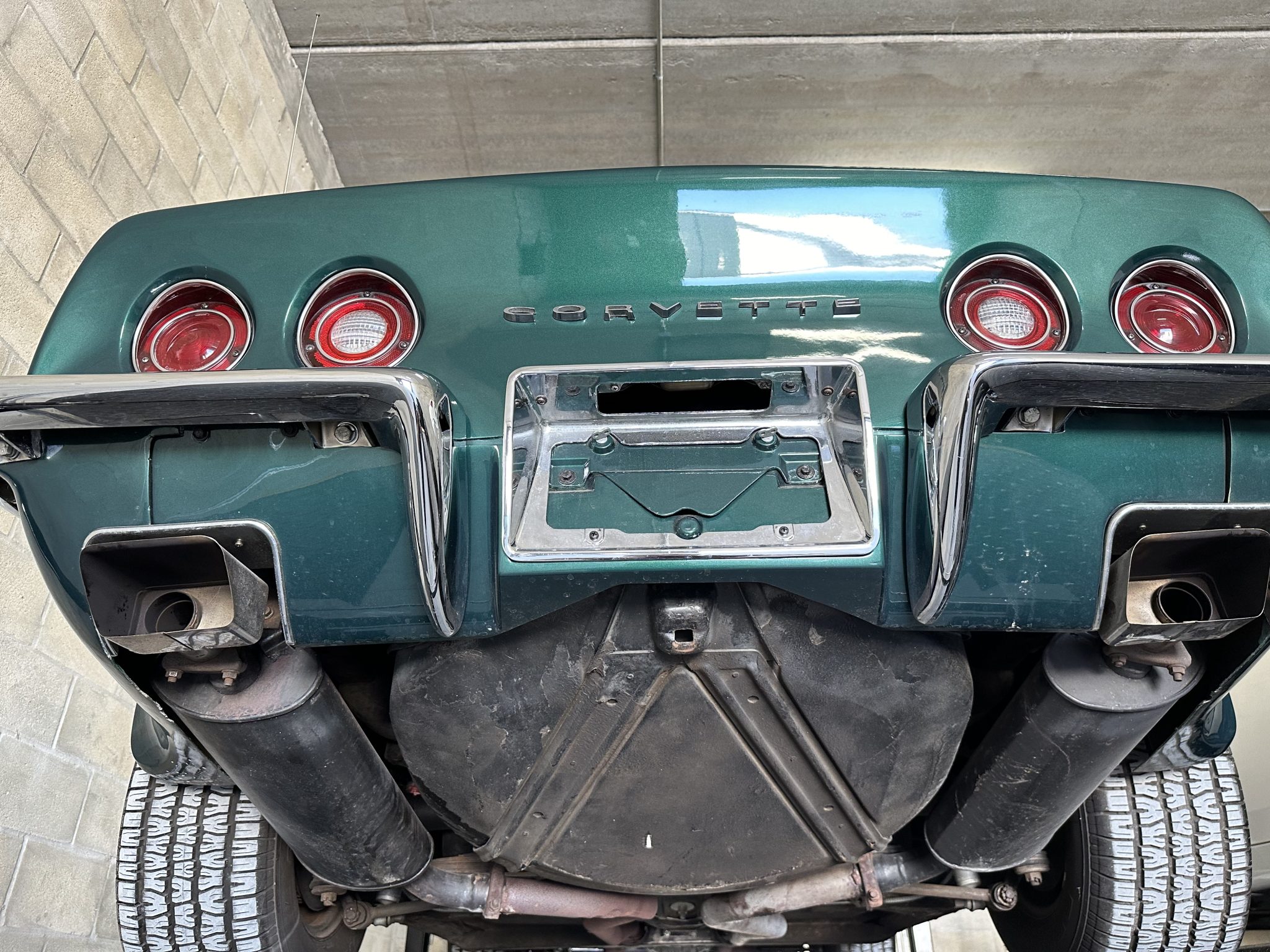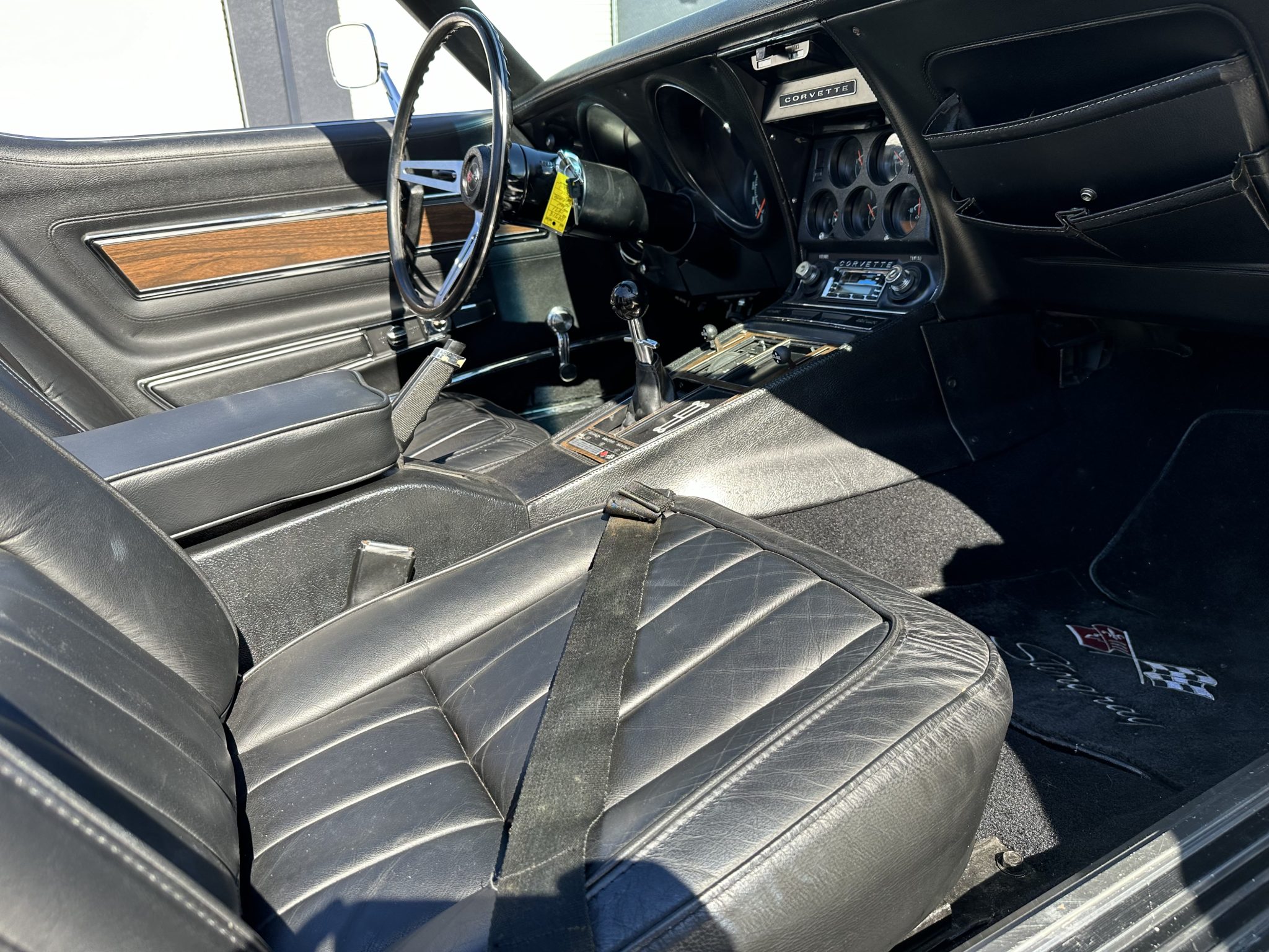 This 1971 Chevrolet Corvette convertible is finished in Brands Hatch Green with a white convertible soft top over a black interior. Powered by a 350ci V8 paired with a four-speed manual transmission, it has a Positraction limited-slip differential, power steering, 15″ Rally wheels, and a retro-look stereo.