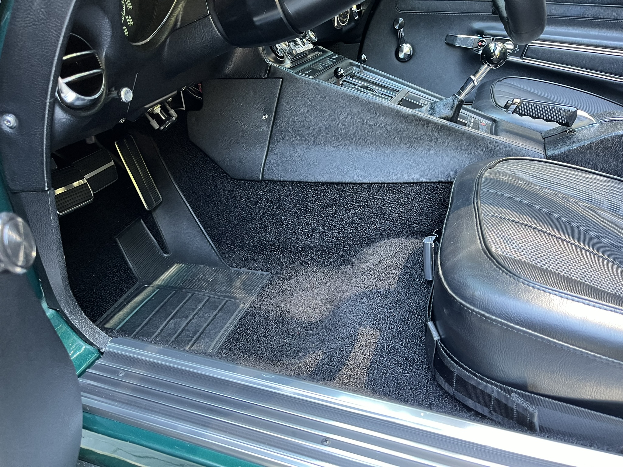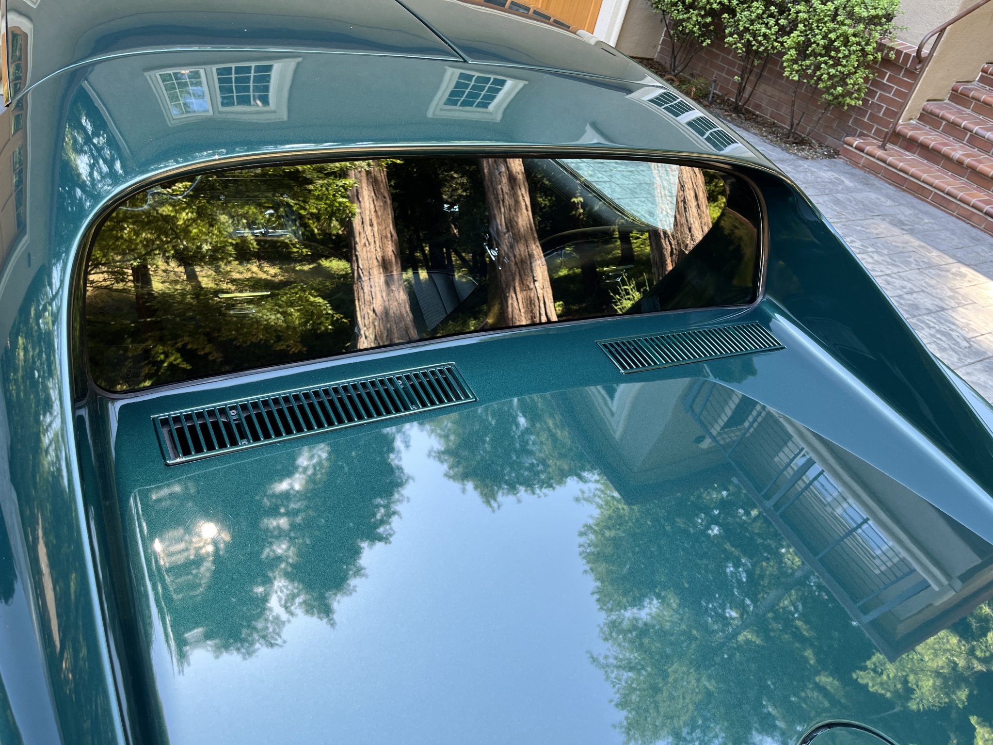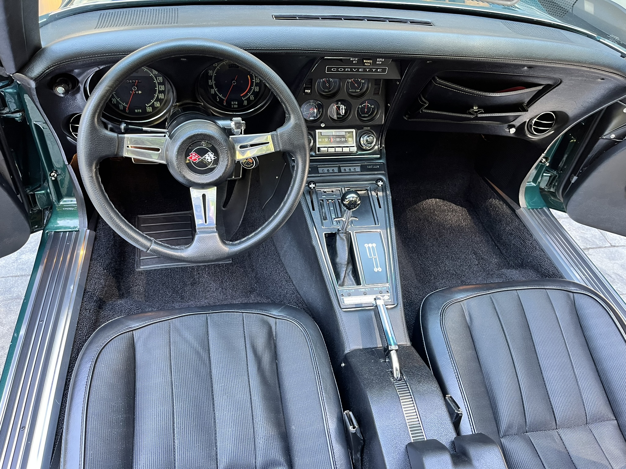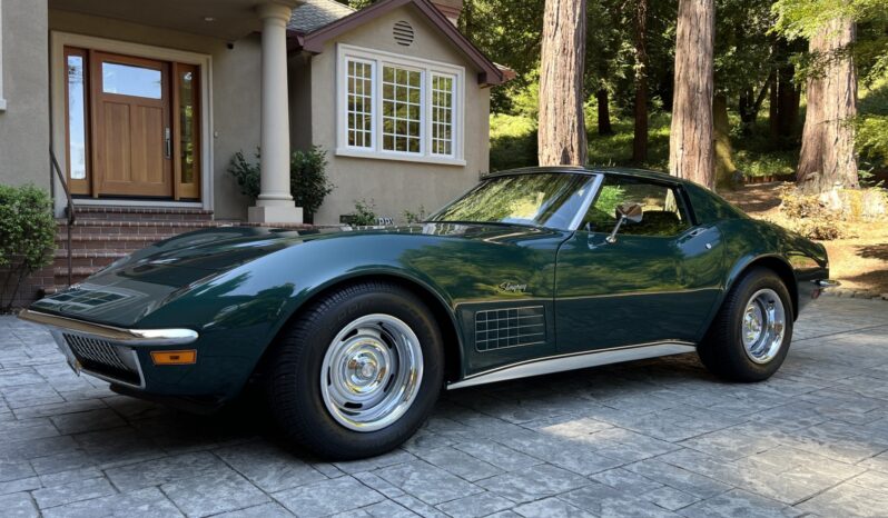Subsequent work consisted of adding insulation to the cabin, rebuilding the clock, installing four tires, and replacing the power steering cylinder, carburetor float, voltage regulator, ignition, vent doors, door locks, window regulators, and side windows. The car is powered by a 350ci V8 paired with a four-speed manual transmission and is finished in Brands Hatch Green over black vinyl and cloth upholstery. Features include a tilting and telescoping steering column, Positraction limited-slip differential, removable roof panels, 15″ Rally wheels, disc brakes, power steering, retractable headlights, a cabin heater, and an AM/FM stereo.