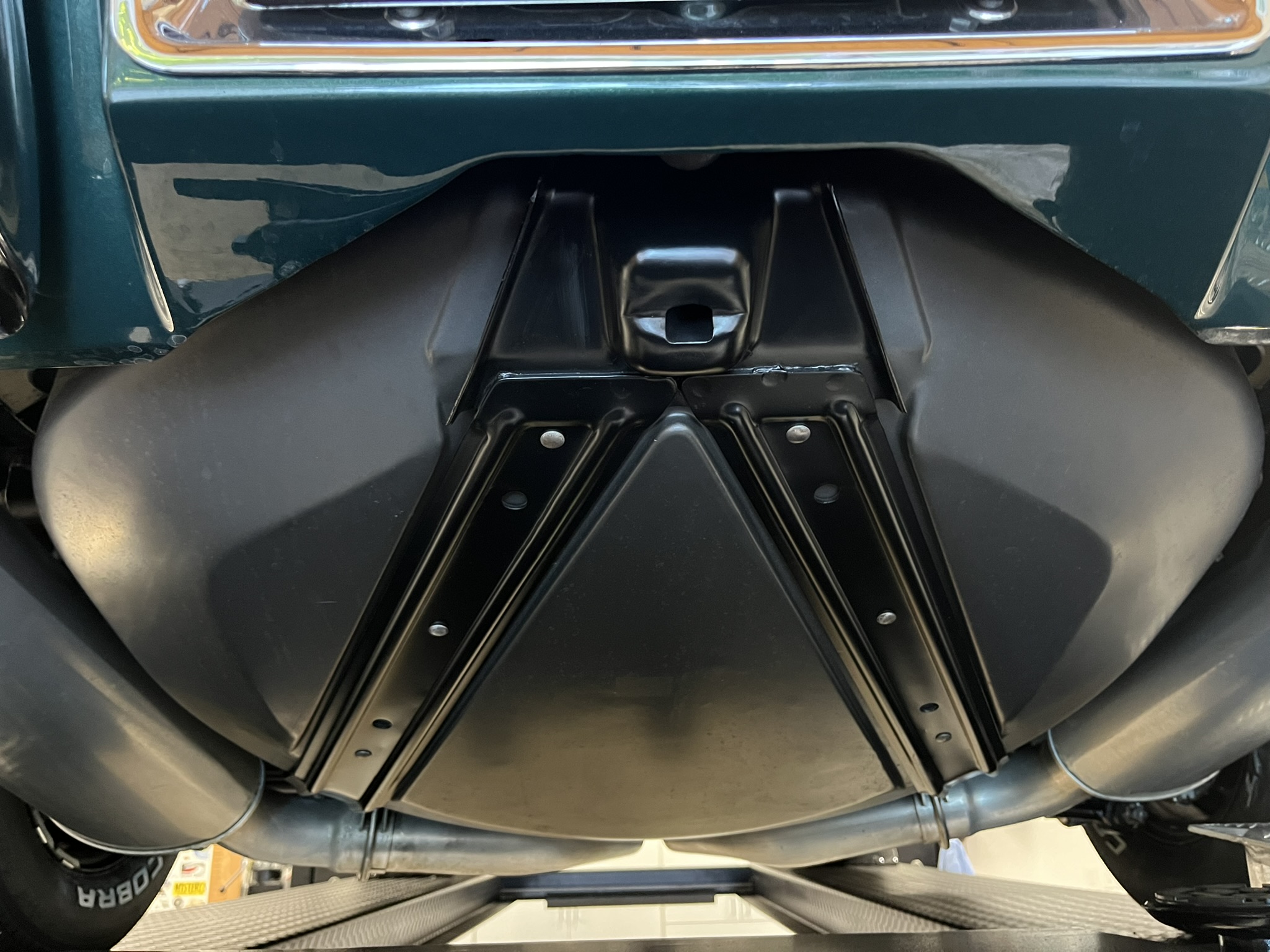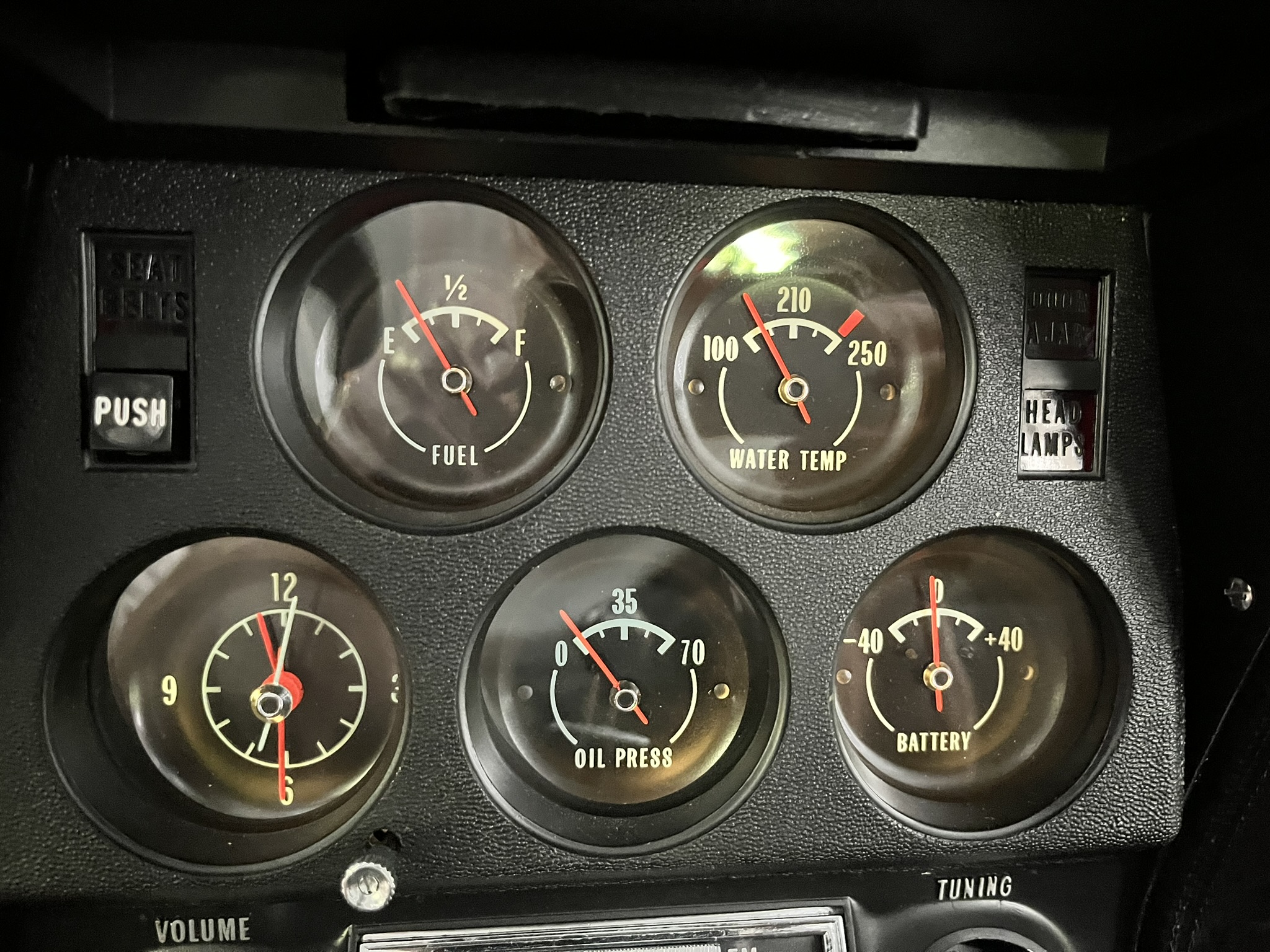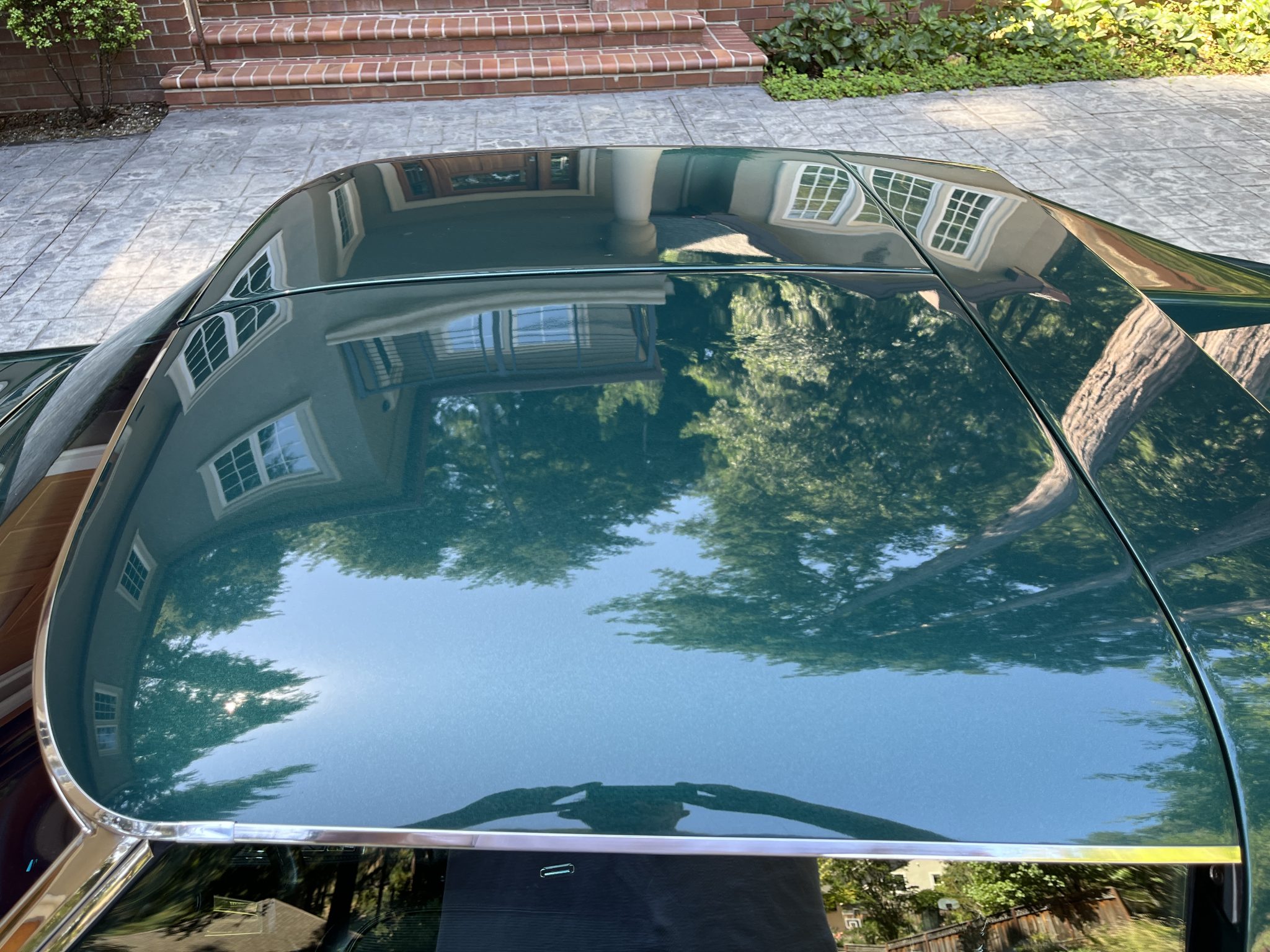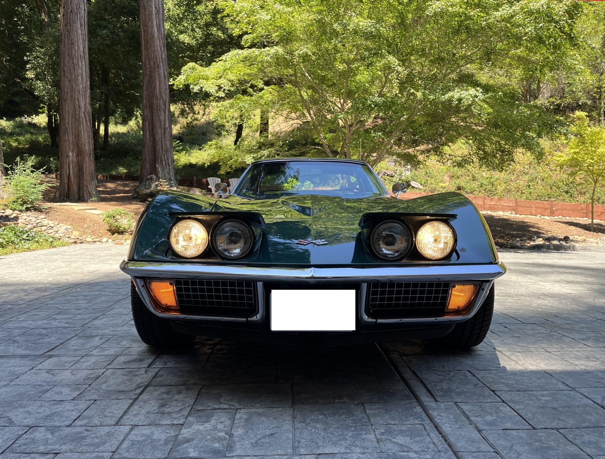 Subsequent work consisted of adding insulation to the cabin, rebuilding the clock, installing four tires, and replacing the power steering cylinder, carburetor float, voltage regulator, ignition, vent doors, door locks, window regulators, and side windows. The car is powered by a 350ci V8 paired with a four-speed manual transmission and is finished in Brands Hatch Green over black vinyl and cloth upholstery. Features include a tilting and telescoping steering column, Positraction limited-slip differential, removable roof panels, 15″ Rally wheels, disc brakes, power steering, retractable headlights, a cabin heater, and an AM/FM stereo.