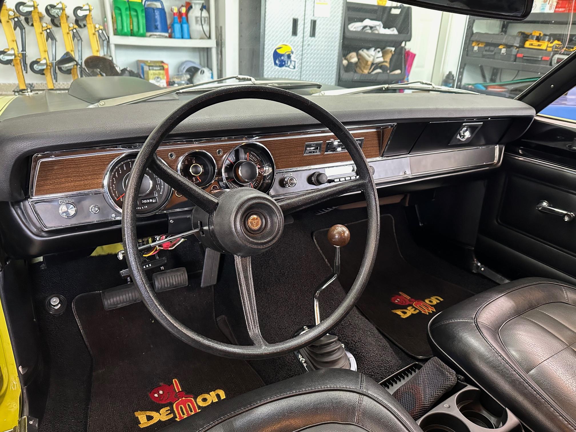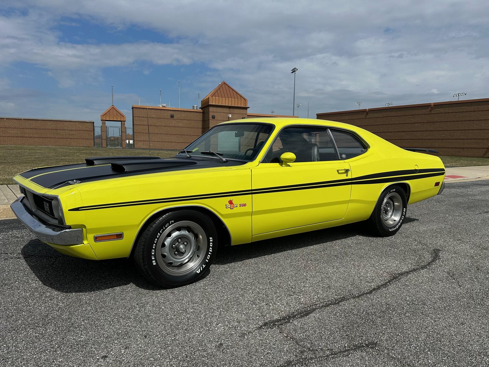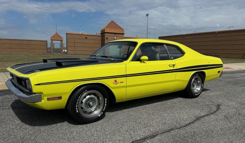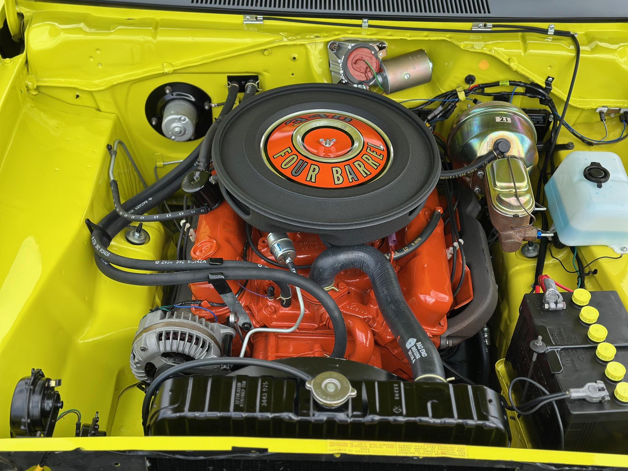This 1971 Dodge Demon 340 two-door coupe was refinished in yellow with black stripes and subsequent work involved rebuilding the replacement 340ci V8 and fitting the rear end with an Auburn Gears limited-slip differential and a Moser Engineering 3.55:1 gear set. The exhaust system was also replaced, power steering components were overhauled, and the black interior was refreshed. Shifting is through a replacement four-speed manual transmission, and additional equipment includes Rallye-style 15″ wheels, front disc brakes, dual hood scoops, and a rear wing in addition to a Bluetooth-enabled AM/FM stereo and front bucket seats.