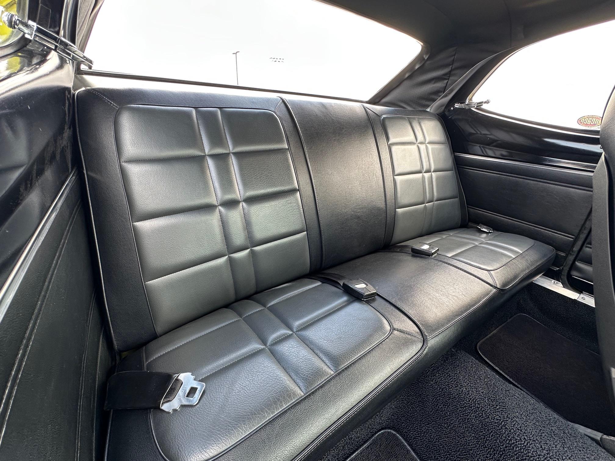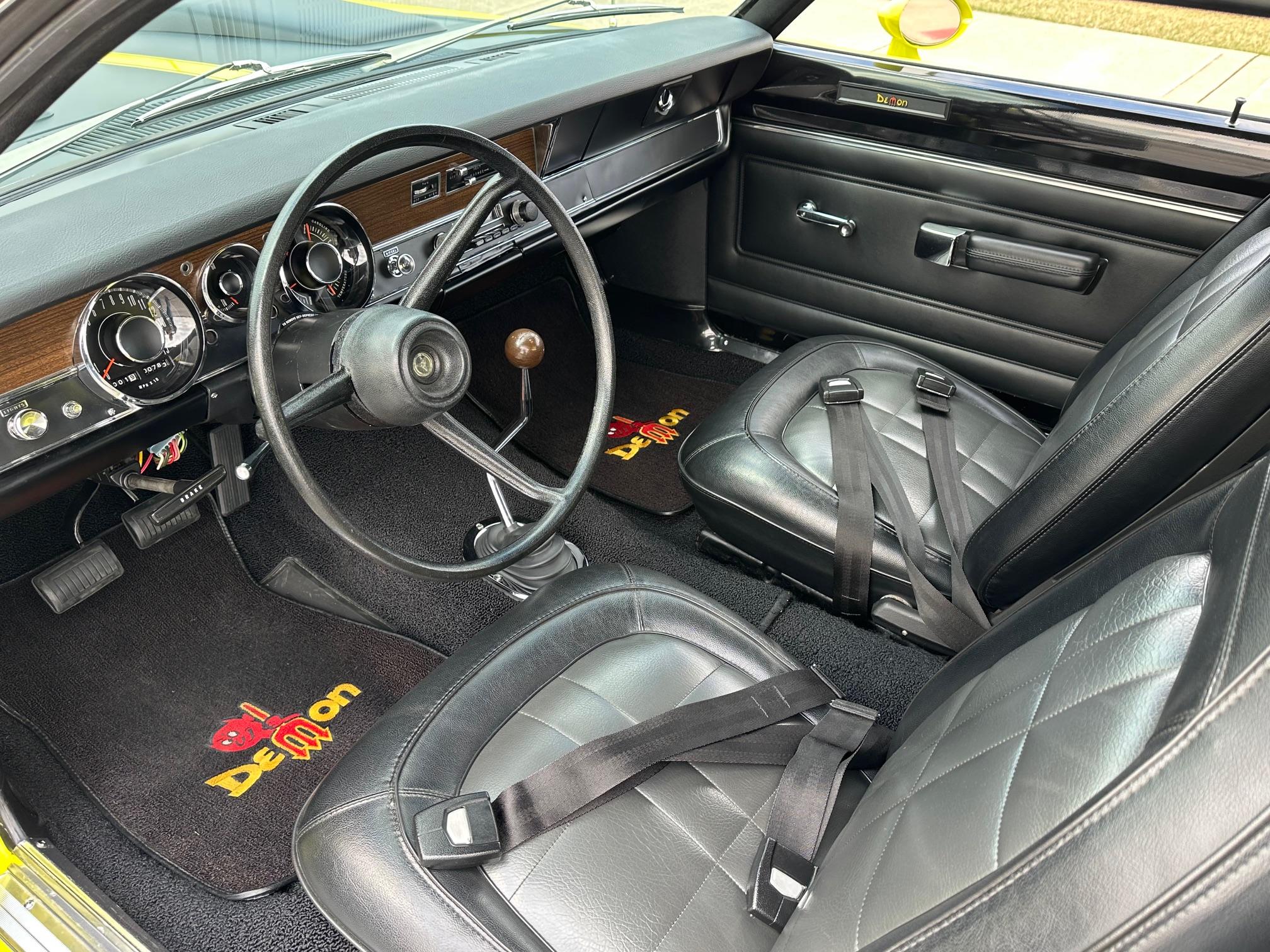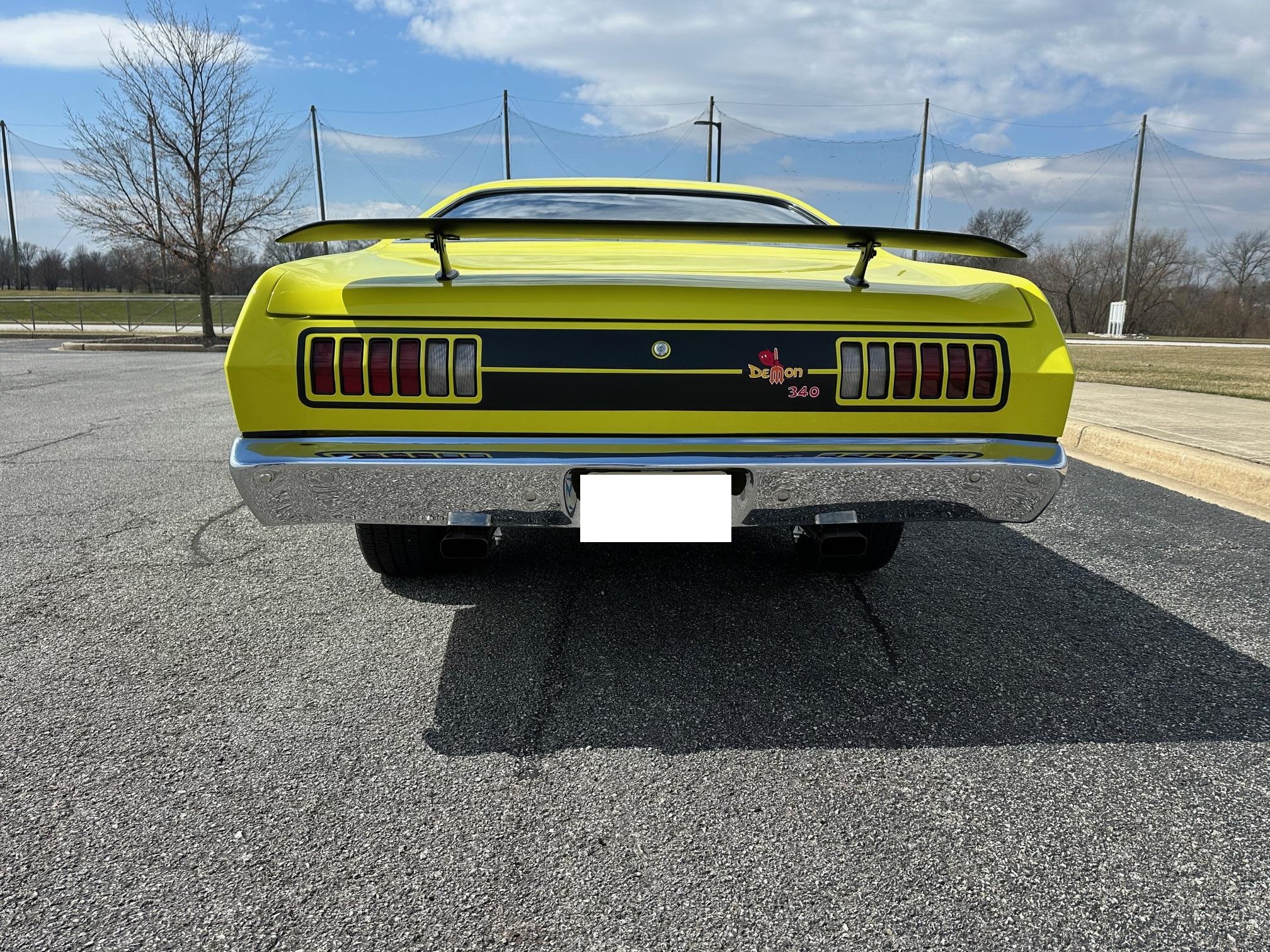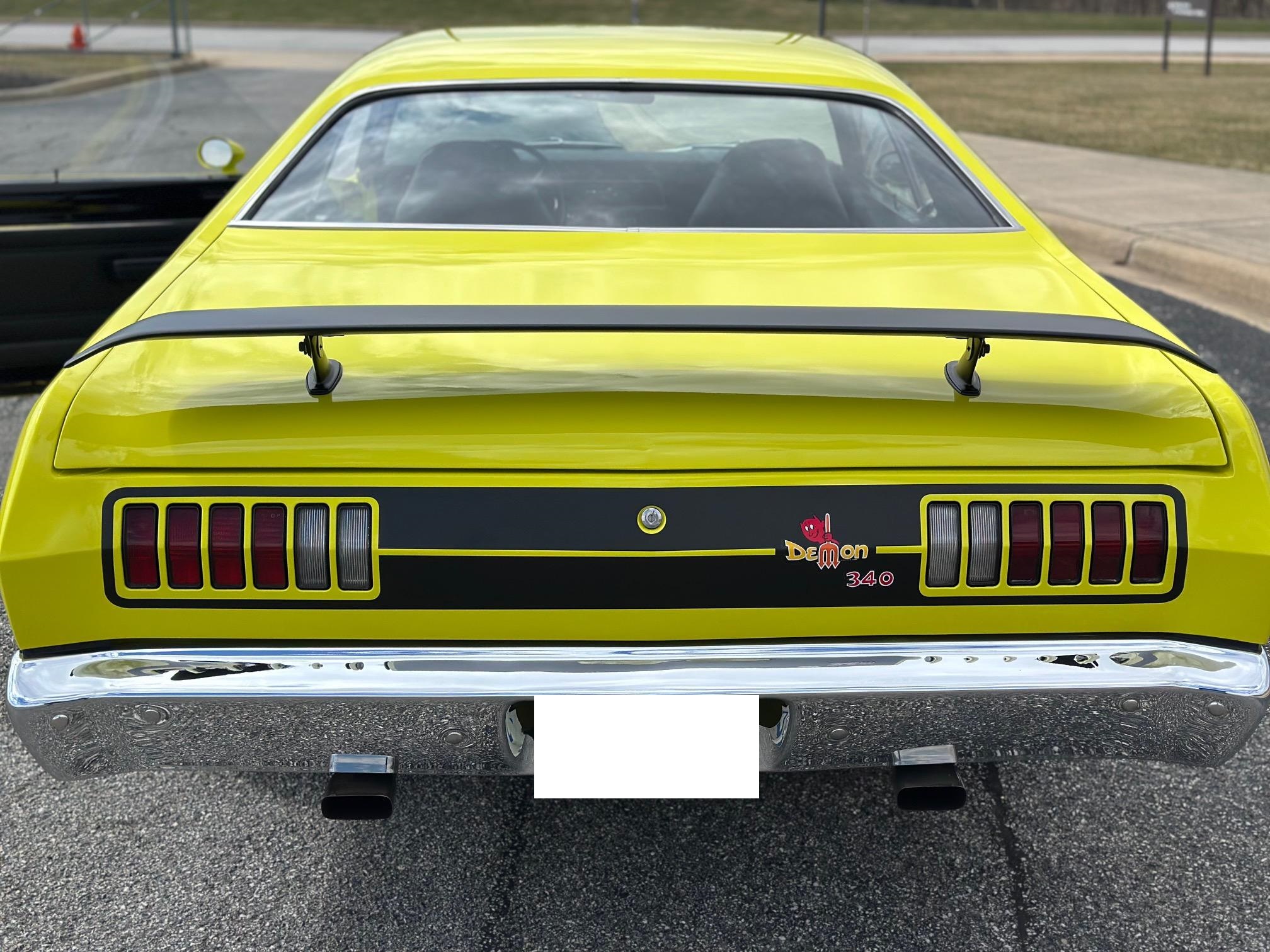 This 1971 Dodge Demon 340 two-door coupe was refinished in yellow with black stripes and subsequent work involved rebuilding the replacement 340ci V8 and fitting the rear end with an Auburn Gears limited-slip differential and a Moser Engineering 3.55:1 gear set. The exhaust system was also replaced, power steering components were overhauled, and the black interior was refreshed. Shifting is through a replacement four-speed manual transmission, and additional equipment includes Rallye-style 15″ wheels, front disc brakes, dual hood scoops, and a rear wing in addition to a Bluetooth-enabled AM/FM stereo and front bucket seats.